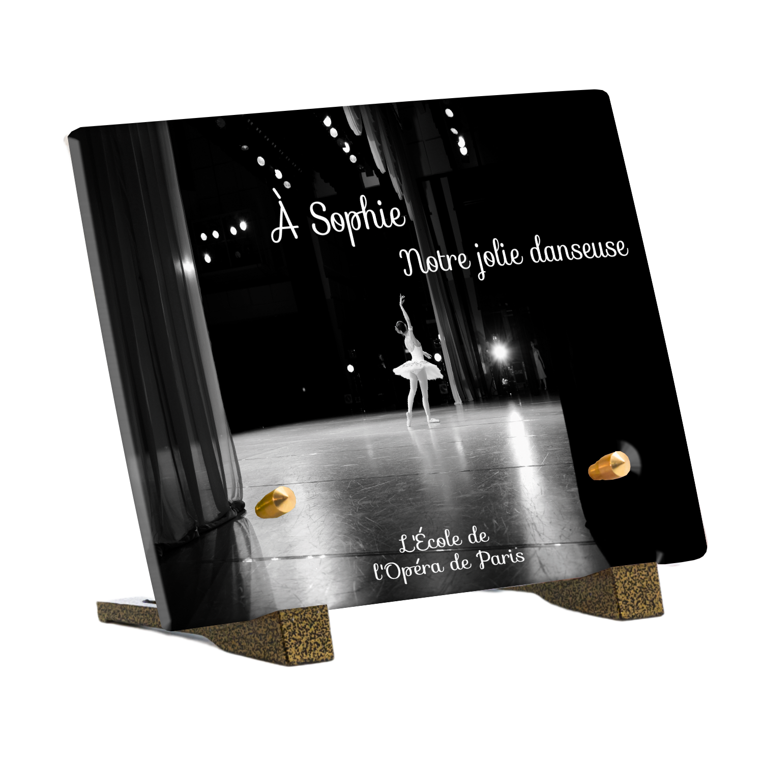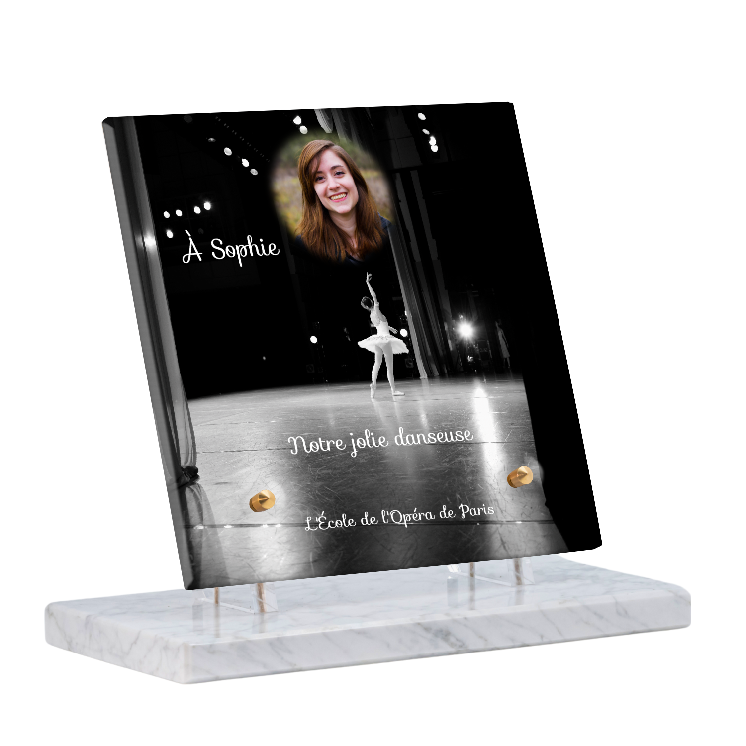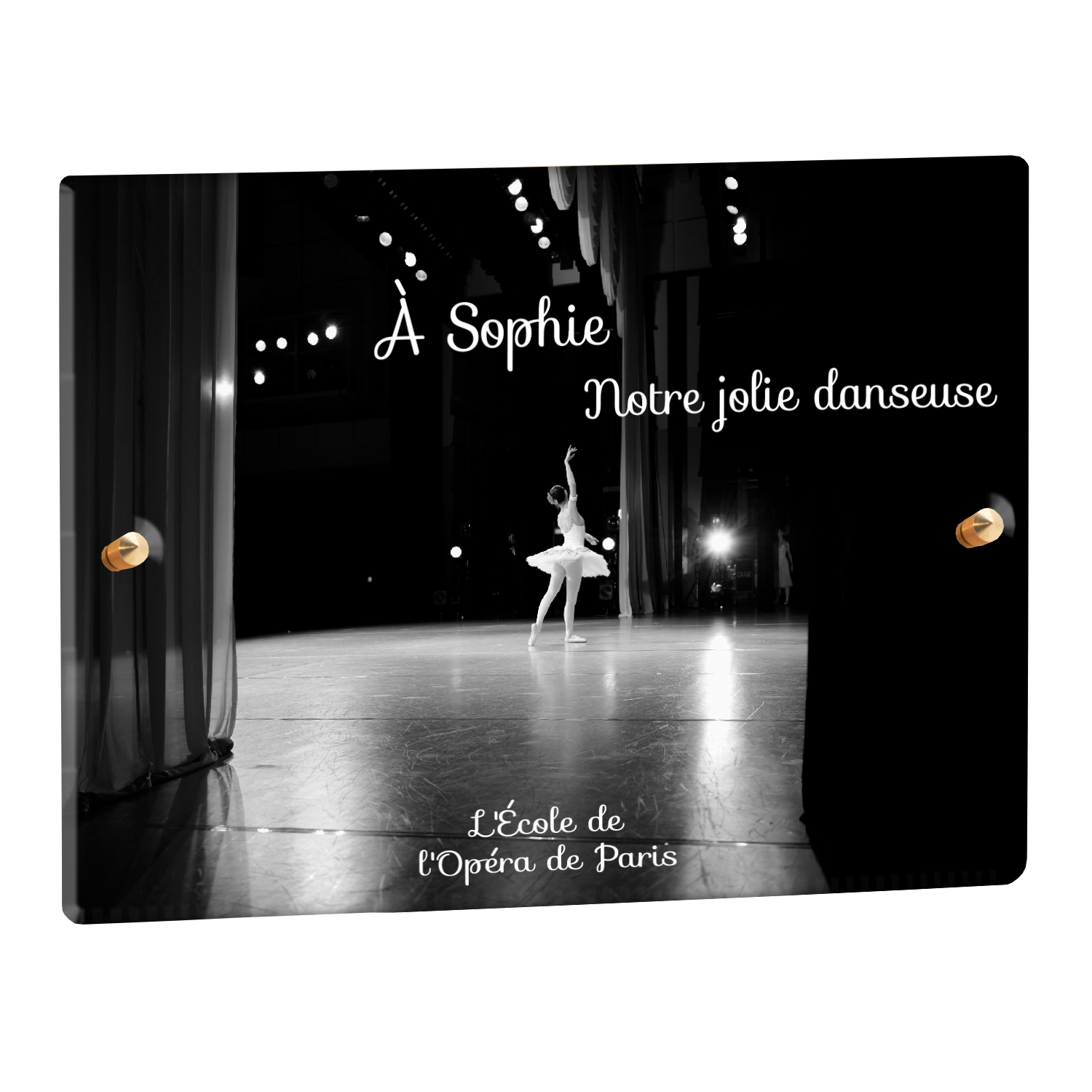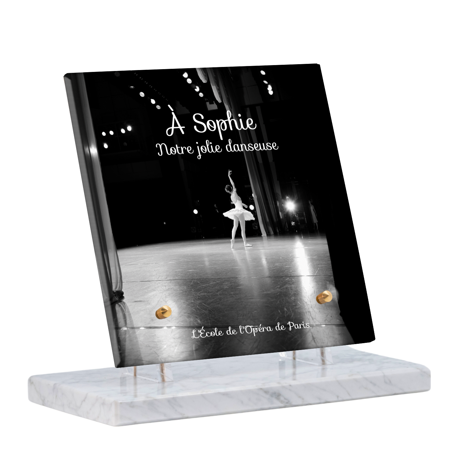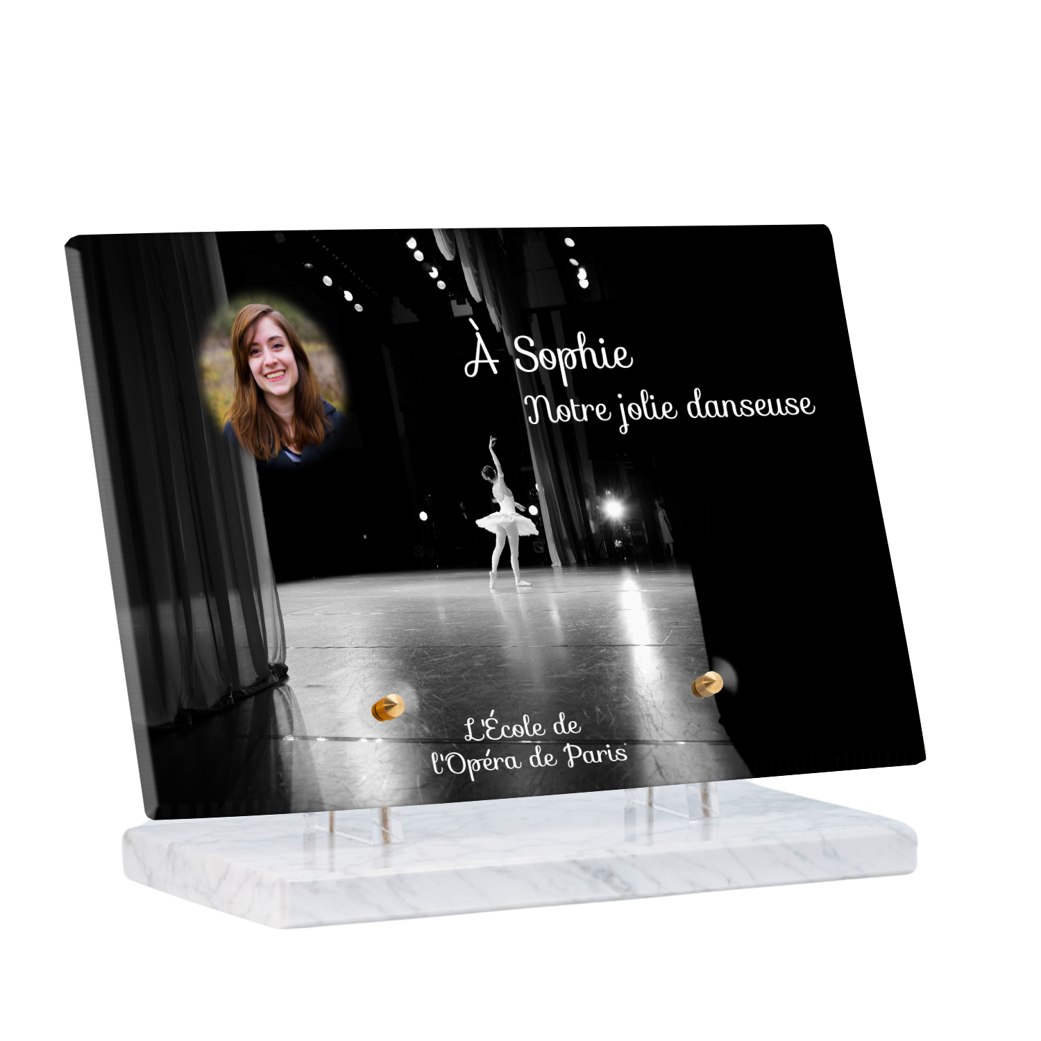 Offrez un hommage unique avec cette plaque funéraire personnalisée représentant une danseuse ballerine sur scène. Conçue en plexiglas, cette plaque funéraire moderne allie élégance et finesse pour célébrer la mémoire avec délicatesse. Son design soigné apporte une touche artistique et respectueuse, idéale pour rendre hommage à un être cher passionné de danse.