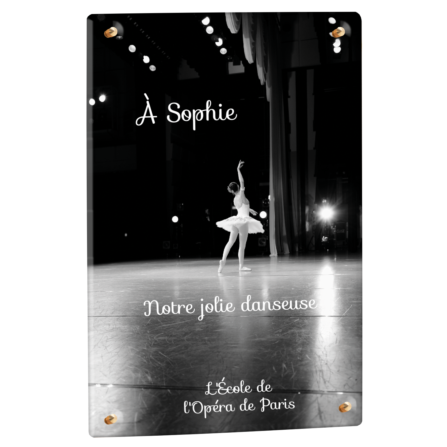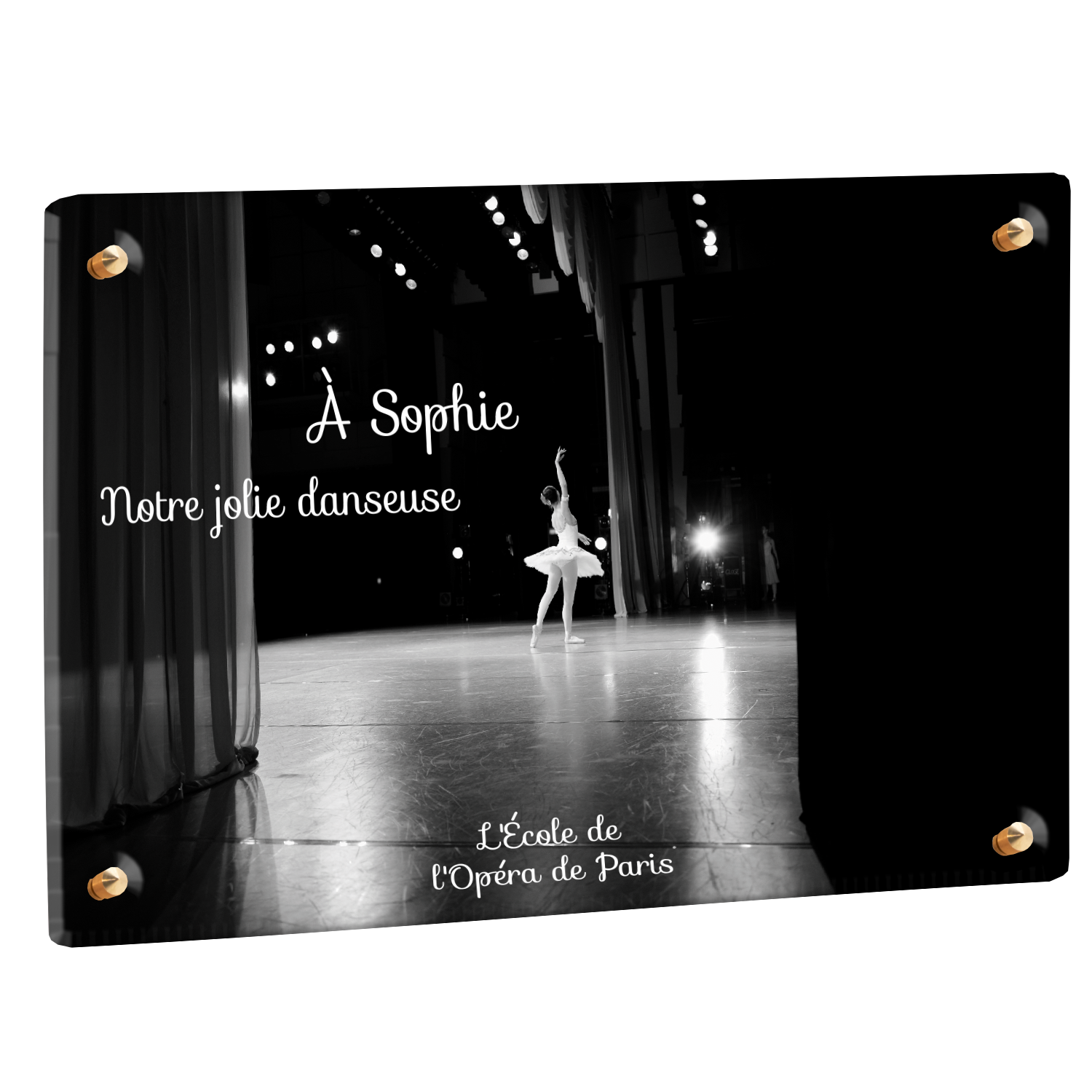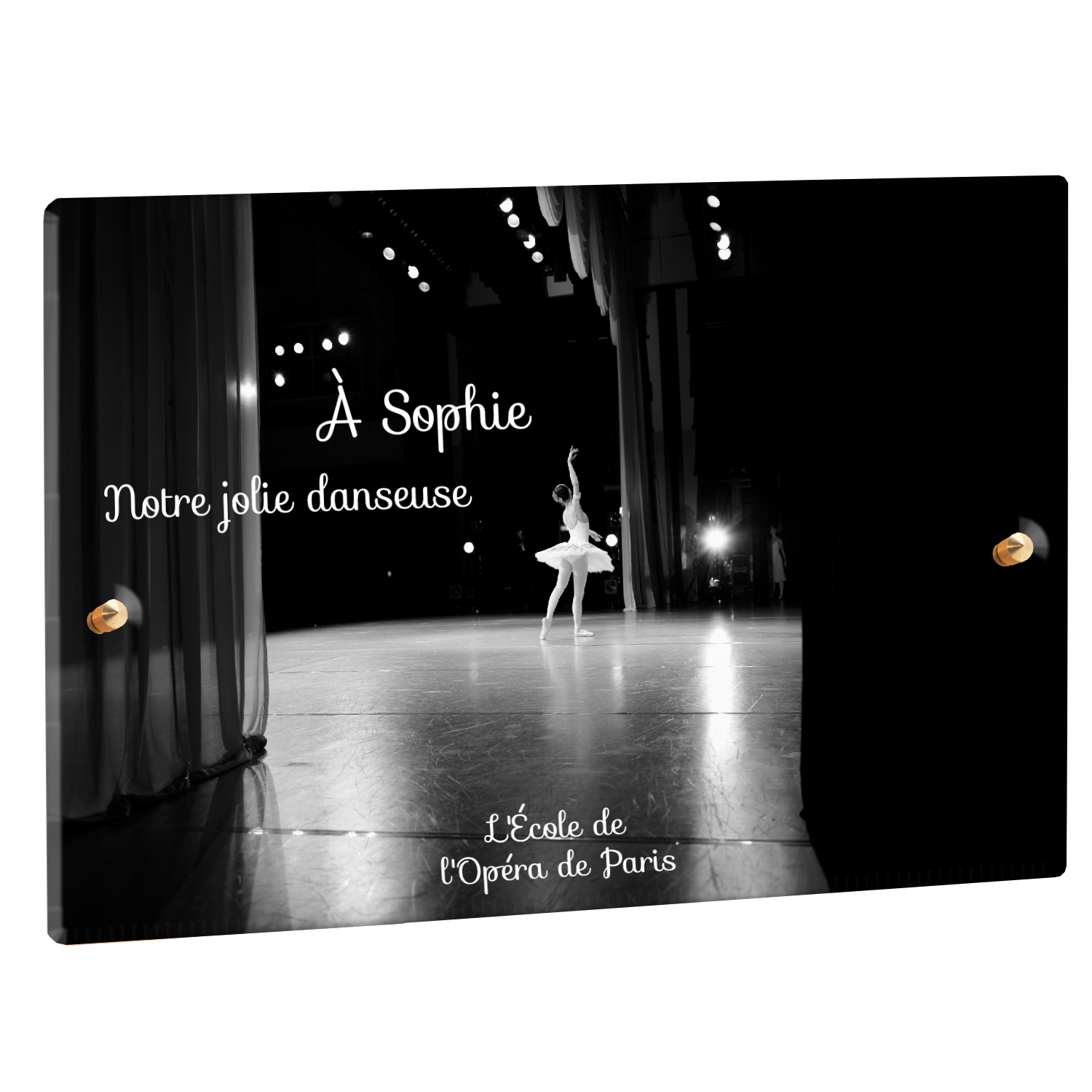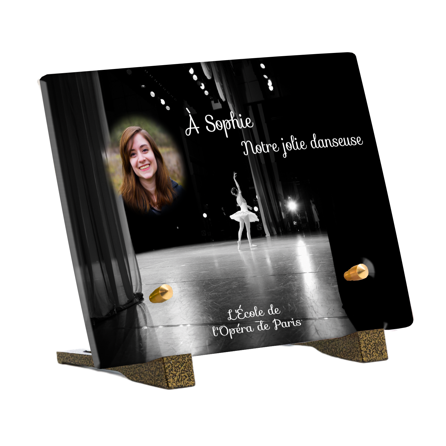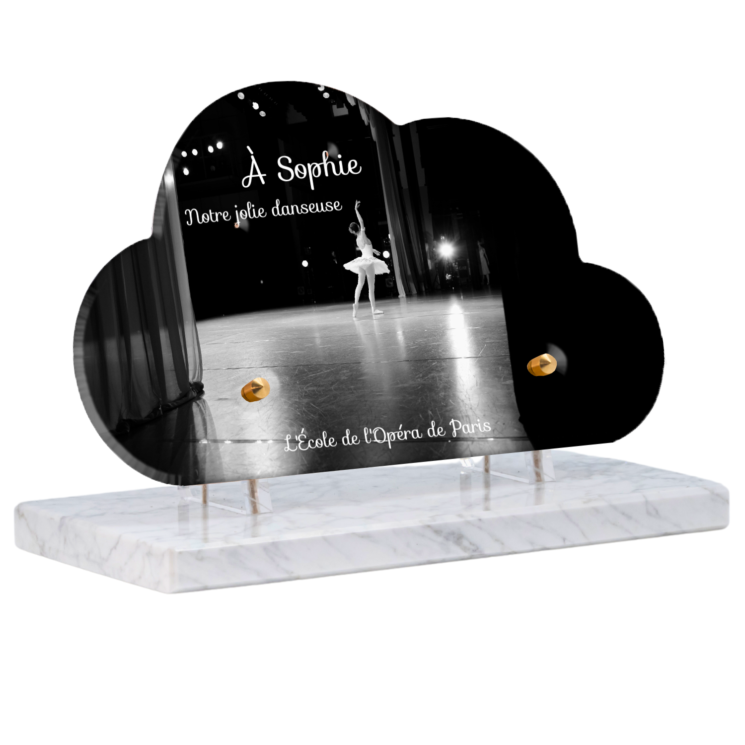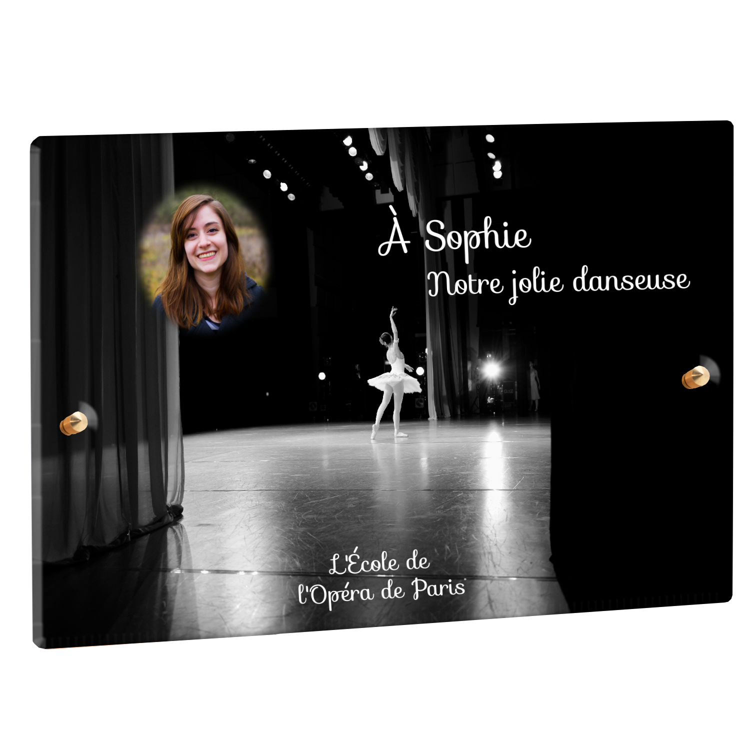 Offrez un hommage unique avec cette plaque funéraire personnalisée représentant une danseuse ballerine sur scène. Conçue en plexiglas, cette plaque funéraire moderne allie élégance et finesse pour célébrer la mémoire avec délicatesse. Son design soigné apporte une touche artistique et respectueuse, idéale pour rendre hommage à un être cher passionné de danse.