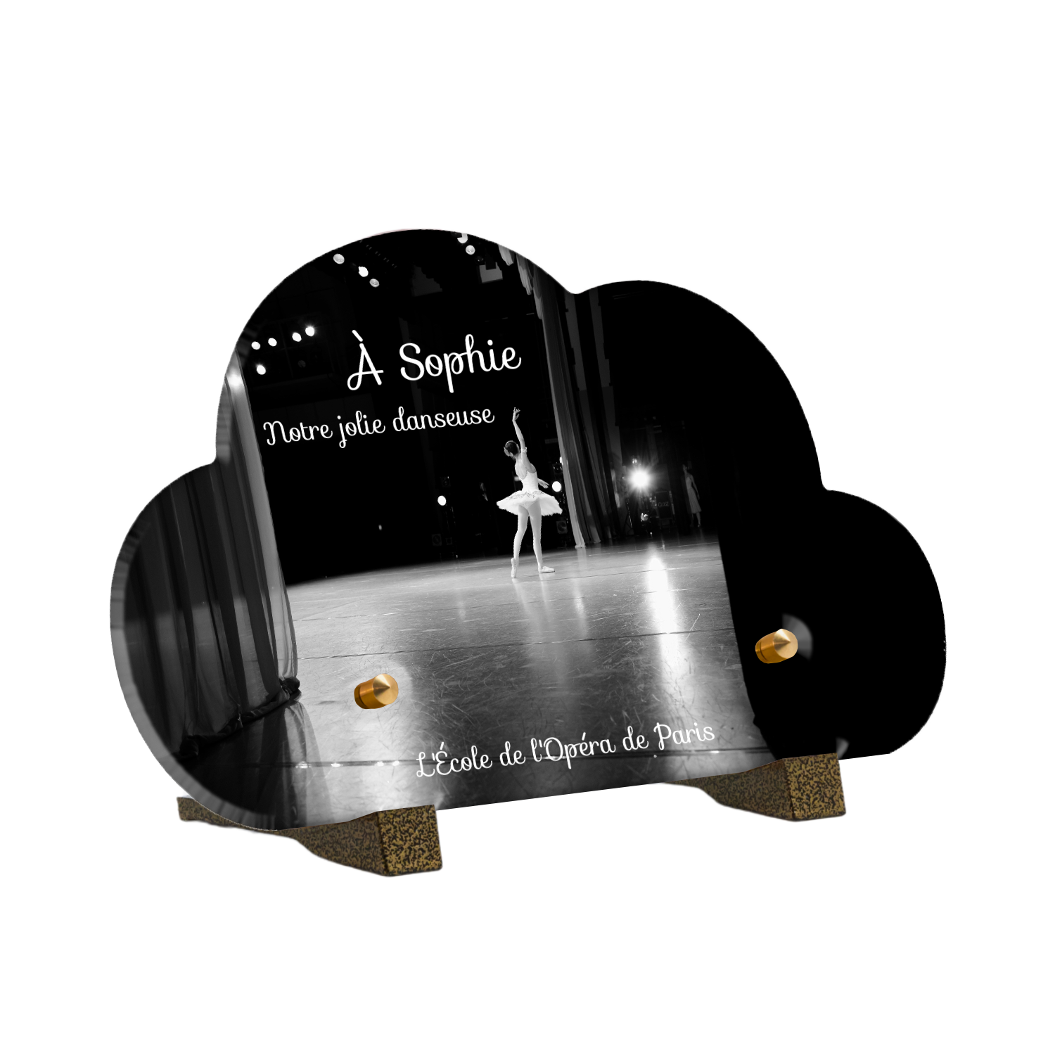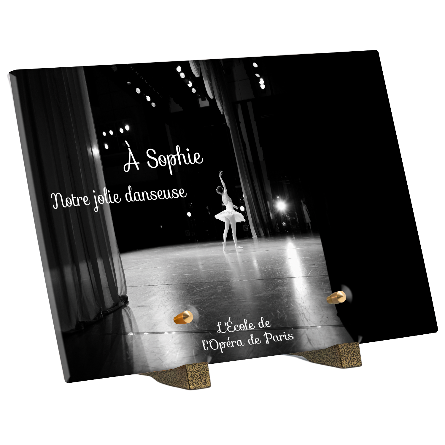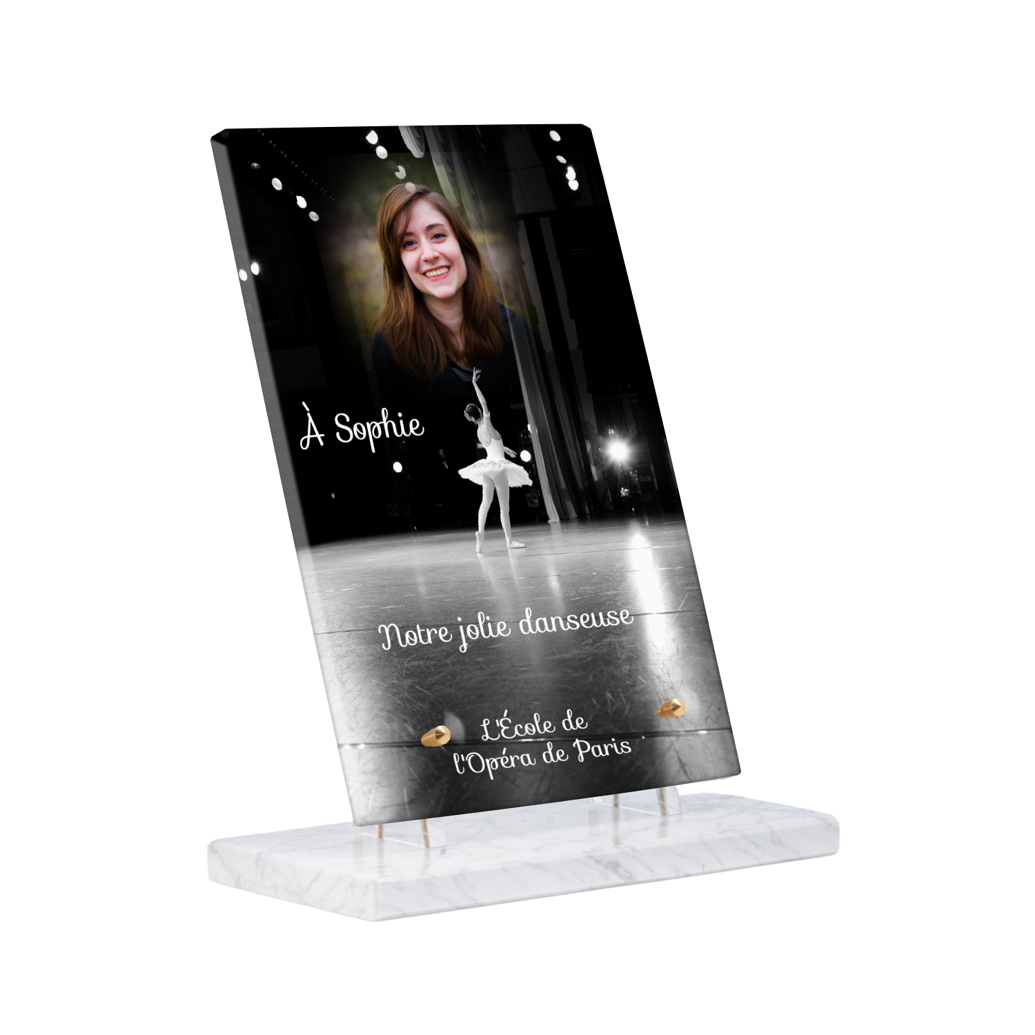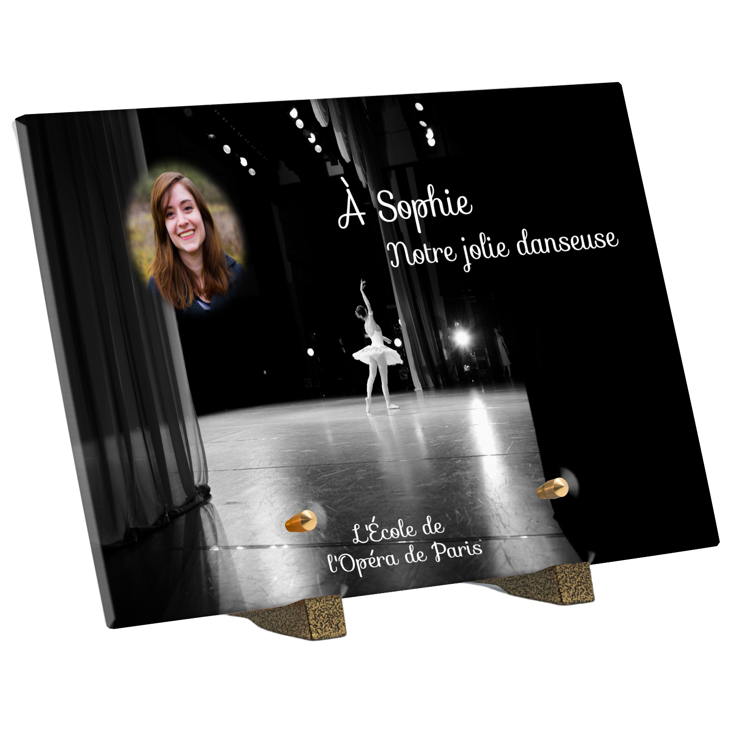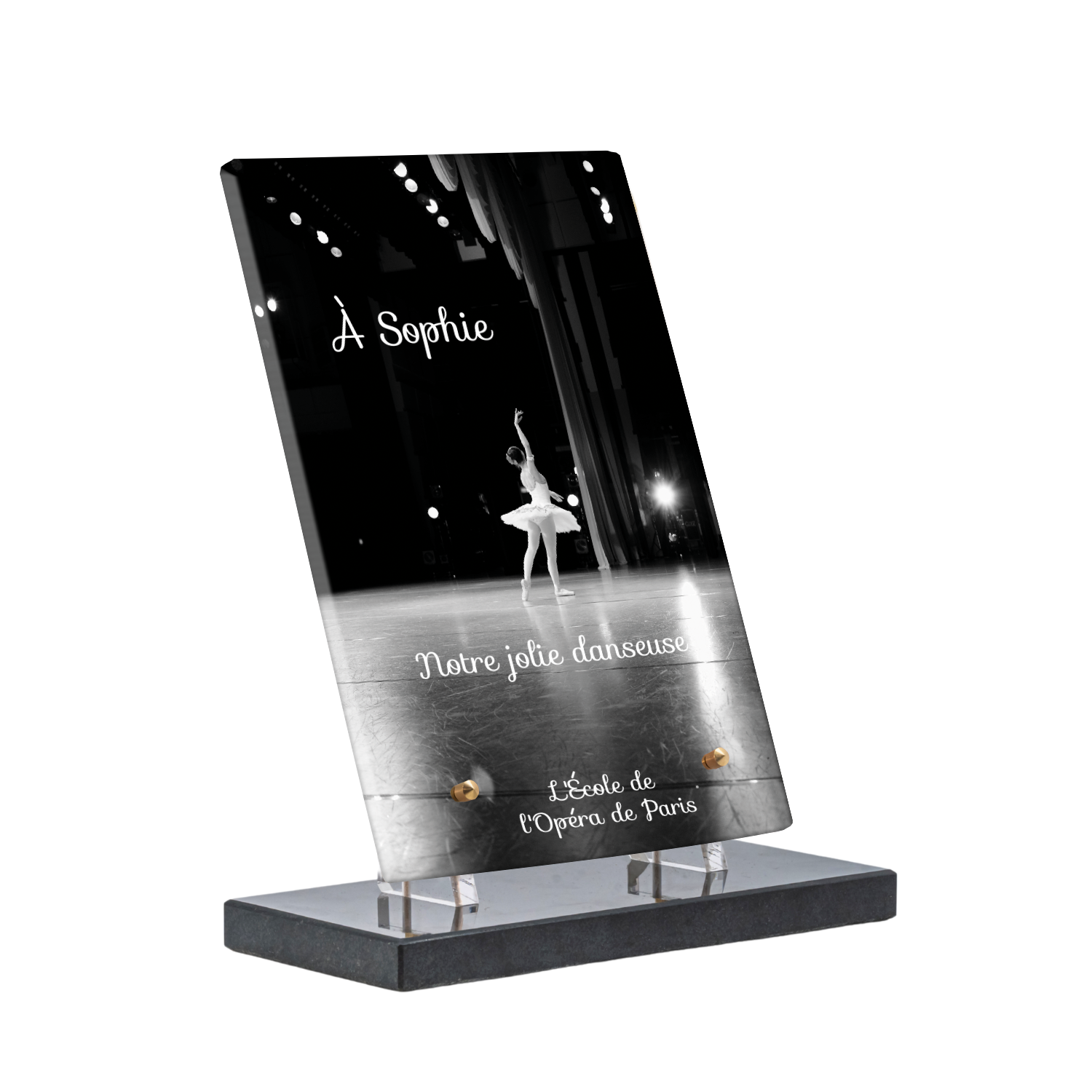 Offrez un hommage unique avec cette plaque funéraire personnalisée représentant une danseuse ballerine sur scène. Conçue en plexiglas, cette plaque funéraire moderne allie élégance et finesse pour célébrer la mémoire avec délicatesse. Son design soigné apporte une touche artistique et respectueuse, idéale pour rendre hommage à un être cher passionné de danse.