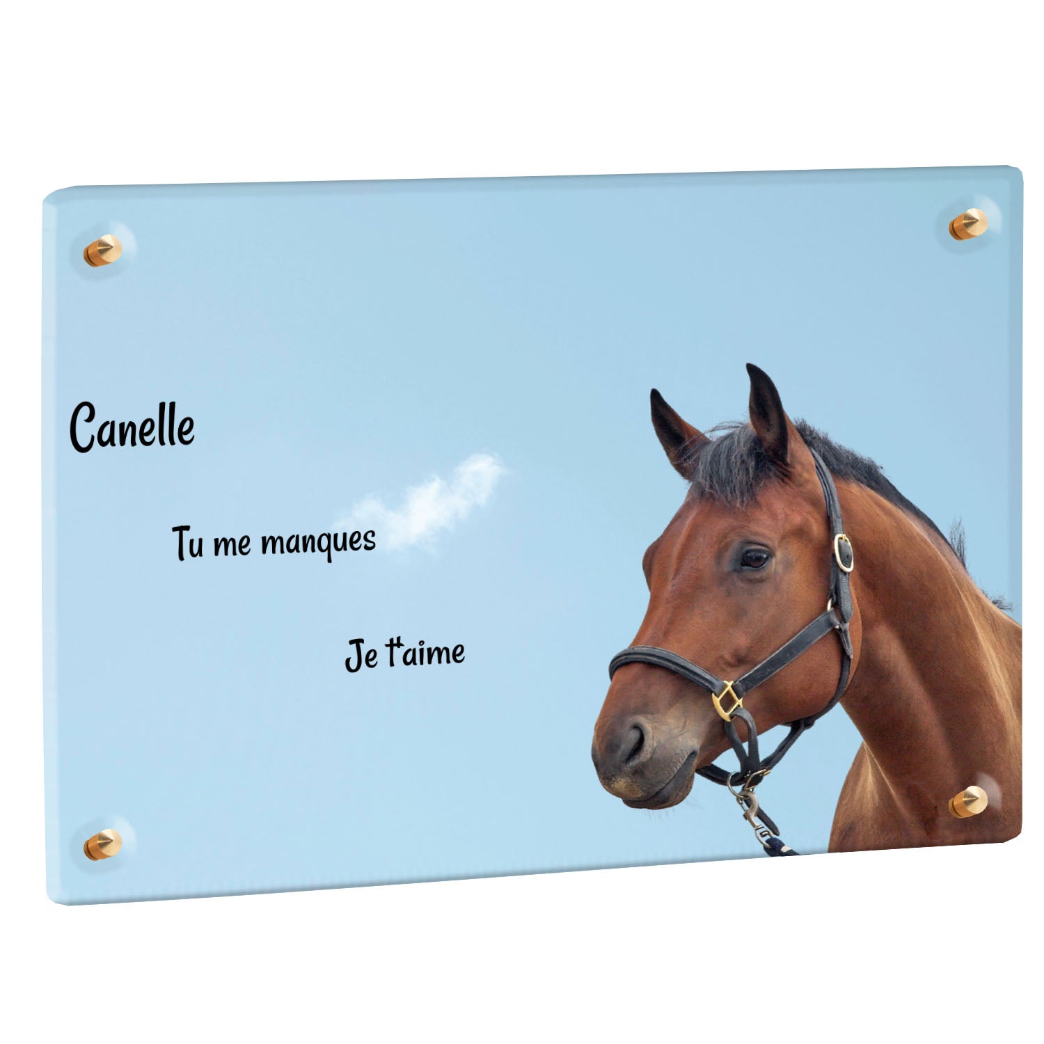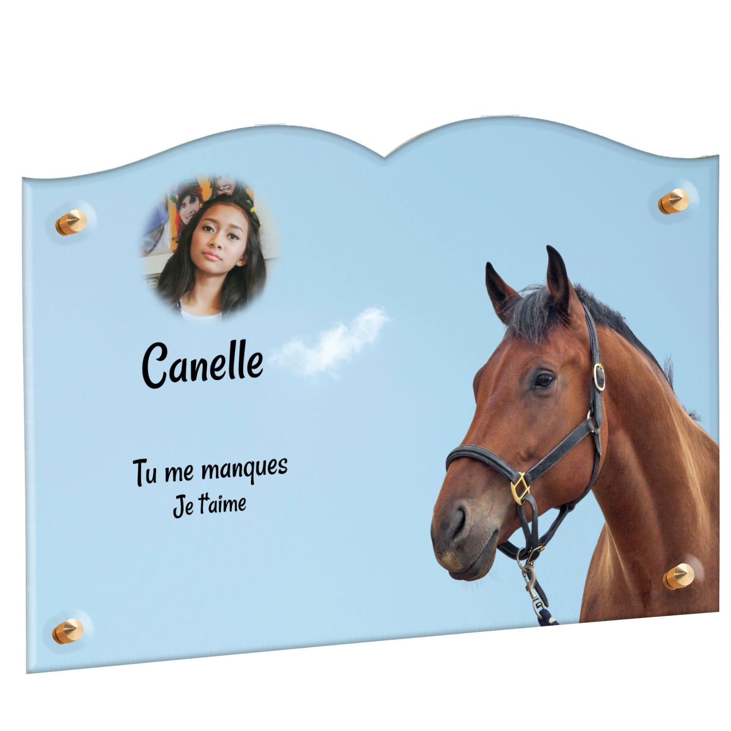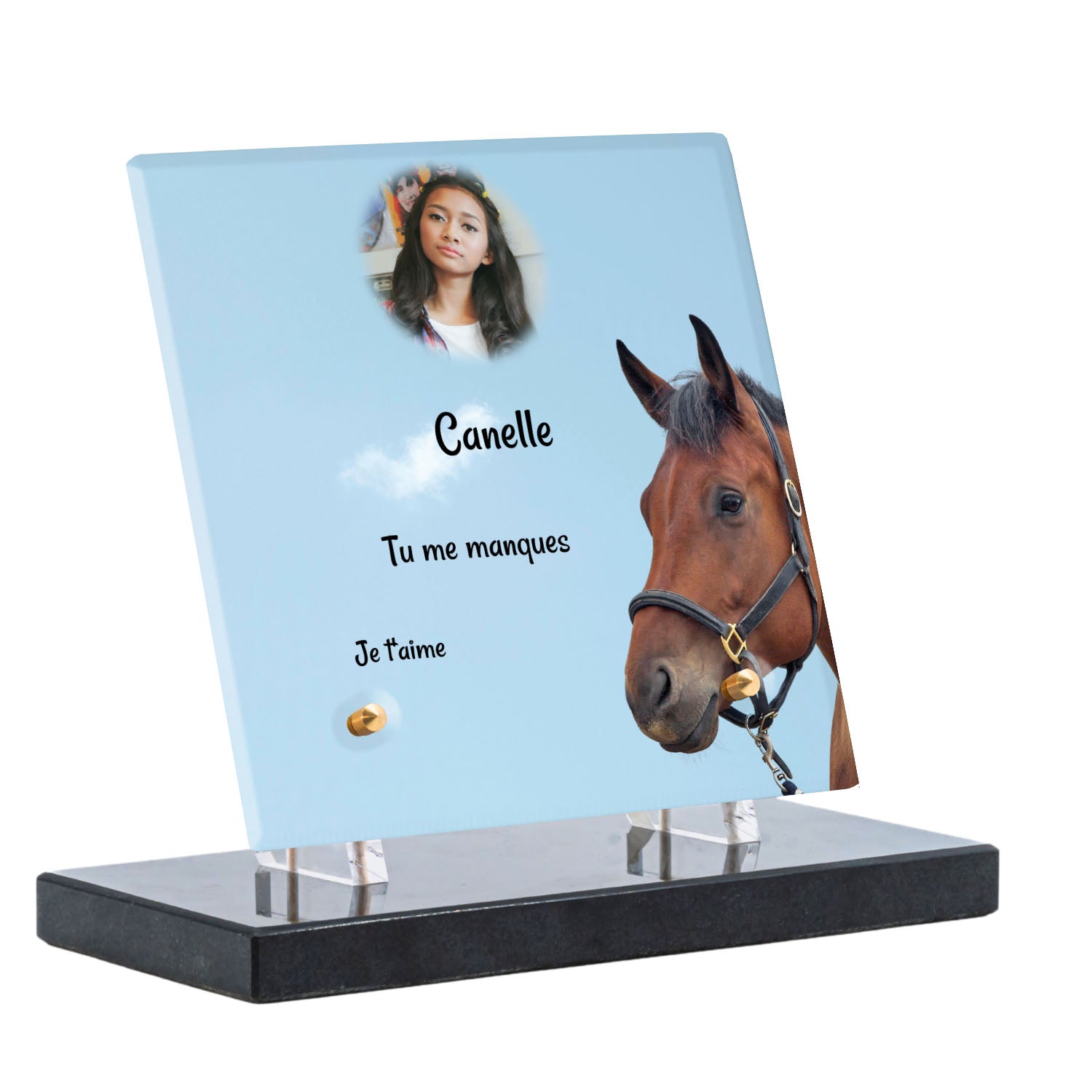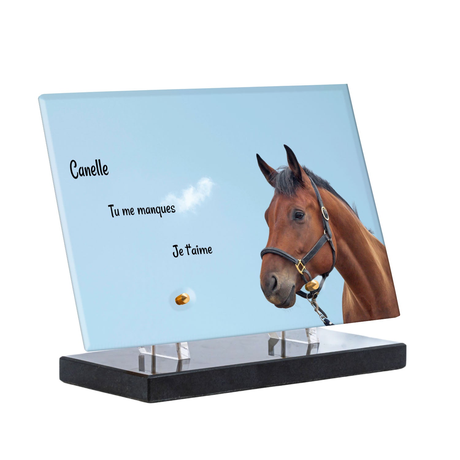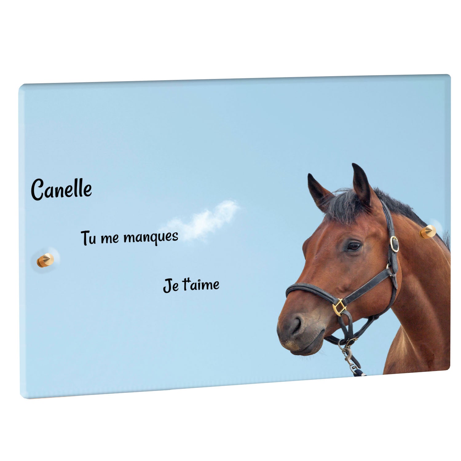 Offrez un hommage unique avec cette plaque funéraire personnalisée représentant un cheval, symbole de force et de liberté. Conçue en plexiglas, cette plaque mortuaire moderne allie élégance et résistance, idéale pour une commémoration durable. Son design soigné s’intègre parfaitement dans tout environnement funéraire, apportant une touche contemporaine et respectueuse.