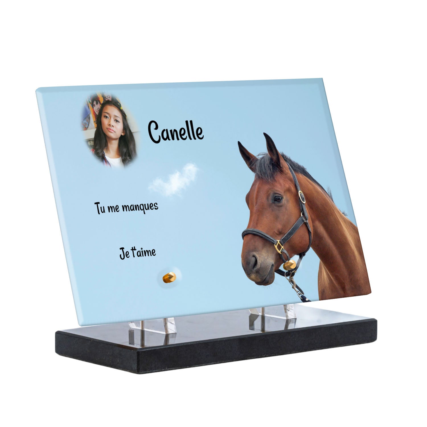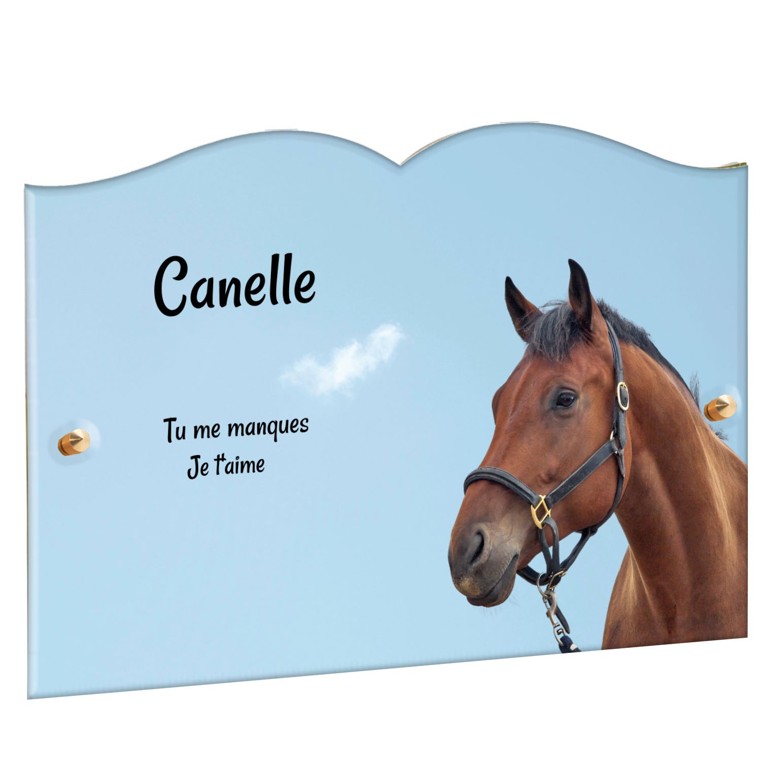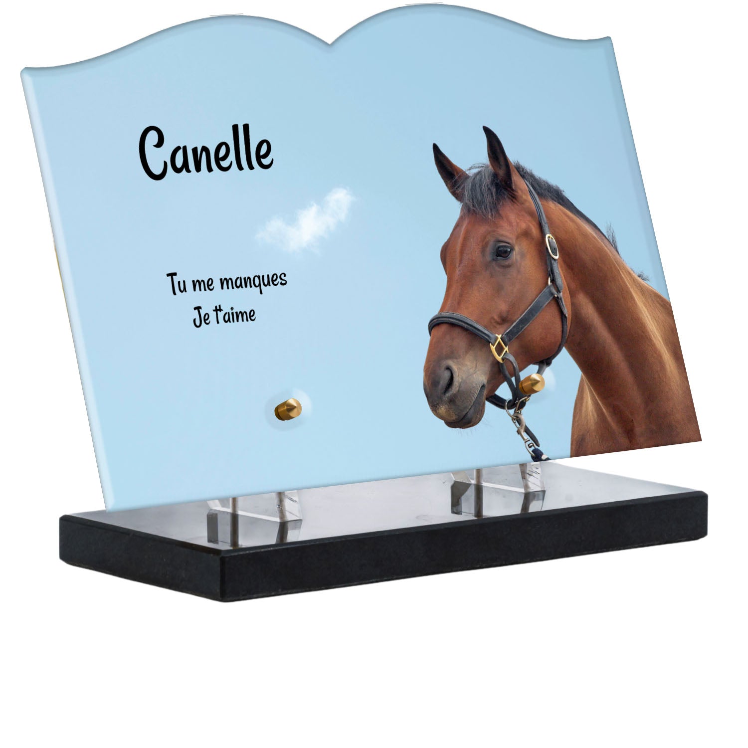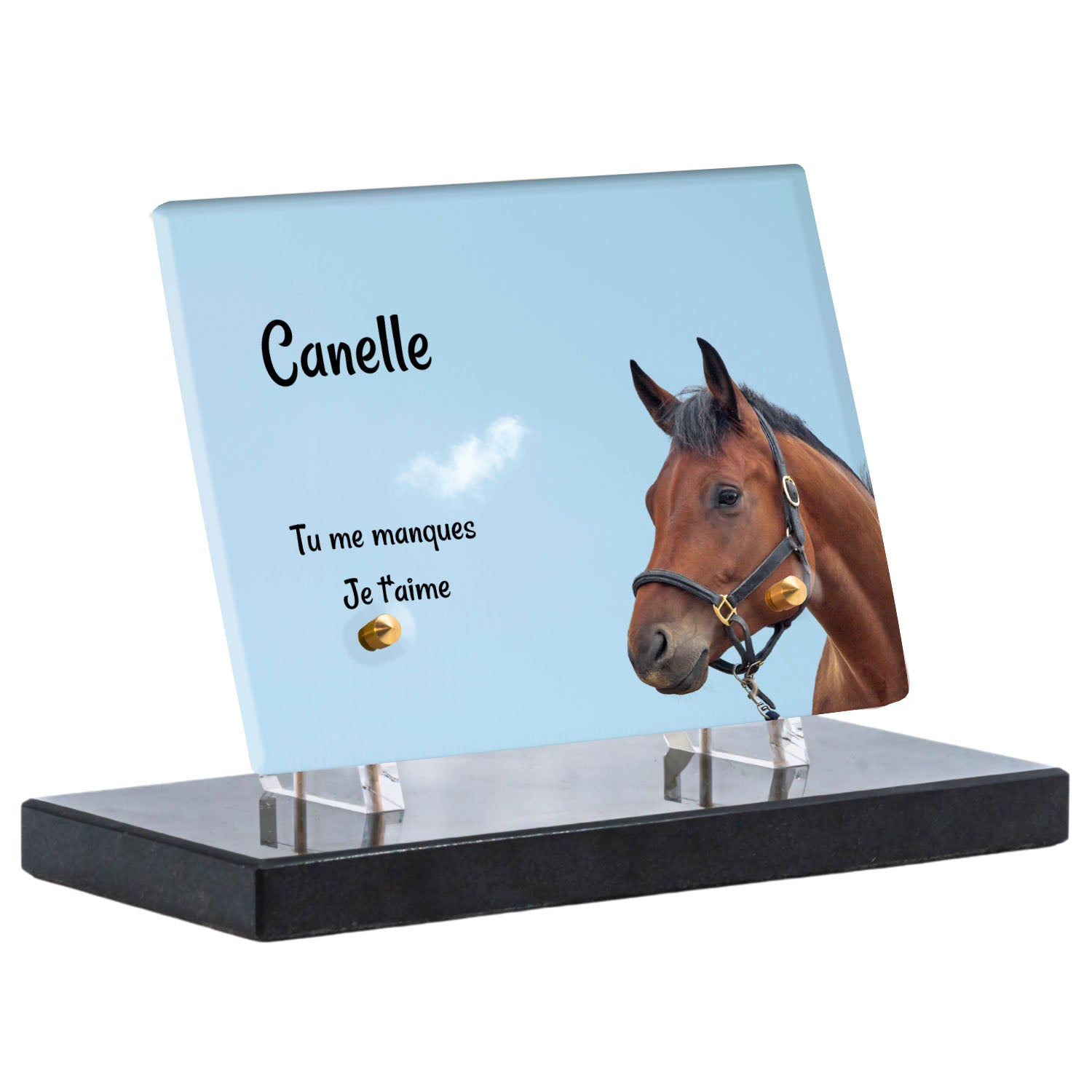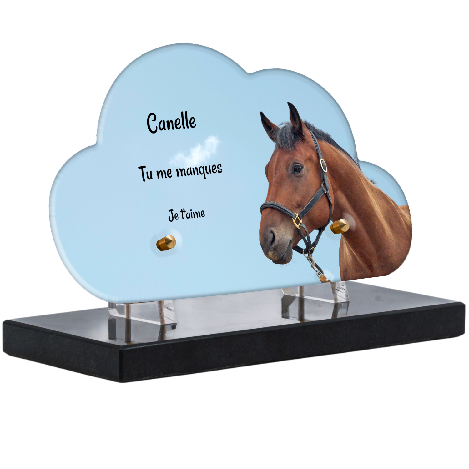Offrez un hommage unique avec cette plaque funéraire personnalisée représentant un cheval, symbole de force et de liberté. Conçue en plexiglas, cette plaque mortuaire moderne allie élégance et résistance, idéale pour une commémoration durable. Son design soigné s’intègre parfaitement dans tout environnement funéraire, apportant une touche contemporaine et respectueuse.