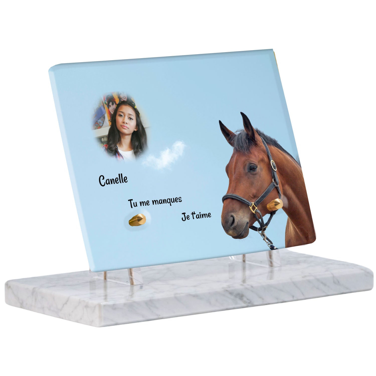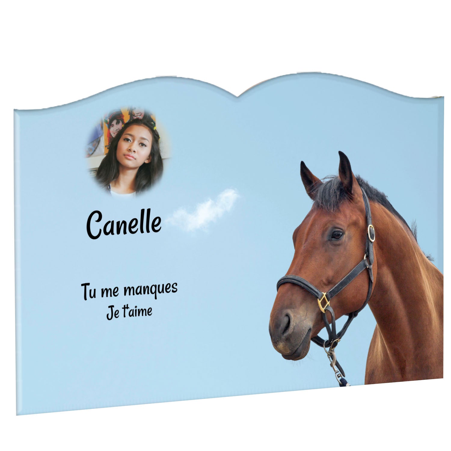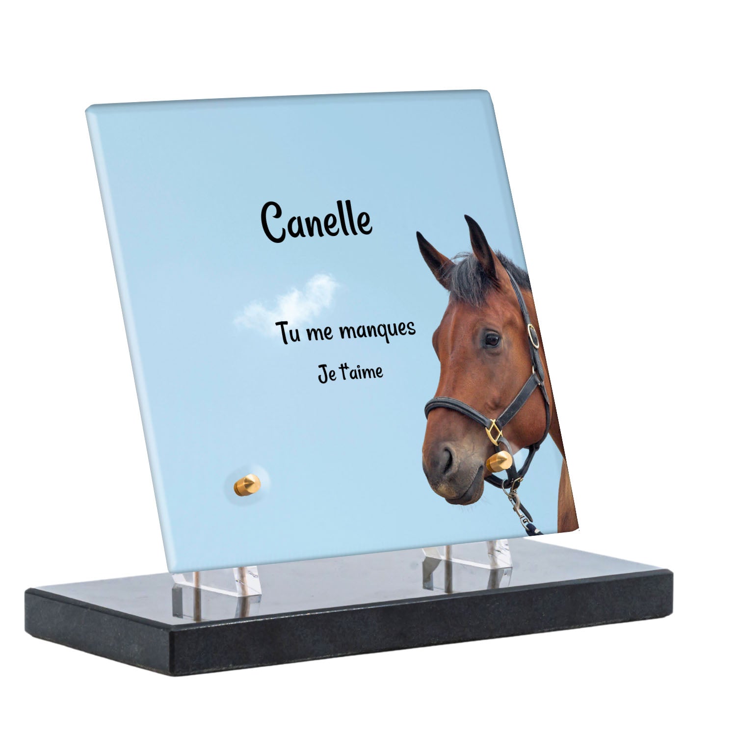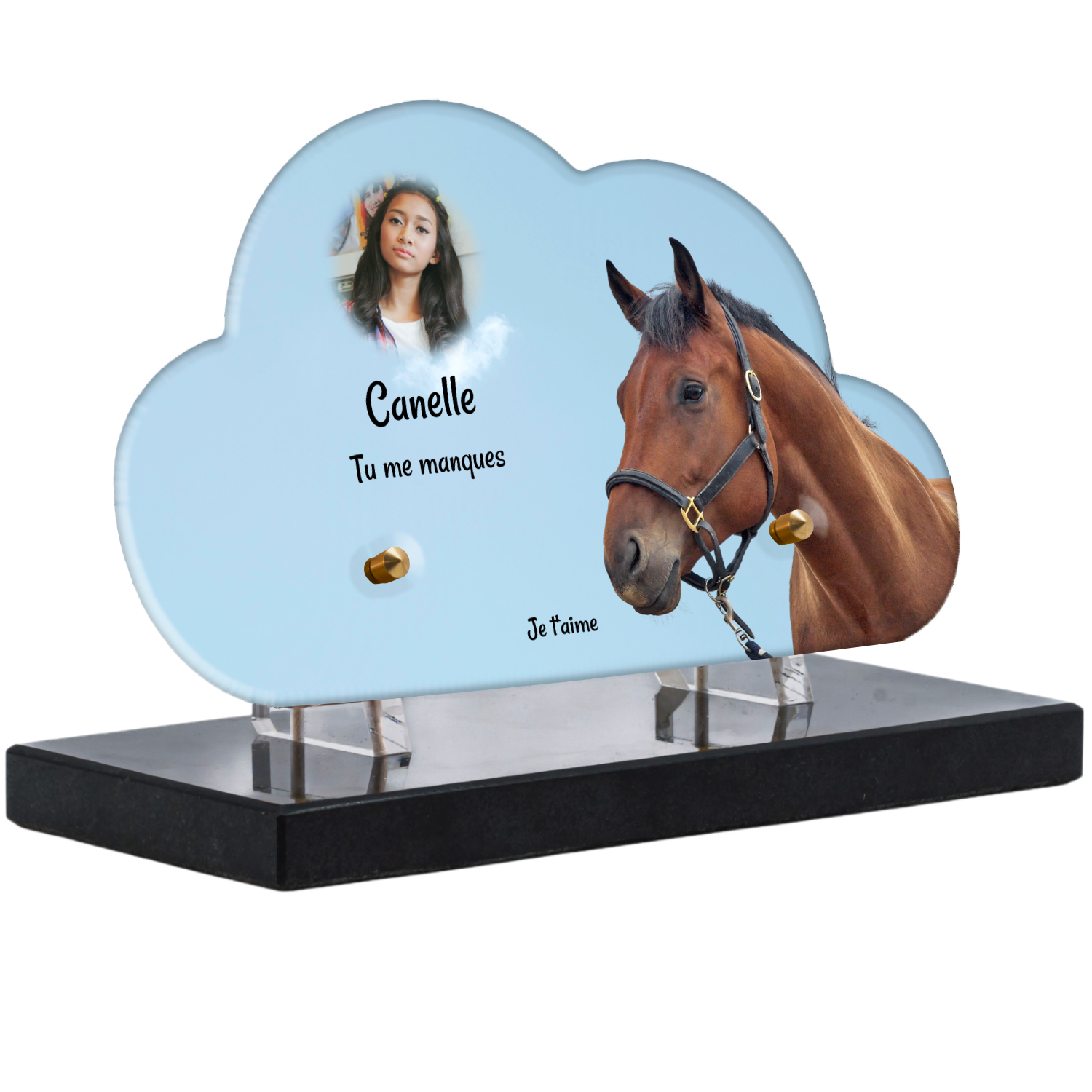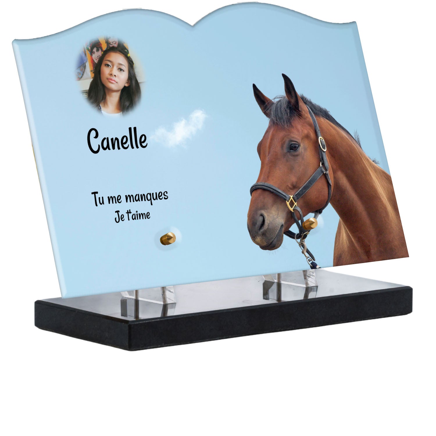 Offrez un hommage unique avec cette plaque funéraire personnalisée représentant un cheval, symbole de force et de liberté. Conçue en plexiglas, cette plaque mortuaire moderne allie élégance et résistance, idéale pour une commémoration durable. Son design soigné s’intègre parfaitement dans tout environnement funéraire, apportant une touche contemporaine et respectueuse.