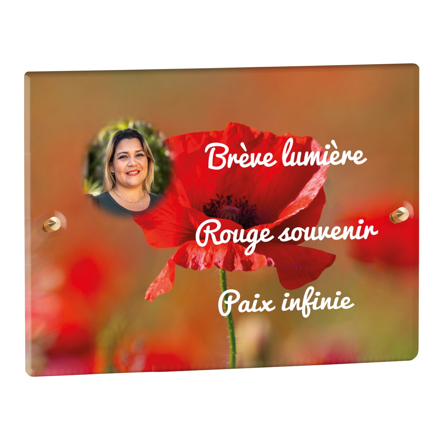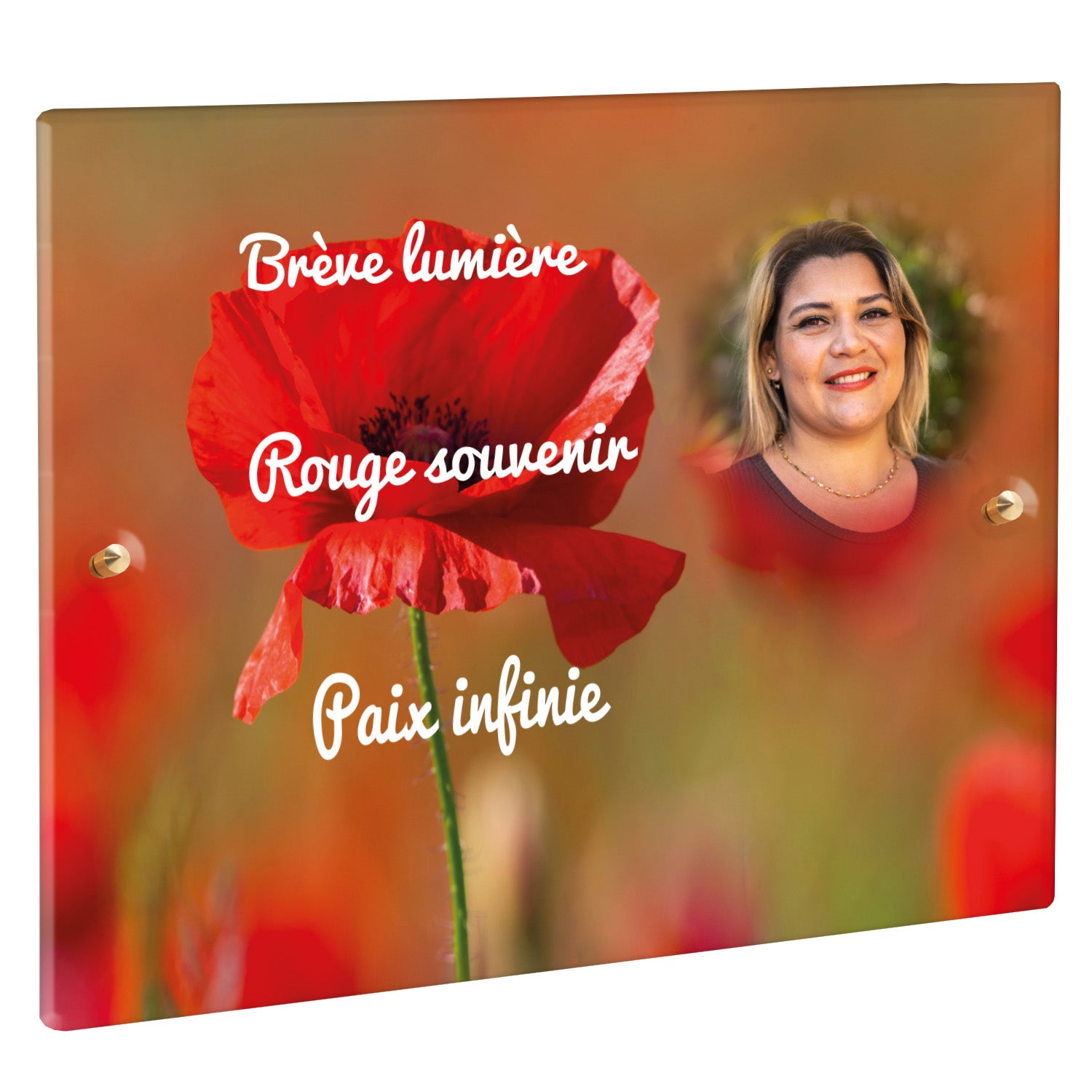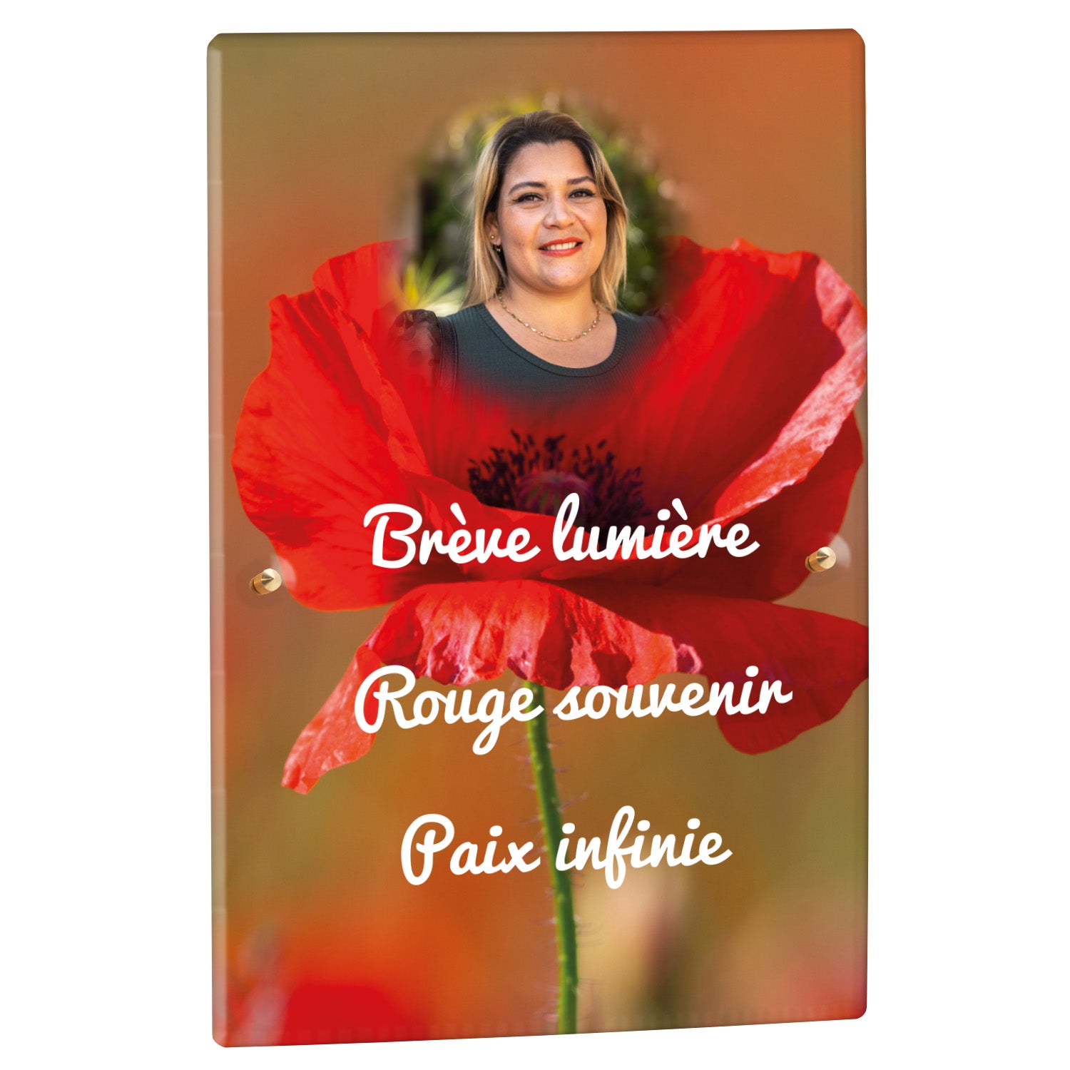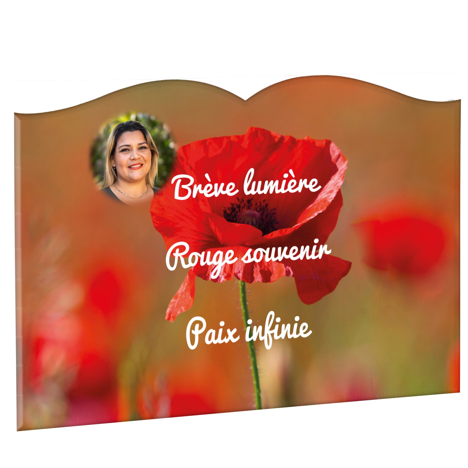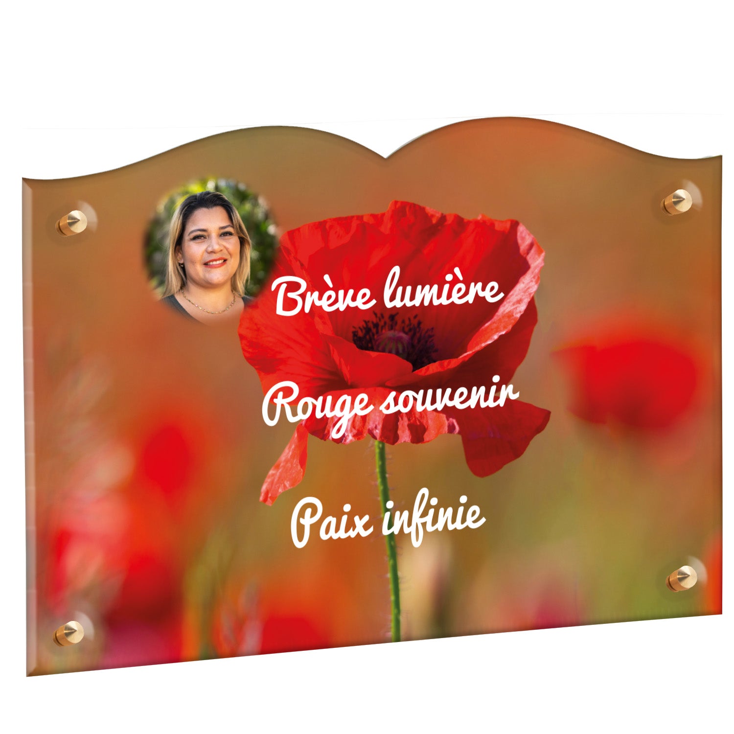 Cette plaque funéraire personnalisée représente élégamment des coquelicots, apportant une touche moderne et délicate à votre hommage. Conçue en plexiglas, cette plaque mortuaire allie esthétisme et résistance, parfaite pour un souvenir qui perdure. Son design sobre et raffiné s’intègre harmonieusement à tout type de sépulture, offrant un rendu contemporain et respectueux.