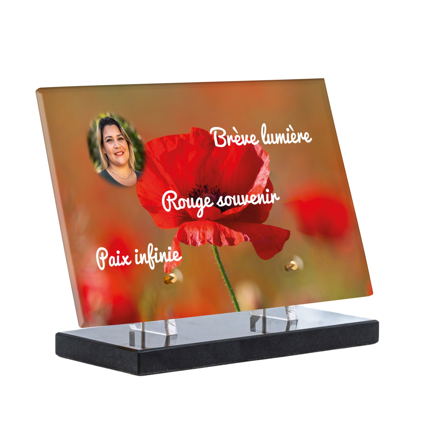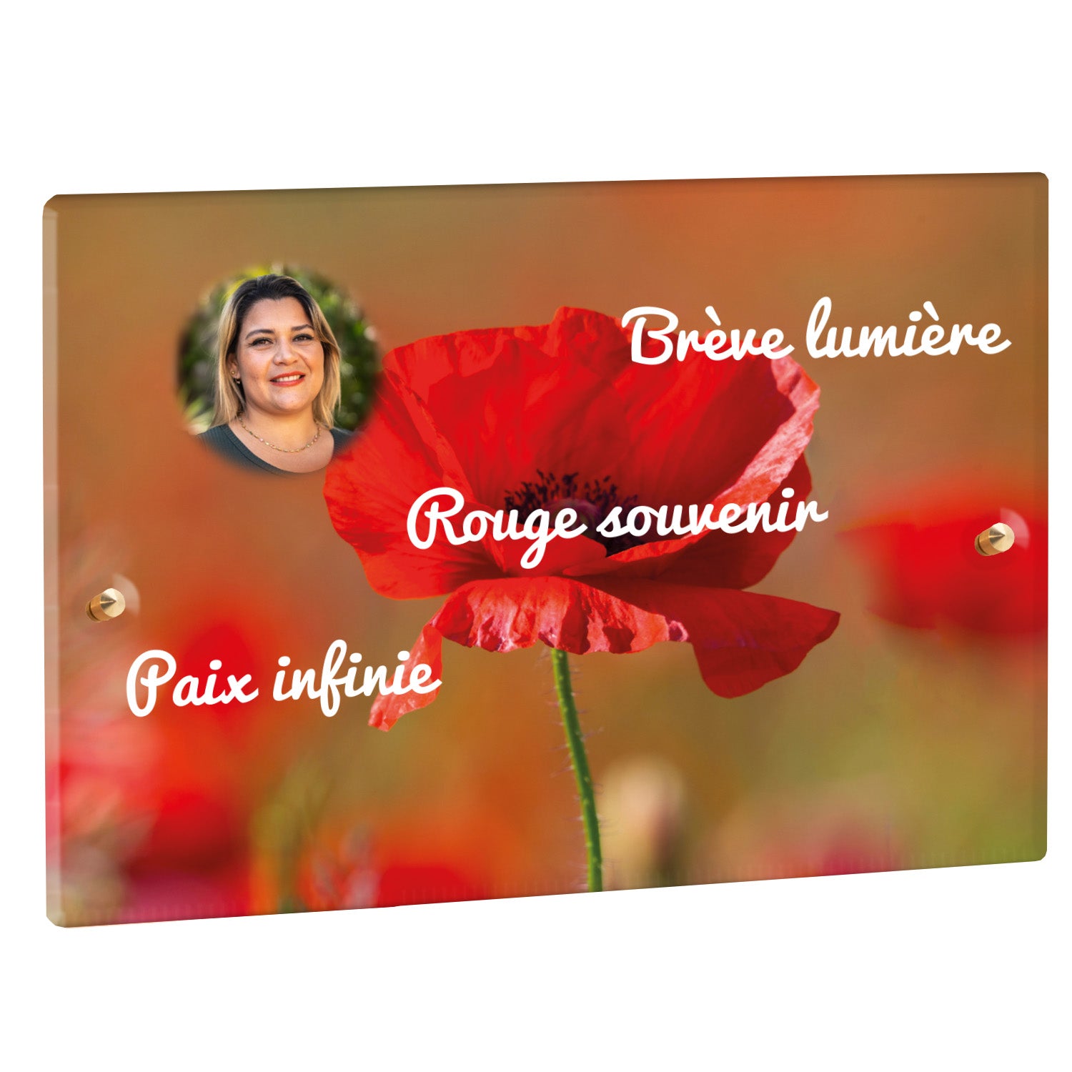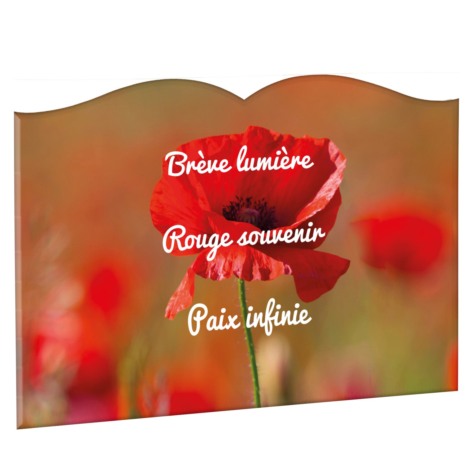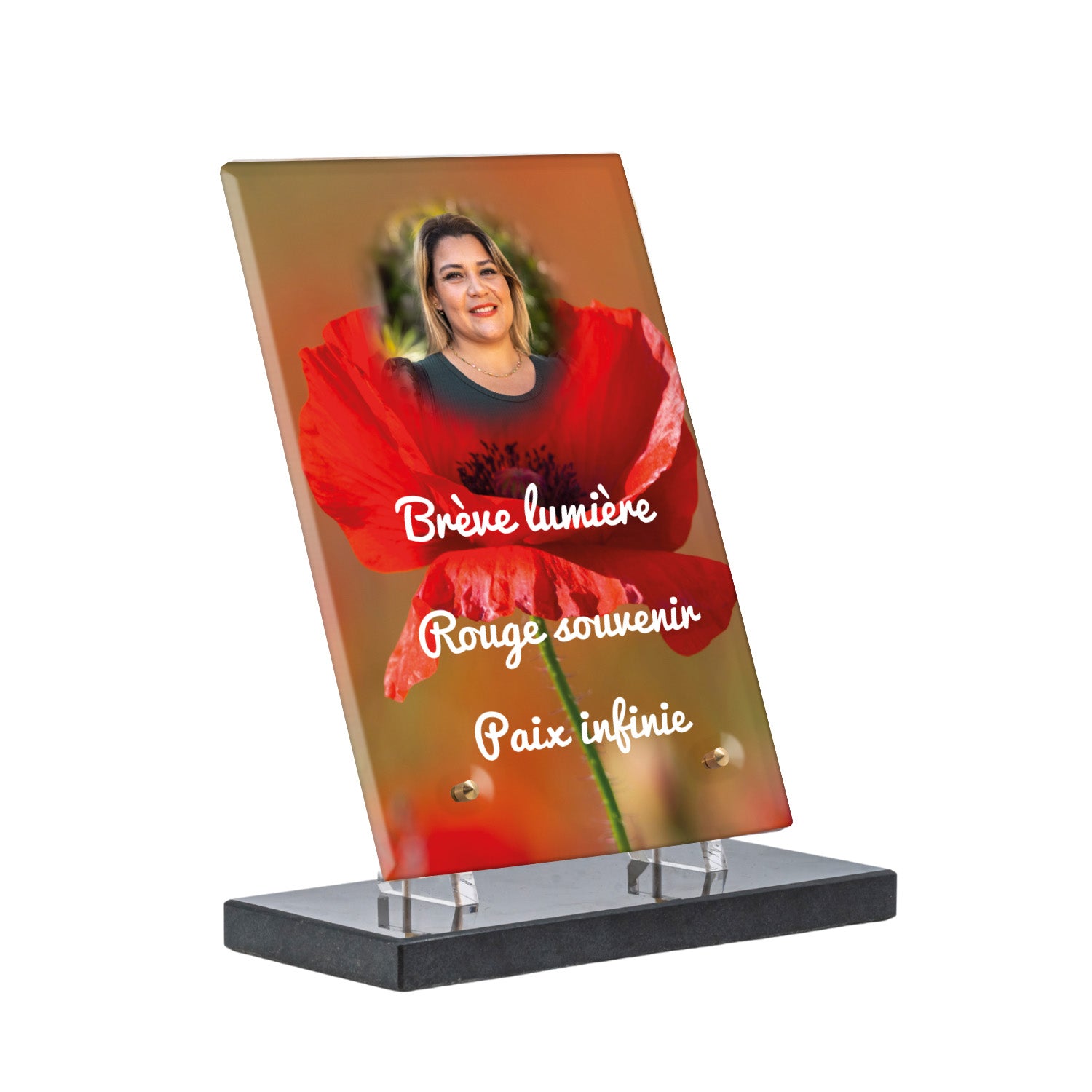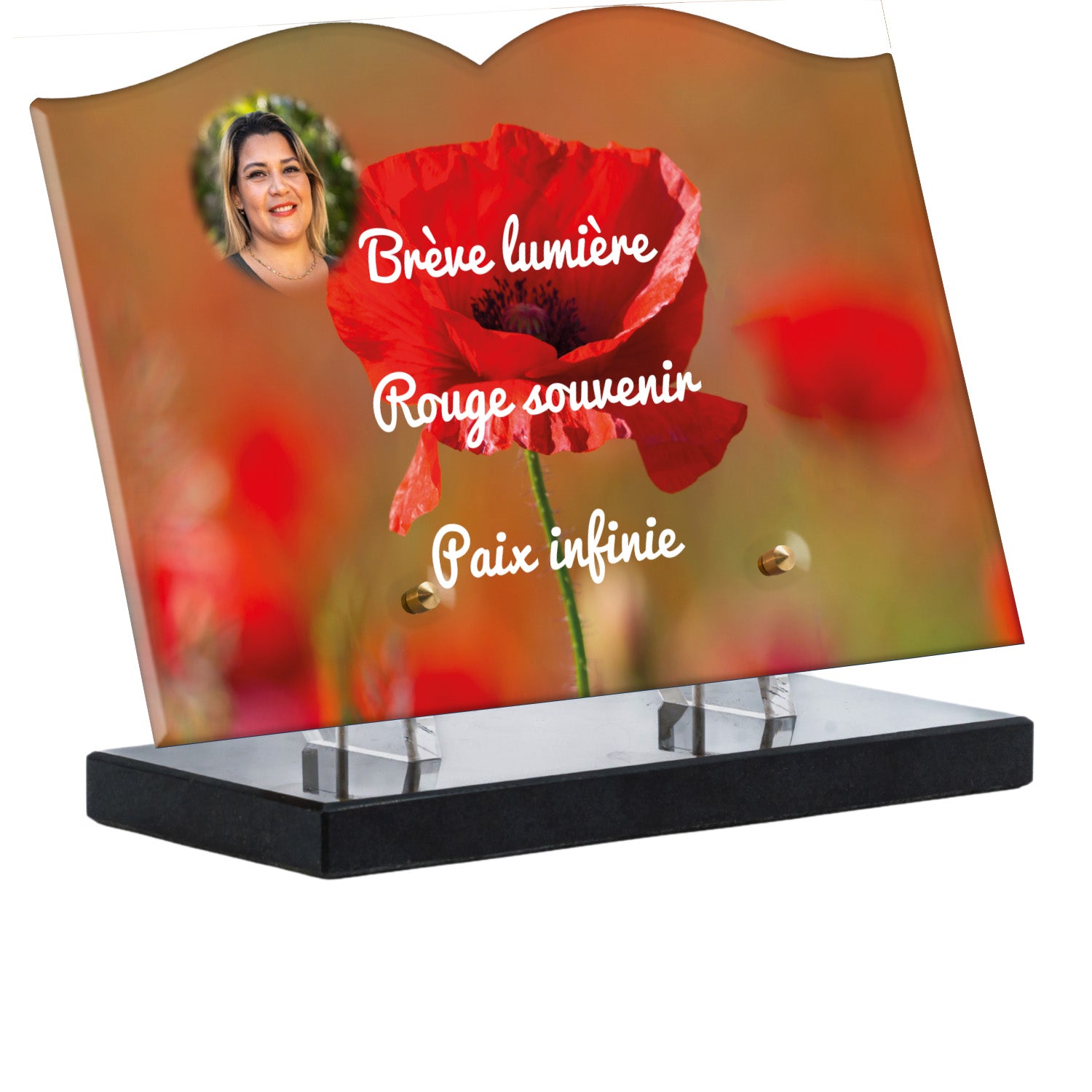 Cette plaque funéraire personnalisée représente élégamment des coquelicots, apportant une touche moderne et délicate à votre hommage. Conçue en plexiglas, cette plaque mortuaire allie esthétisme et résistance, parfaite pour un souvenir qui perdure. Son design sobre et raffiné s’intègre harmonieusement à tout type de sépulture, offrant un rendu contemporain et respectueux.
