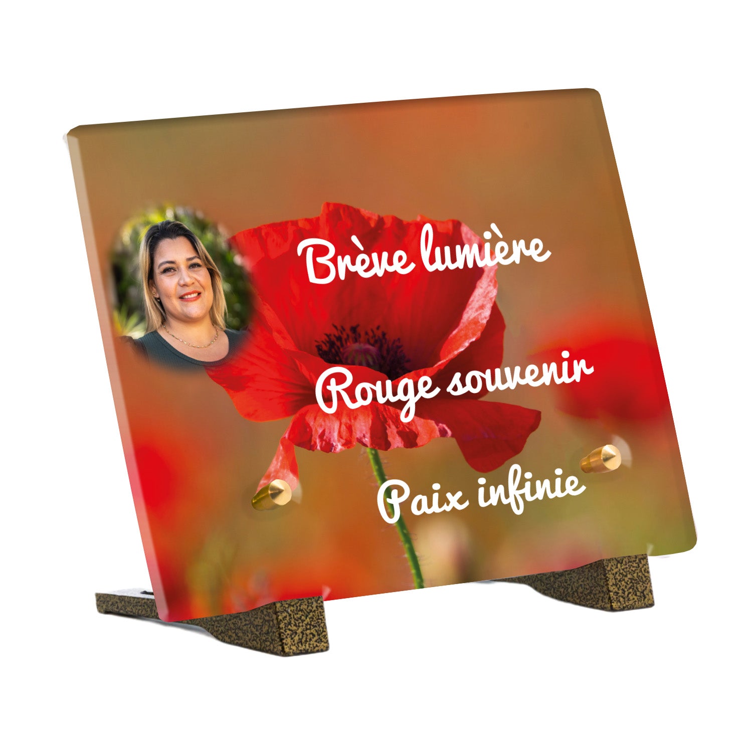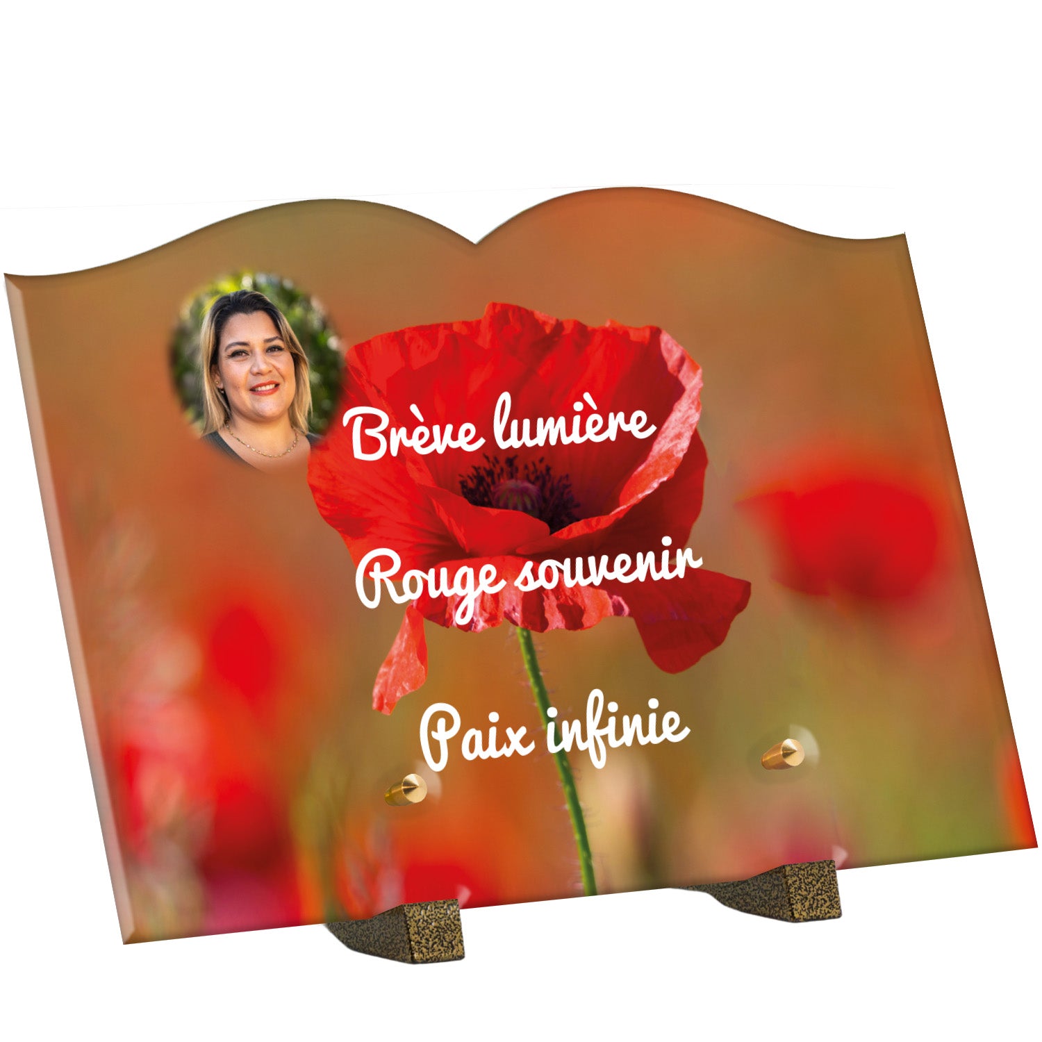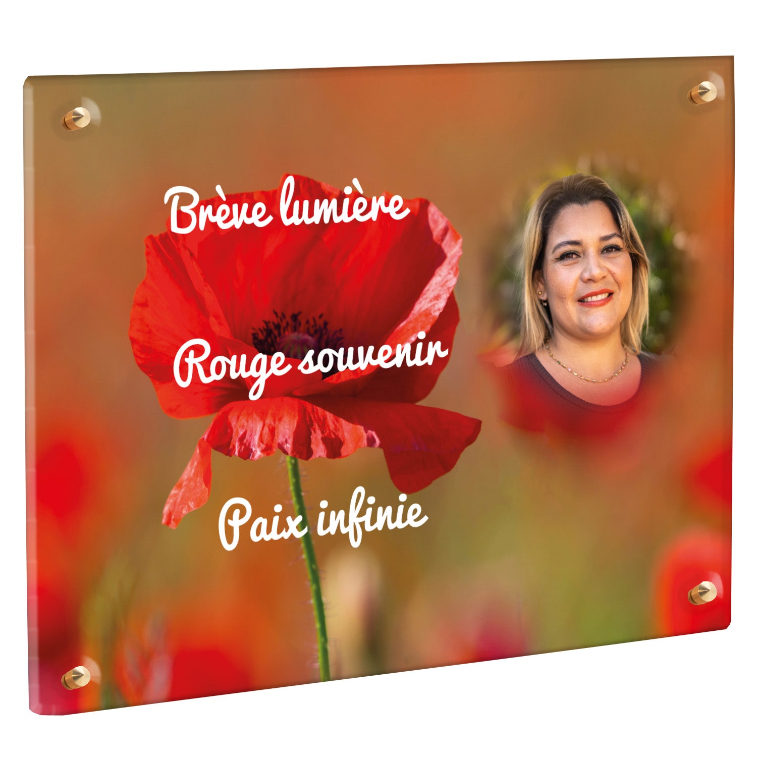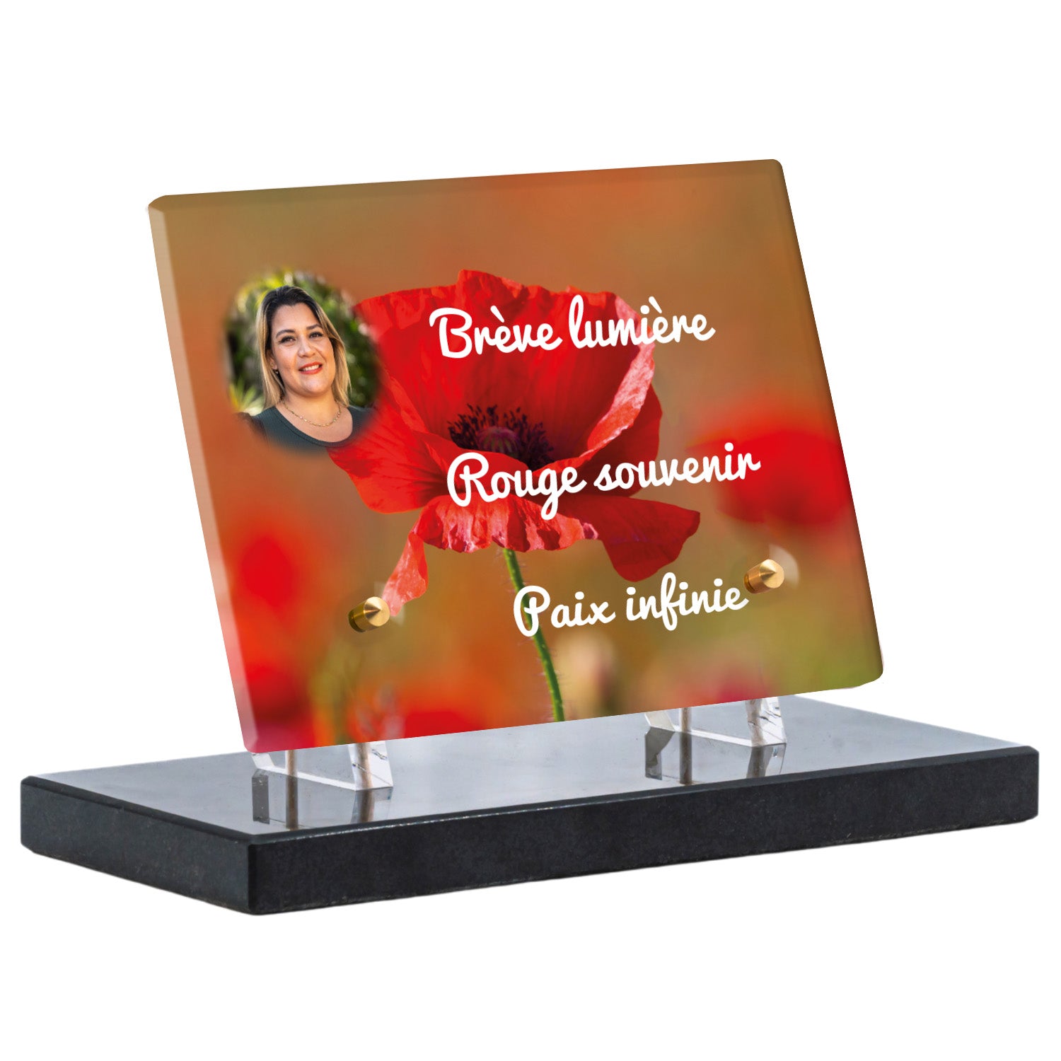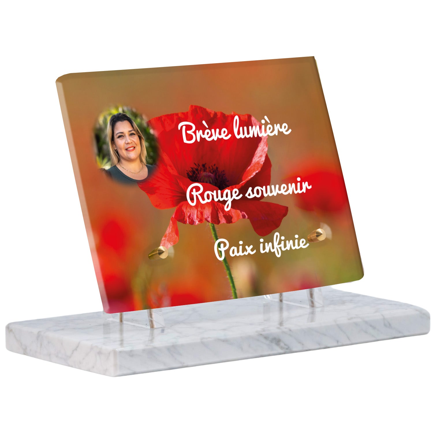Cette plaque funéraire personnalisée représente élégamment des coquelicots, apportant une touche moderne et délicate à votre hommage. Conçue en plexiglas, cette plaque mortuaire allie esthétisme et résistance, parfaite pour un souvenir qui perdure. Son design sobre et raffiné s’intègre harmonieusement à tout type de sépulture, offrant un rendu contemporain et respectueux.
