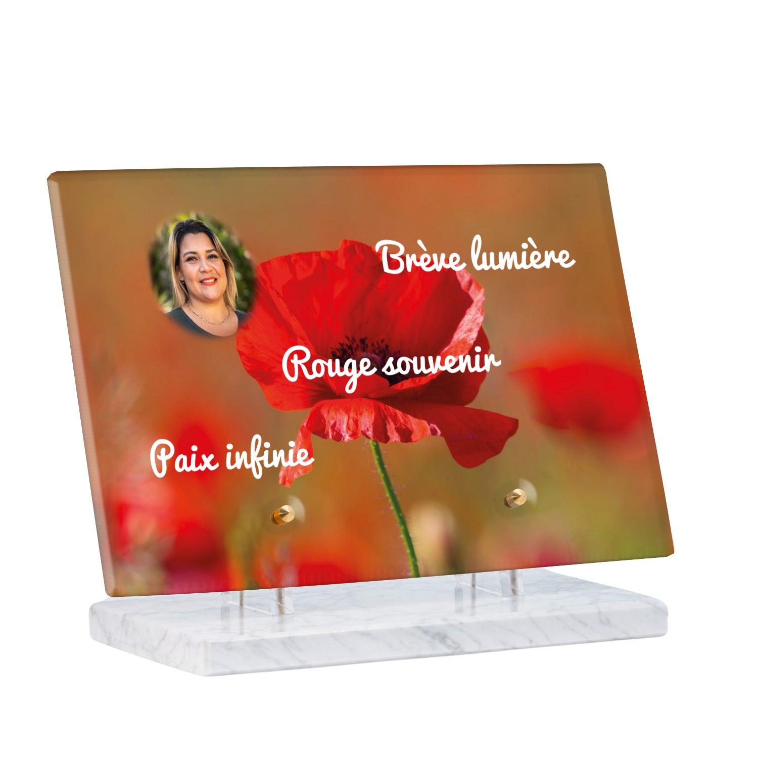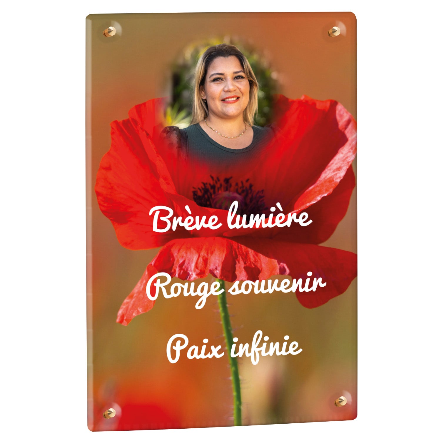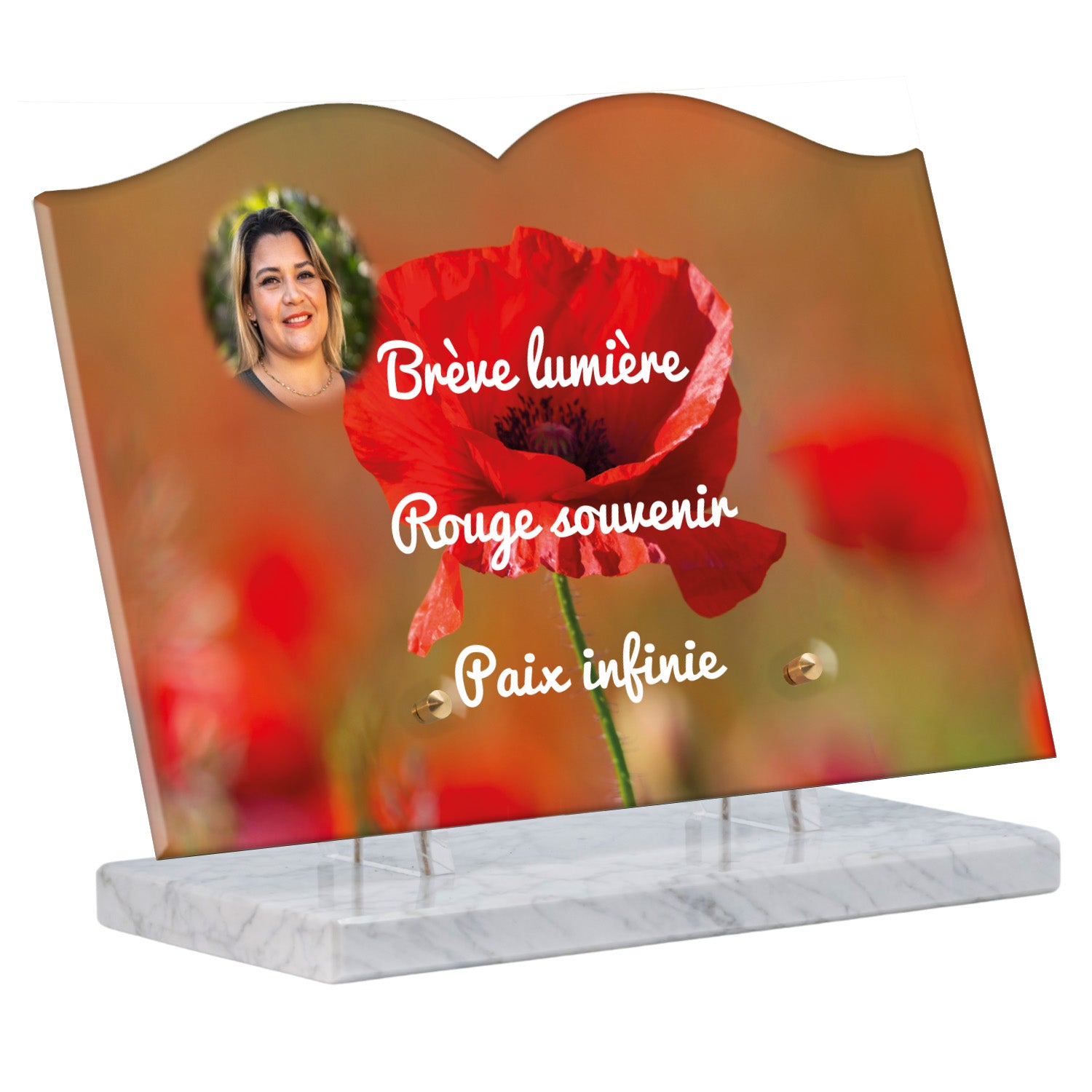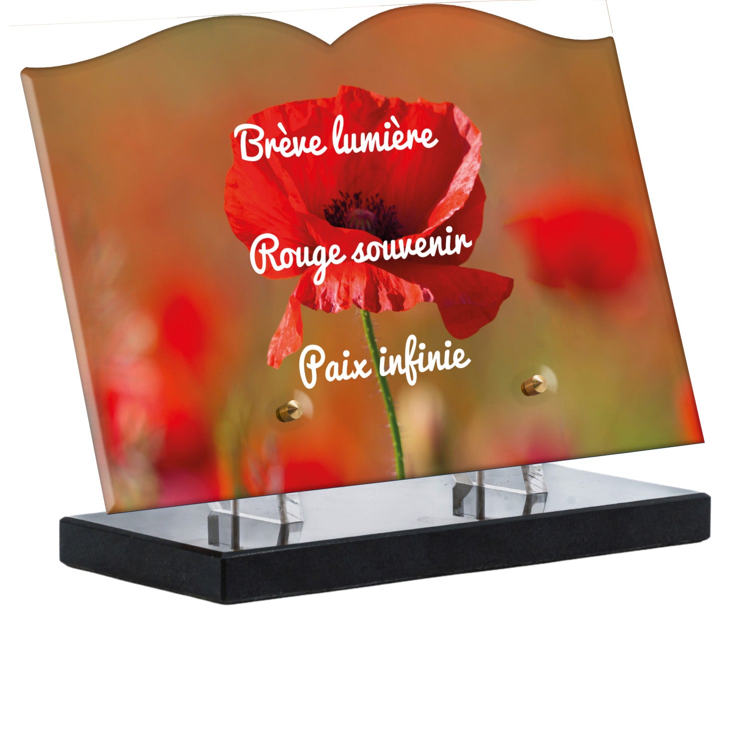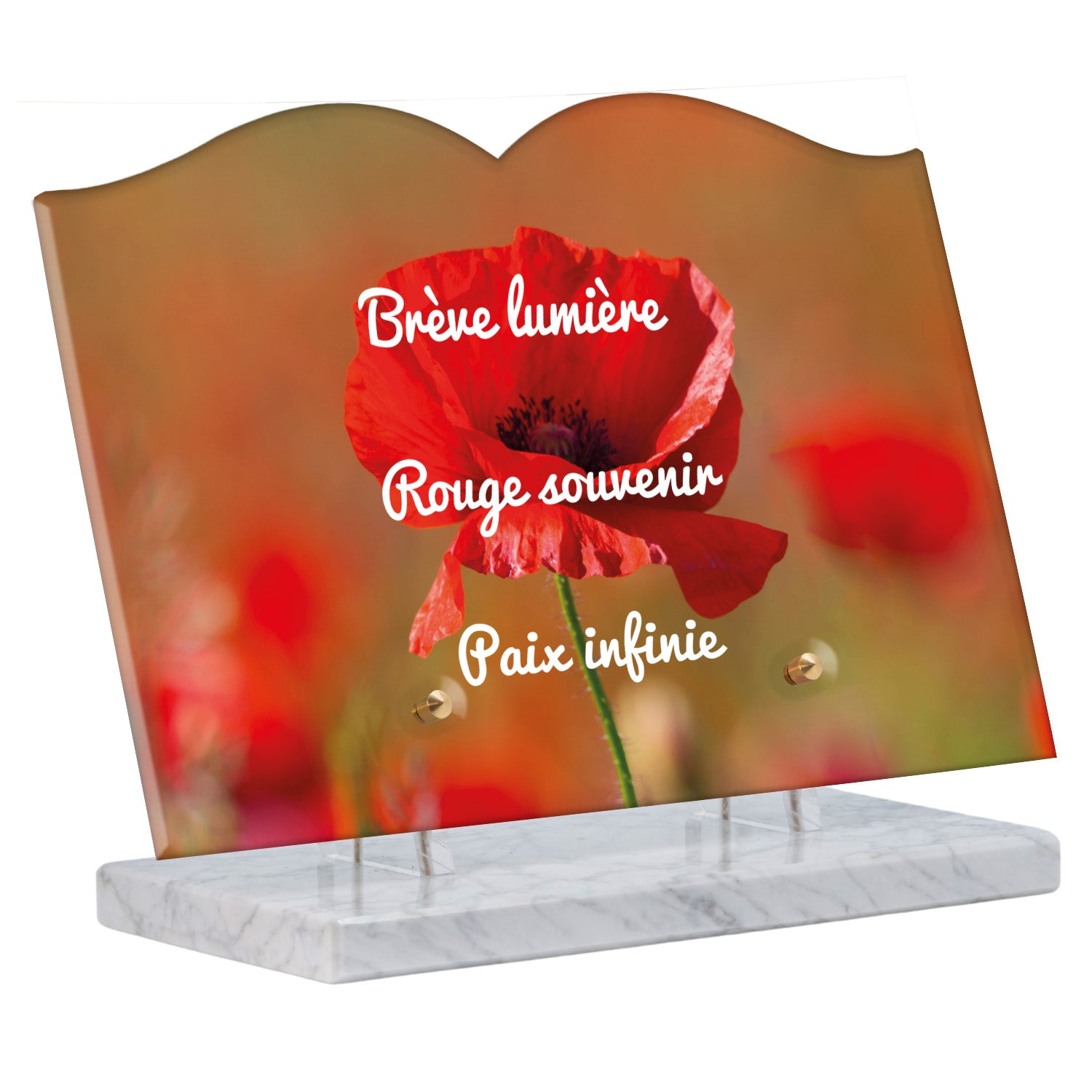 Cette plaque funéraire personnalisée représente élégamment des coquelicots, apportant une touche moderne et délicate à votre hommage. Conçue en plexiglas, cette plaque mortuaire allie esthétisme et résistance, parfaite pour un souvenir qui perdure. Son design sobre et raffiné s’intègre harmonieusement à tout type de sépulture, offrant un rendu contemporain et respectueux.