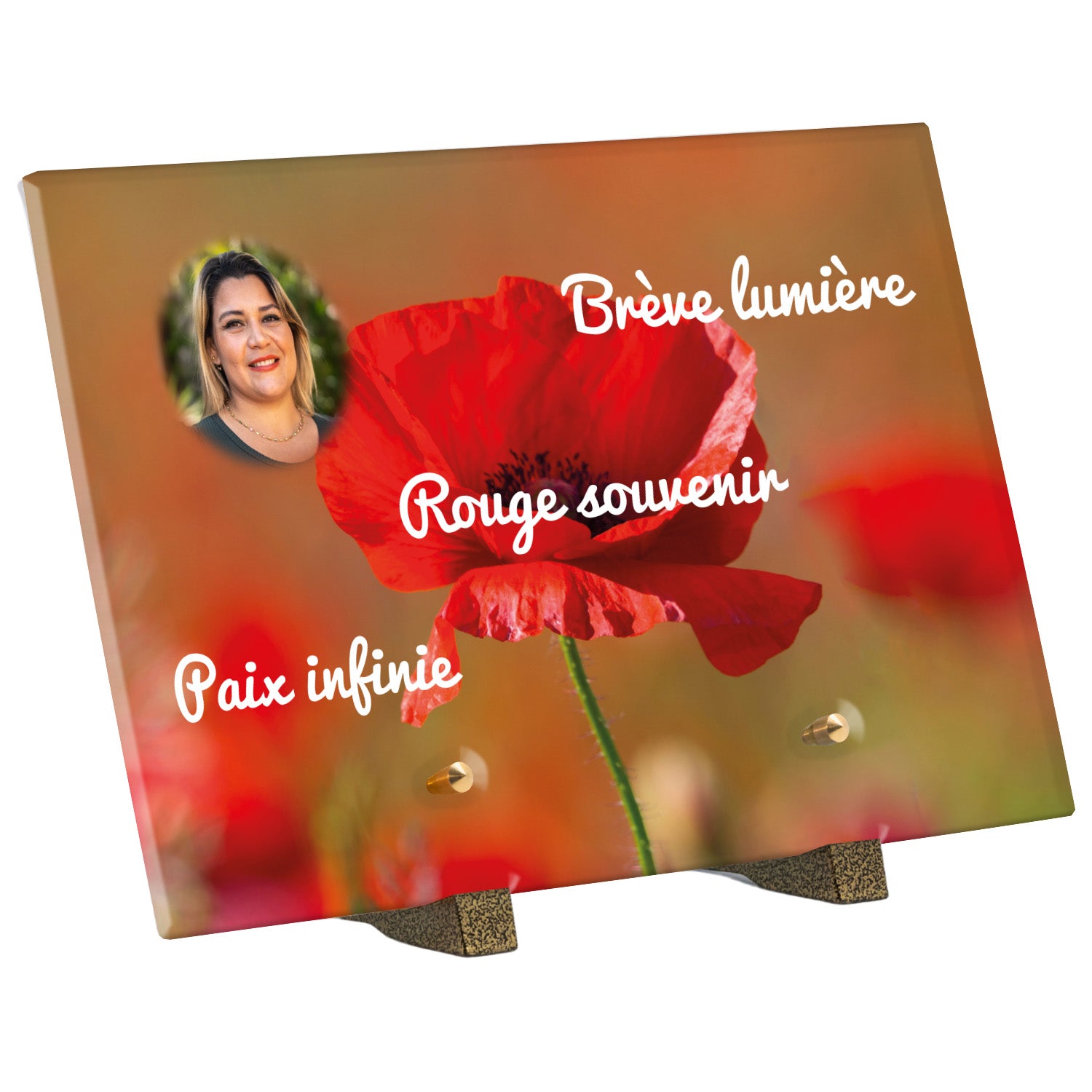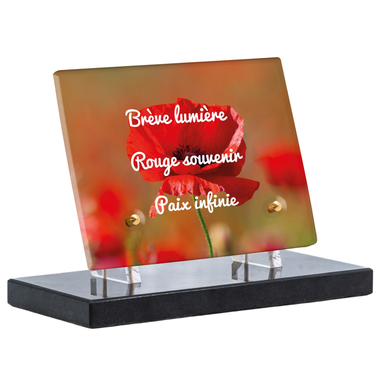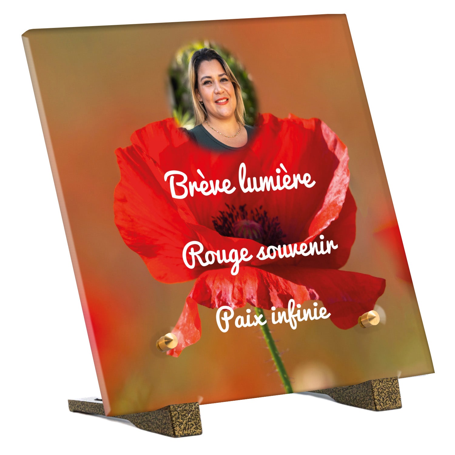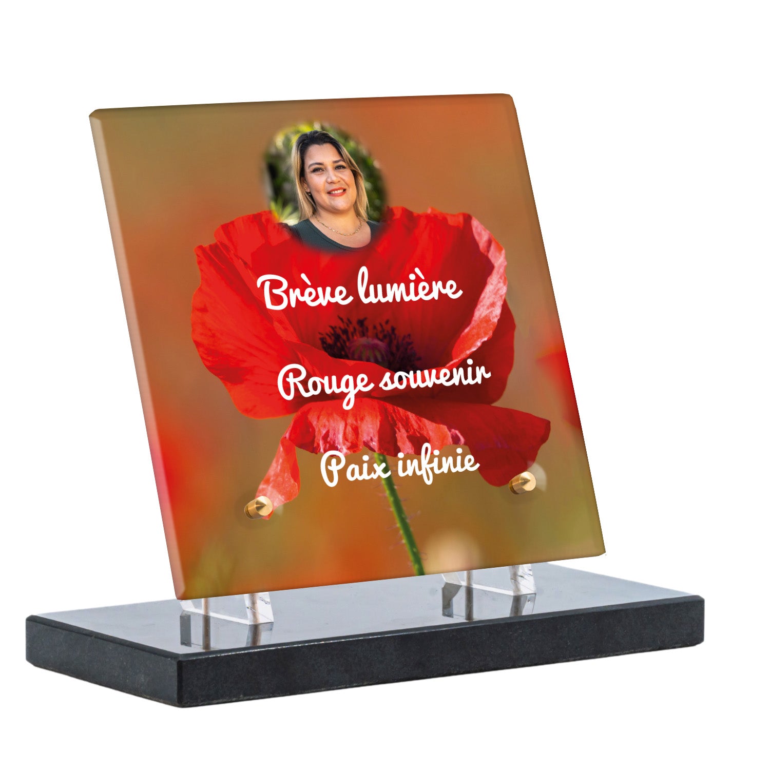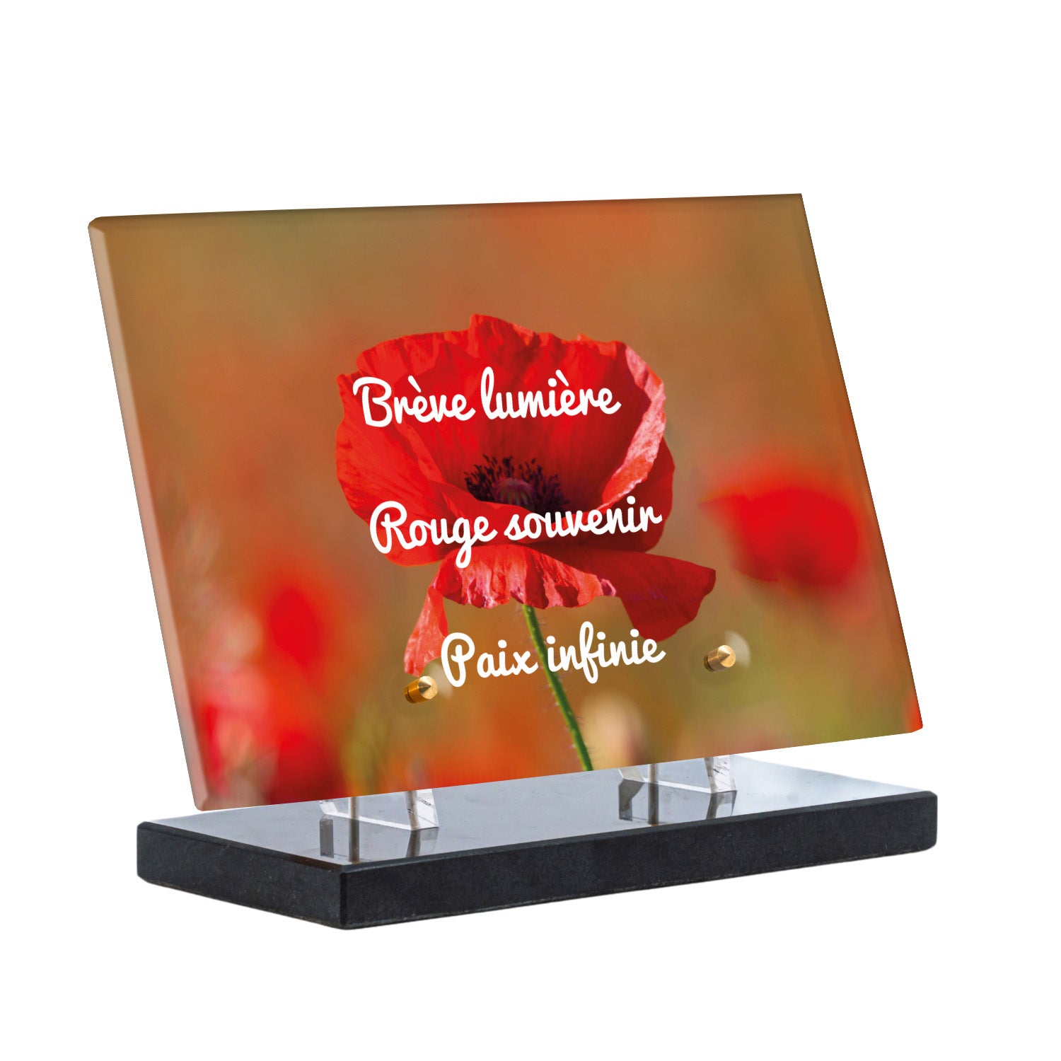 Cette plaque funéraire personnalisée représente élégamment des coquelicots, apportant une touche moderne et délicate à votre hommage. Conçue en plexiglas, cette plaque mortuaire allie esthétisme et résistance, parfaite pour un souvenir qui perdure. Son design sobre et raffiné s’intègre harmonieusement à tout type de sépulture, offrant un rendu contemporain et respectueux.