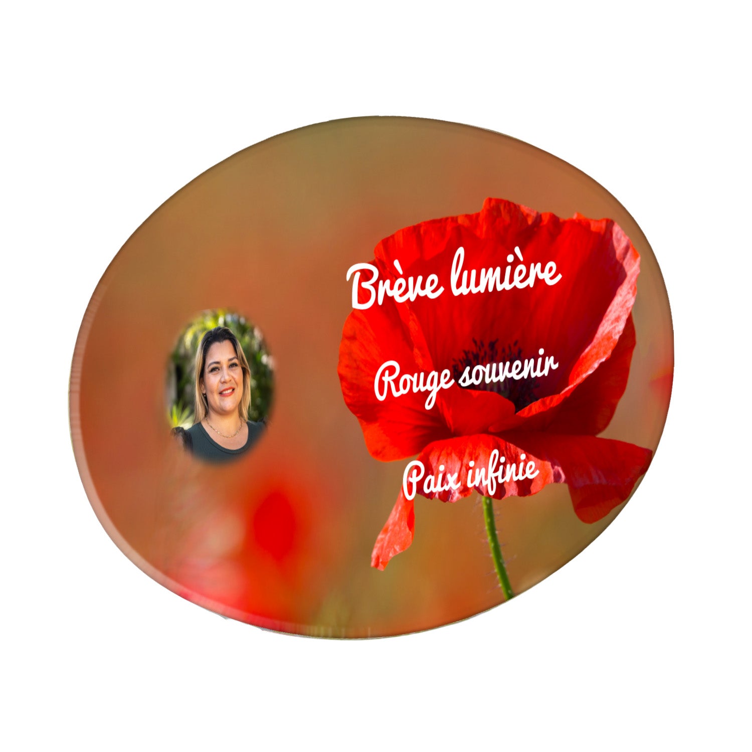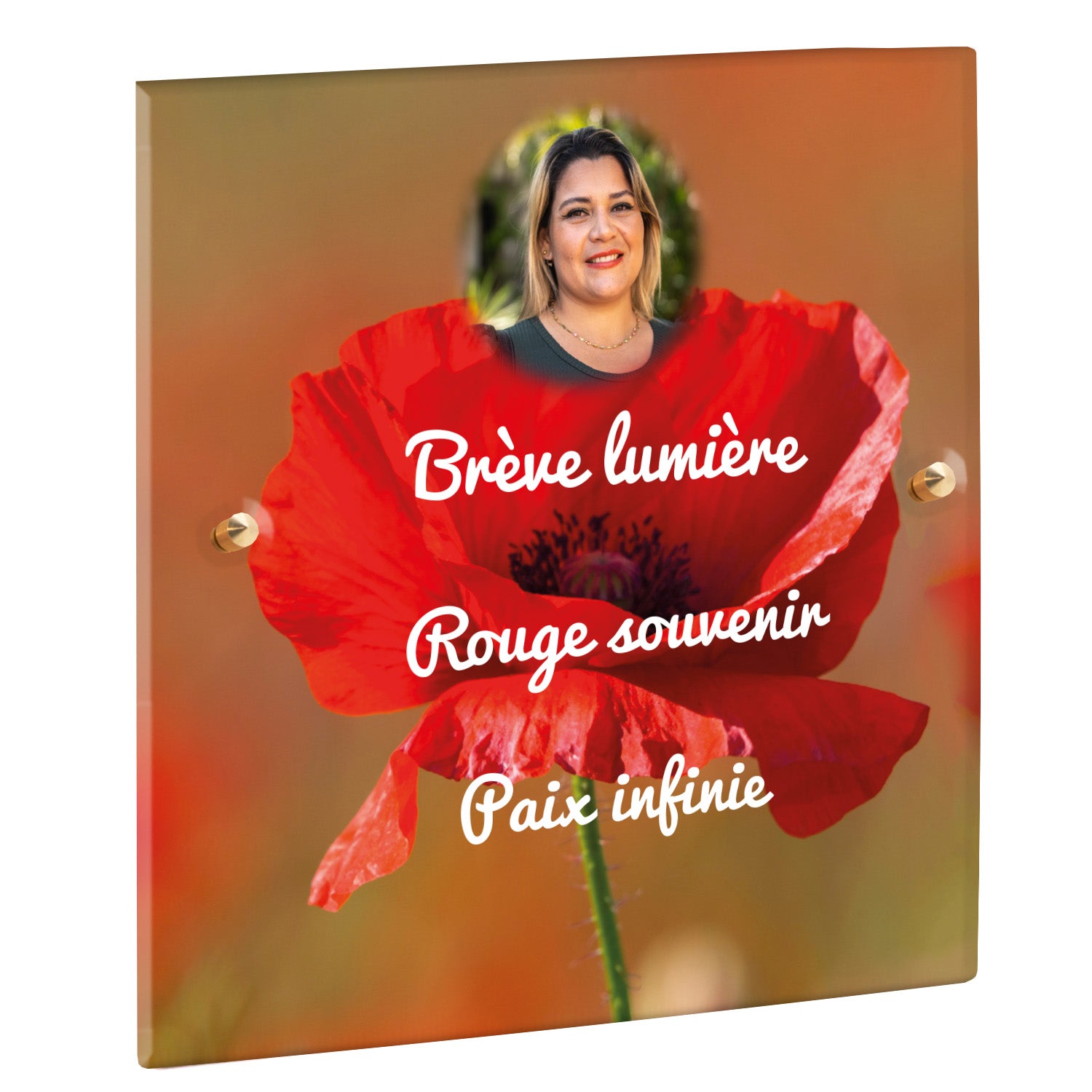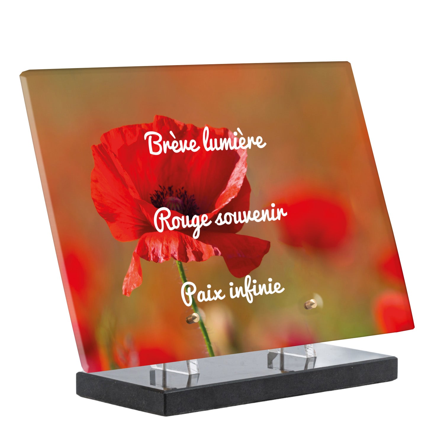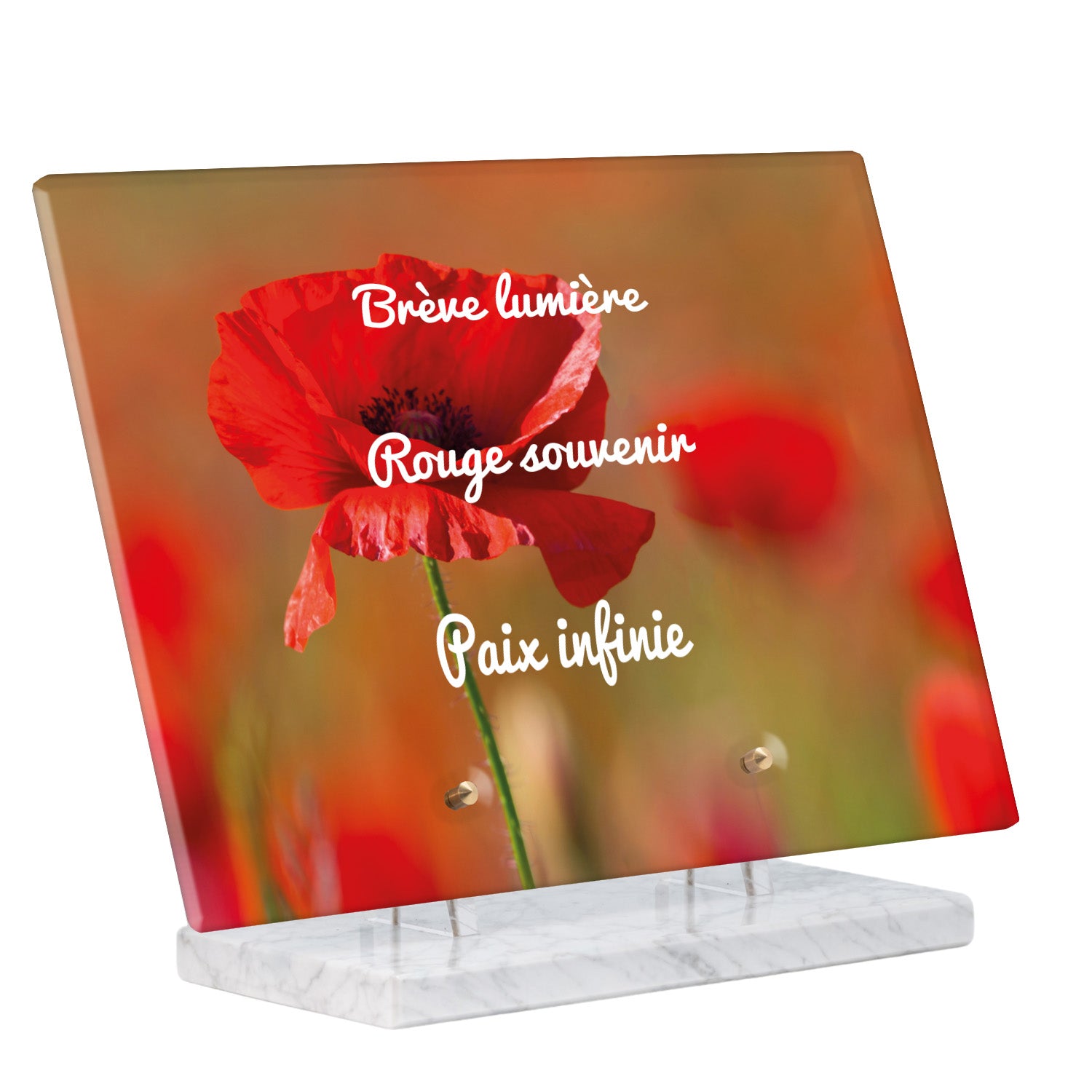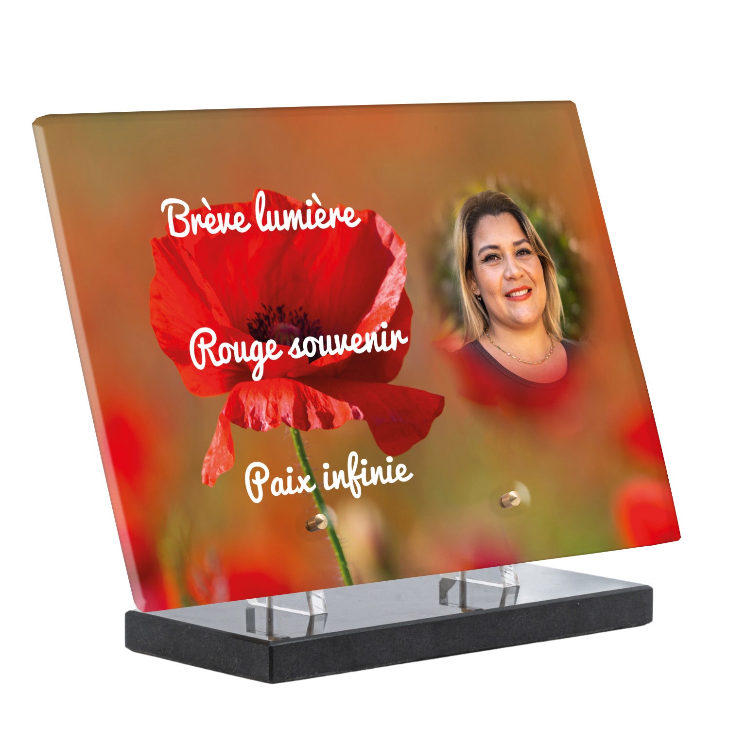 Cette plaque funéraire personnalisée représente élégamment des coquelicots, apportant une touche moderne et délicate à votre hommage. Conçue en plexiglas, cette plaque mortuaire allie esthétisme et résistance, parfaite pour un souvenir qui perdure. Son design sobre et raffiné s’intègre harmonieusement à tout type de sépulture, offrant un rendu contemporain et respectueux.