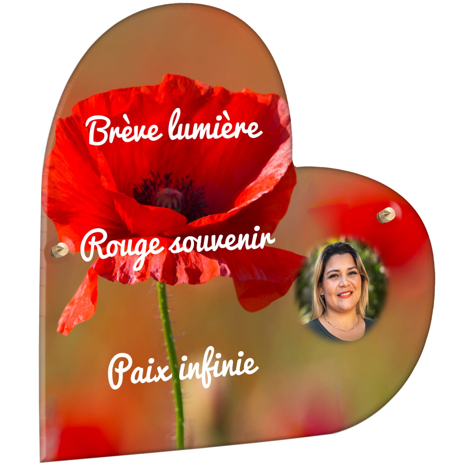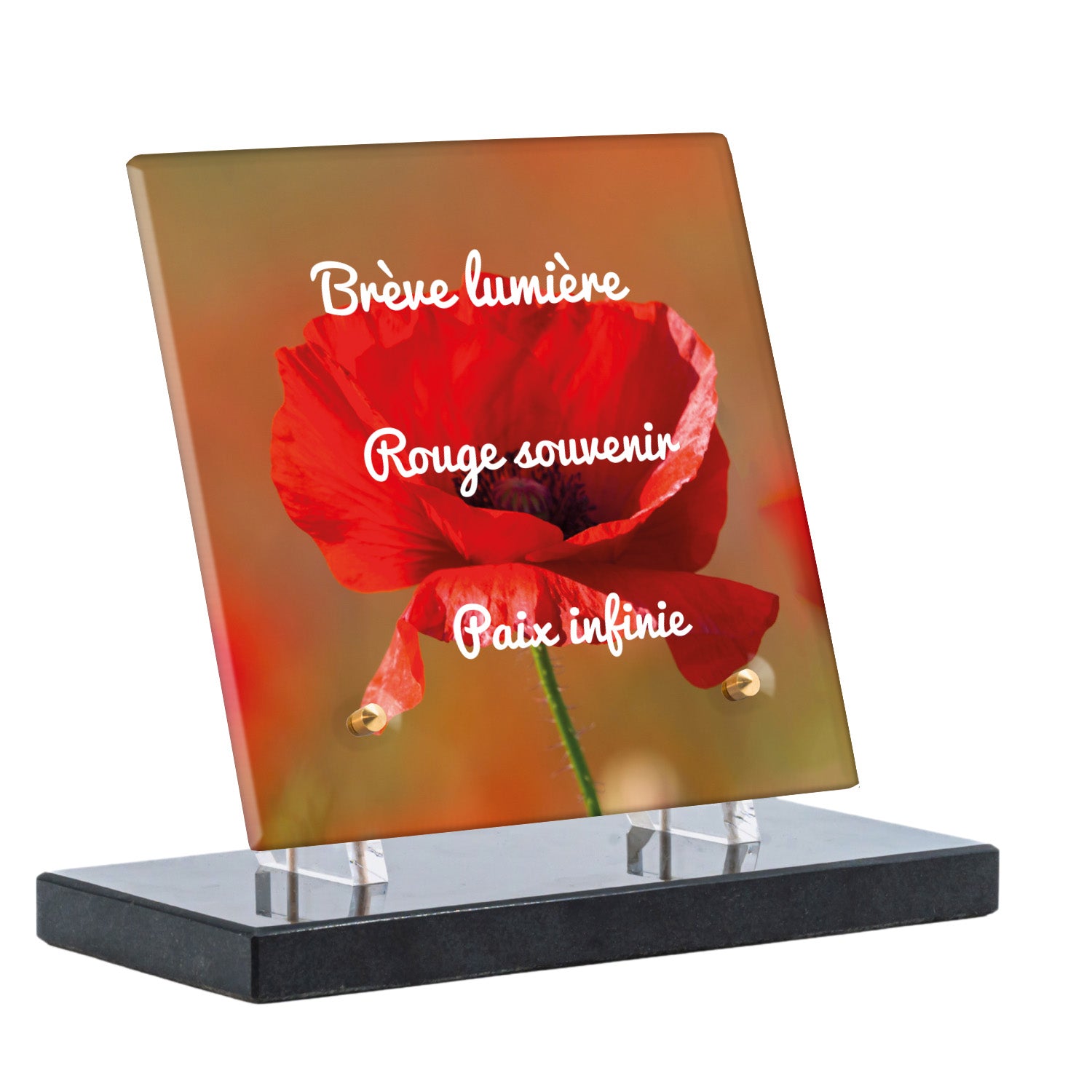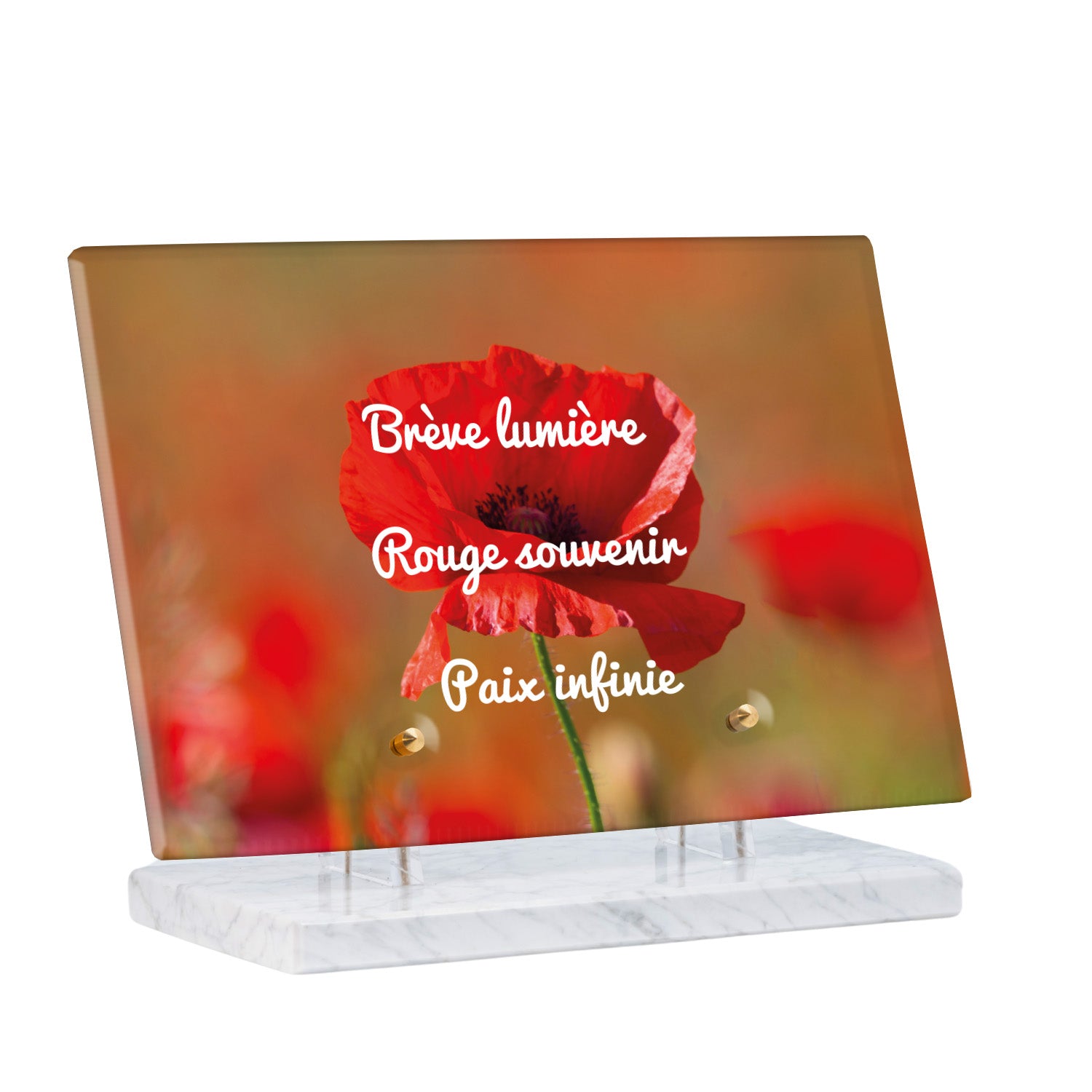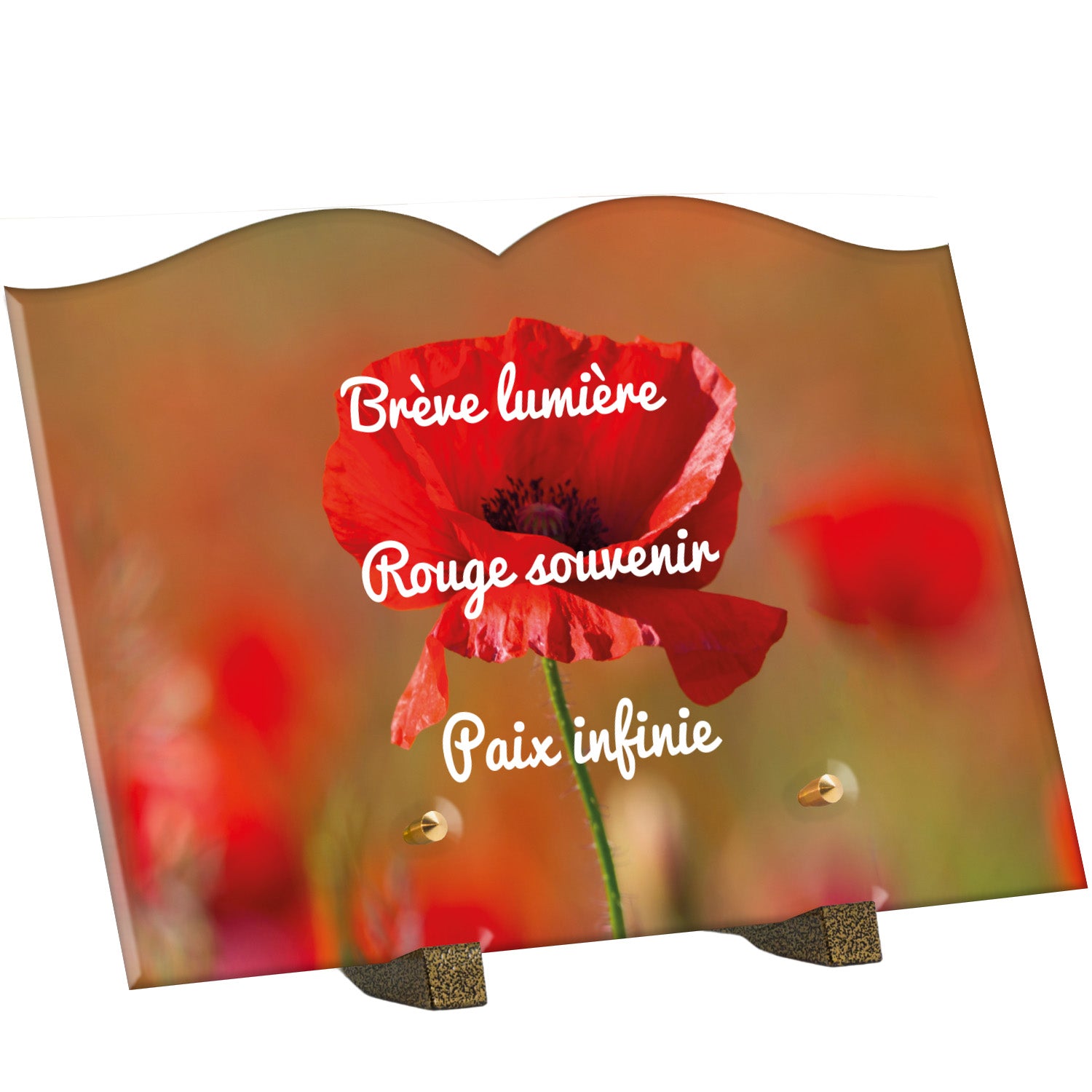 Cette plaque funéraire personnalisée représente élégamment des coquelicots, apportant une touche moderne et délicate à votre hommage. Conçue en plexiglas, cette plaque mortuaire allie esthétisme et résistance, parfaite pour un souvenir qui perdure. Son design sobre et raffiné s’intègre harmonieusement à tout type de sépulture, offrant un rendu contemporain et respectueux.
