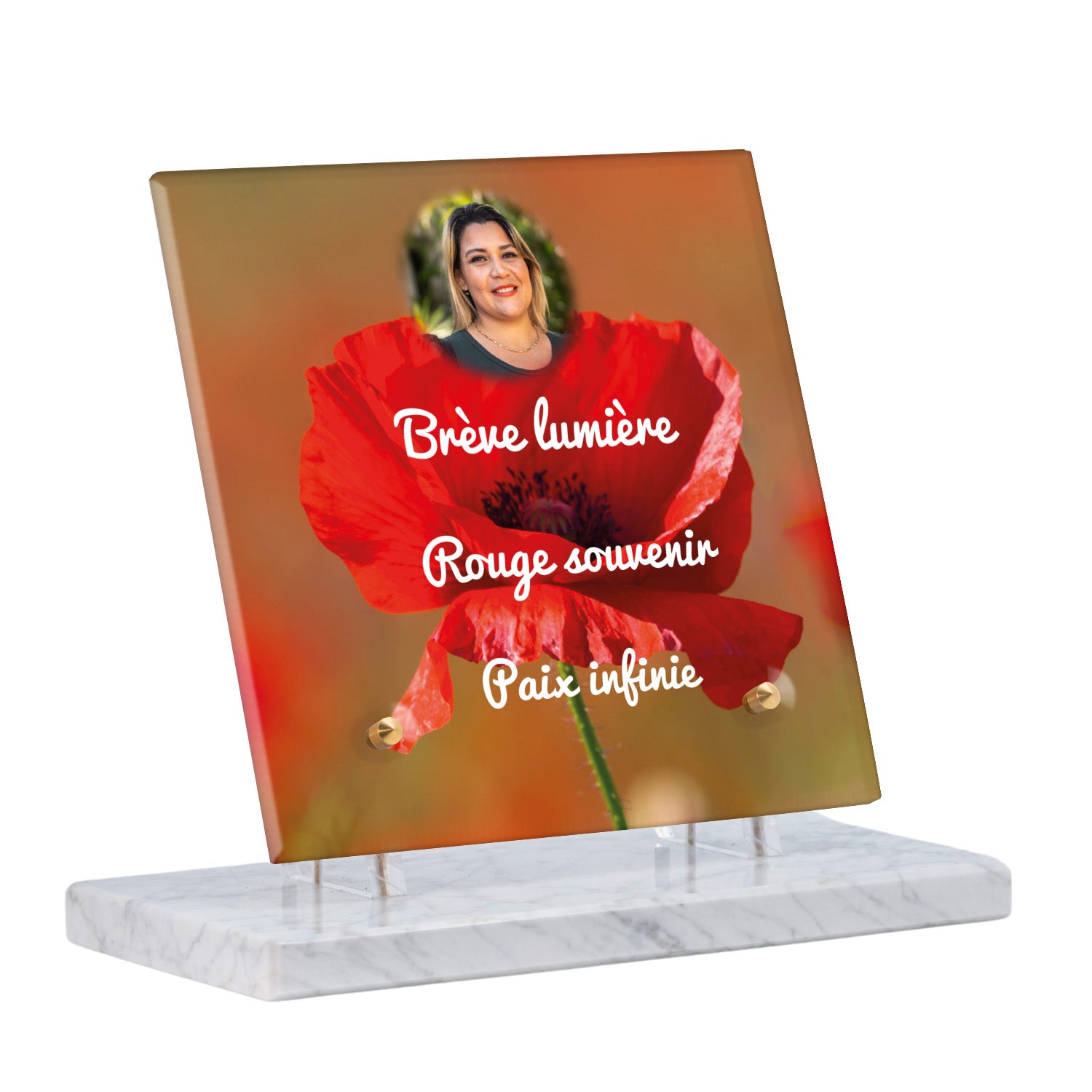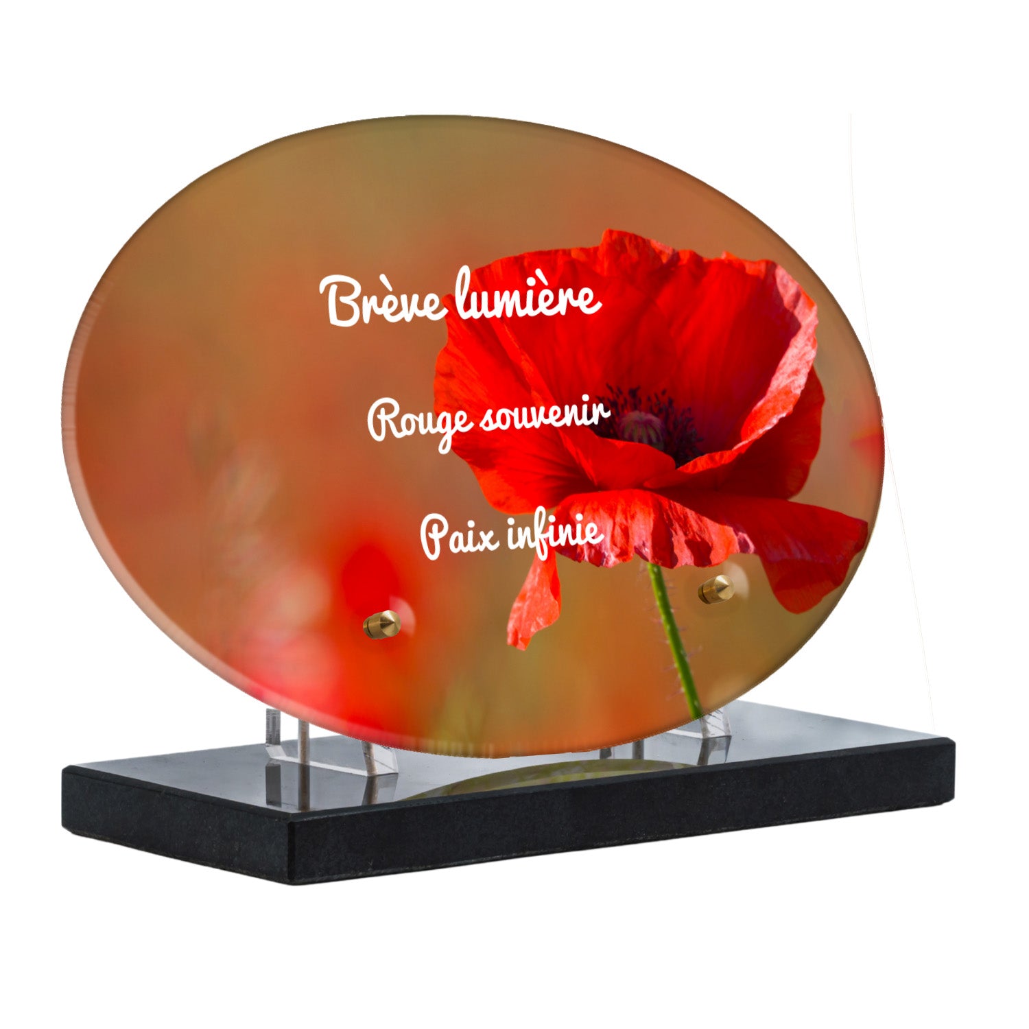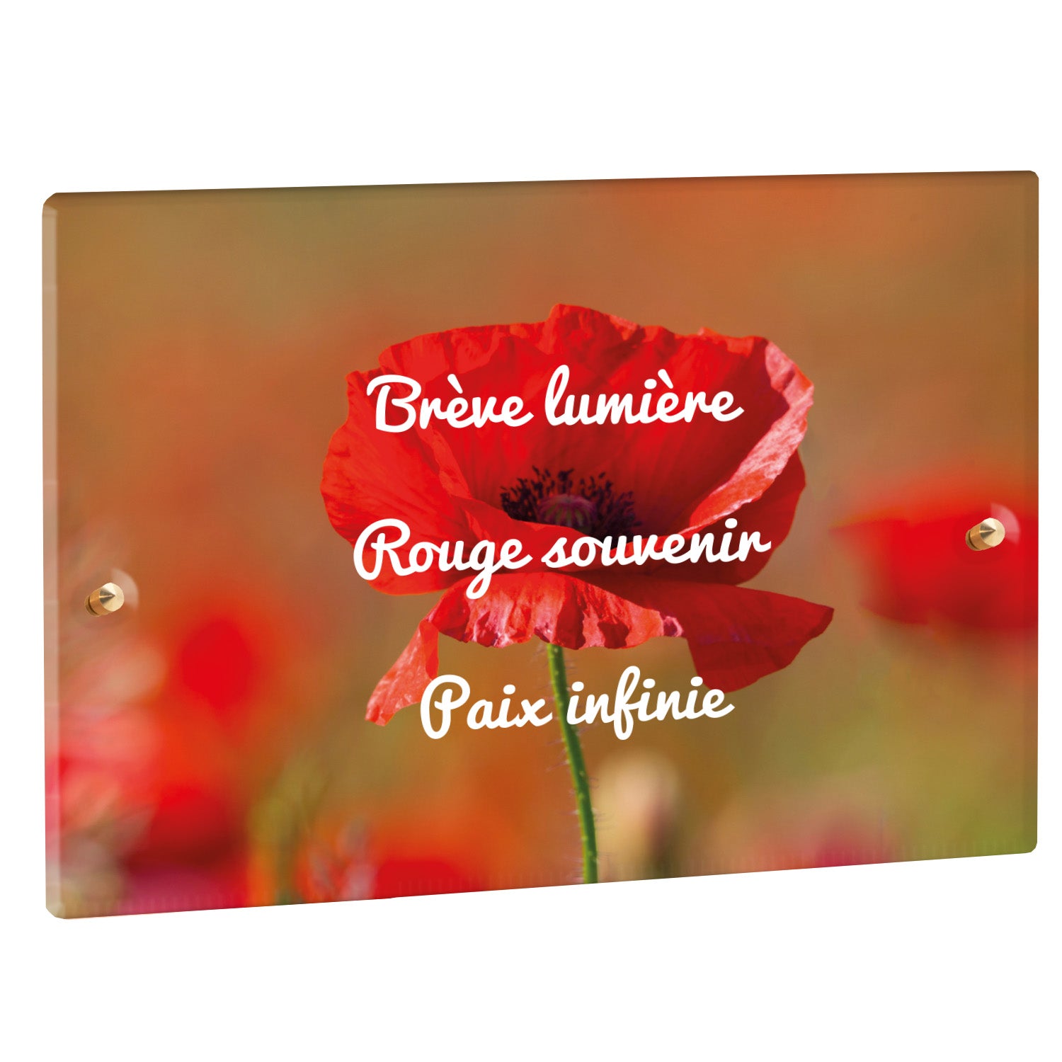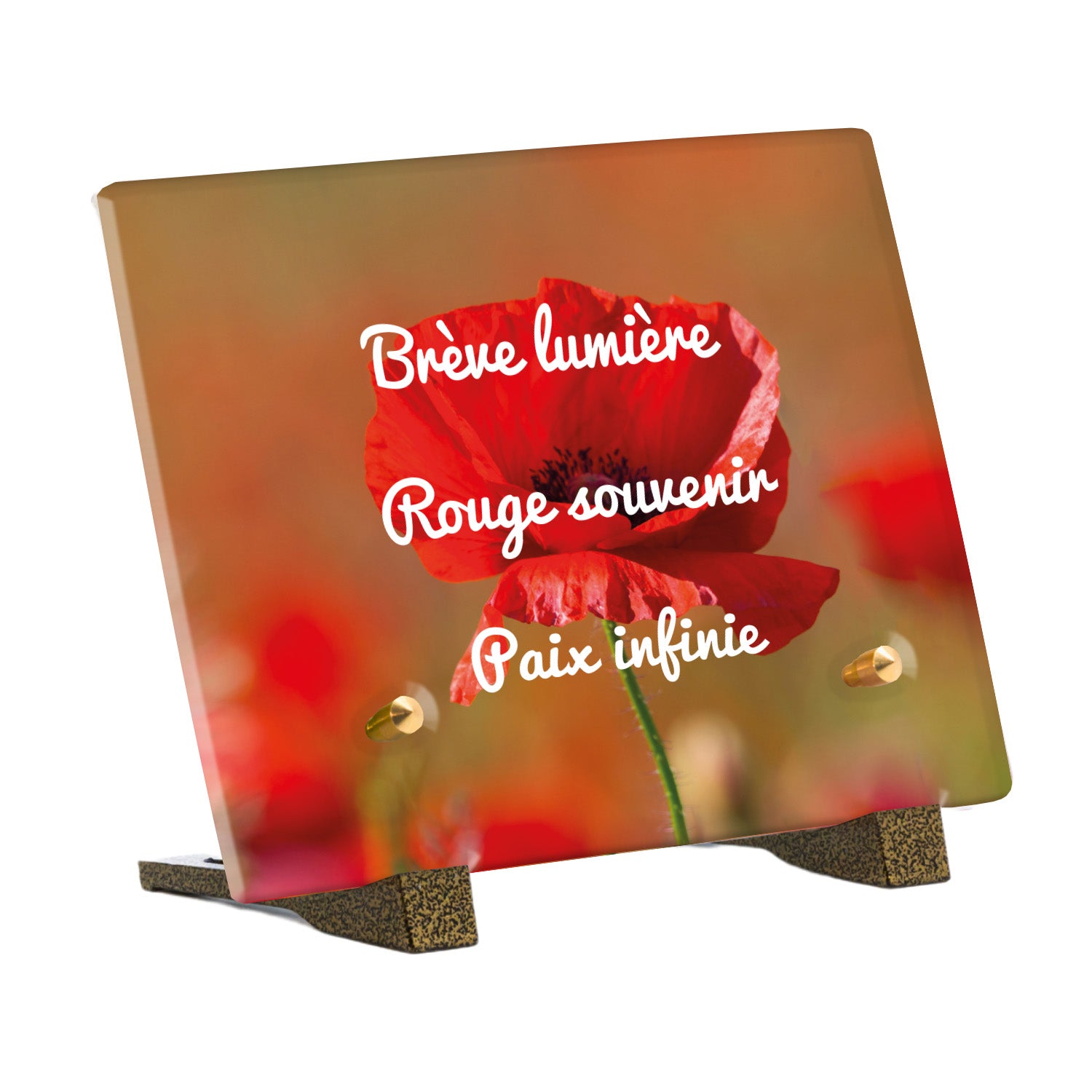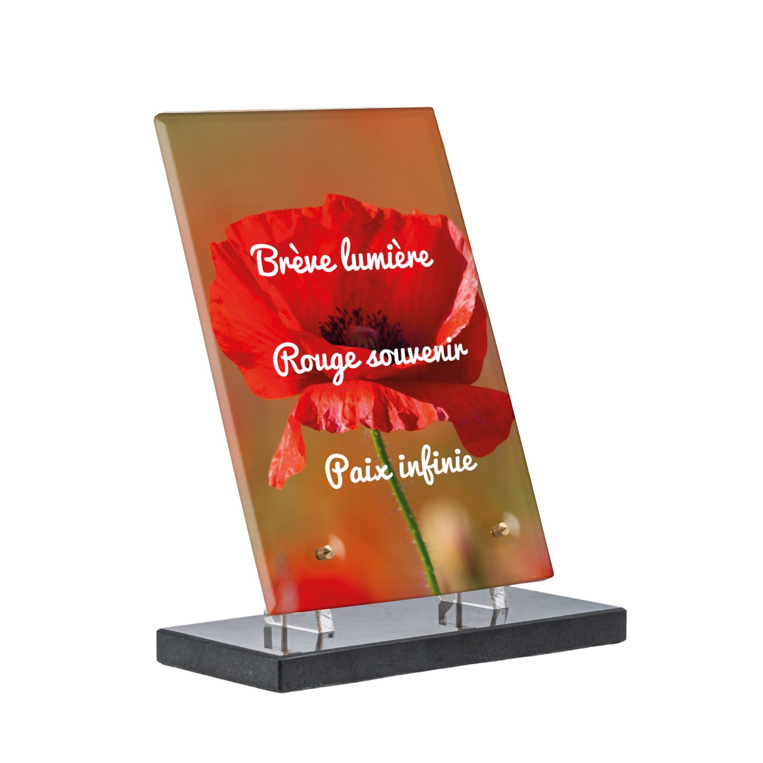 Cette plaque funéraire personnalisée représente élégamment des coquelicots, apportant une touche moderne et délicate à votre hommage. Conçue en plexiglas, cette plaque mortuaire allie esthétisme et résistance, parfaite pour un souvenir qui perdure. Son design sobre et raffiné s’intègre harmonieusement à tout type de sépulture, offrant un rendu contemporain et respectueux.