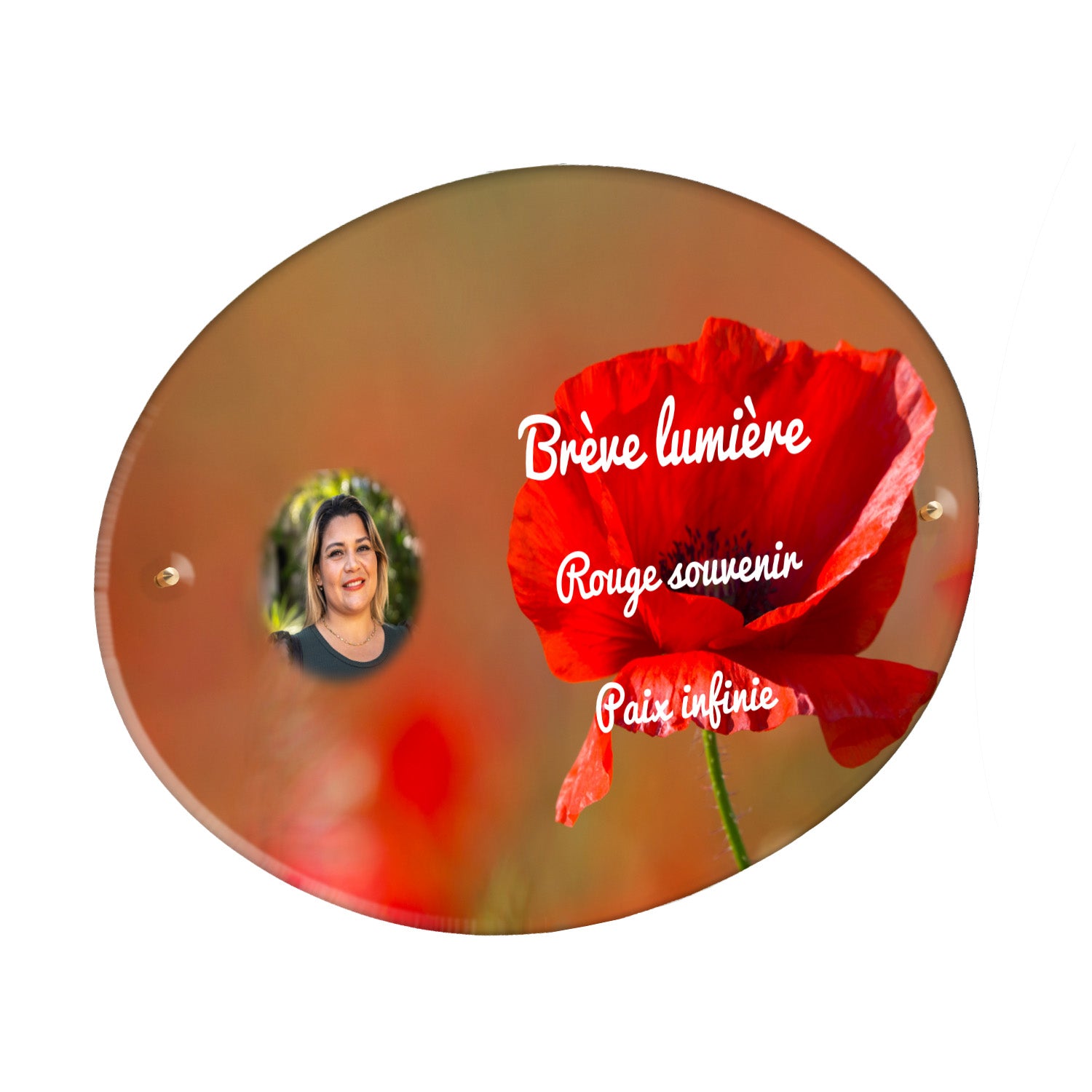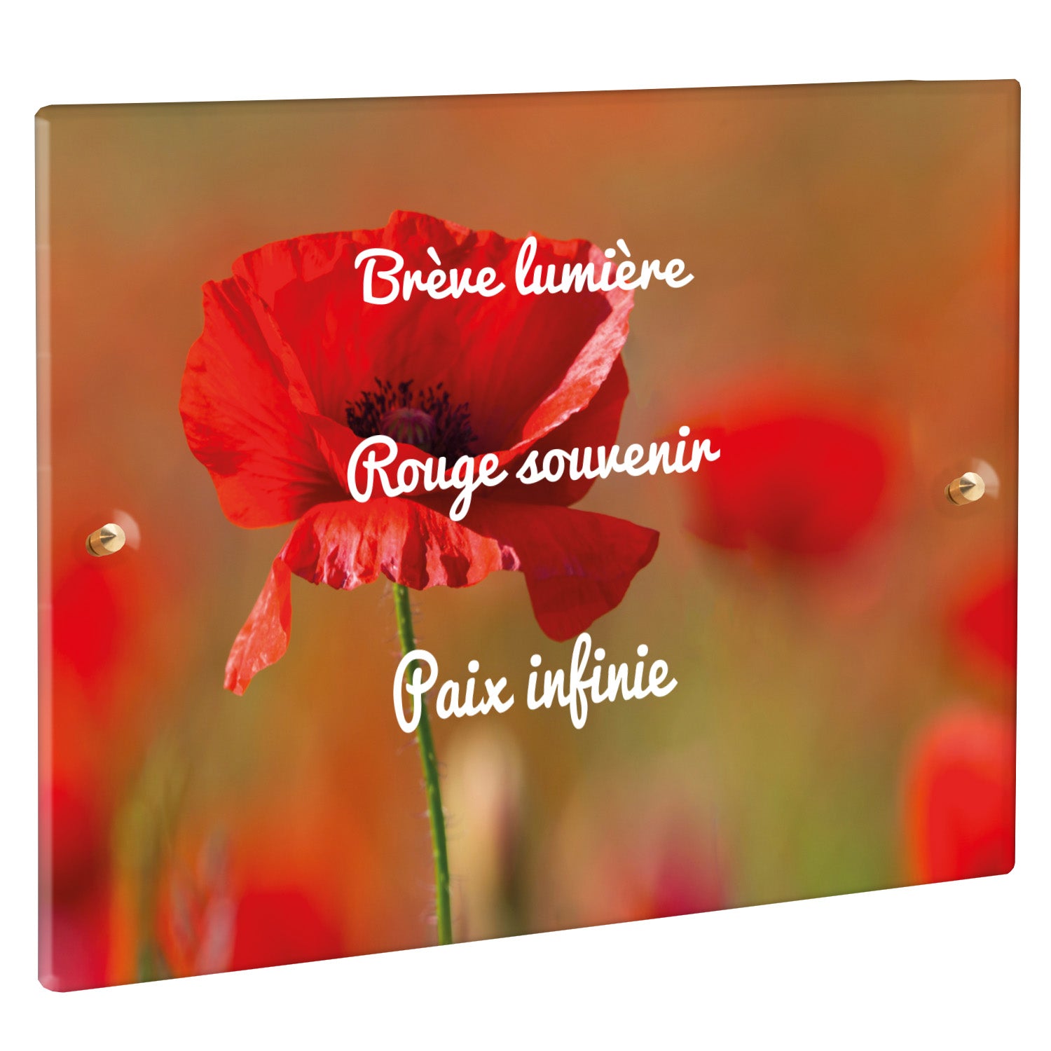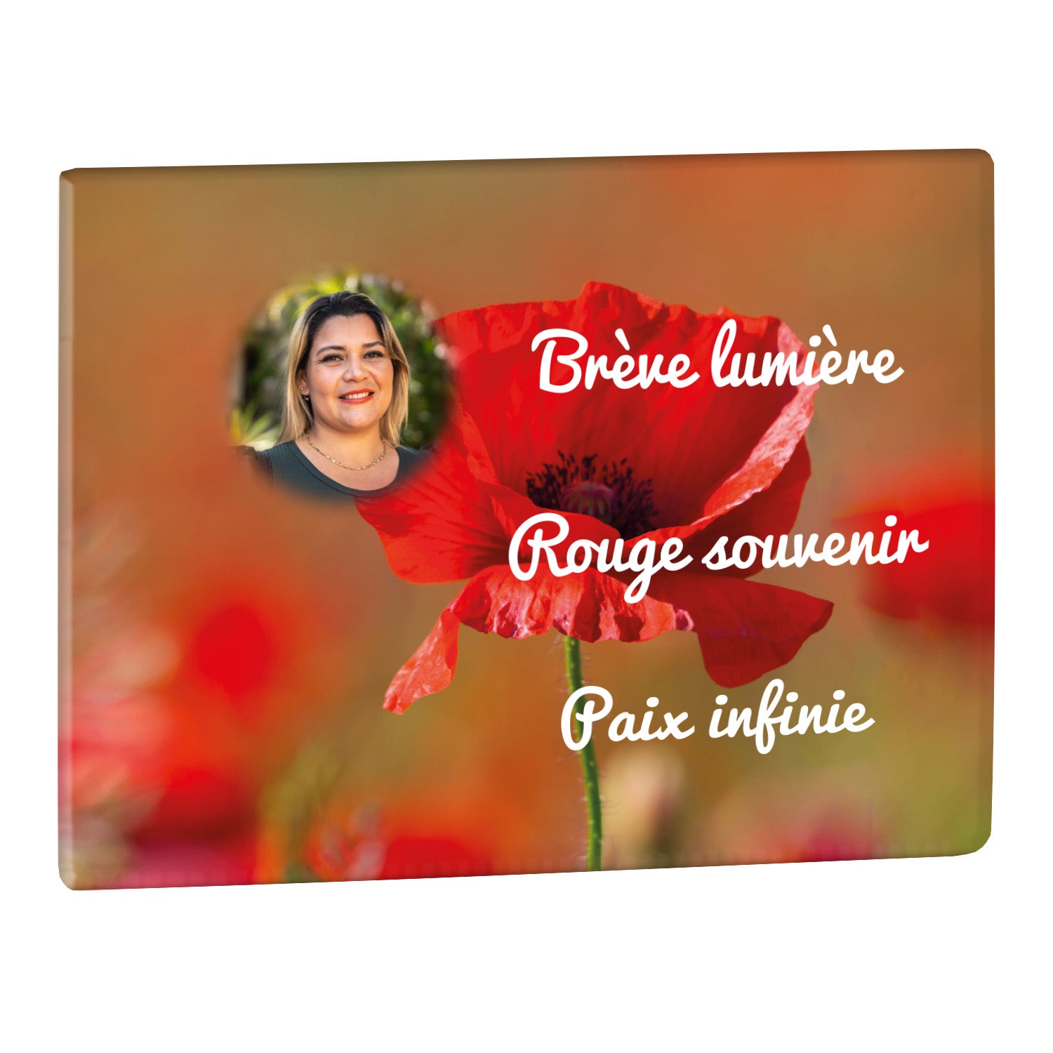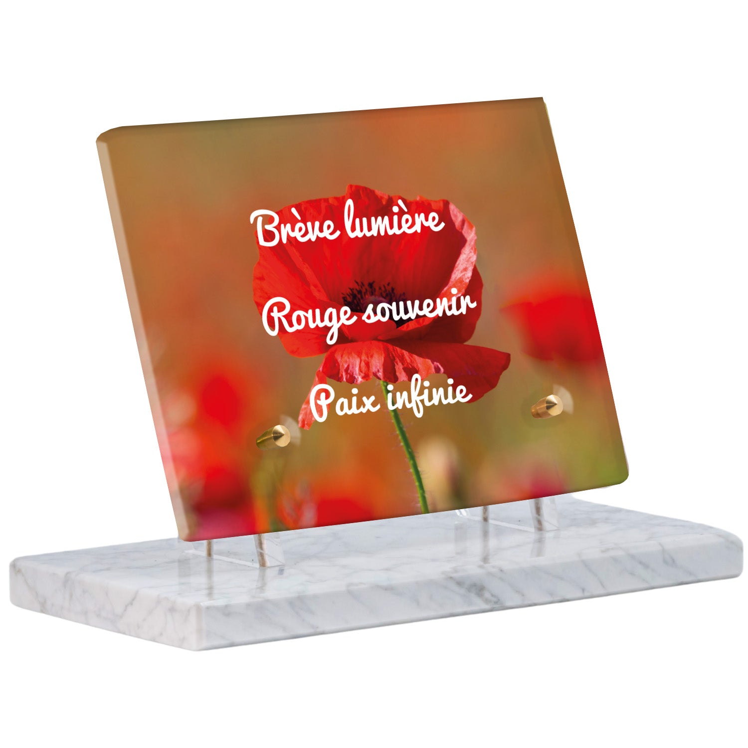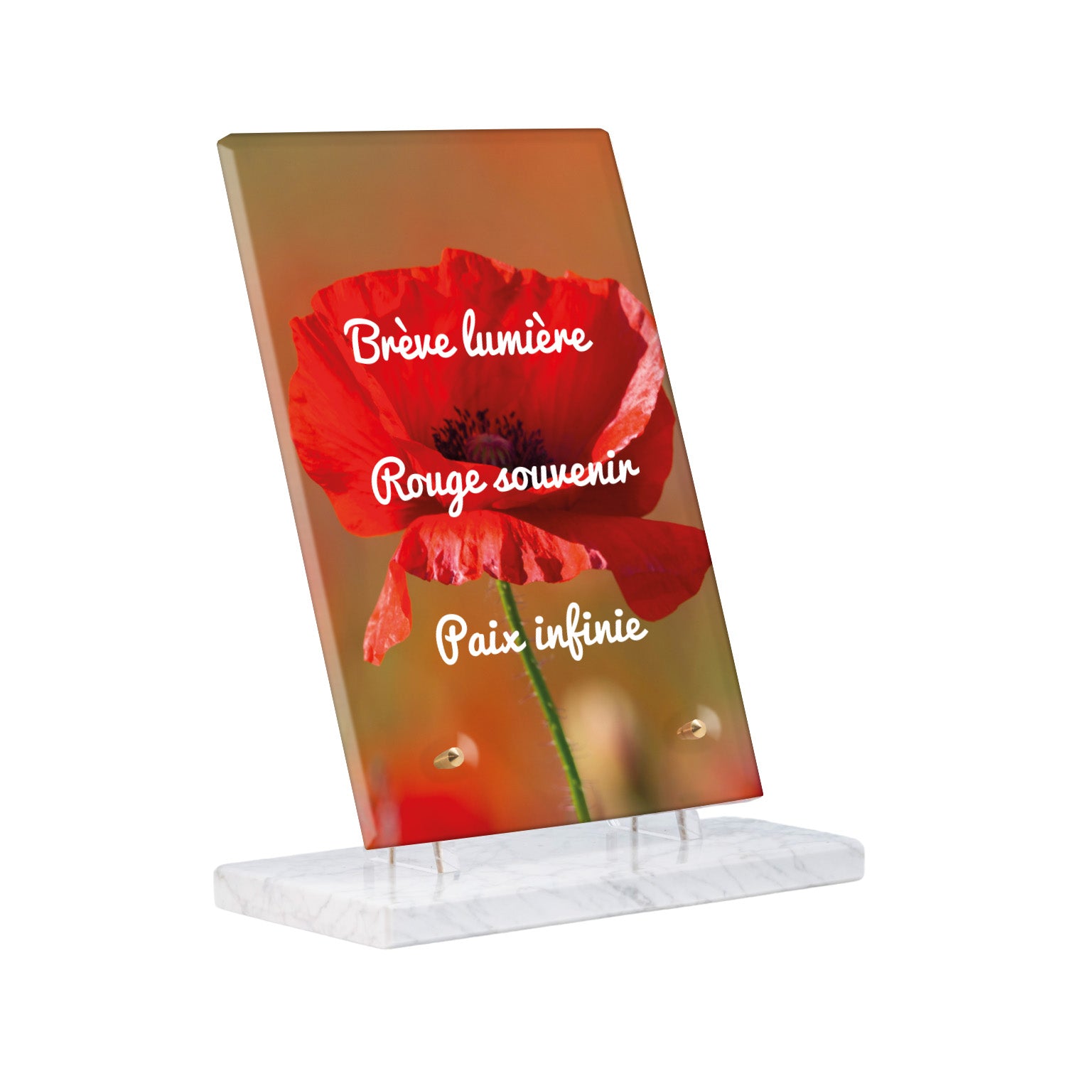 Cette plaque funéraire personnalisée représente élégamment des coquelicots, apportant une touche moderne et délicate à votre hommage. Conçue en plexiglas, cette plaque mortuaire allie esthétisme et résistance, parfaite pour un souvenir qui perdure. Son design sobre et raffiné s’intègre harmonieusement à tout type de sépulture, offrant un rendu contemporain et respectueux.
