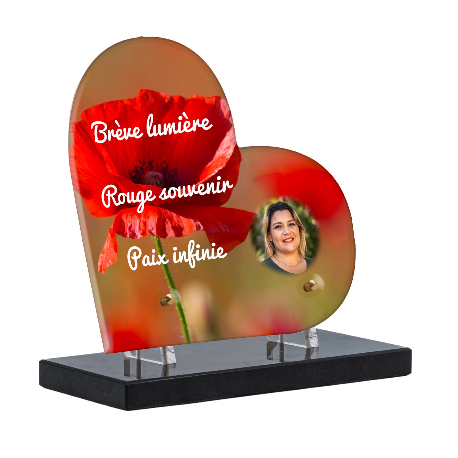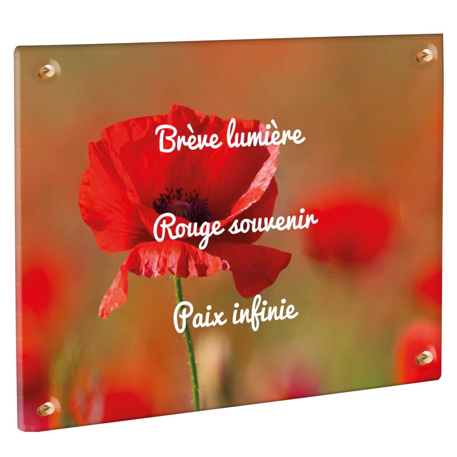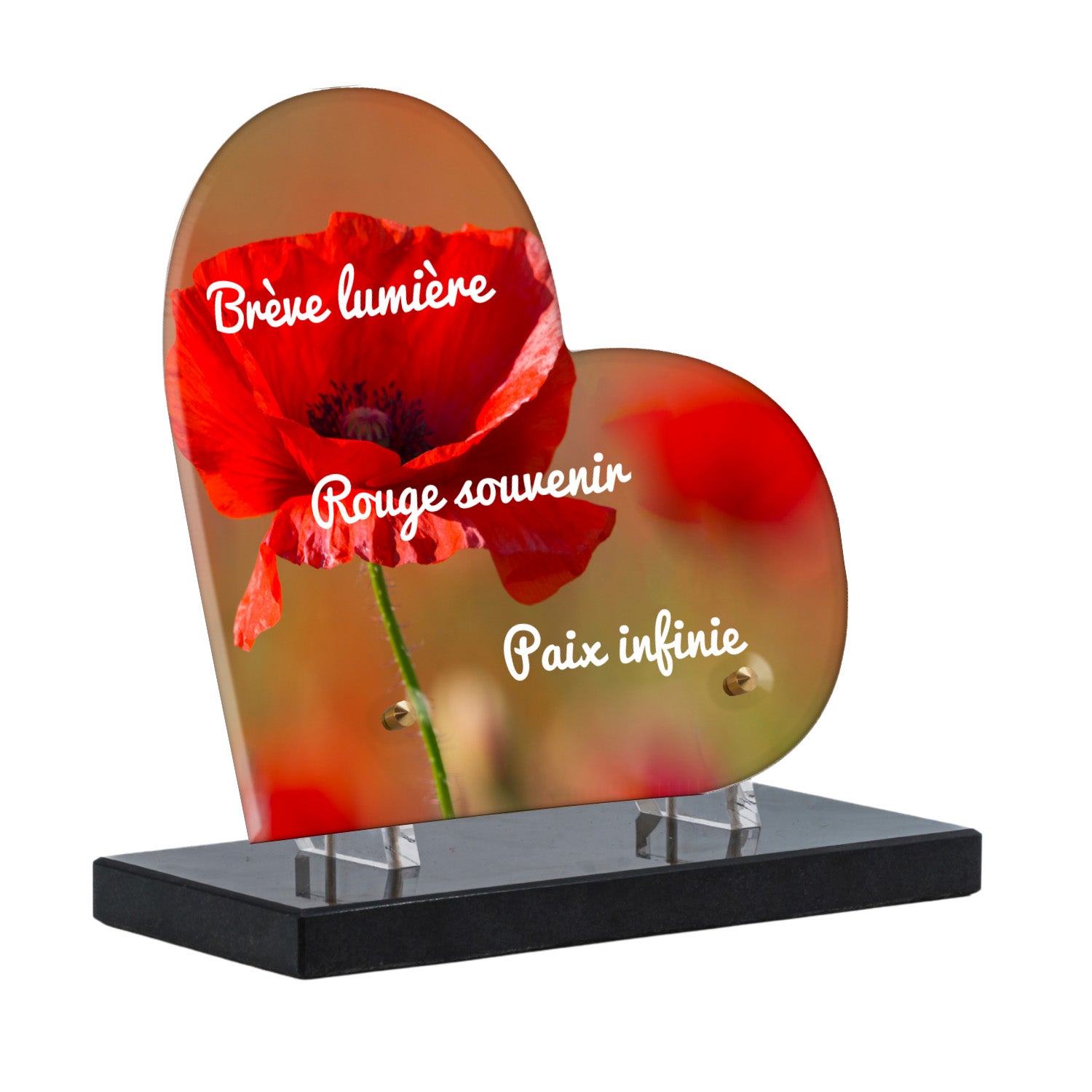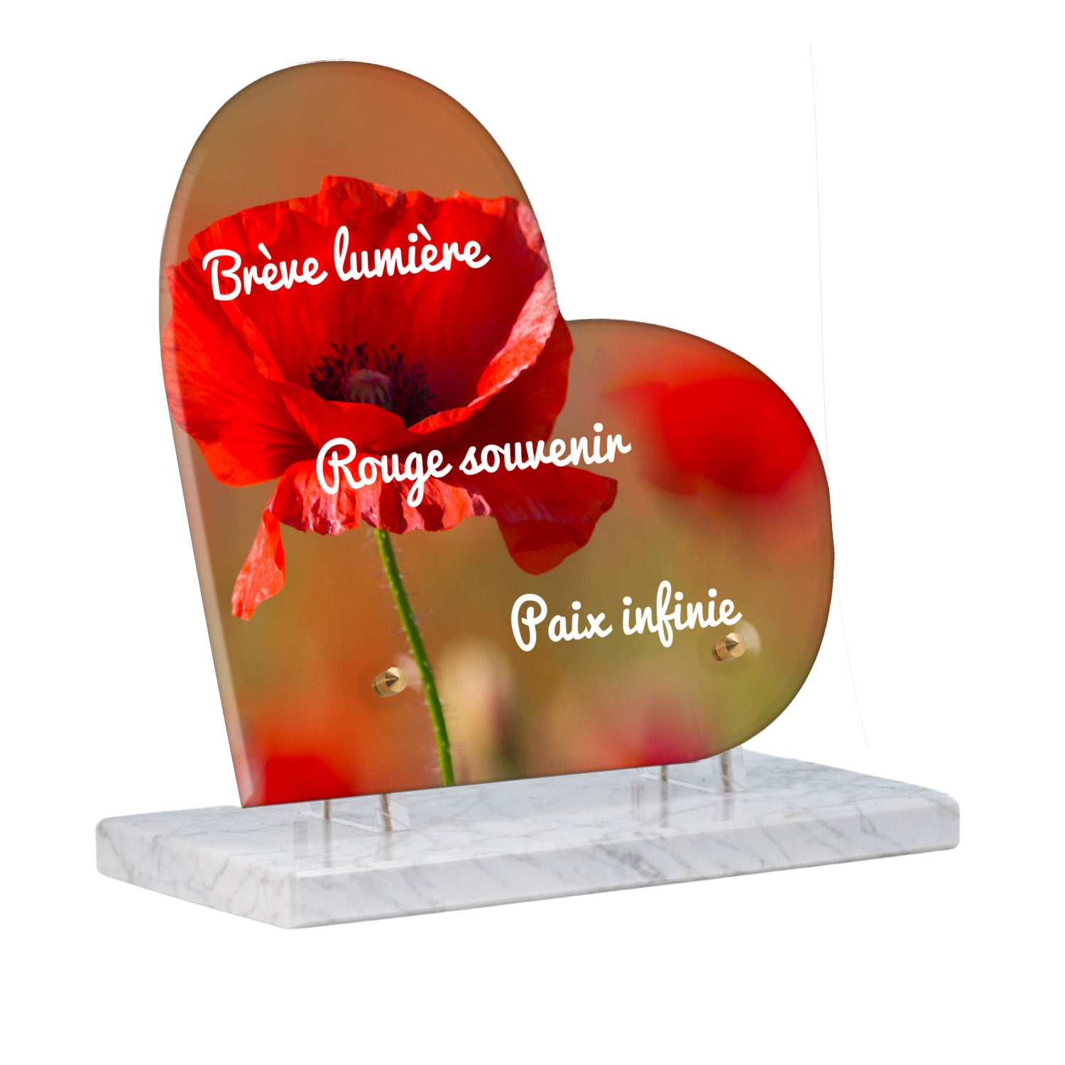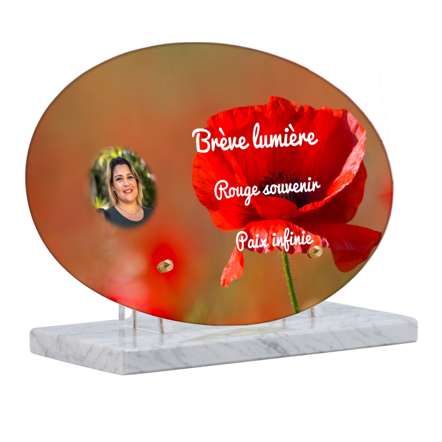 Cette plaque funéraire personnalisée représente élégamment des coquelicots, apportant une touche moderne et délicate à votre hommage. Conçue en plexiglas, cette plaque mortuaire allie esthétisme et résistance, parfaite pour un souvenir qui perdure. Son design sobre et raffiné s’intègre harmonieusement à tout type de sépulture, offrant un rendu contemporain et respectueux.