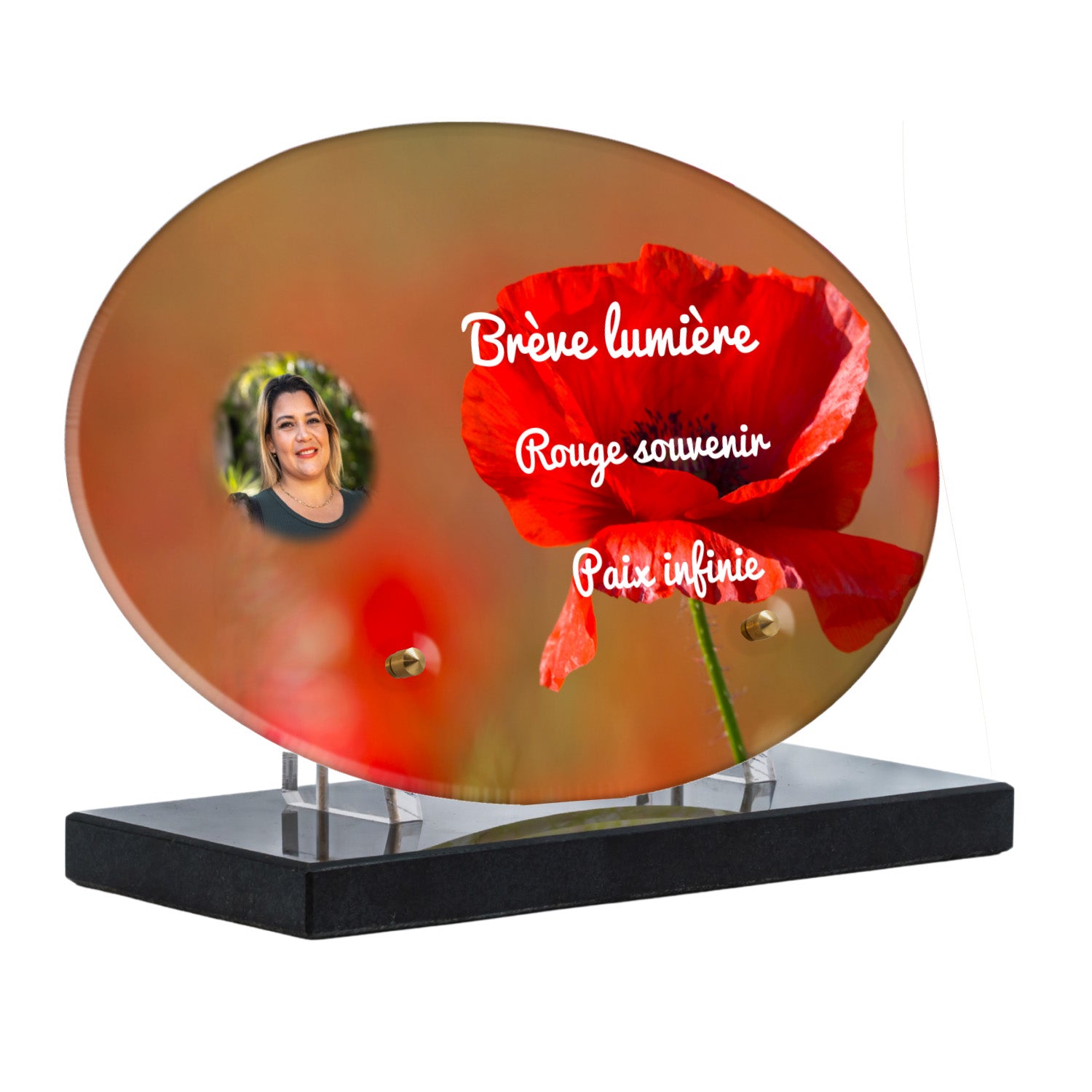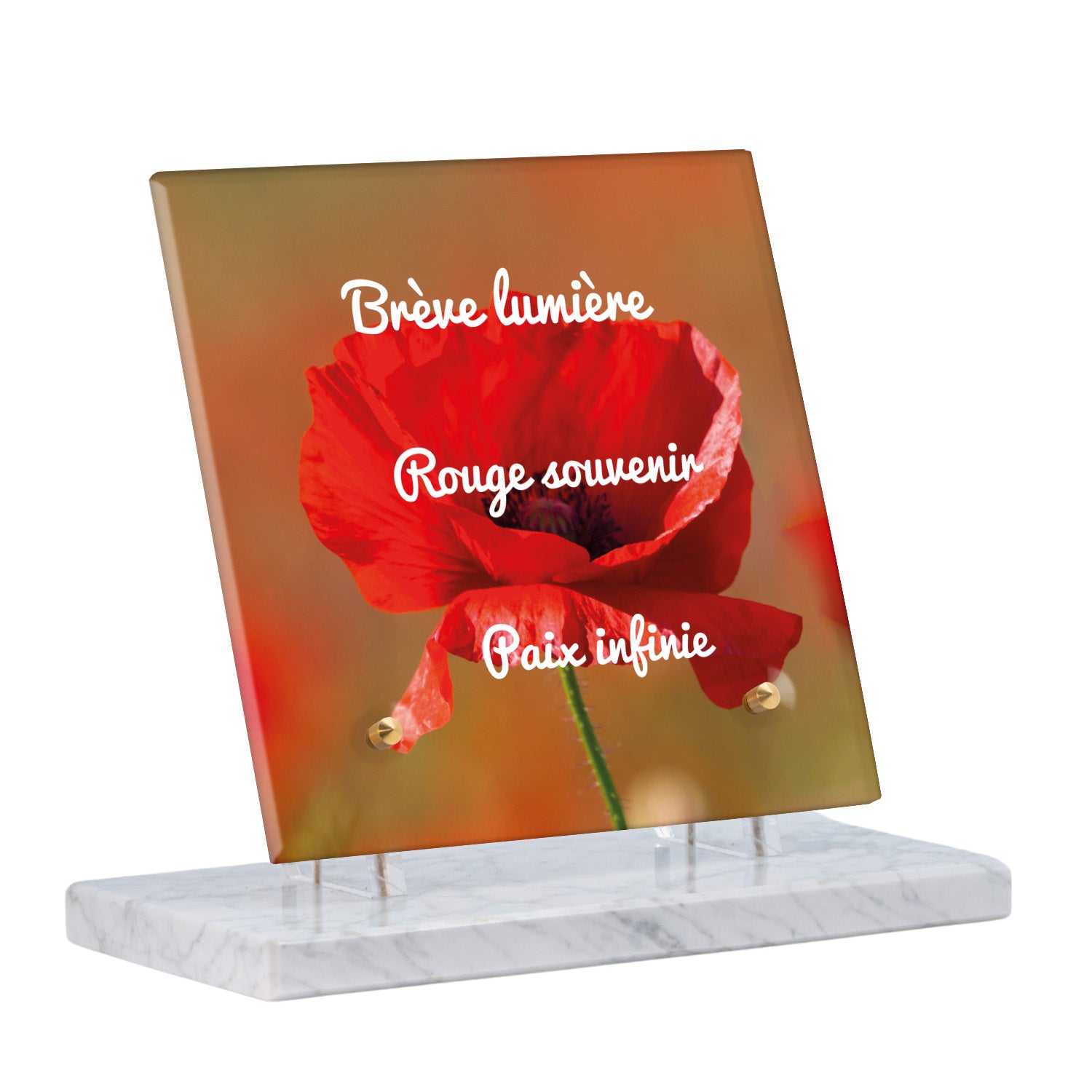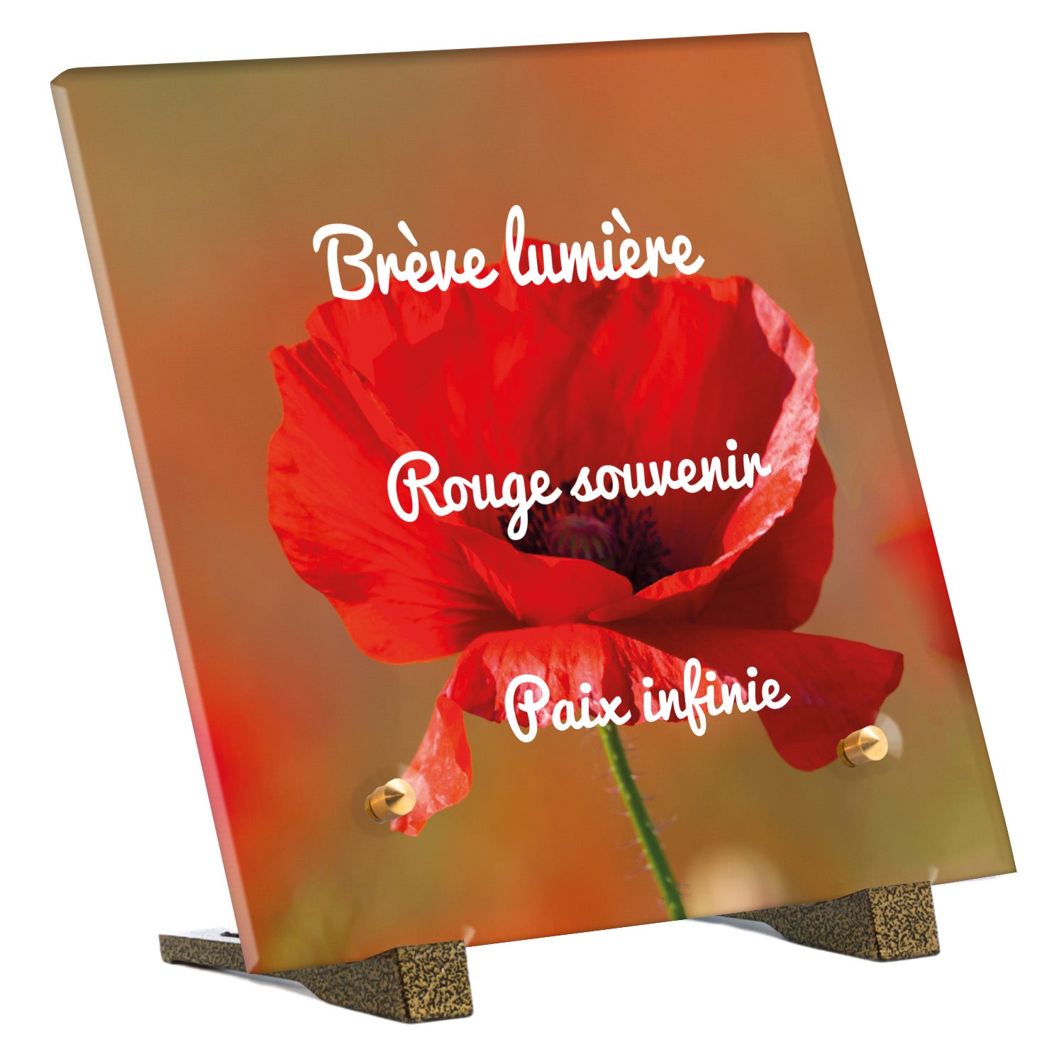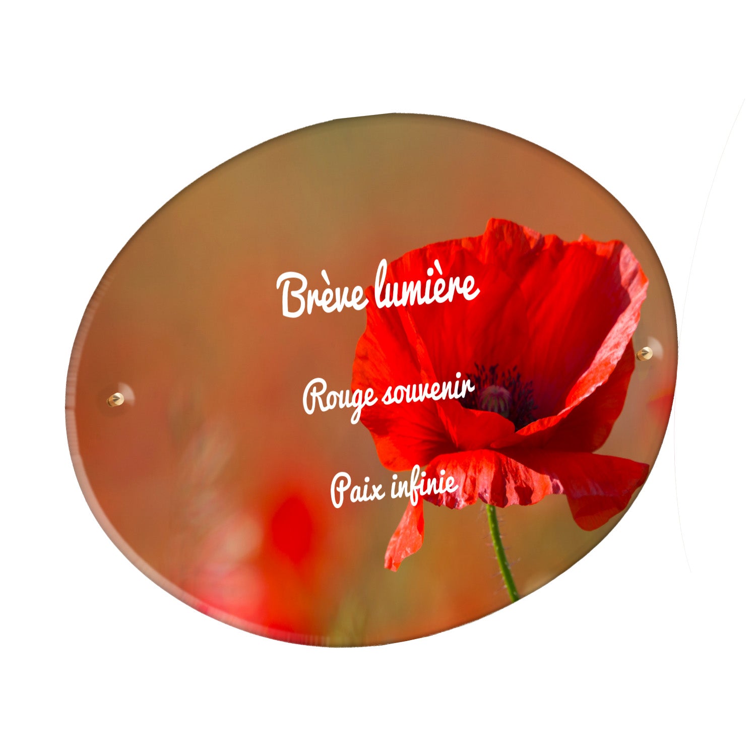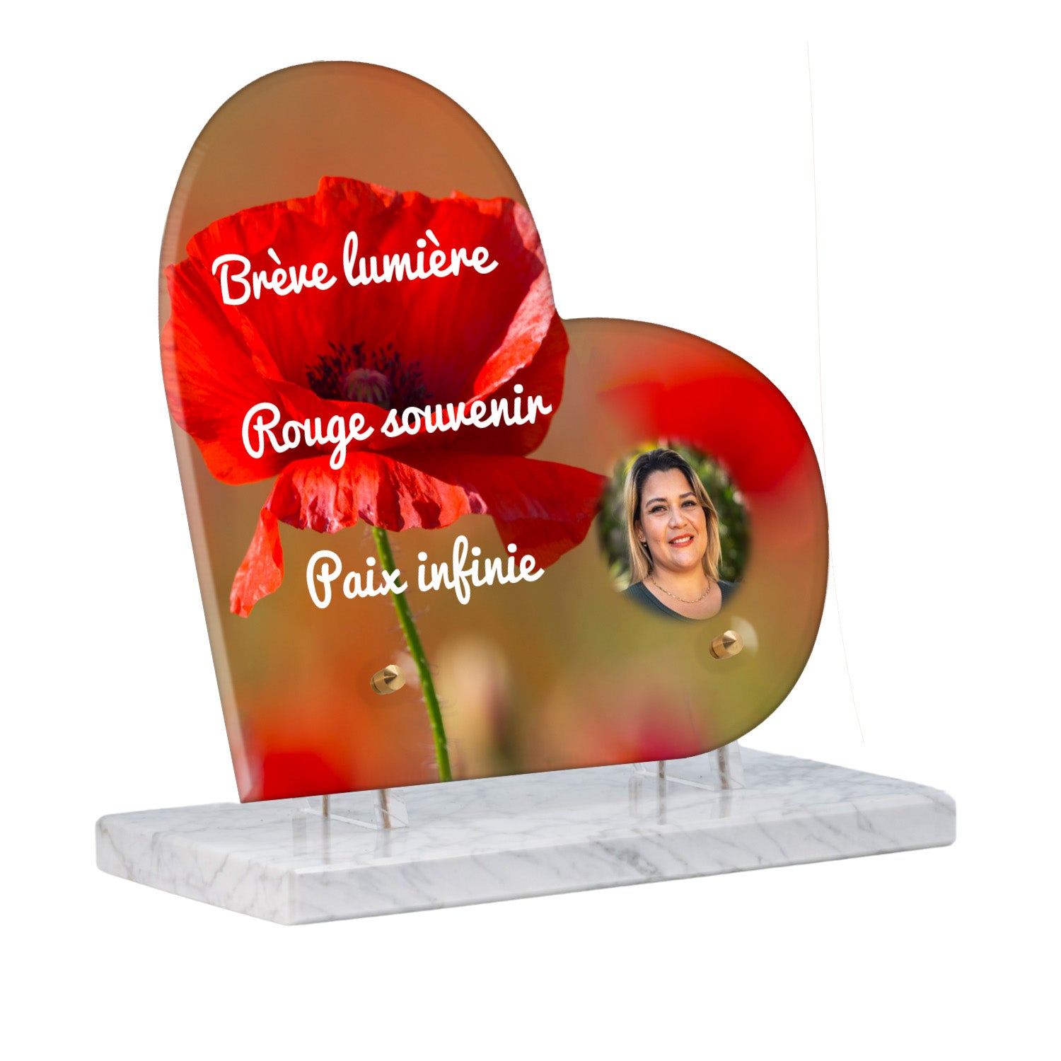 Cette plaque funéraire personnalisée représente élégamment des coquelicots, apportant une touche moderne et délicate à votre hommage. Conçue en plexiglas, cette plaque mortuaire allie esthétisme et résistance, parfaite pour un souvenir qui perdure. Son design sobre et raffiné s’intègre harmonieusement à tout type de sépulture, offrant un rendu contemporain et respectueux.