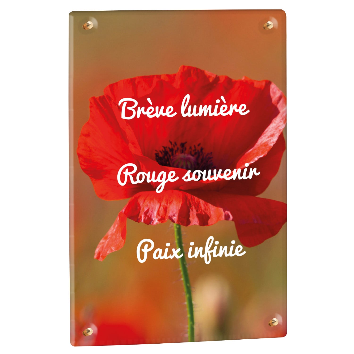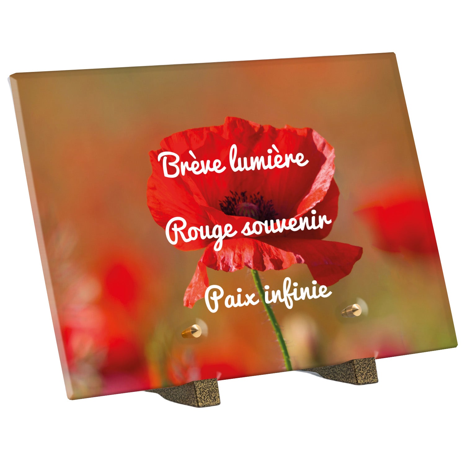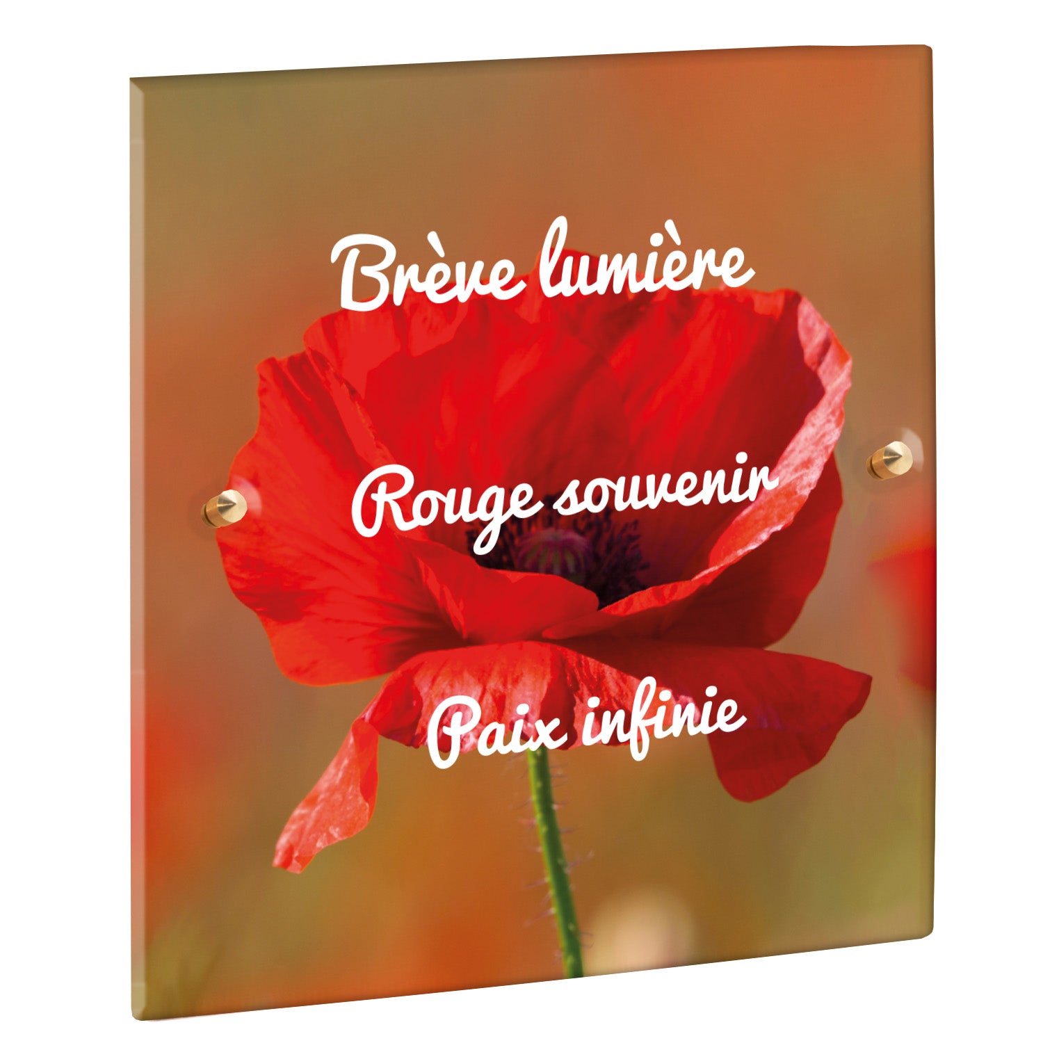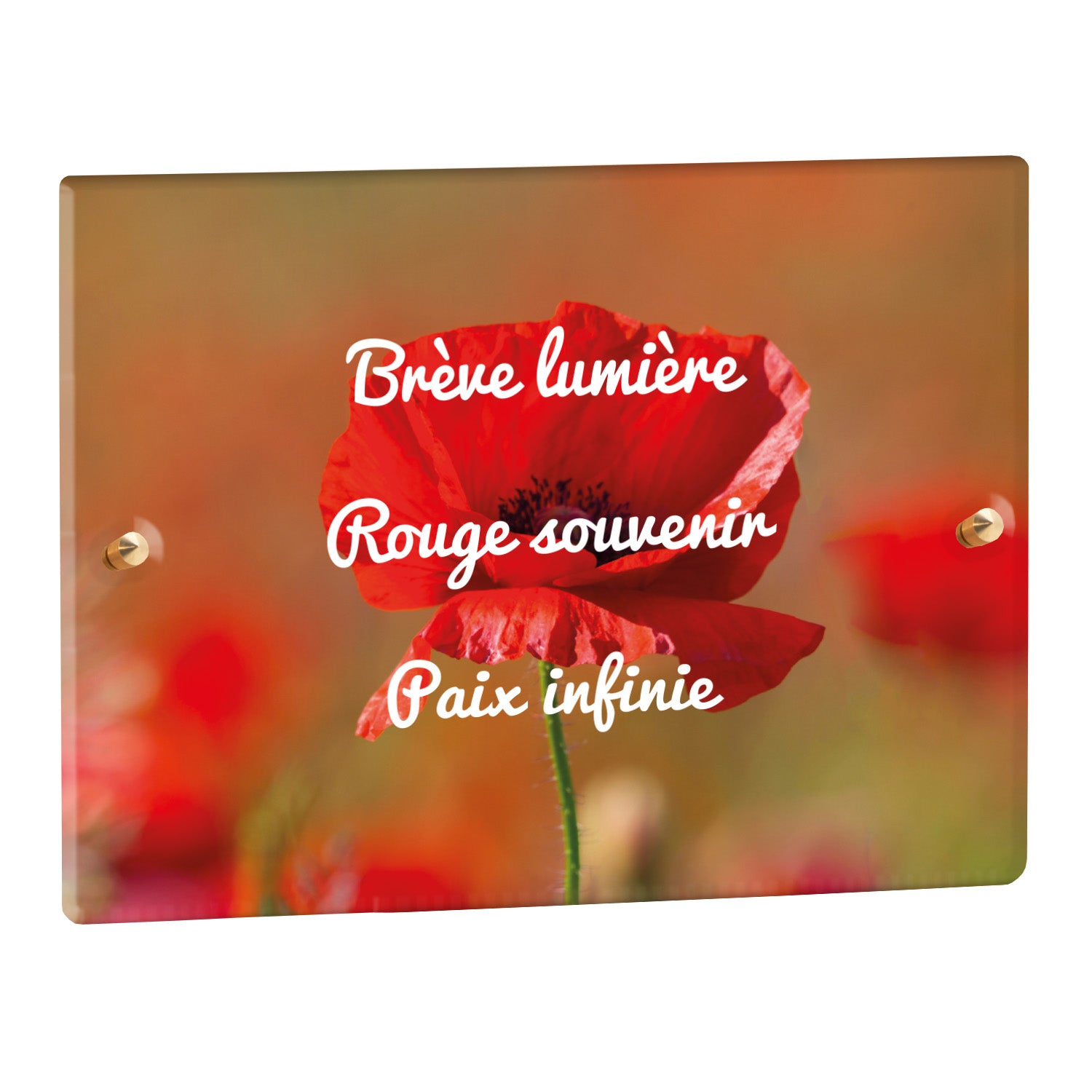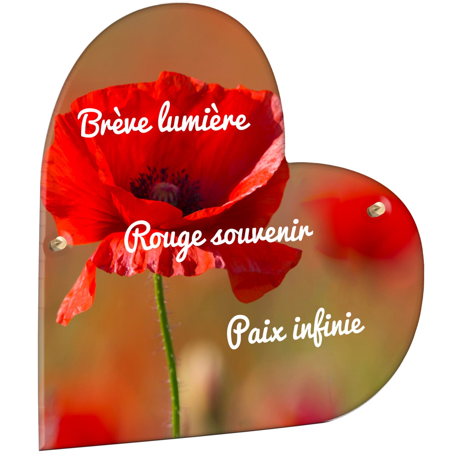 Cette plaque funéraire personnalisée représente élégamment des coquelicots, apportant une touche moderne et délicate à votre hommage. Conçue en plexiglas, cette plaque mortuaire allie esthétisme et résistance, parfaite pour un souvenir qui perdure. Son design sobre et raffiné s’intègre harmonieusement à tout type de sépulture, offrant un rendu contemporain et respectueux.