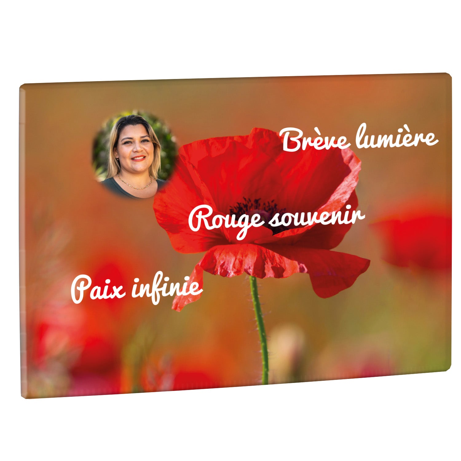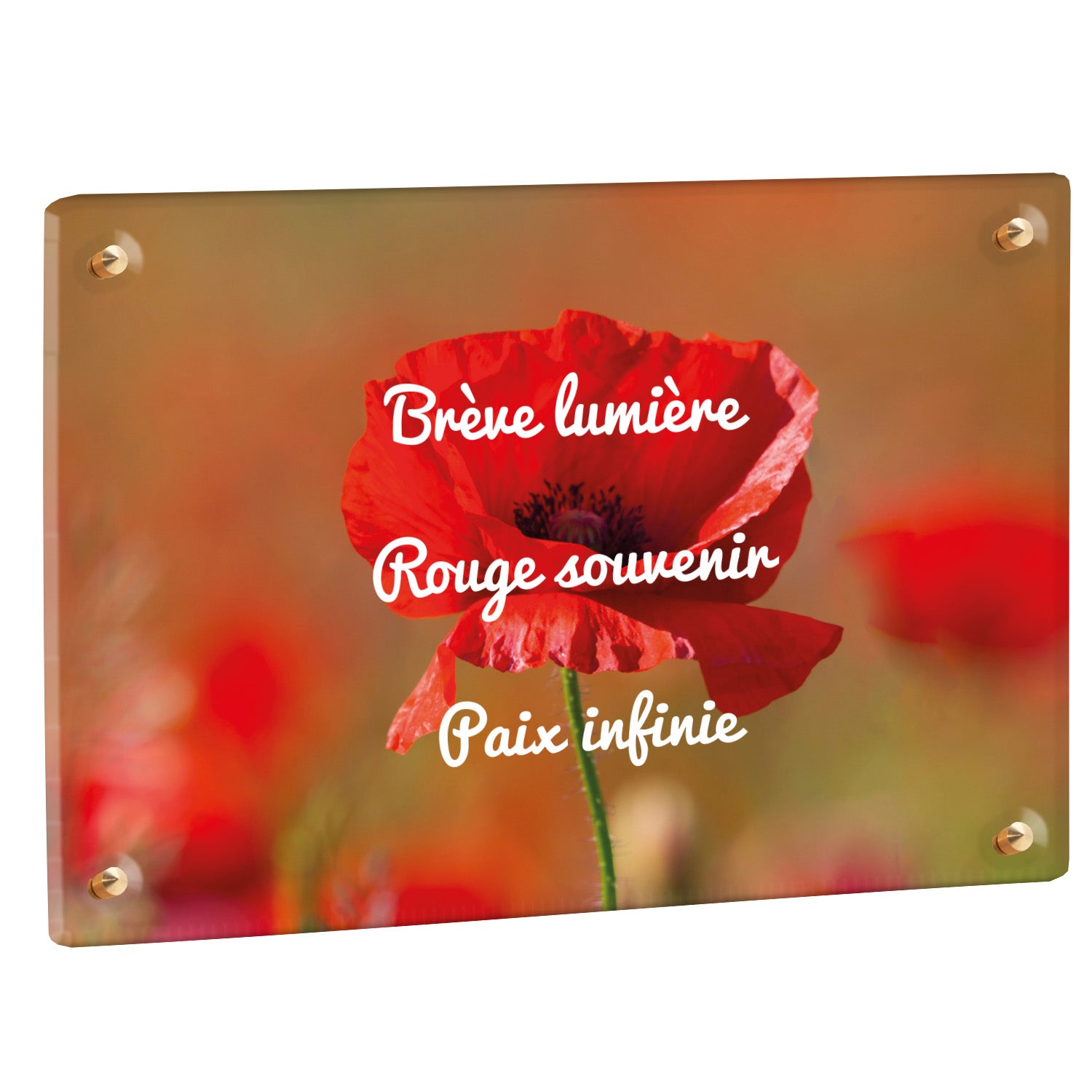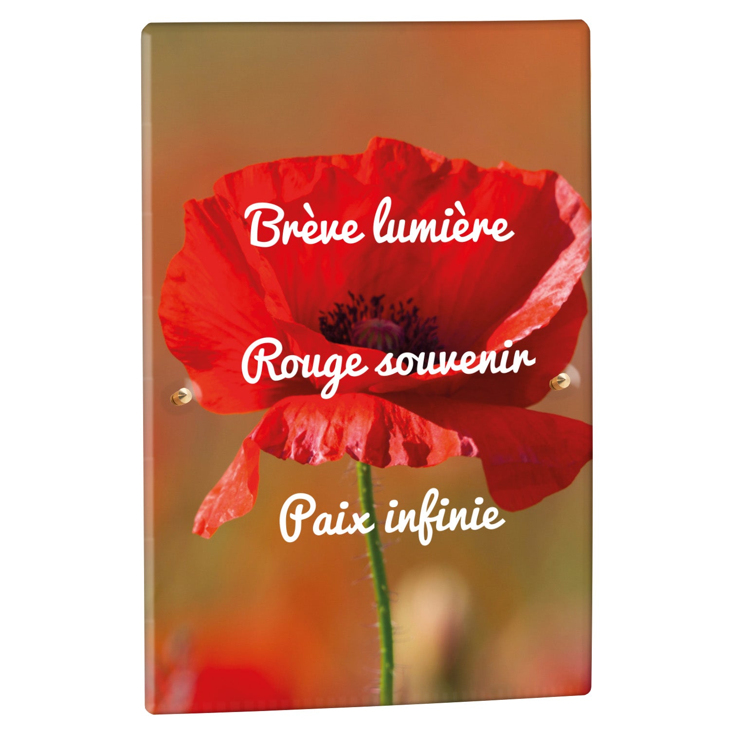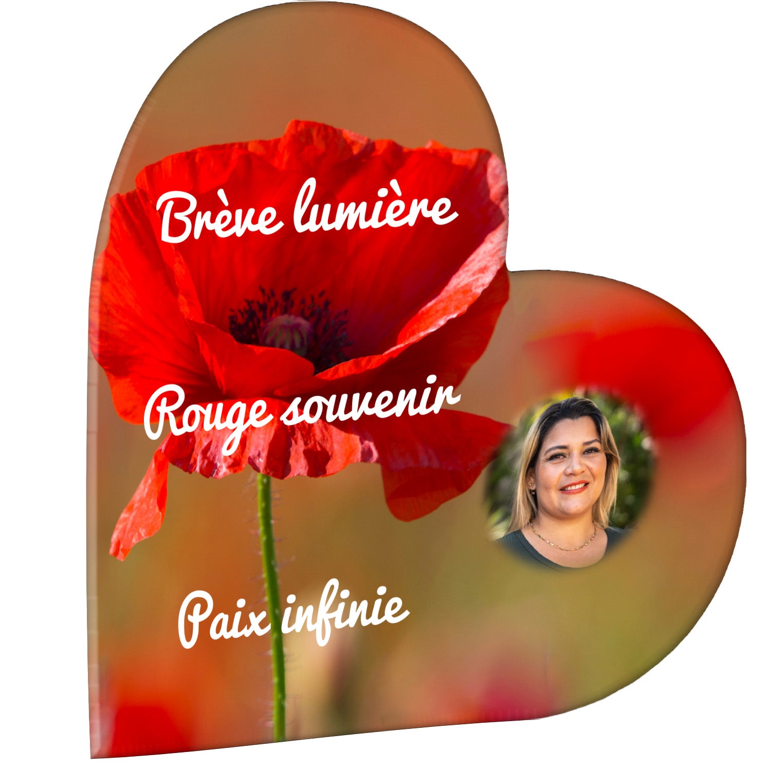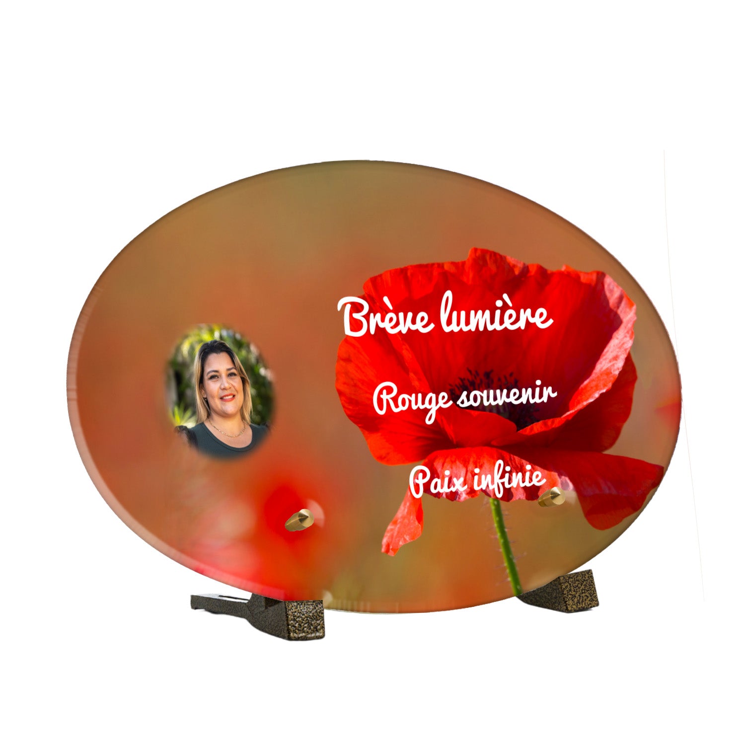 Cette plaque funéraire personnalisée représente élégamment des coquelicots, apportant une touche moderne et délicate à votre hommage. Conçue en plexiglas, cette plaque mortuaire allie esthétisme et résistance, parfaite pour un souvenir qui perdure. Son design sobre et raffiné s’intègre harmonieusement à tout type de sépulture, offrant un rendu contemporain et respectueux.