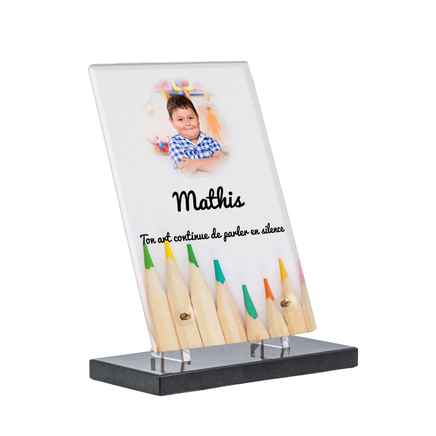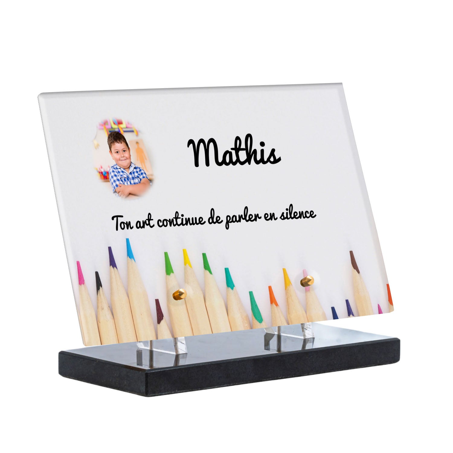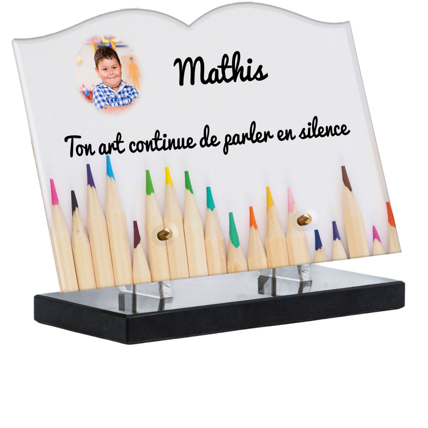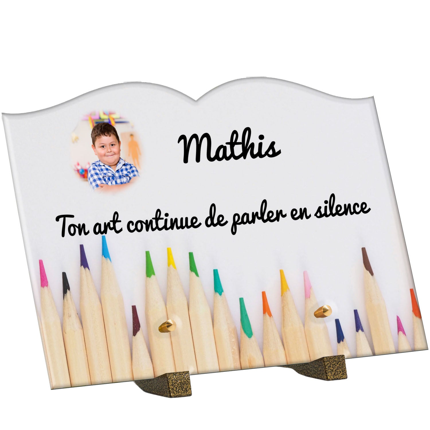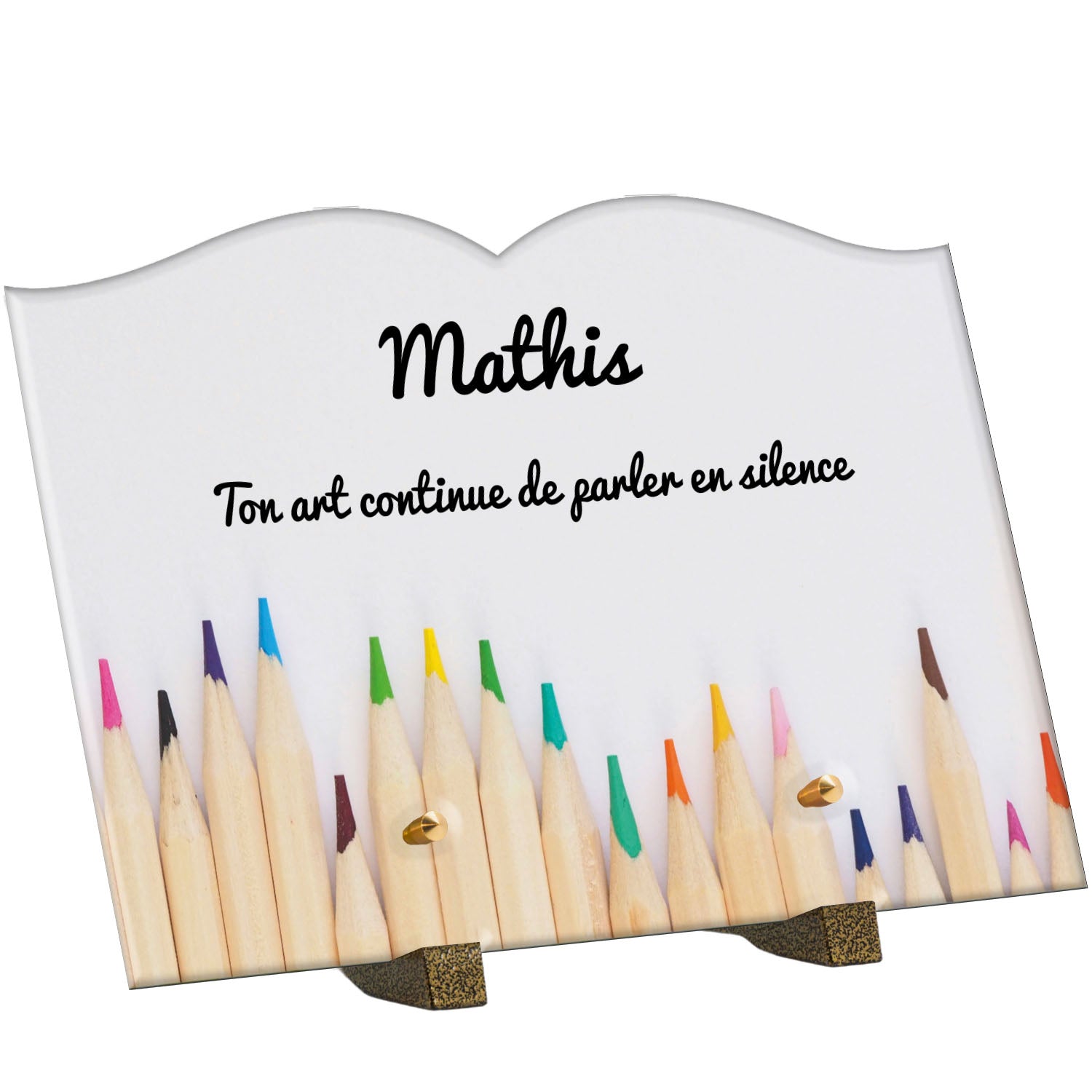 Découvrez notre plaque funéraire personnalisée illustrant un étalage coloré de crayons, un design unique qui apporte une touche moderne et pleine de vie à l’hommage rendu. Réalisée en plexiglas de haute qualité, cette plaque funéraire moderne allie esthétique et respect, parfaite pour une plaque mortuaire à la fois élégante et durable. Chaque plaque est personnalisable sur mesure selon vos souhaits, offrant une expression sincère et personnelle. Grâce à des matériaux résistants, cette plaque funéraire personnalisée garantit une longue tenue face aux intempéries, assurant ainsi que le souvenir reste intact au fil du temps.