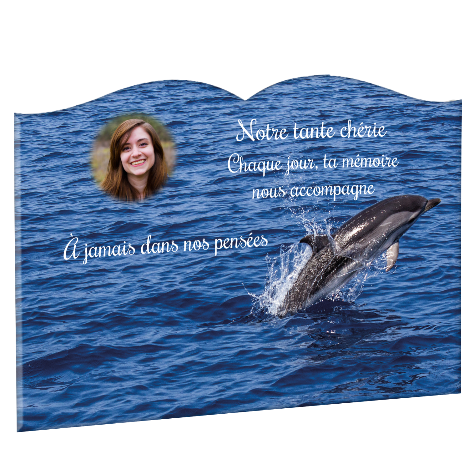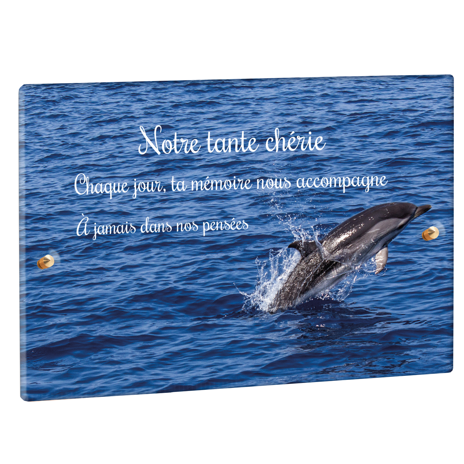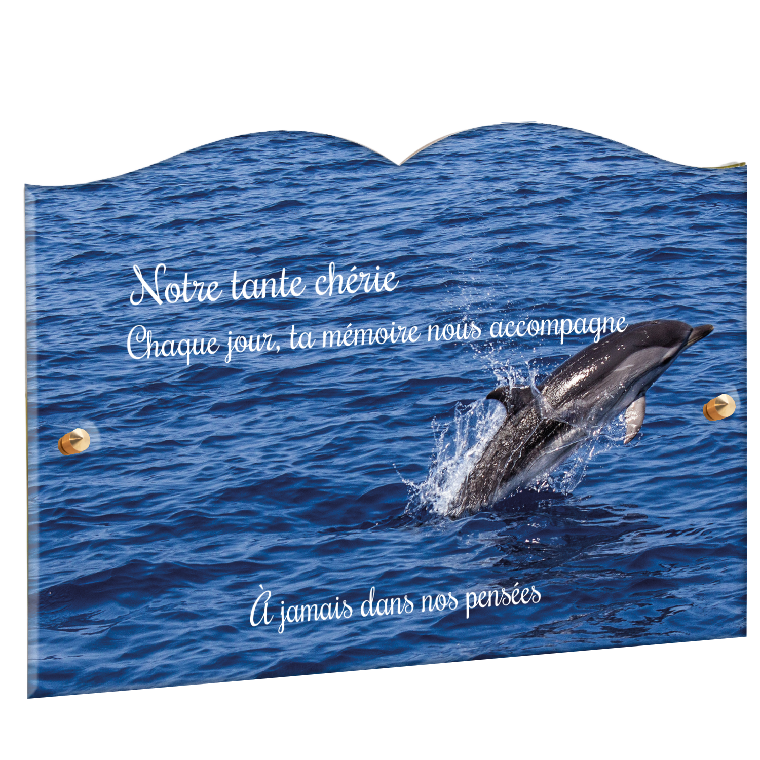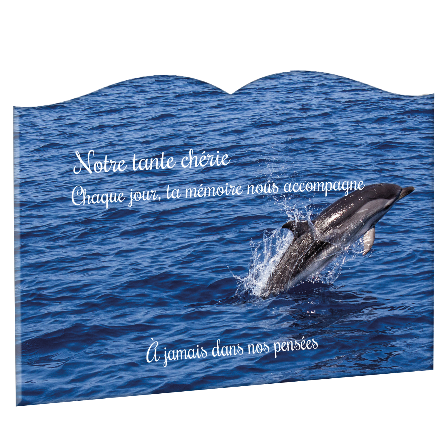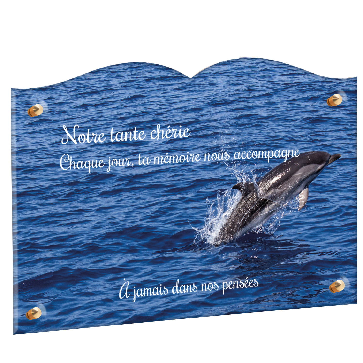 Offrez un hommage unique avec cette plaque funéraire personnalisée représentant un océan apaisant et un dauphin, symbole de liberté et de sérénité. Conçue en plexiglas, cette plaque funéraire moderne allie élégance et résistance, idéale pour célébrer la mémoire de vos proches avec délicatesse. Chaque plaque mortuaire est réalisée sur mesure, vous permettant de choisir les détails qui reflètent au mieux la personnalité du défunt. Sa durabilité approuvée garantit une conservation longue durée, pour un souvenir précieux qui traverse le temps.