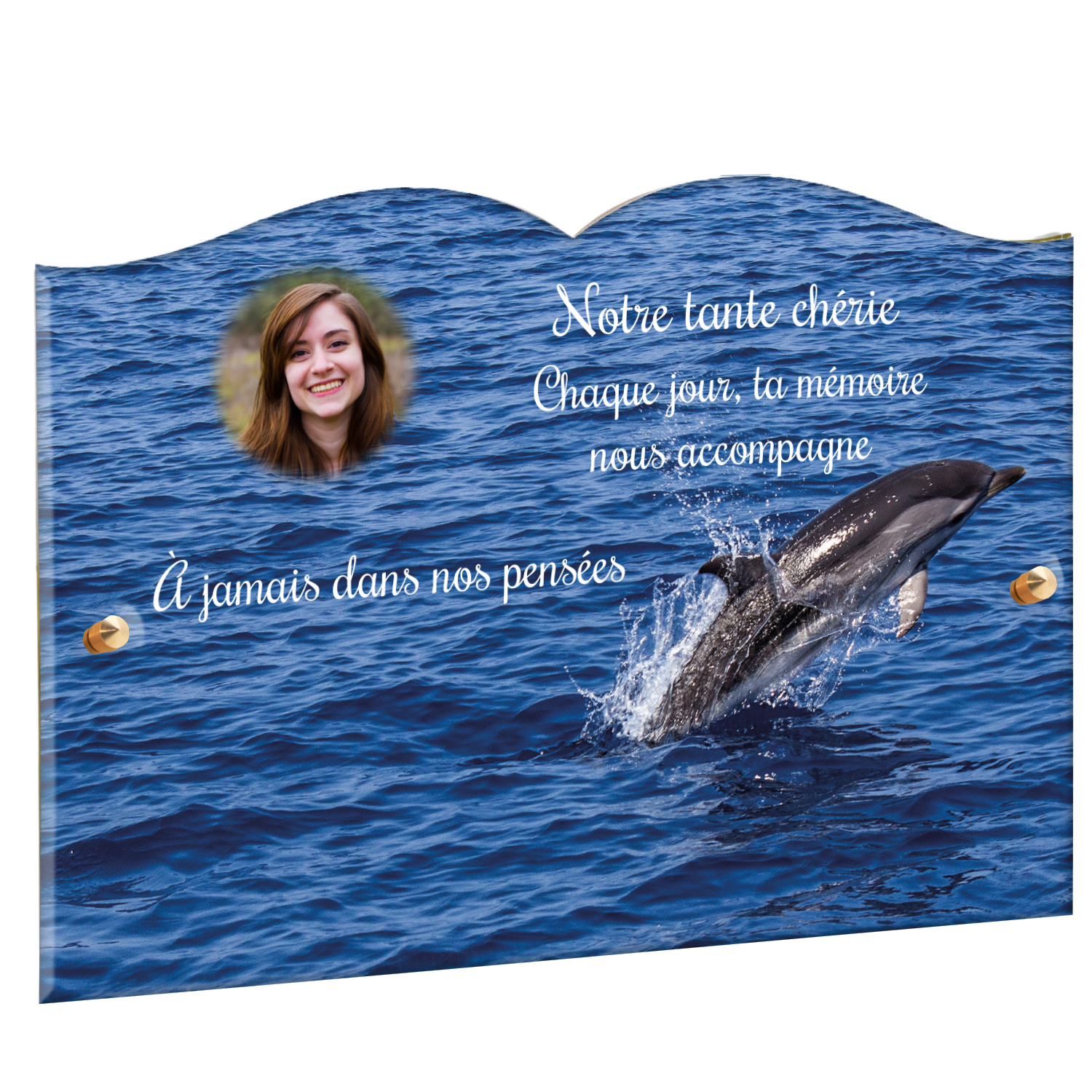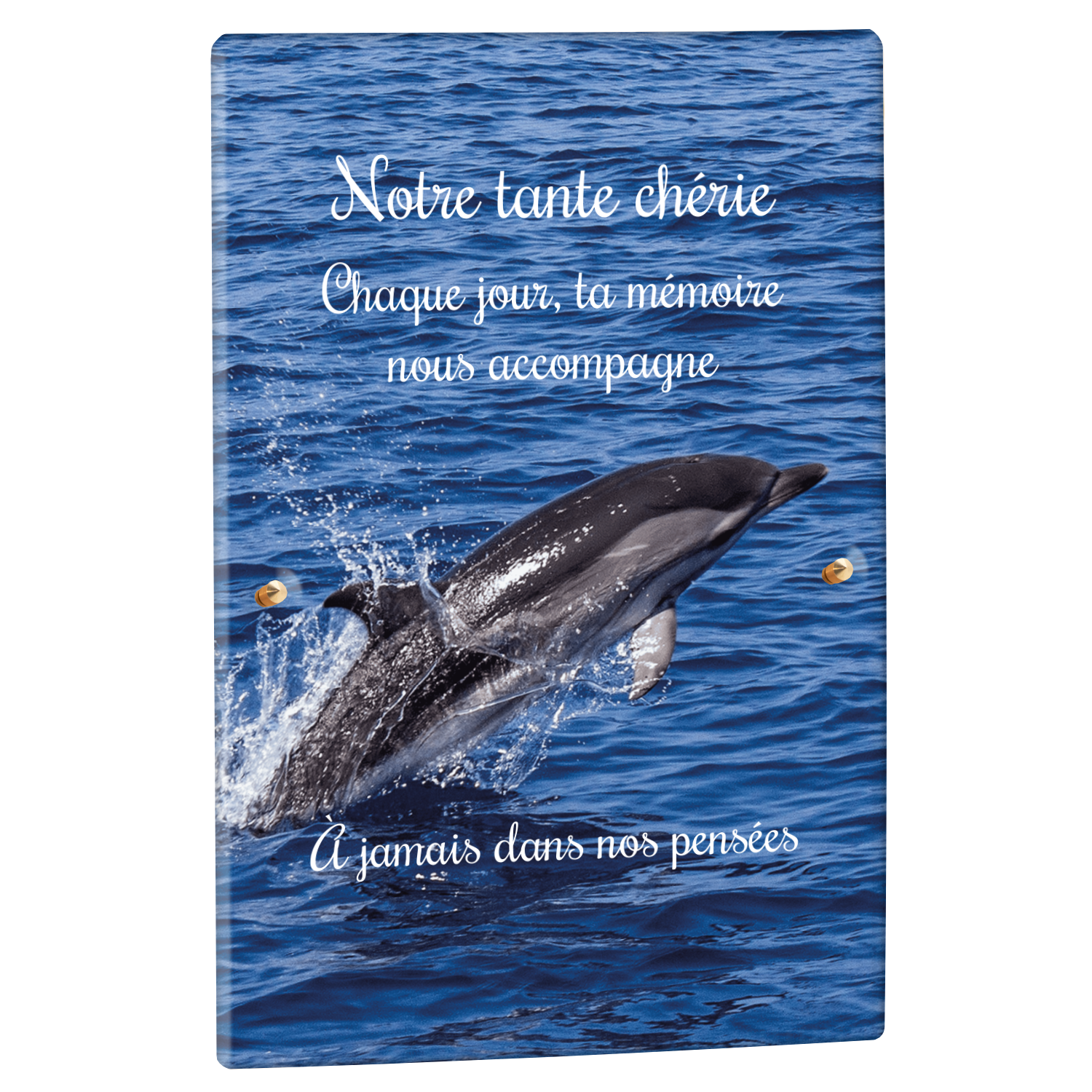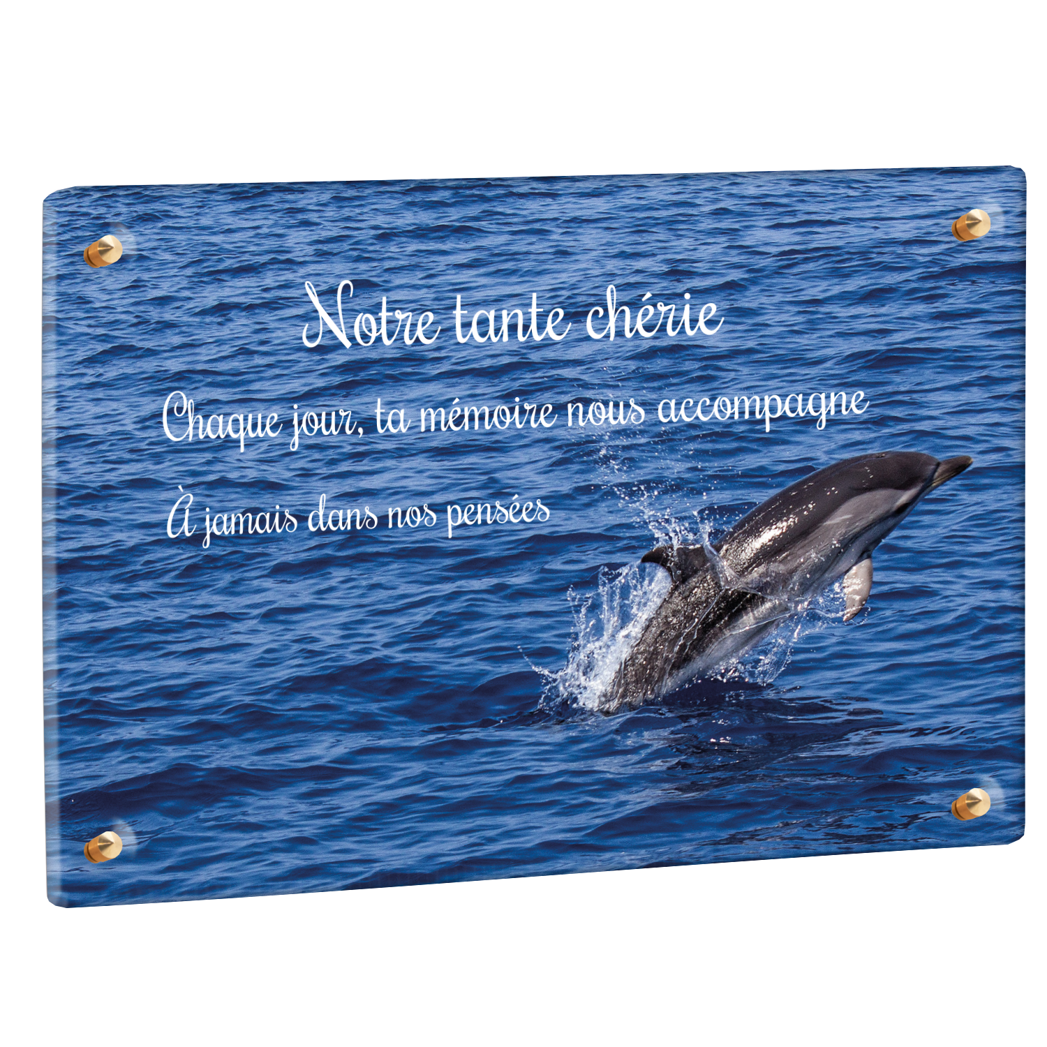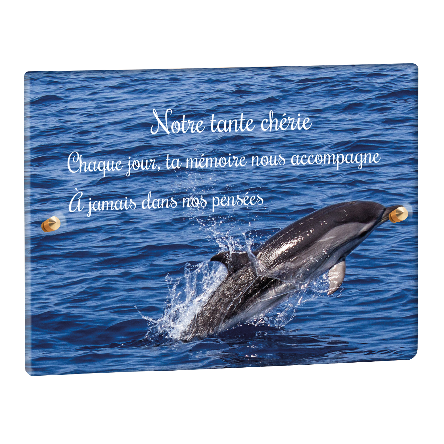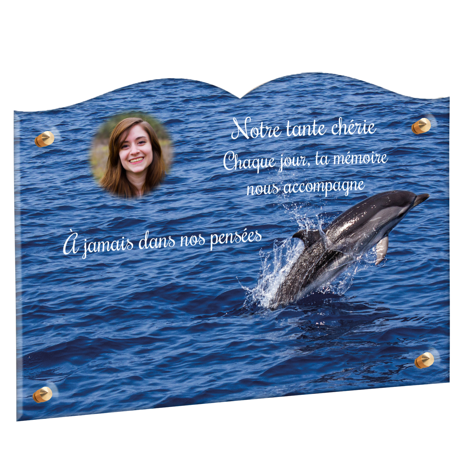 Offrez un hommage unique avec cette plaque funéraire personnalisée représentant un océan apaisant et un dauphin, symbole de liberté et de sérénité. Conçue en plexiglas, cette plaque funéraire moderne allie élégance et résistance, idéale pour célébrer la mémoire de vos proches avec délicatesse. Chaque plaque mortuaire est réalisée sur mesure, vous permettant de choisir les détails qui reflètent au mieux la personnalité du défunt. Sa durabilité approuvée garantit une conservation longue durée, pour un souvenir précieux qui traverse le temps.