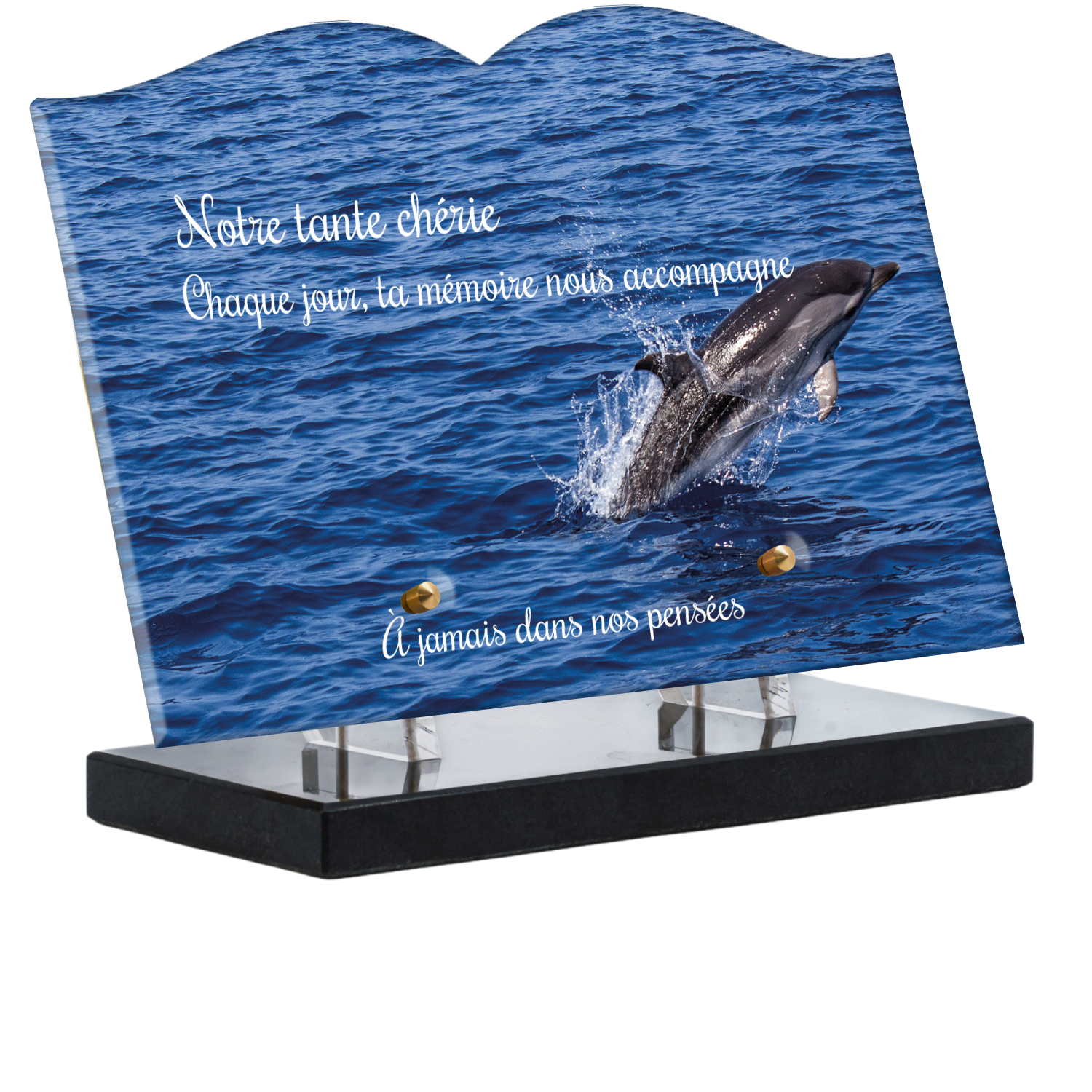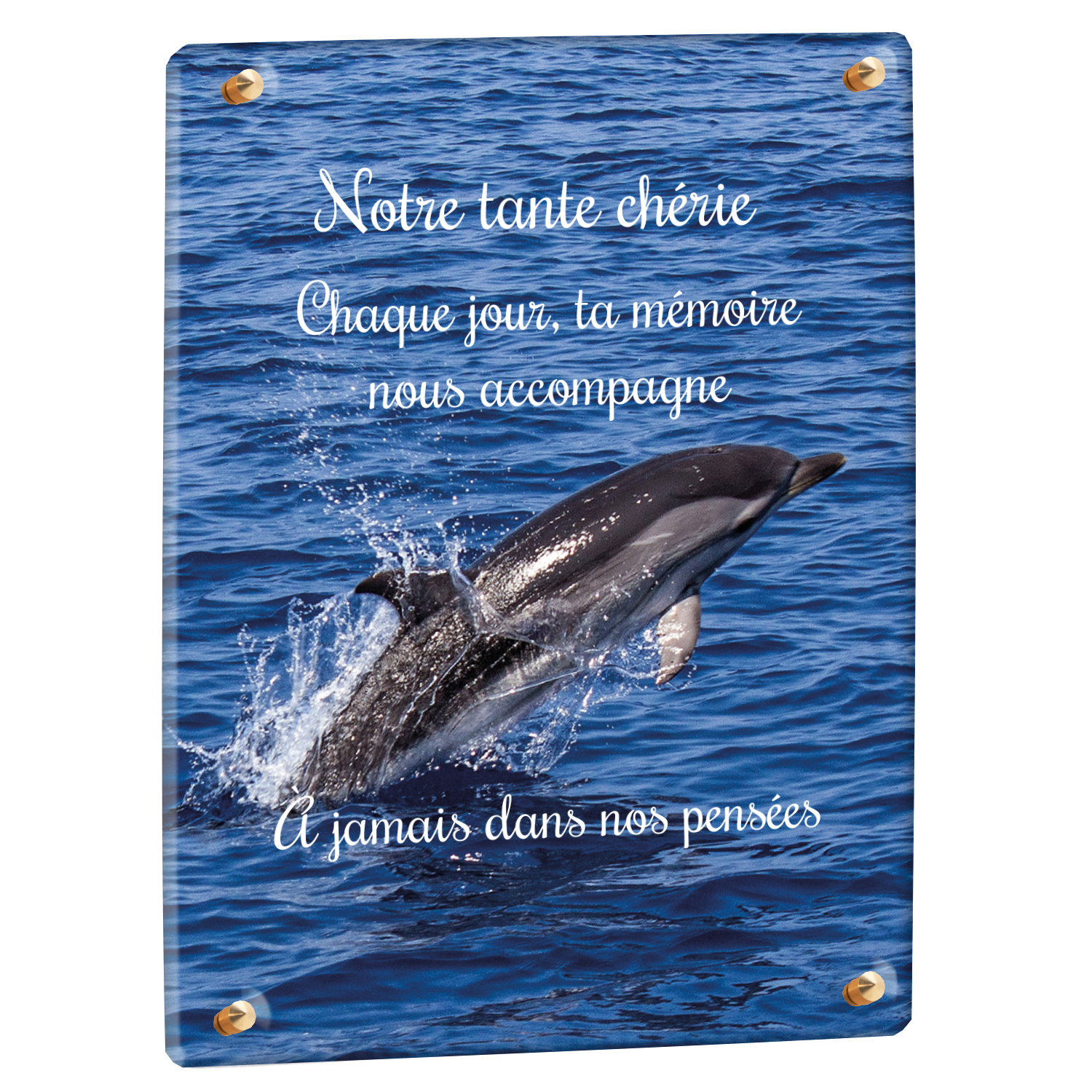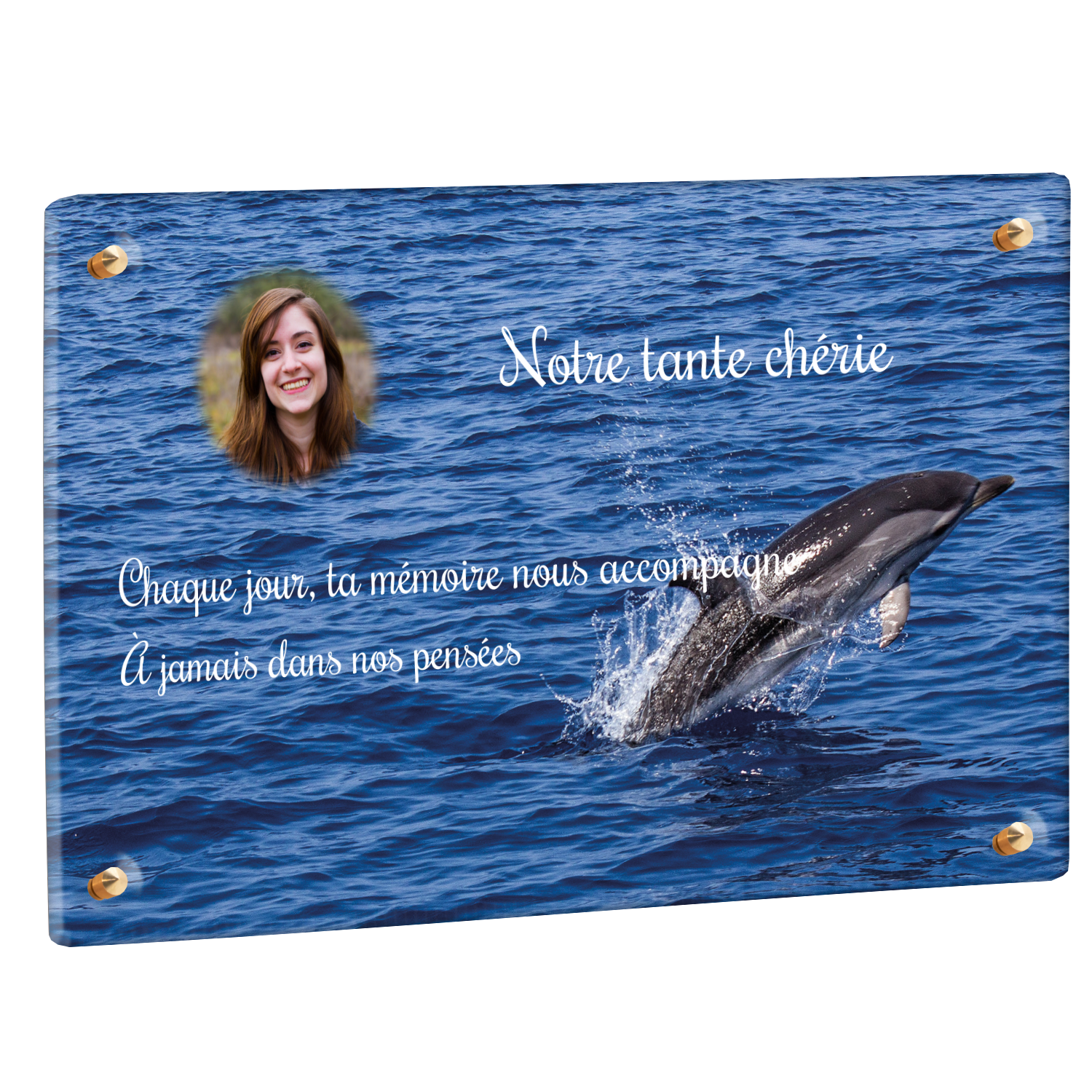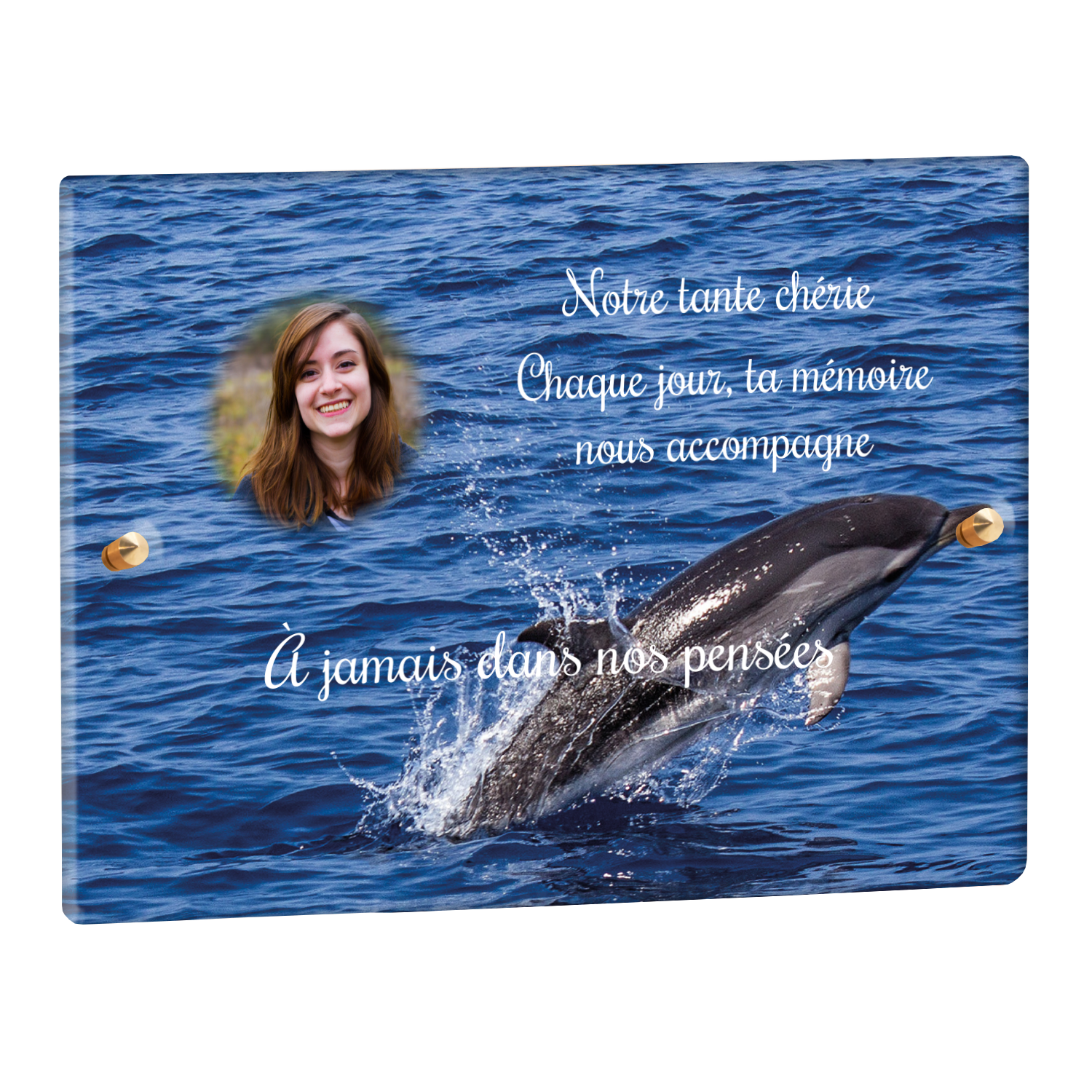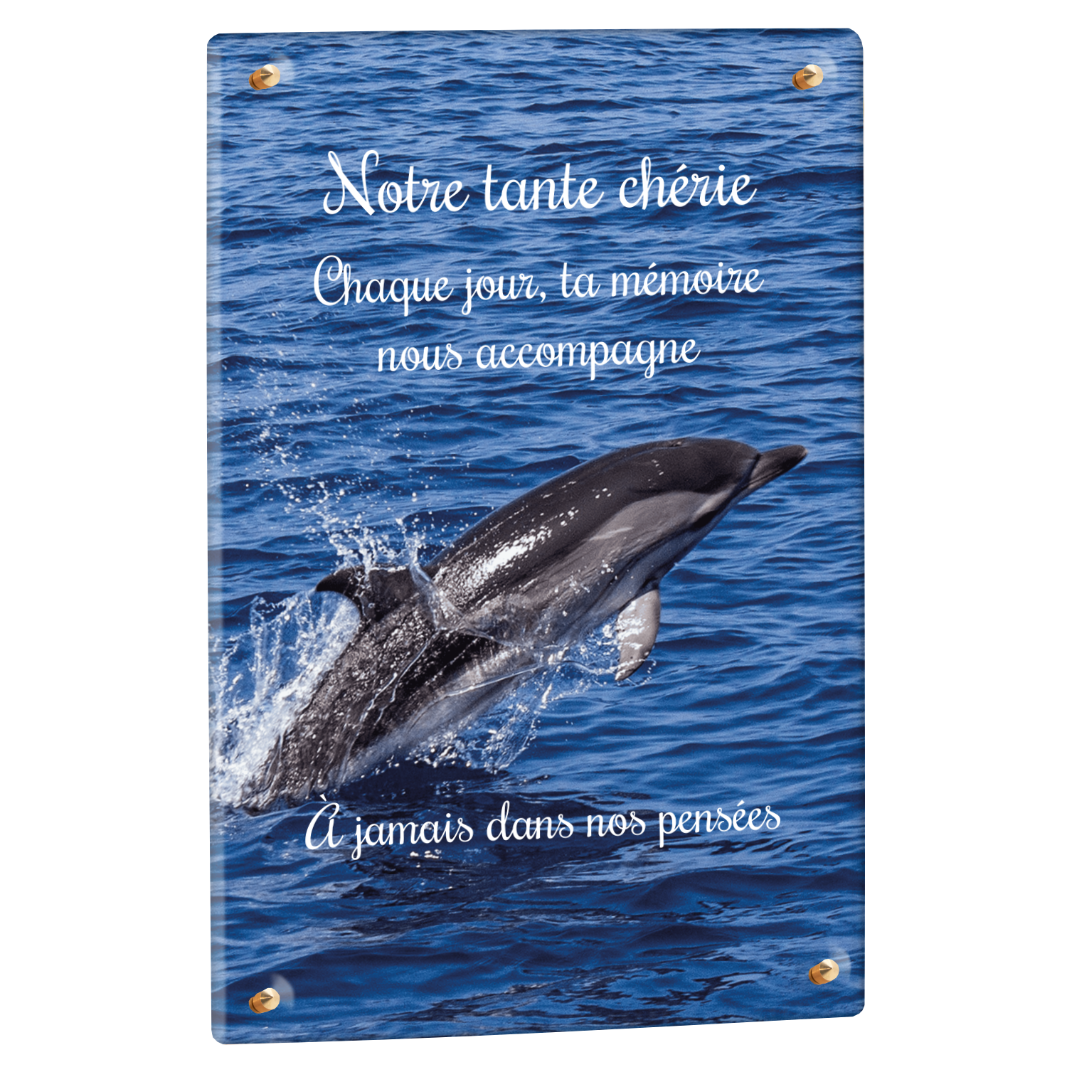 Offrez un hommage unique avec cette plaque funéraire personnalisée représentant un océan apaisant et un dauphin, symbole de liberté et de sérénité. Conçue en plexiglas, cette plaque funéraire moderne allie élégance et résistance, idéale pour célébrer la mémoire de vos proches avec délicatesse. Chaque plaque mortuaire est réalisée sur mesure, vous permettant de choisir les détails qui reflètent au mieux la personnalité du défunt. Sa durabilité approuvée garantit une conservation longue durée, pour un souvenir précieux qui traverse le temps.