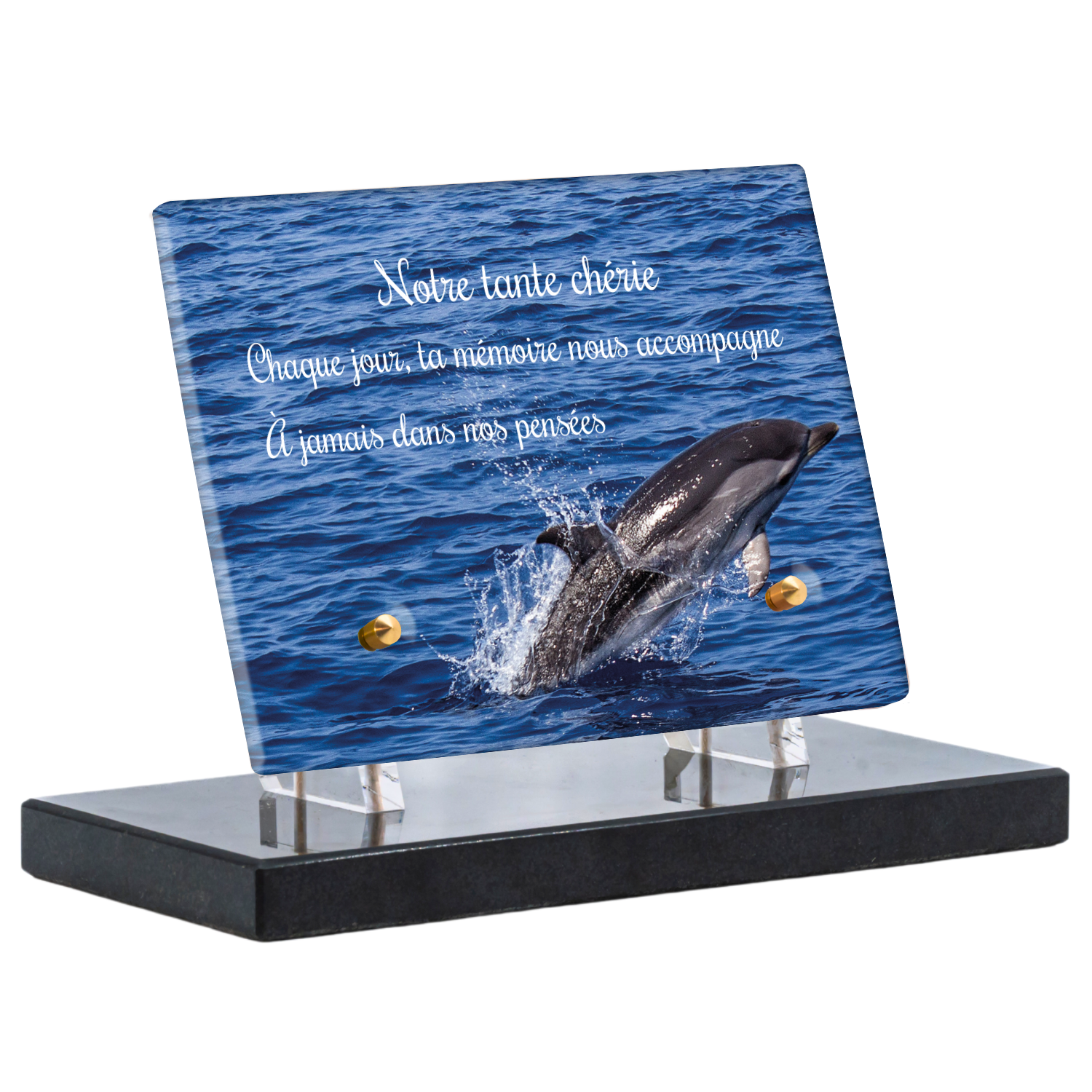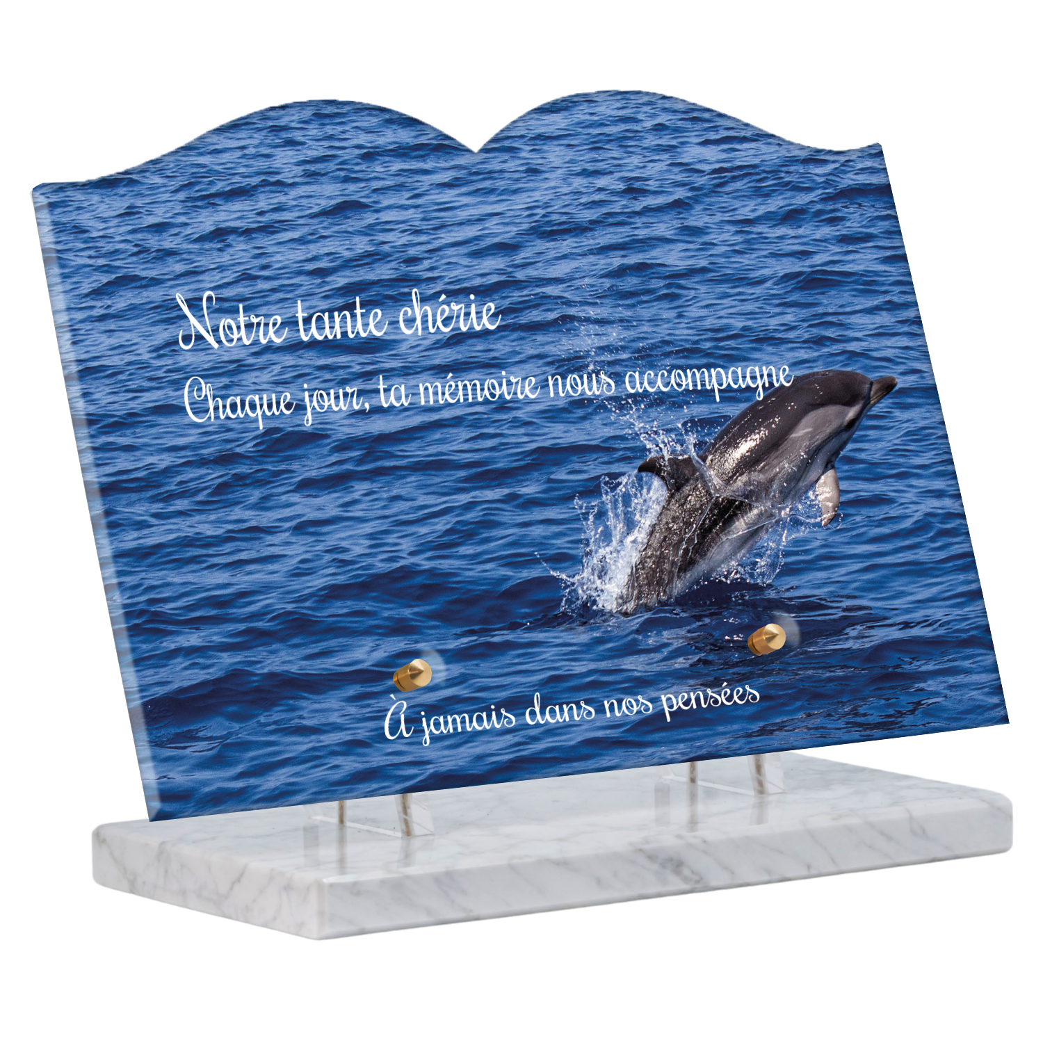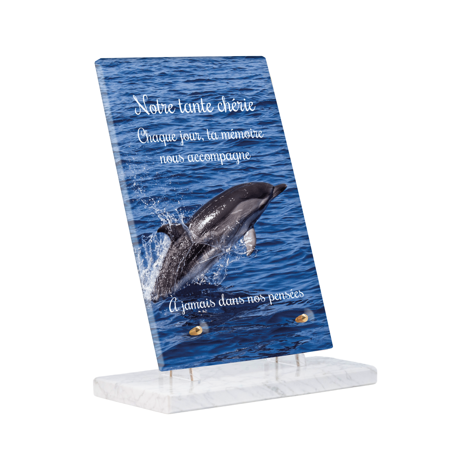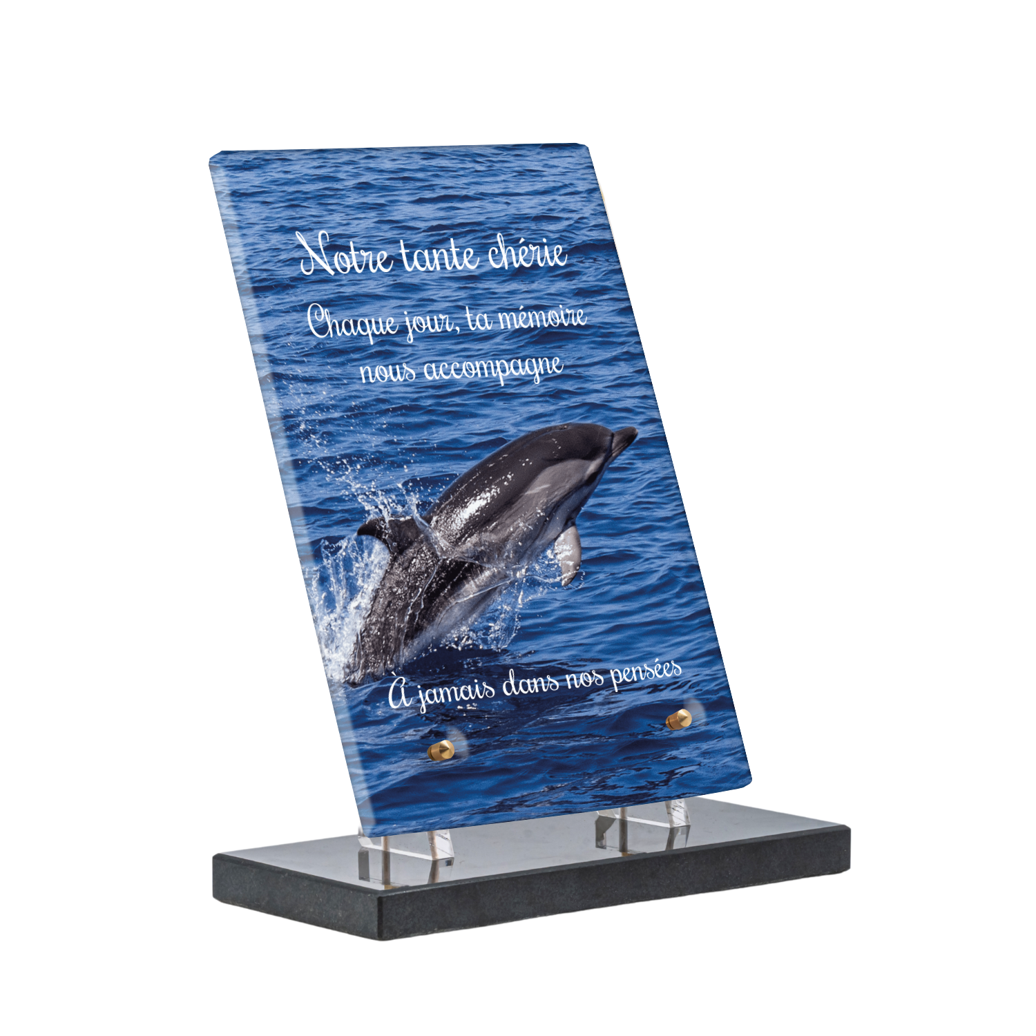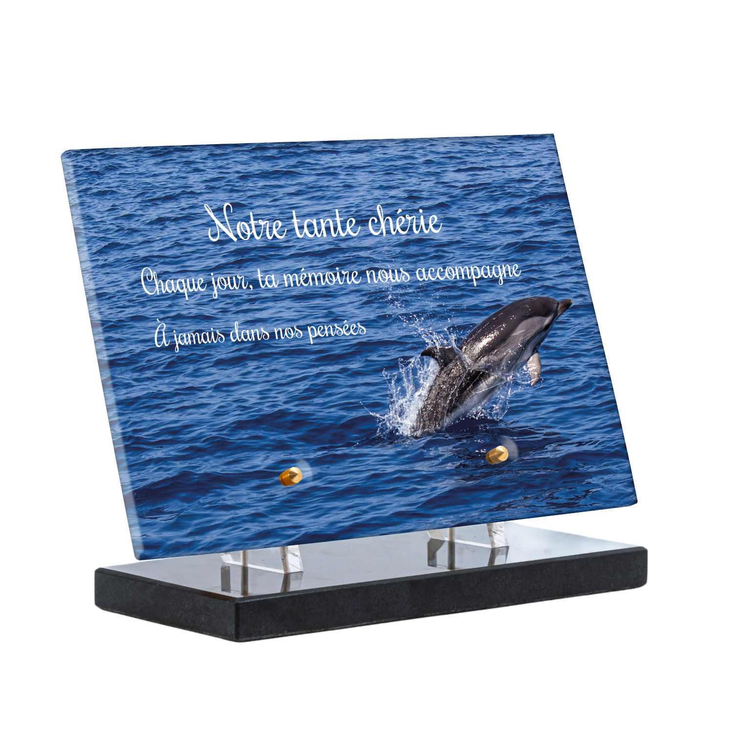 Offrez un hommage unique avec cette plaque funéraire personnalisée représentant un océan apaisant et un dauphin, symbole de liberté et de sérénité. Conçue en plexiglas, cette plaque funéraire moderne allie élégance et résistance, idéale pour célébrer la mémoire de vos proches avec délicatesse. Chaque plaque mortuaire est réalisée sur mesure, vous permettant de choisir les détails qui reflètent au mieux la personnalité du défunt. Sa durabilité approuvée garantit une conservation longue durée, pour un souvenir précieux qui traverse le temps.