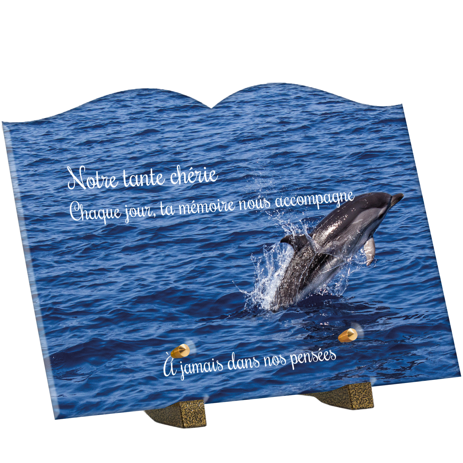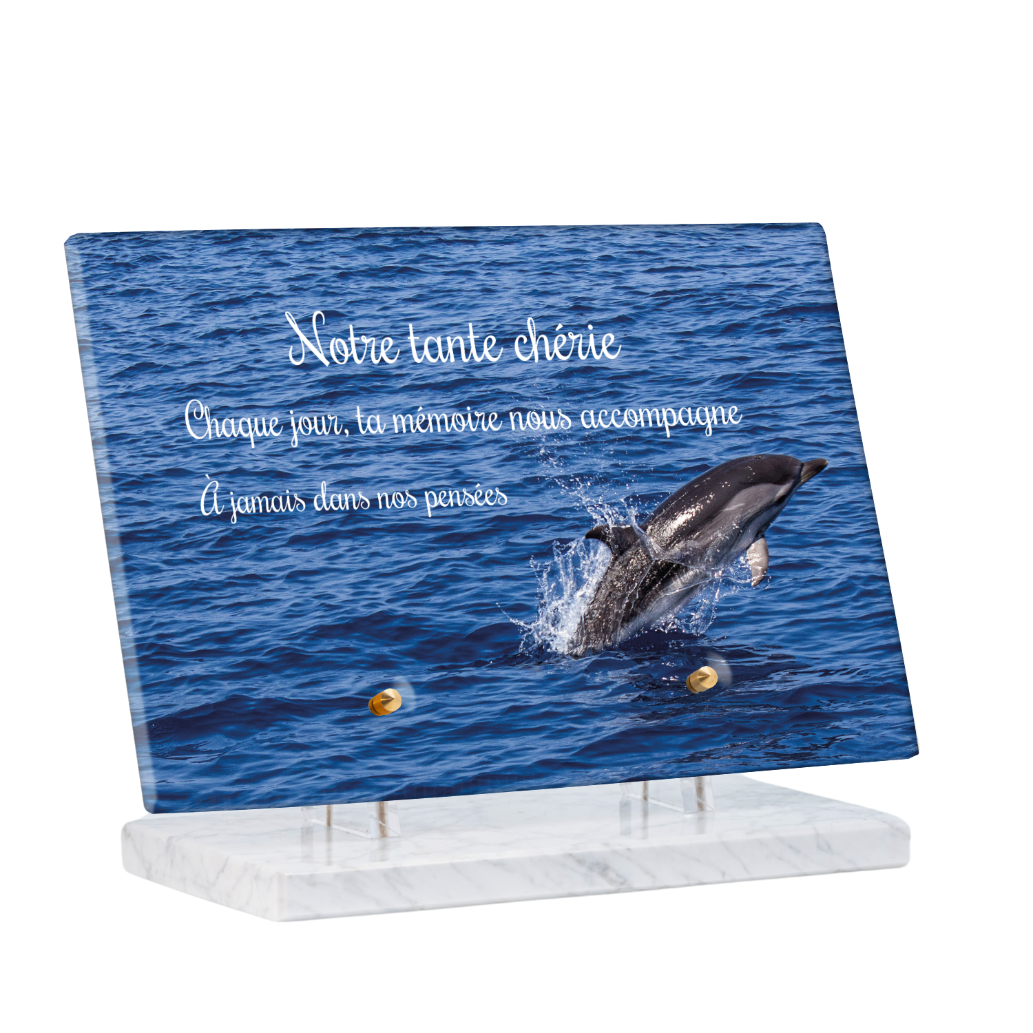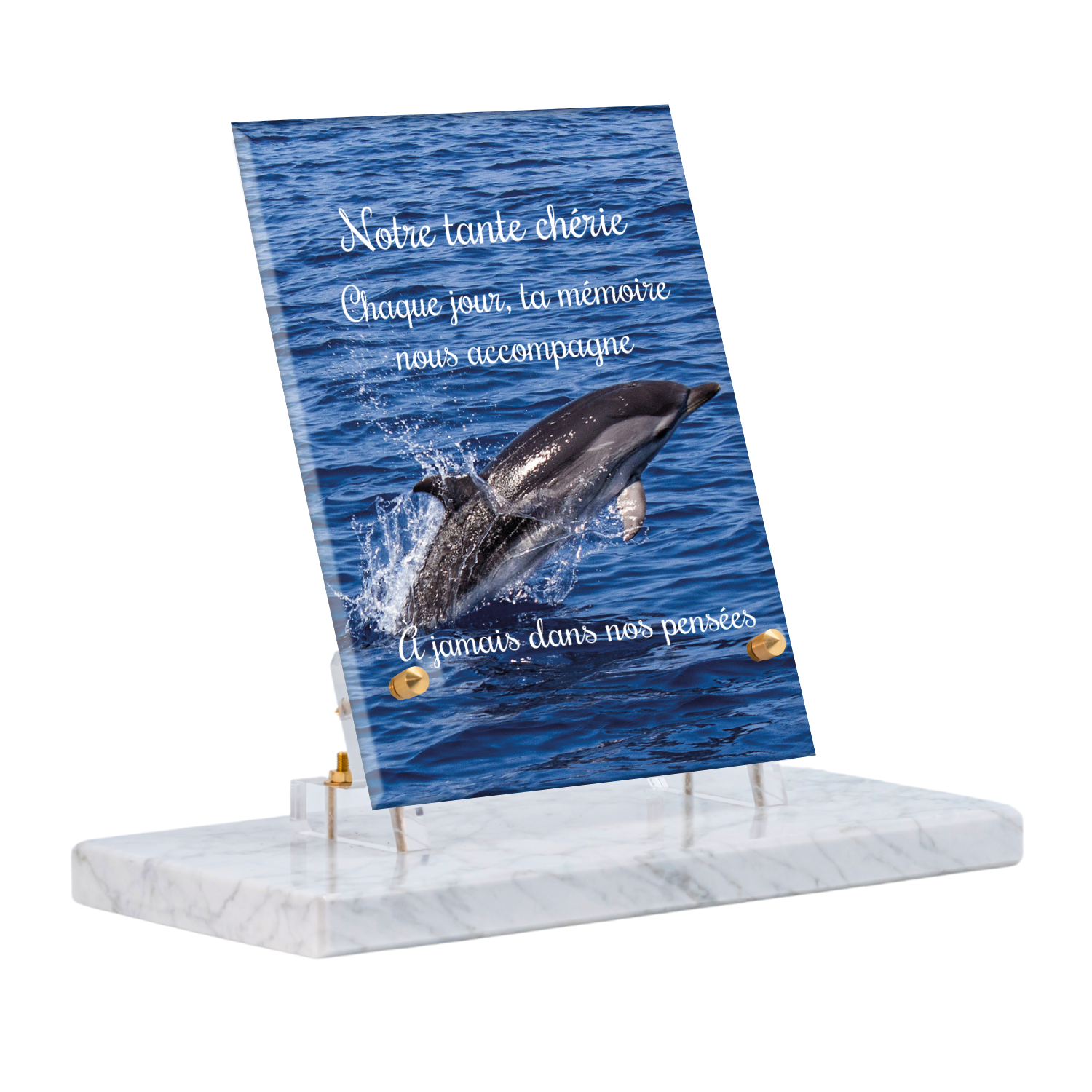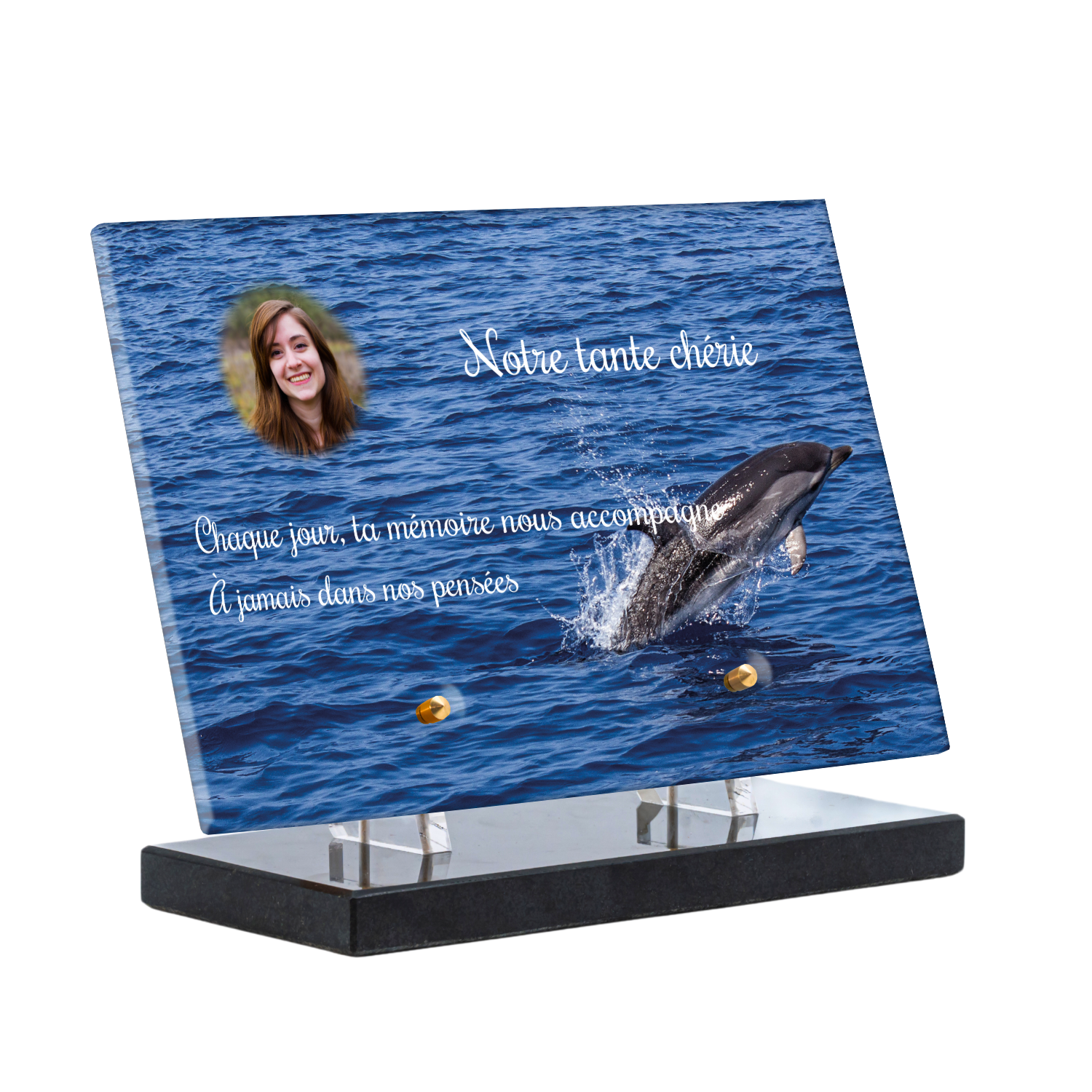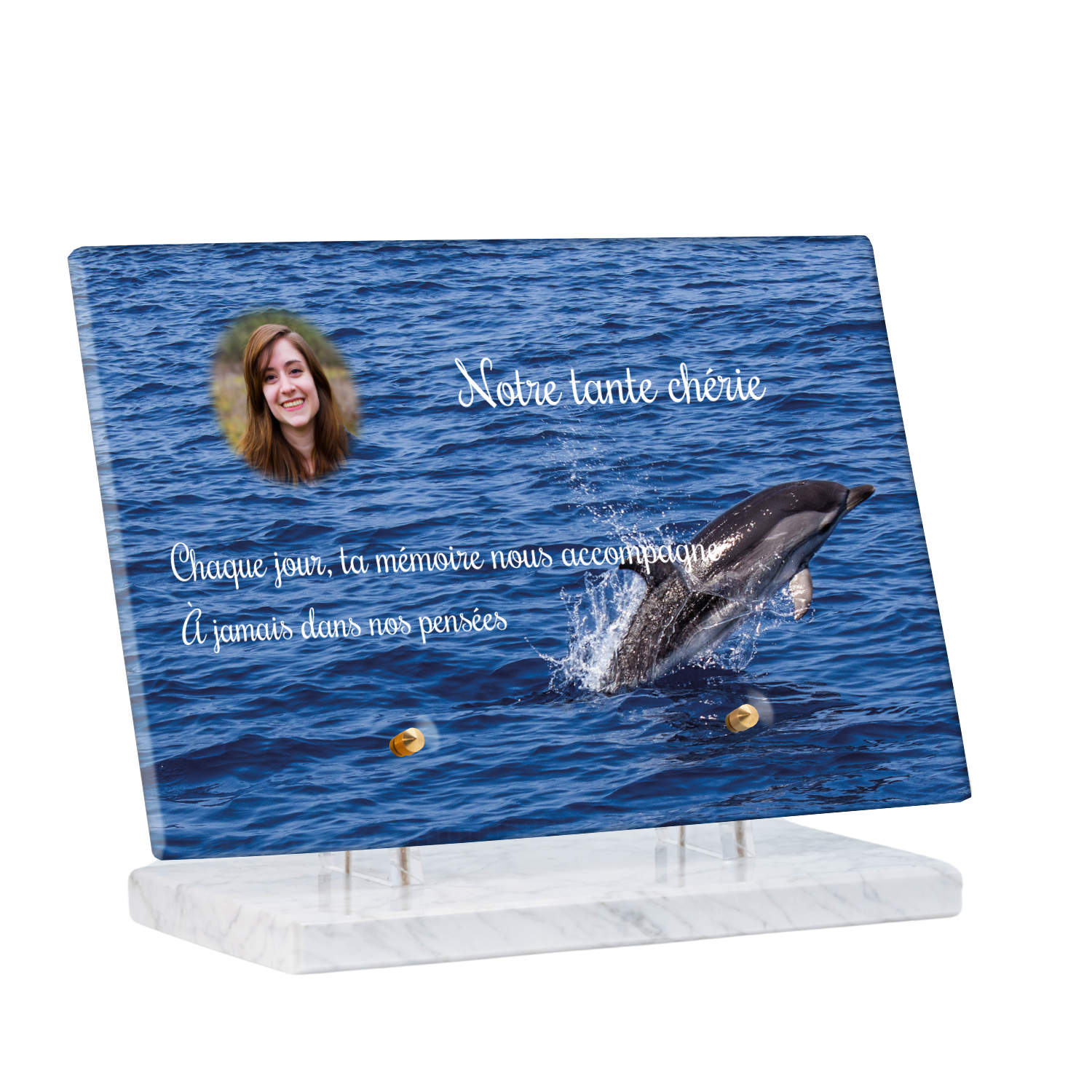 Offrez un hommage unique avec cette plaque funéraire personnalisée représentant un océan apaisant et un dauphin, symbole de liberté et de sérénité. Conçue en plexiglas, cette plaque funéraire moderne allie élégance et résistance, idéale pour célébrer la mémoire de vos proches avec délicatesse. Chaque plaque mortuaire est réalisée sur mesure, vous permettant de choisir les détails qui reflètent au mieux la personnalité du défunt. Sa durabilité approuvée garantit une conservation longue durée, pour un souvenir précieux qui traverse le temps.