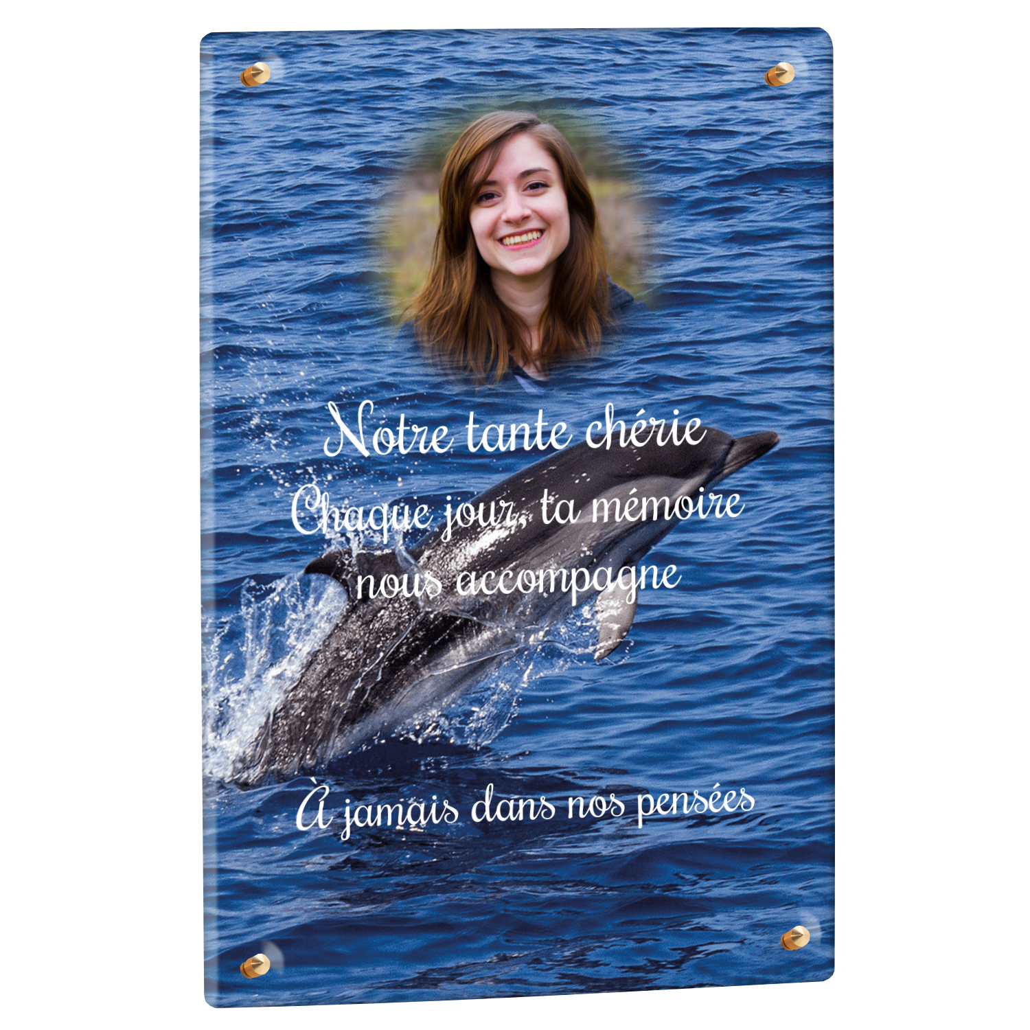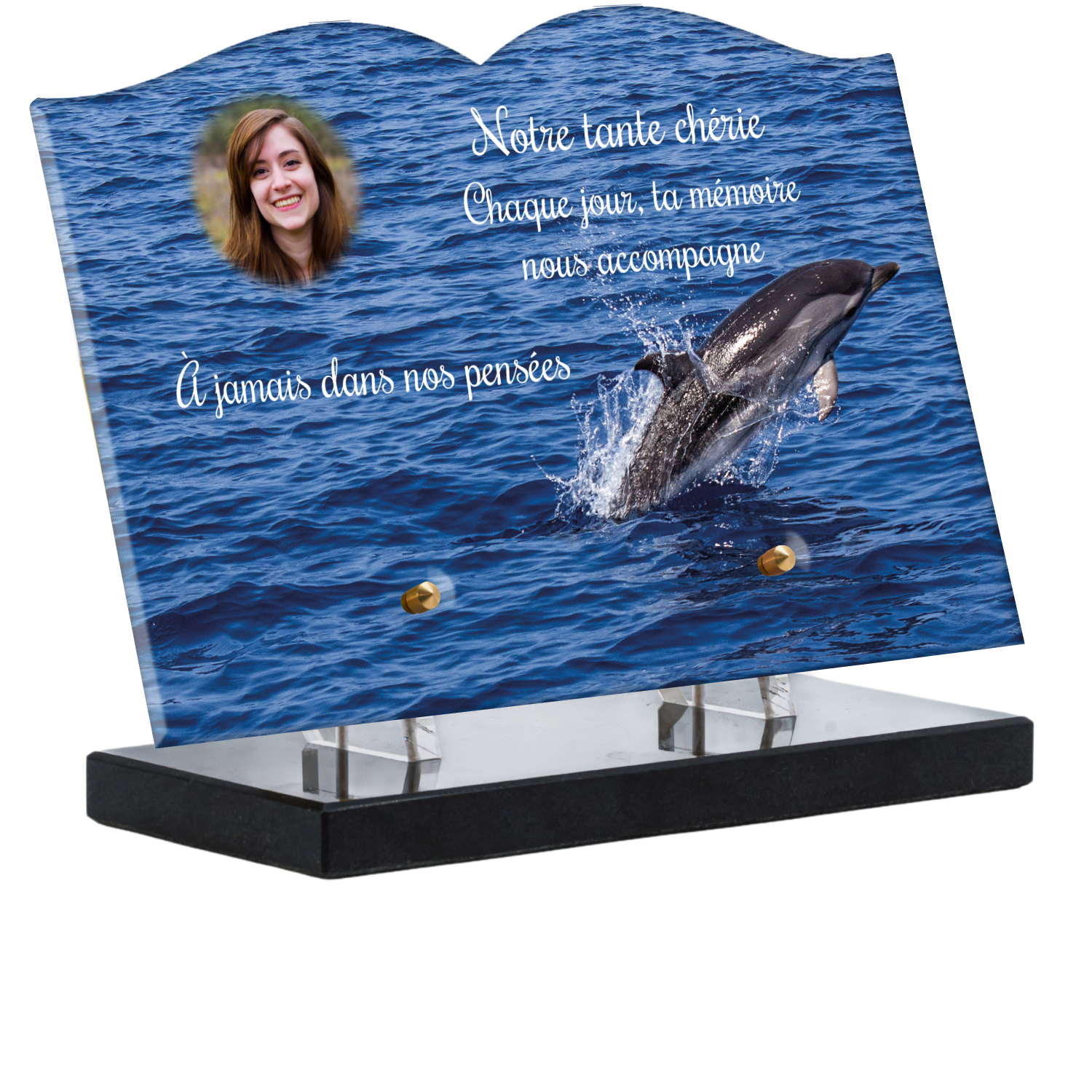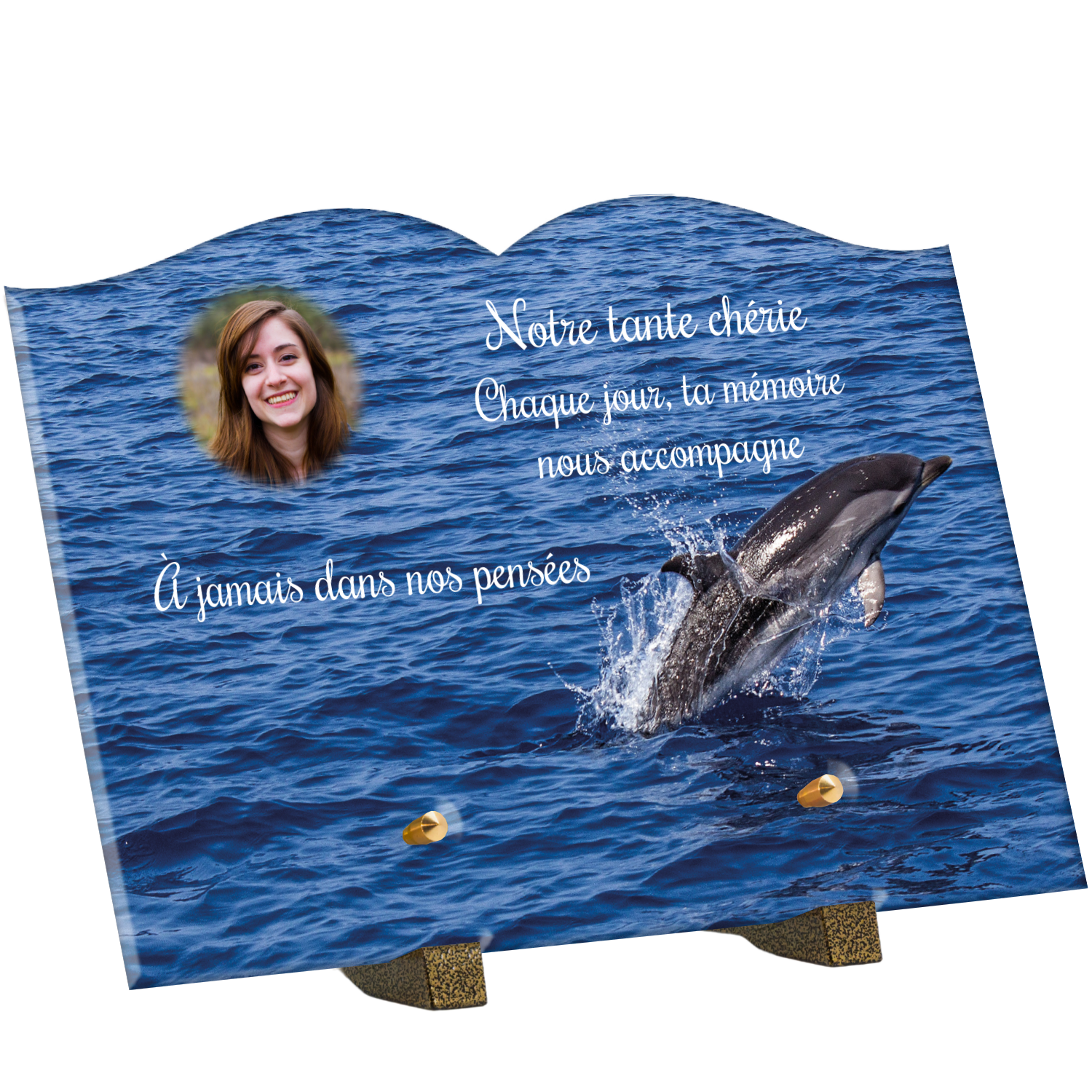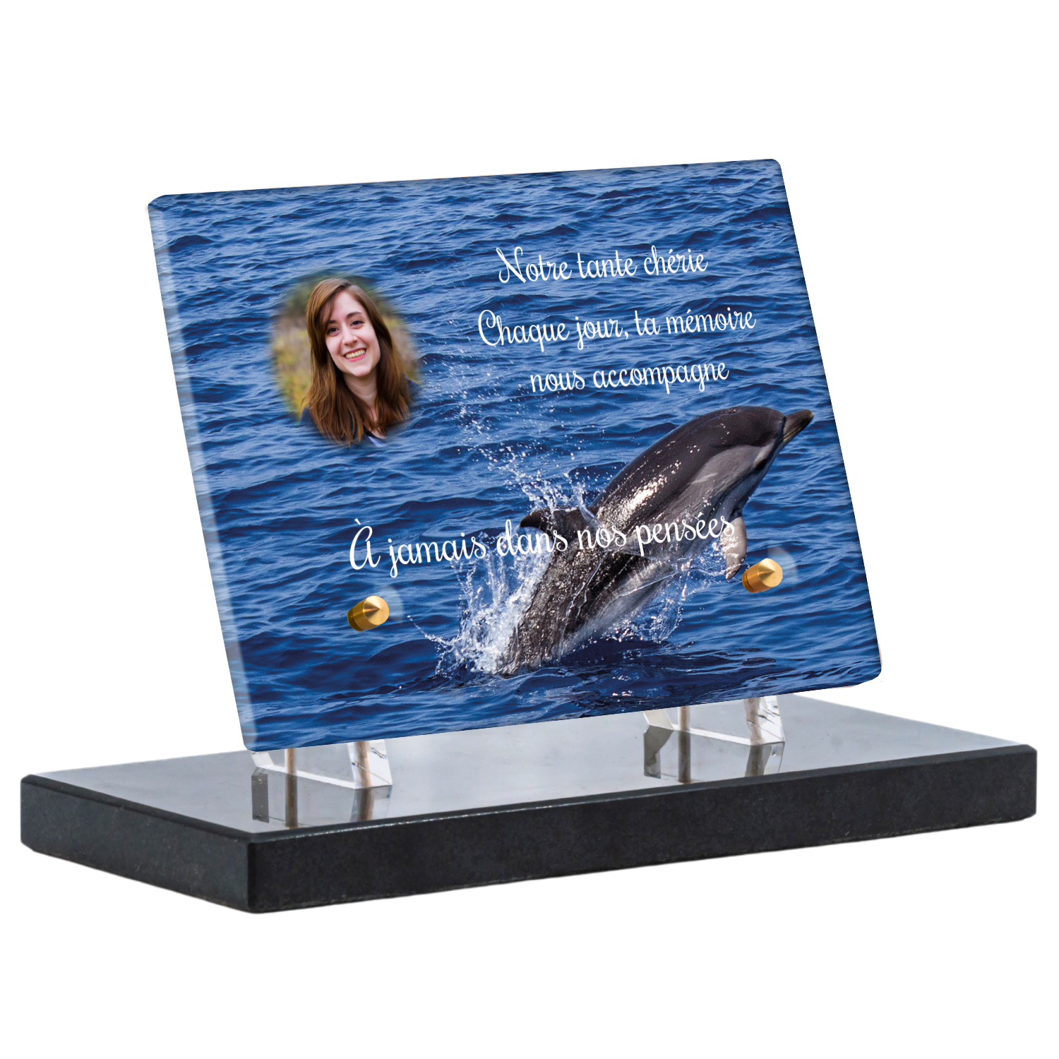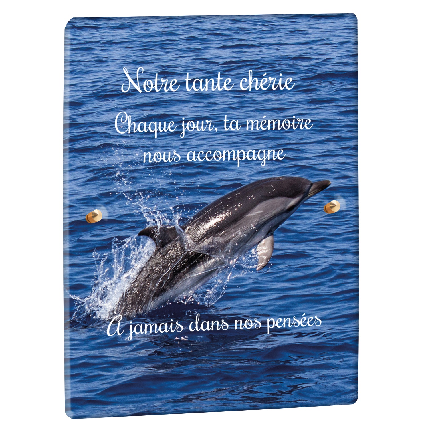Offrez un hommage unique avec cette plaque funéraire personnalisée représentant un océan apaisant et un dauphin, symbole de liberté et de sérénité. Conçue en plexiglas, cette plaque funéraire moderne allie élégance et résistance, idéale pour célébrer la mémoire de vos proches avec délicatesse. Chaque plaque mortuaire est réalisée sur mesure, vous permettant de choisir les détails qui reflètent au mieux la personnalité du défunt. Sa durabilité approuvée garantit une conservation longue durée, pour un souvenir précieux qui traverse le temps.