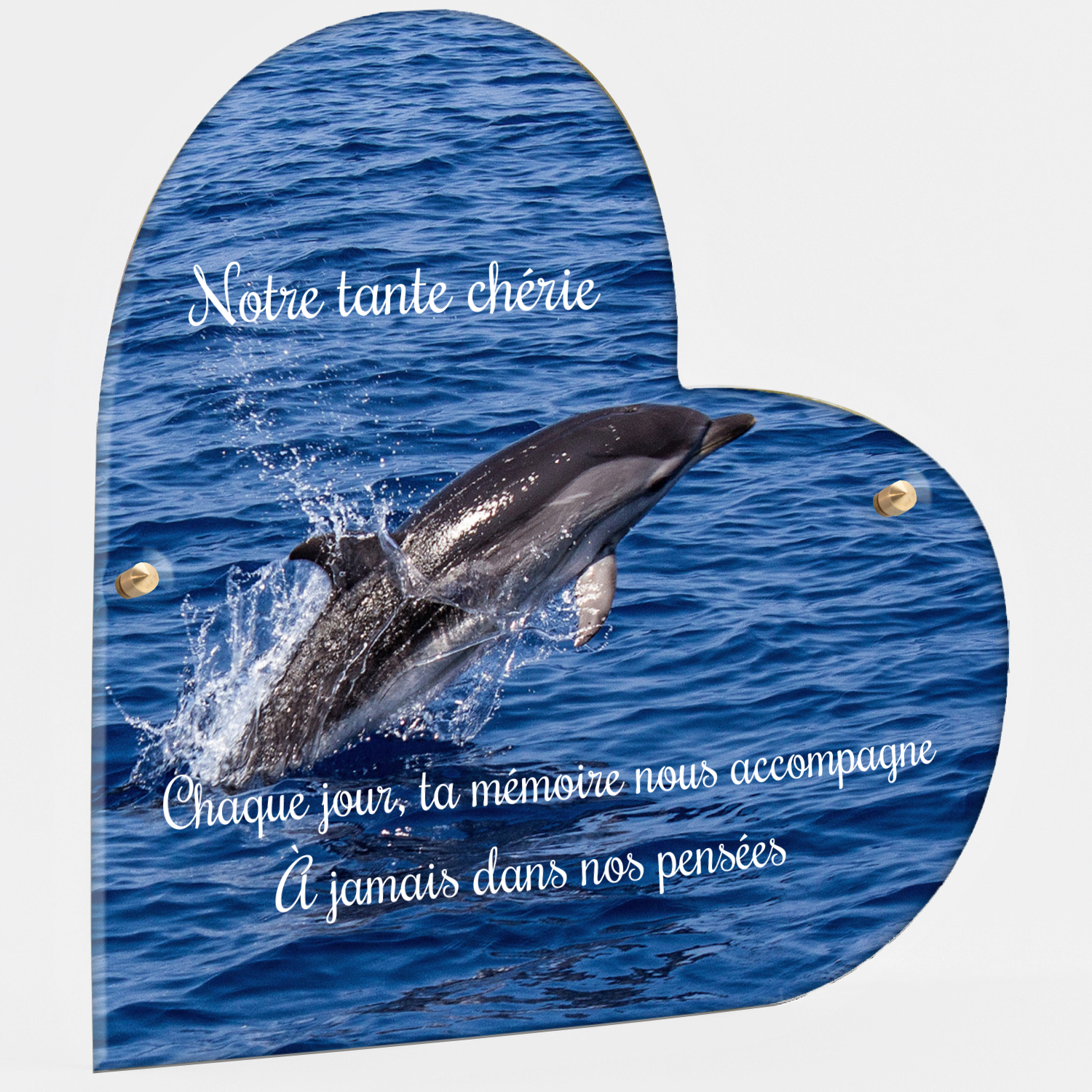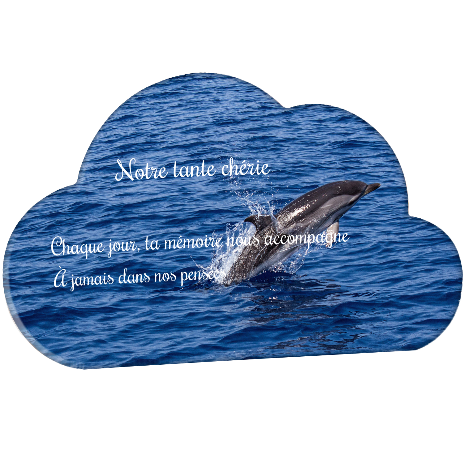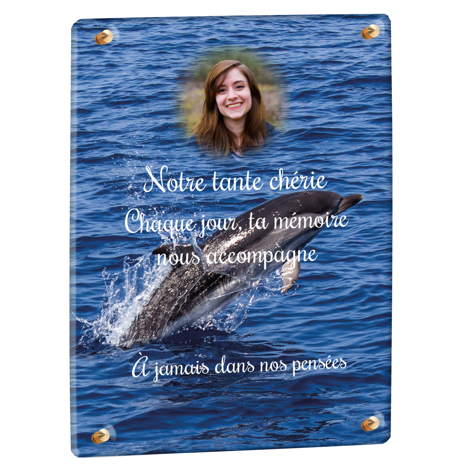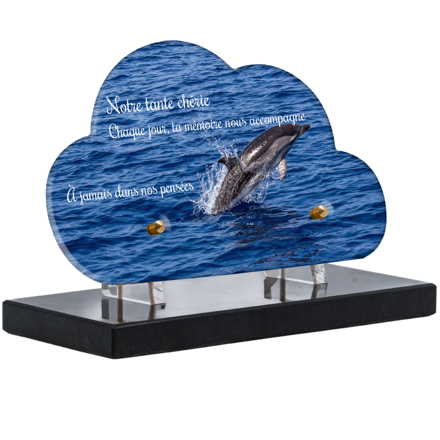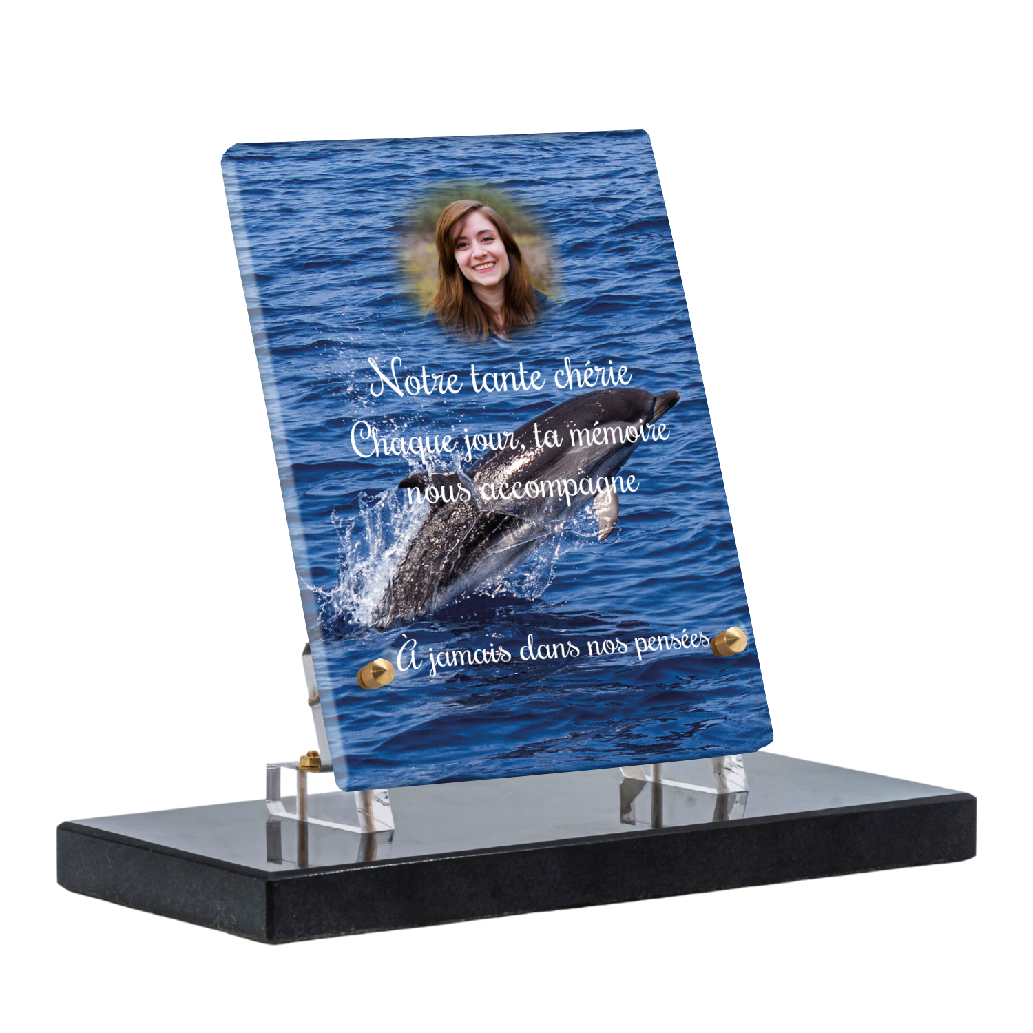 Offrez un hommage unique avec cette plaque funéraire personnalisée représentant un océan apaisant et un dauphin, symbole de liberté et de sérénité. Conçue en plexiglas, cette plaque funéraire moderne allie élégance et résistance, idéale pour célébrer la mémoire de vos proches avec délicatesse. Chaque plaque mortuaire est réalisée sur mesure, vous permettant de choisir les détails qui reflètent au mieux la personnalité du défunt. Sa durabilité approuvée garantit une conservation longue durée, pour un souvenir précieux qui traverse le temps.