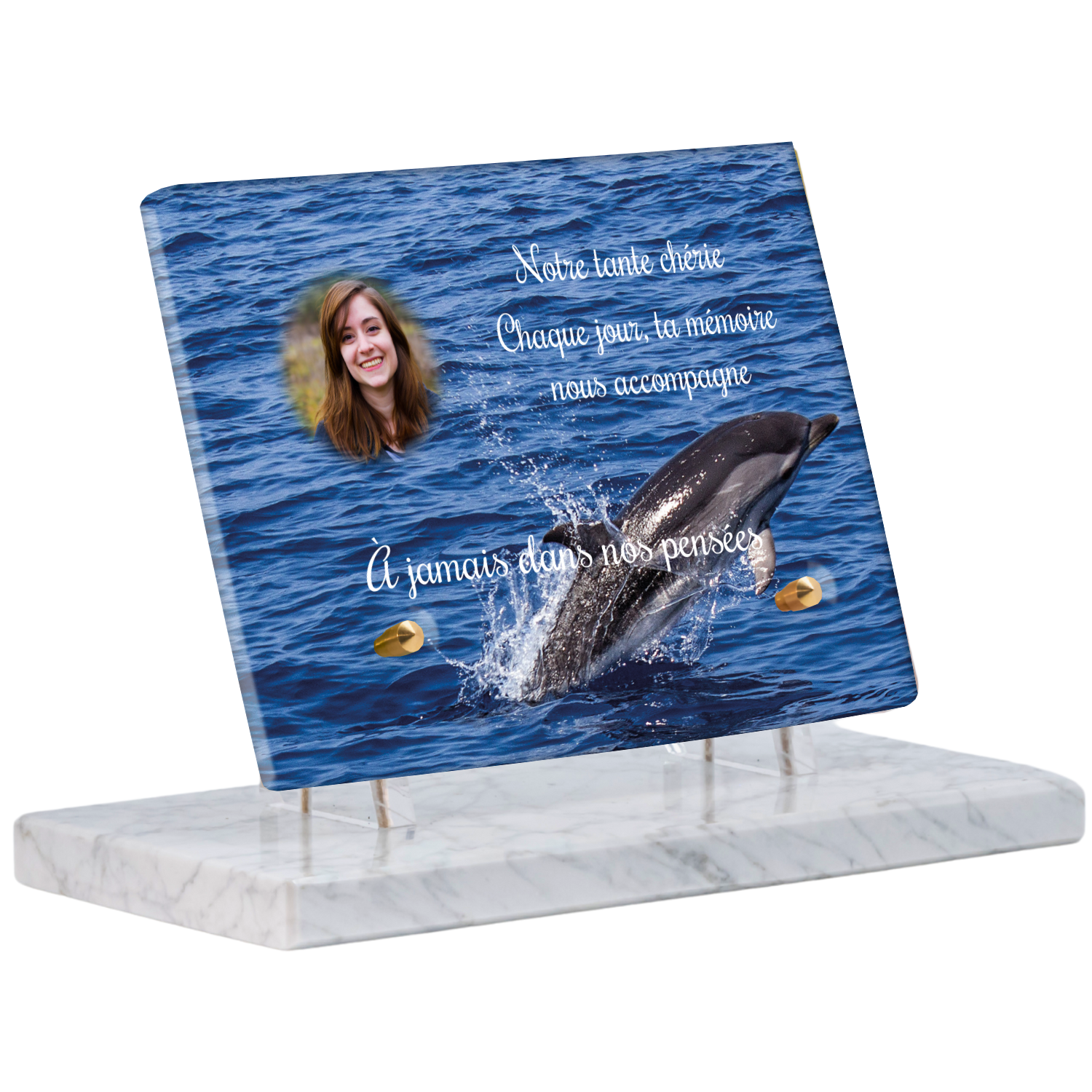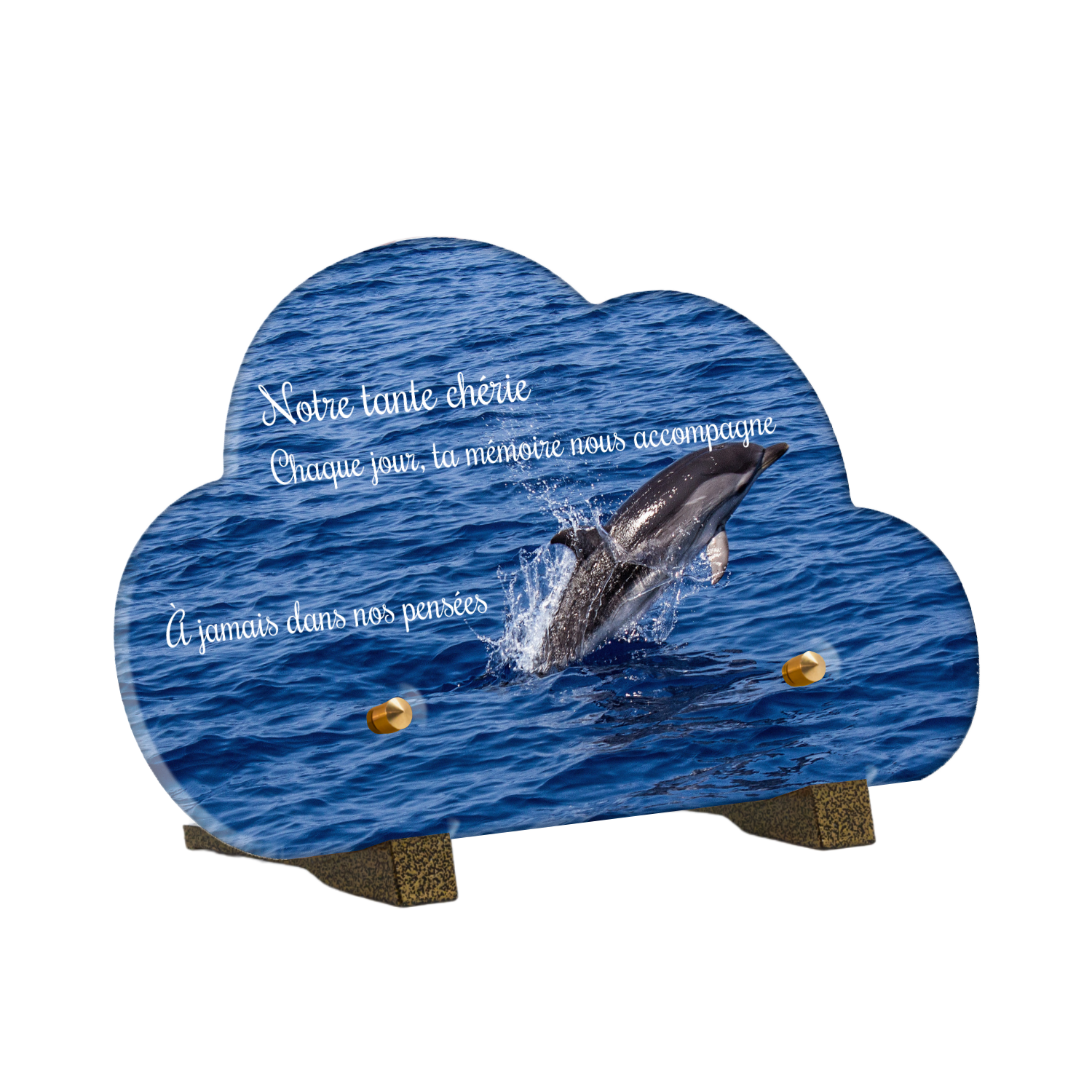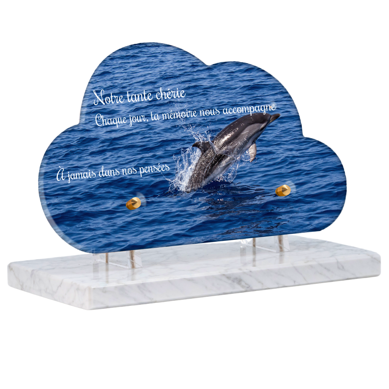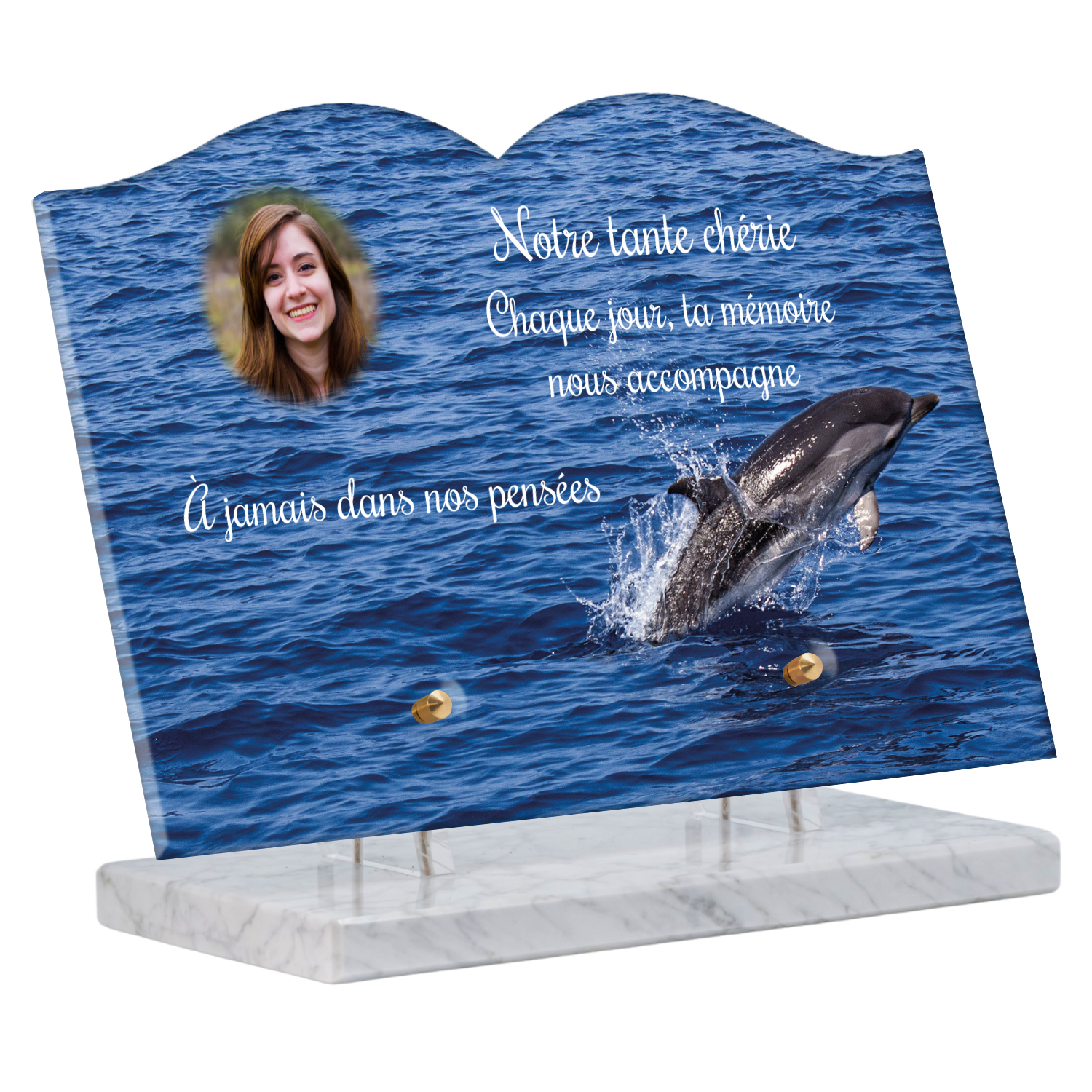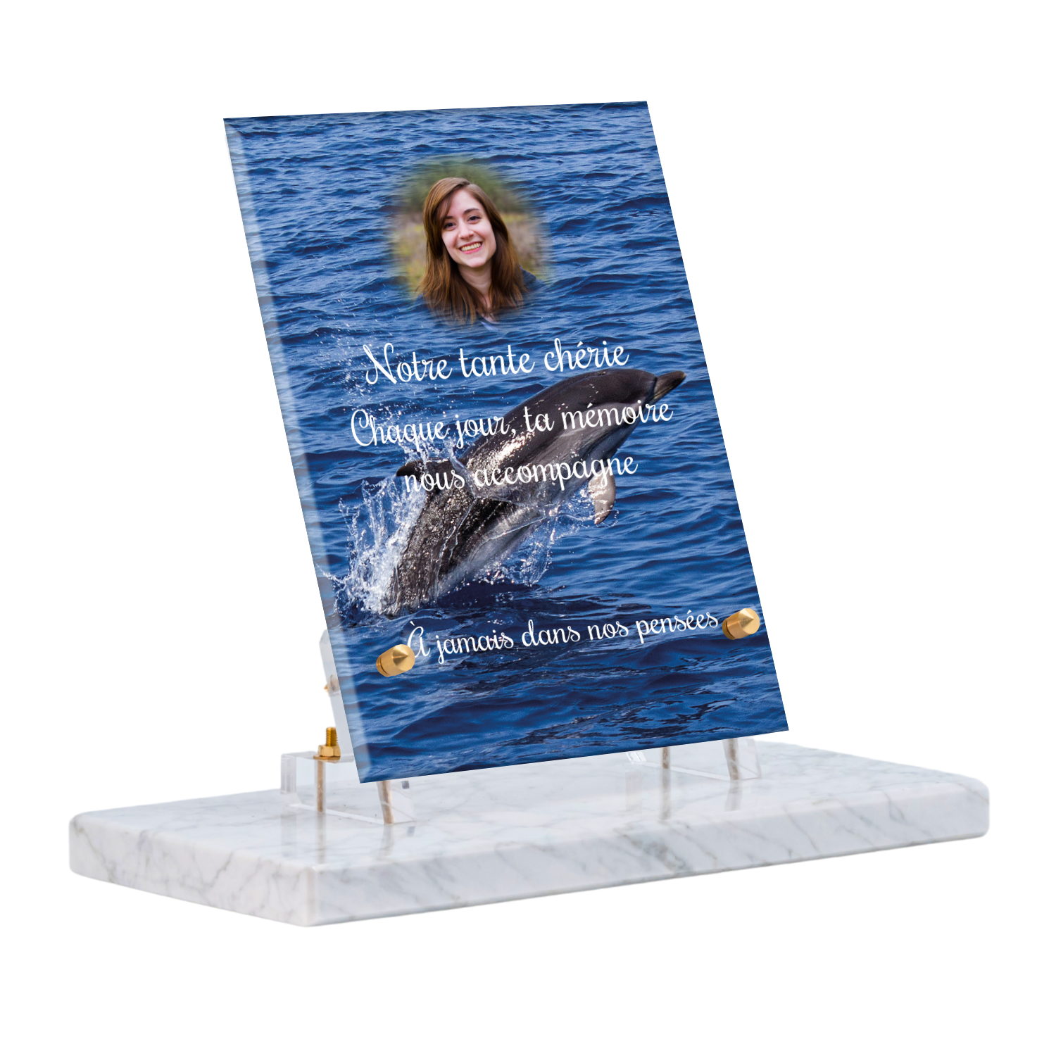 Offrez un hommage unique avec cette plaque funéraire personnalisée représentant un océan apaisant et un dauphin, symbole de liberté et de sérénité. Conçue en plexiglas, cette plaque funéraire moderne allie élégance et résistance, idéale pour célébrer la mémoire de vos proches avec délicatesse. Chaque plaque mortuaire est réalisée sur mesure, vous permettant de choisir les détails qui reflètent au mieux la personnalité du défunt. Sa durabilité approuvée garantit une conservation longue durée, pour un souvenir précieux qui traverse le temps.