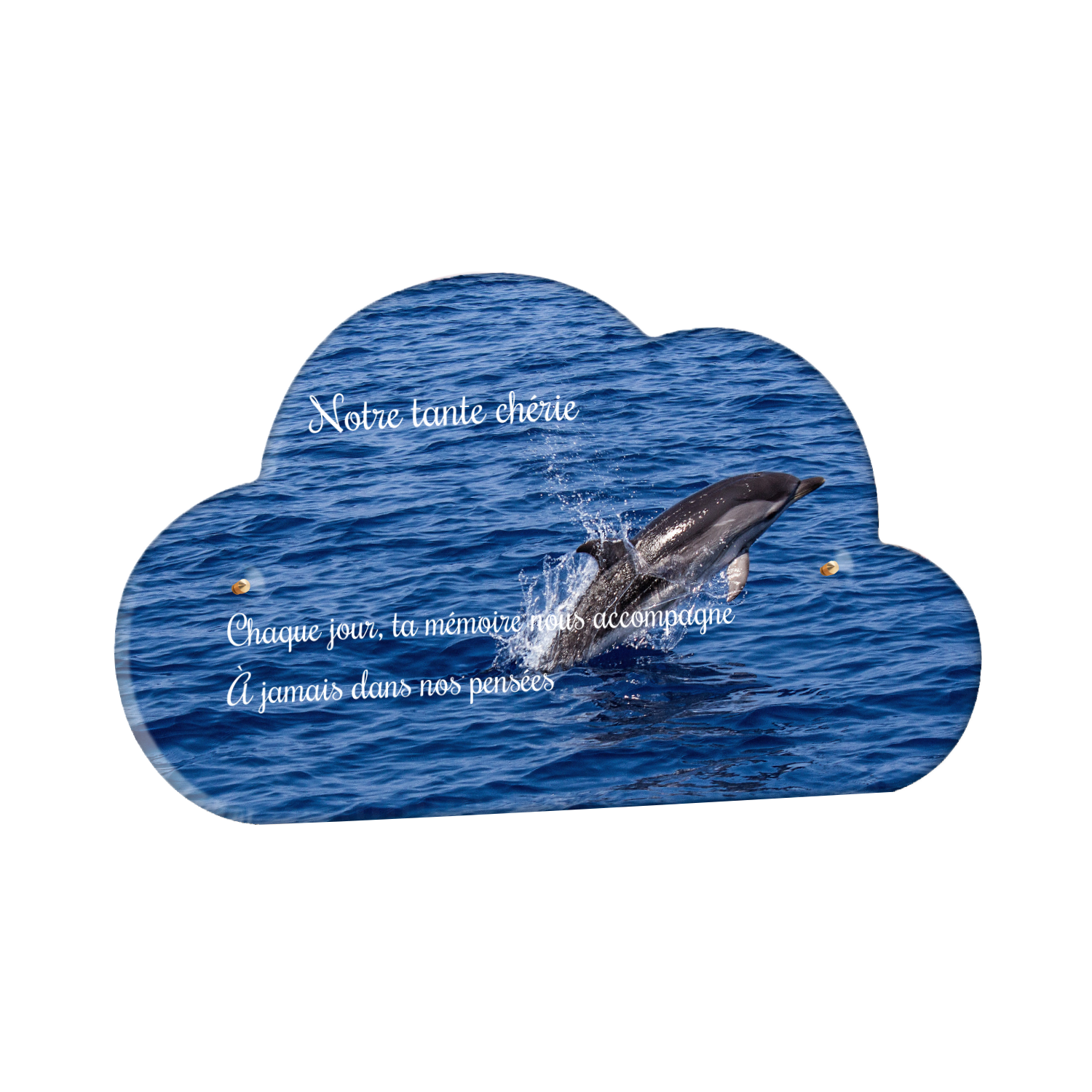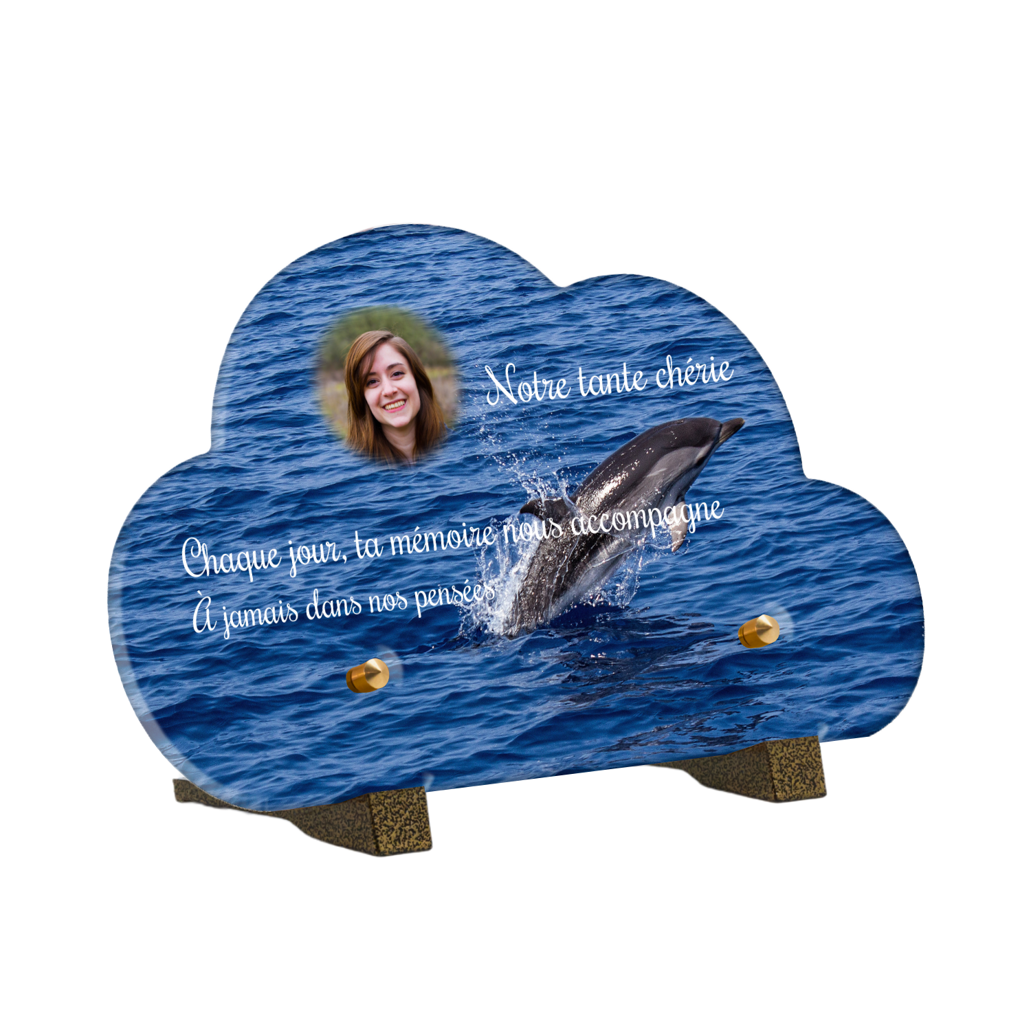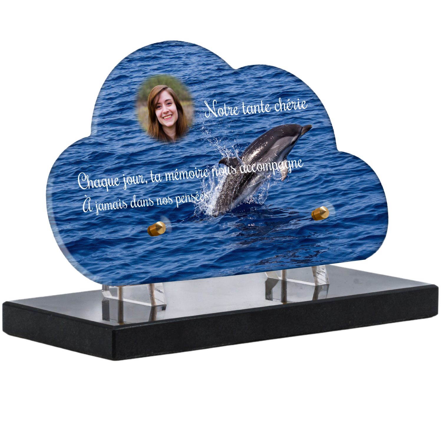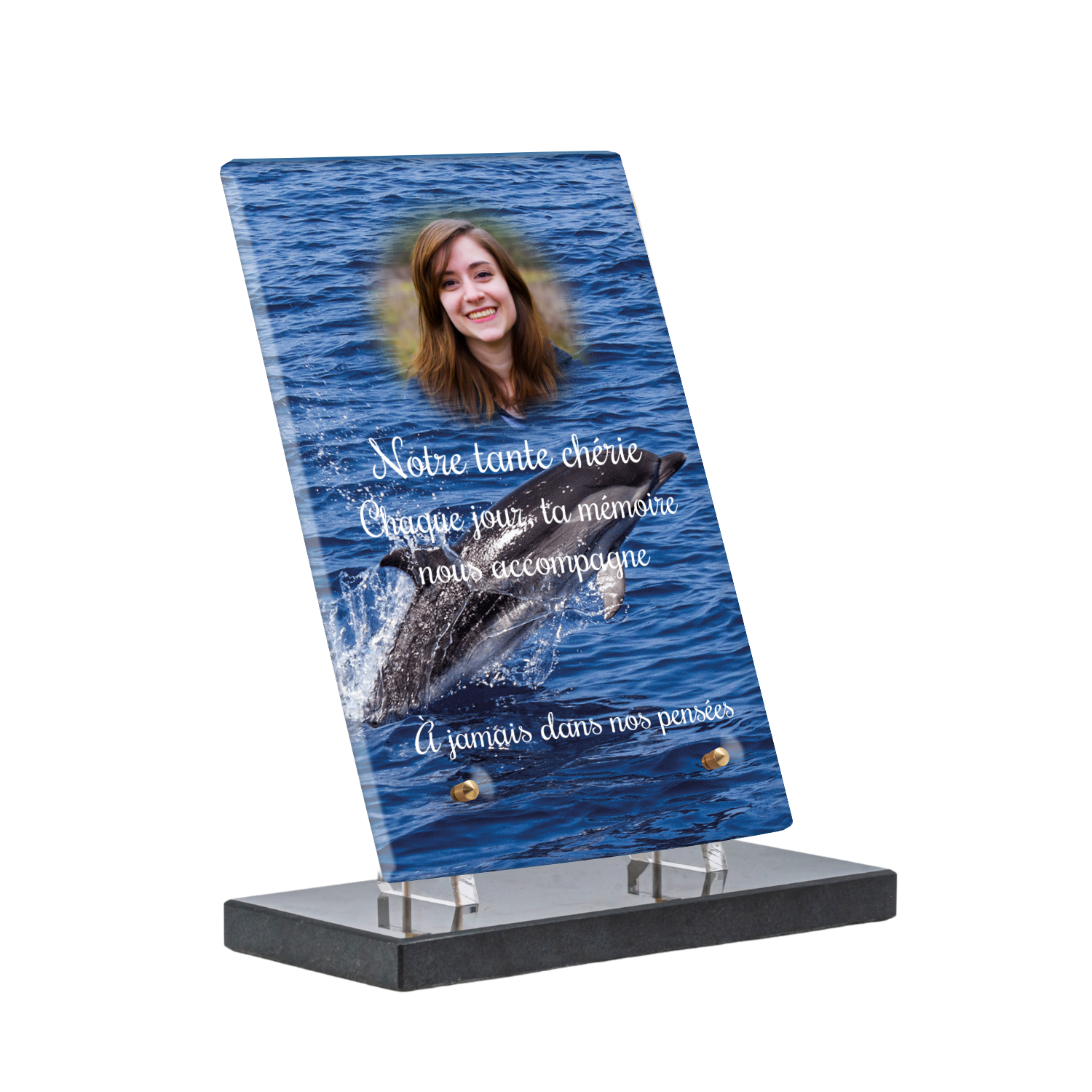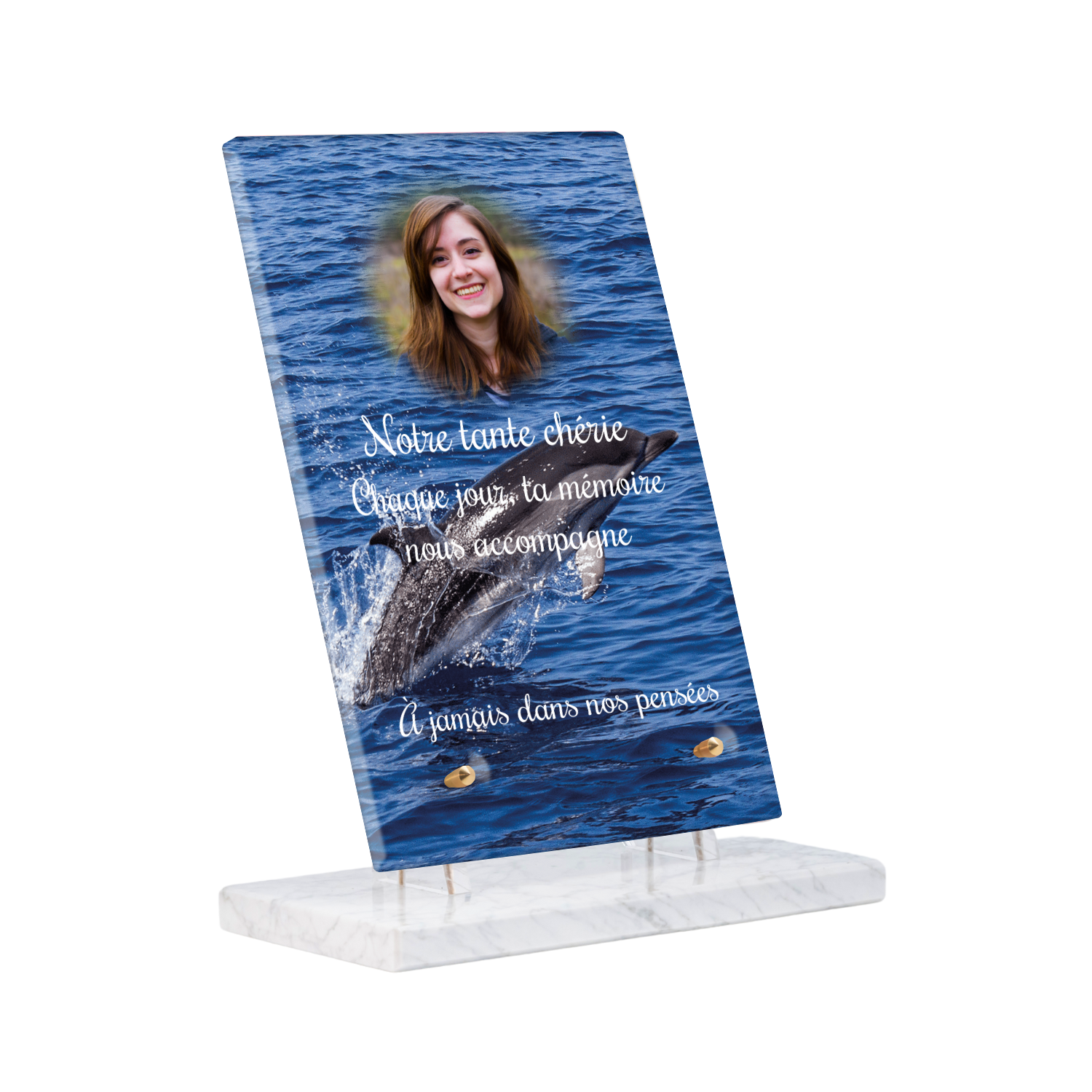 Offrez un hommage unique avec cette plaque funéraire personnalisée représentant un océan apaisant et un dauphin, symbole de liberté et de sérénité. Conçue en plexiglas, cette plaque funéraire moderne allie élégance et résistance, idéale pour célébrer la mémoire de vos proches avec délicatesse. Chaque plaque mortuaire est réalisée sur mesure, vous permettant de choisir les détails qui reflètent au mieux la personnalité du défunt. Sa durabilité approuvée garantit une conservation longue durée, pour un souvenir précieux qui traverse le temps.