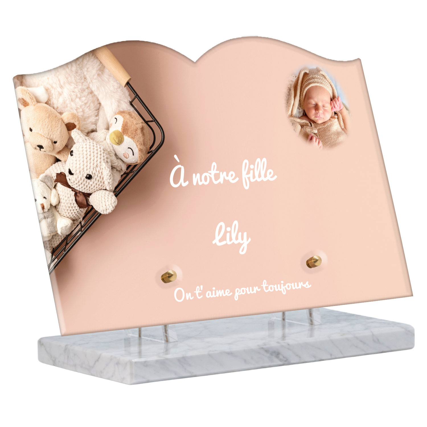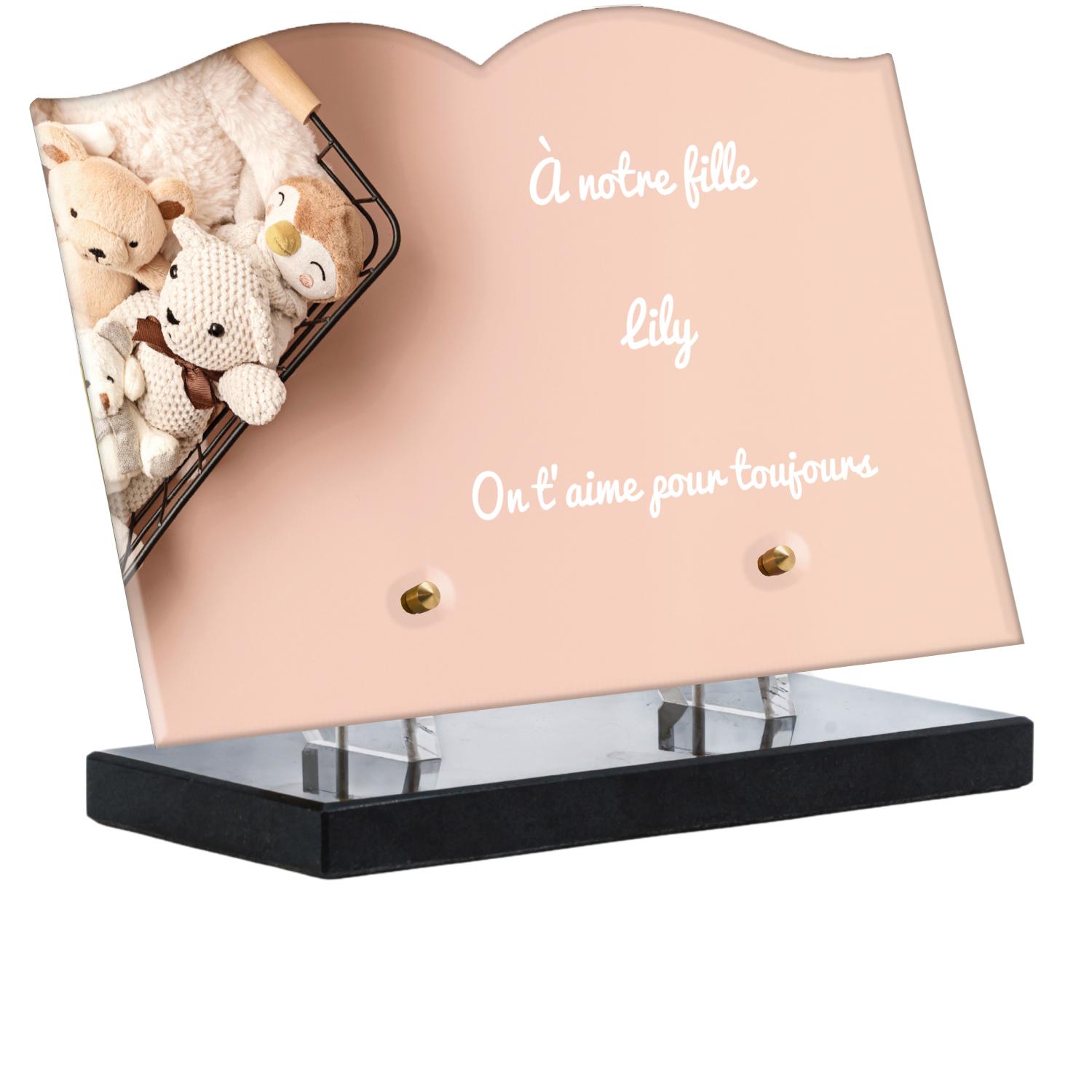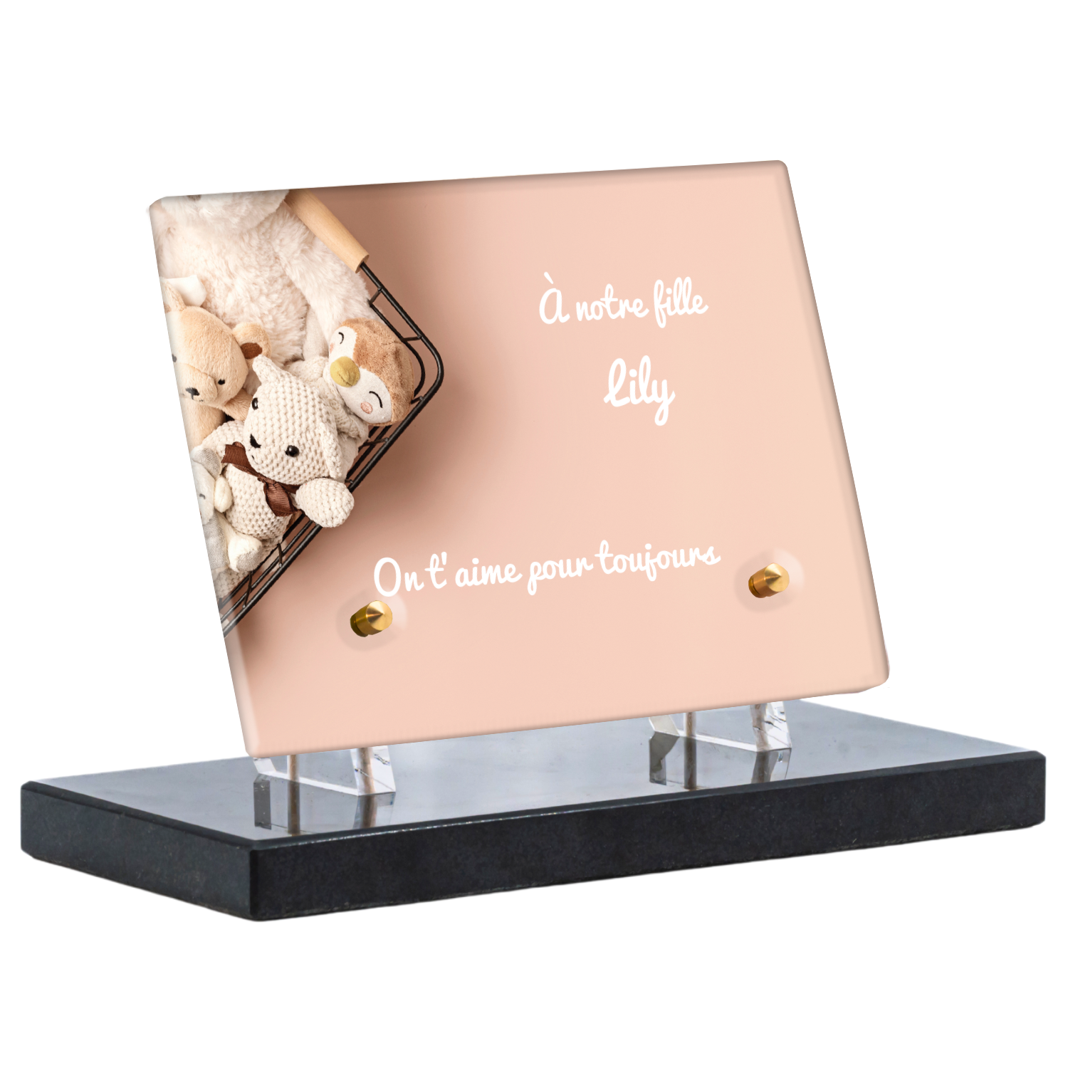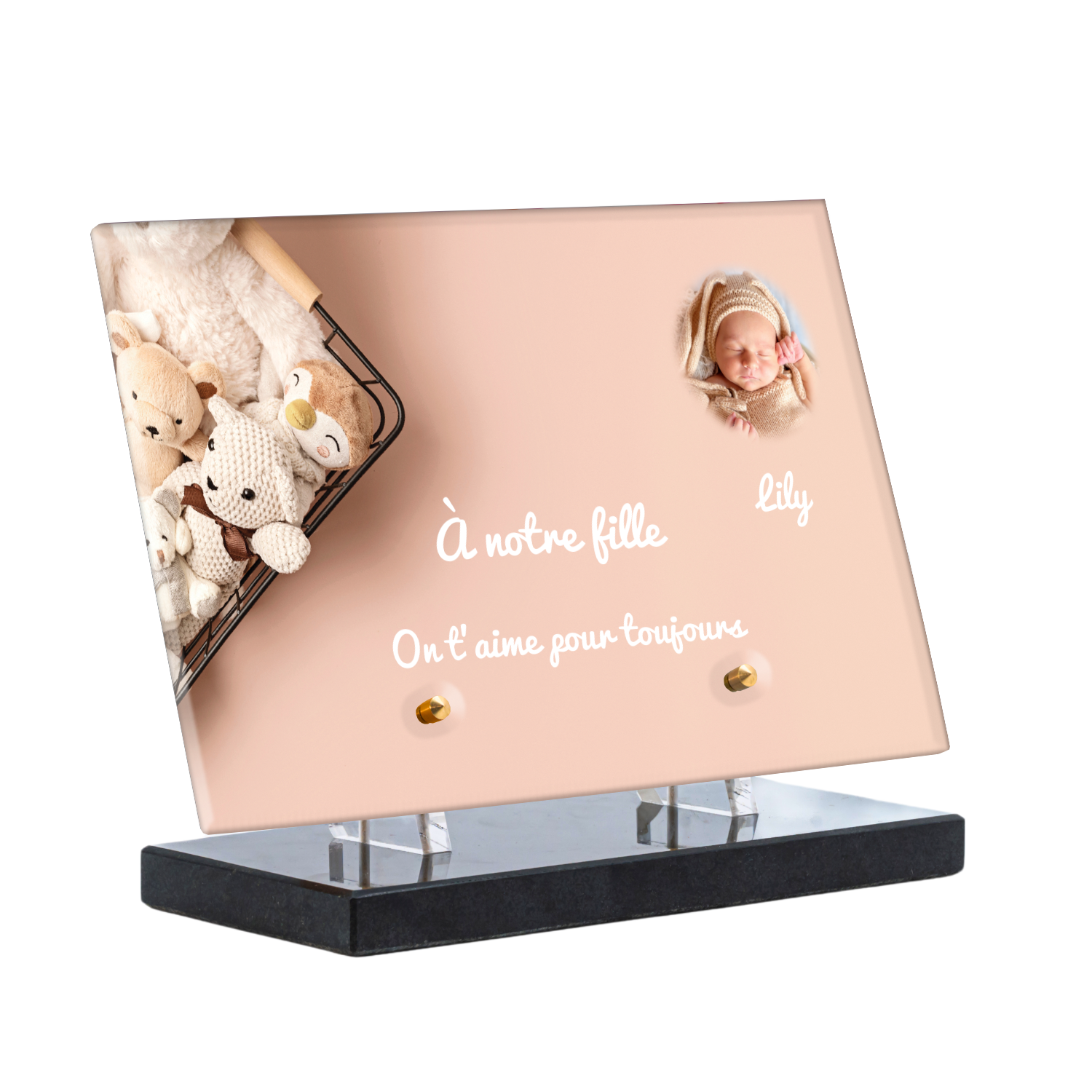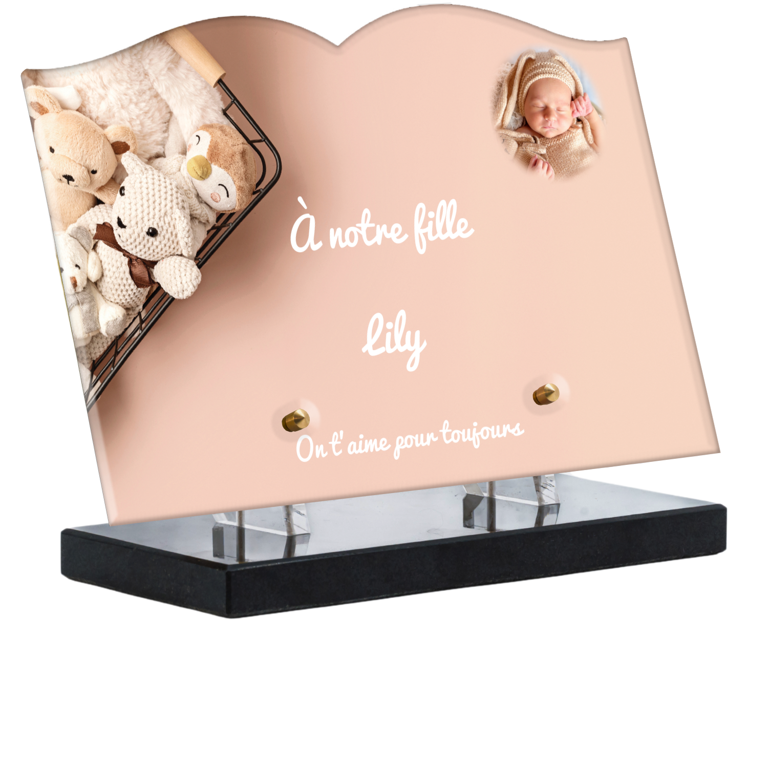 Offrez un hommage tendre et unique avec cette plaque funéraire personnalisée représentant un panier rempli de doudous. Conçue en plexiglas, cette plaque mortuaire moderne allie délicatesse et élégance pour célébrer la mémoire d’un être cher avec douceur et respect. Son design soigné apporte une touche chaleureuse et apaisante au lieu de repos.