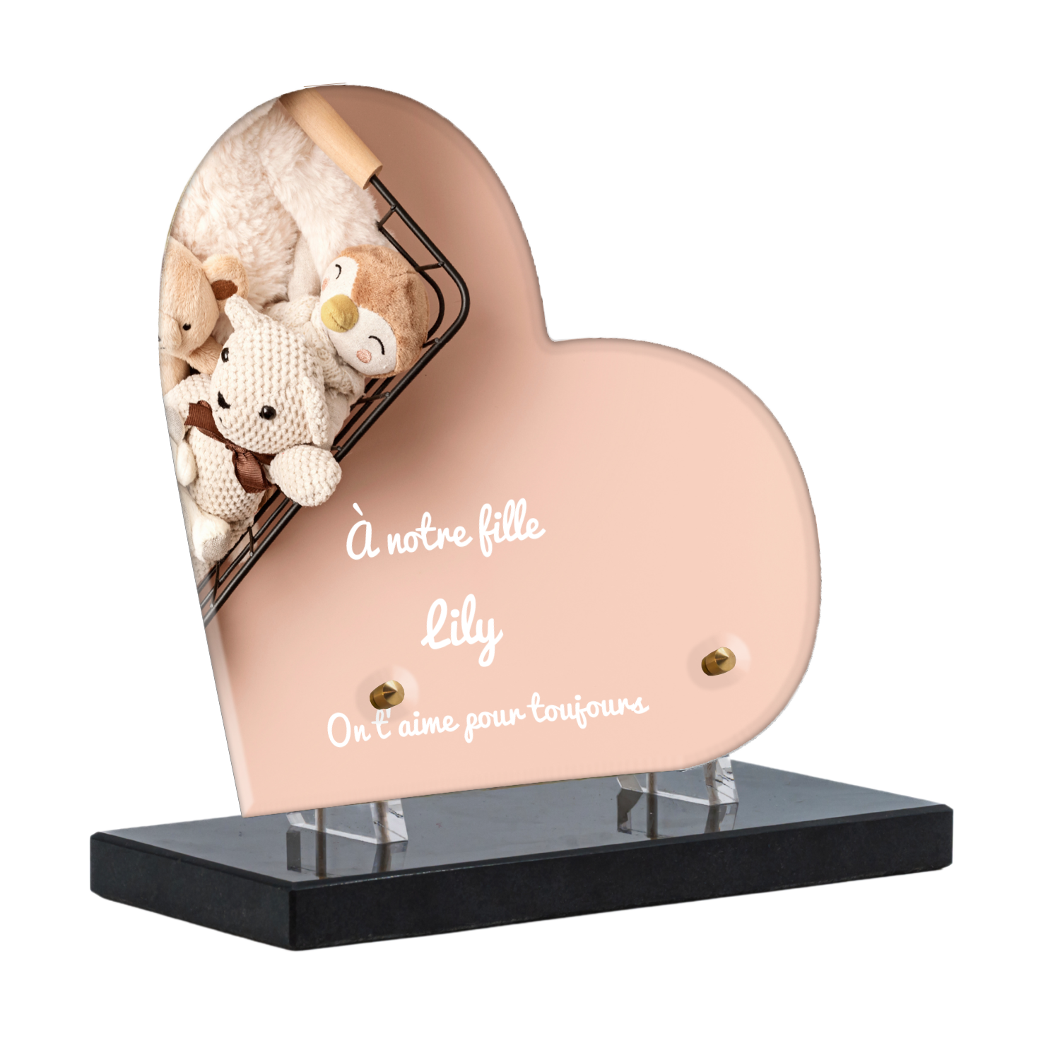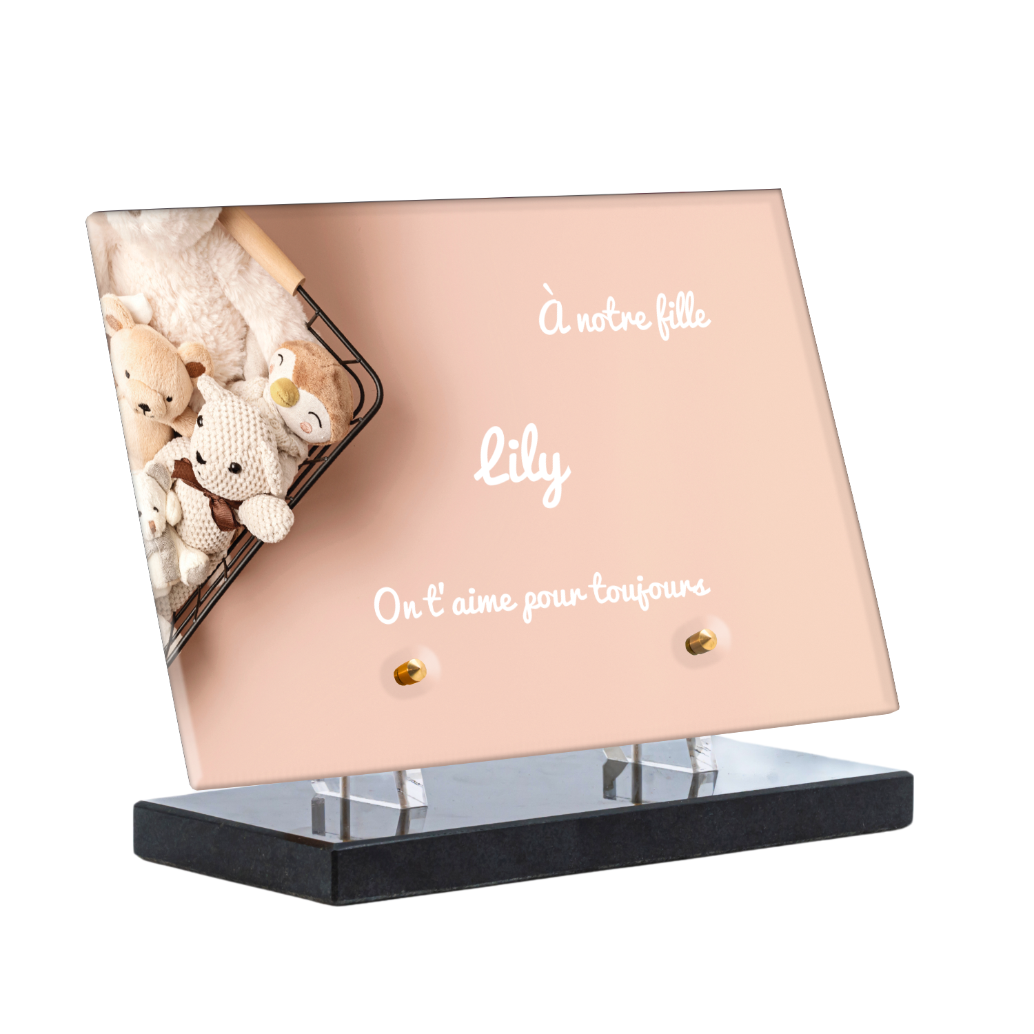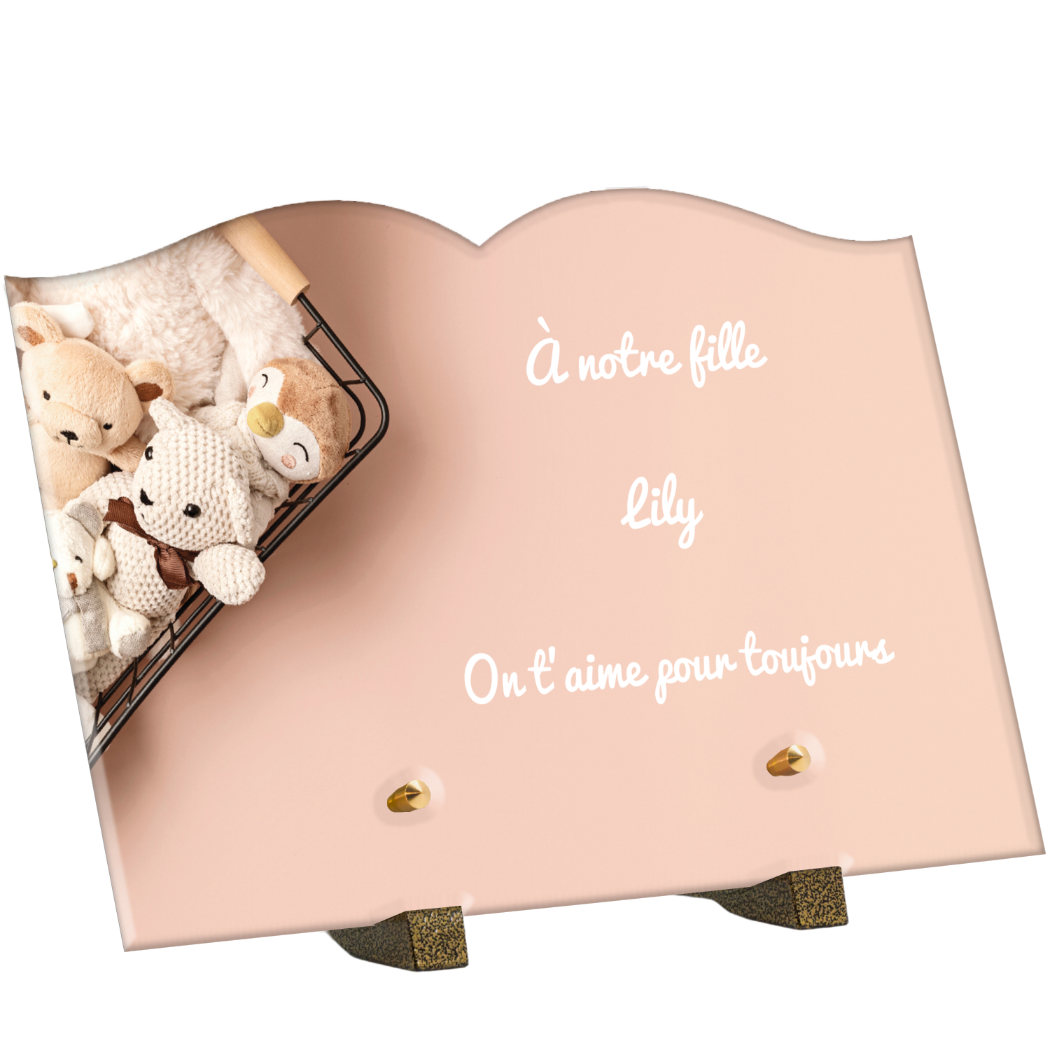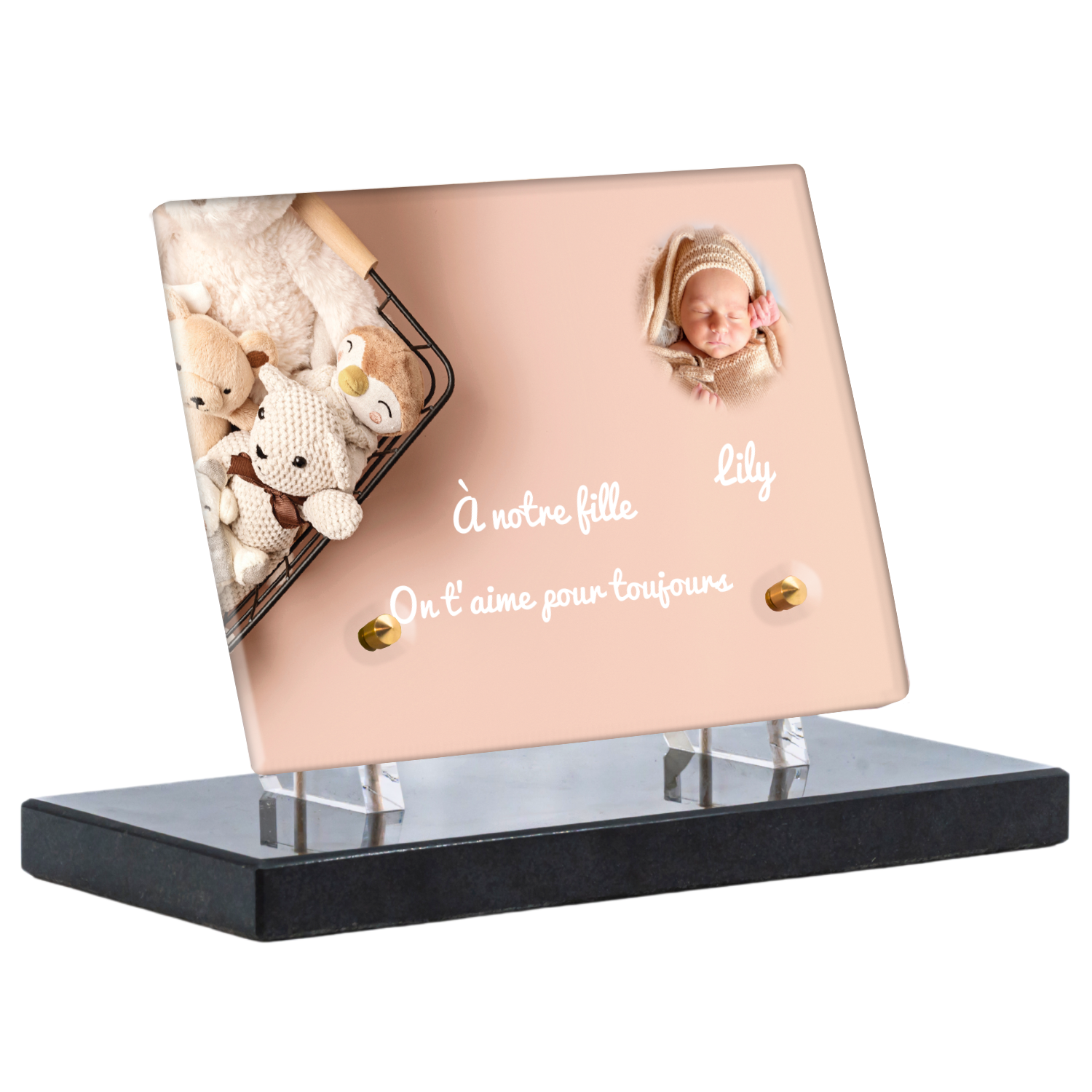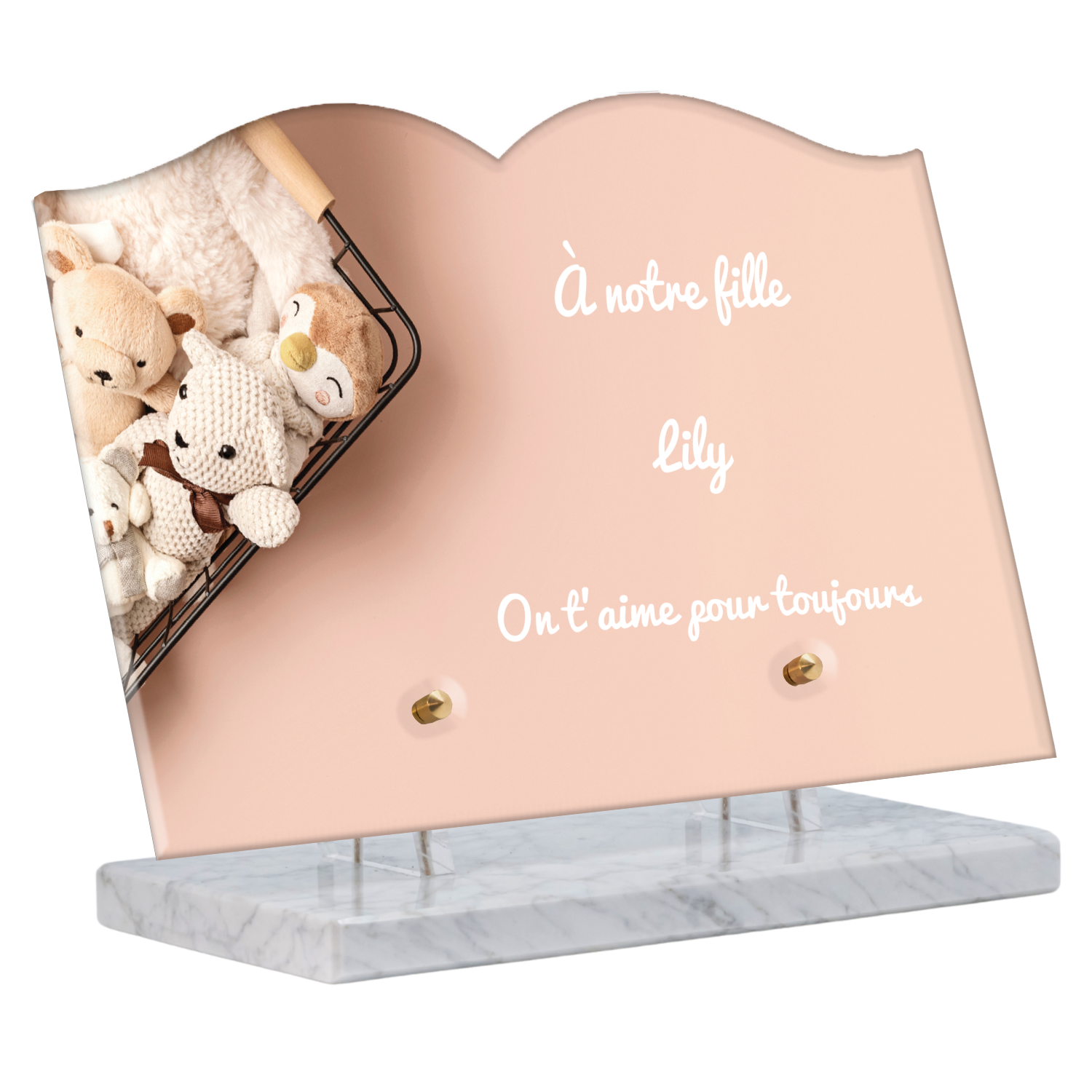 Offrez un hommage tendre et unique avec cette plaque funéraire personnalisée représentant un panier rempli de doudous. Conçue en plexiglas, cette plaque mortuaire moderne allie délicatesse et élégance pour célébrer la mémoire d’un être cher avec douceur et respect. Son design soigné apporte une touche chaleureuse et apaisante au lieu de repos.