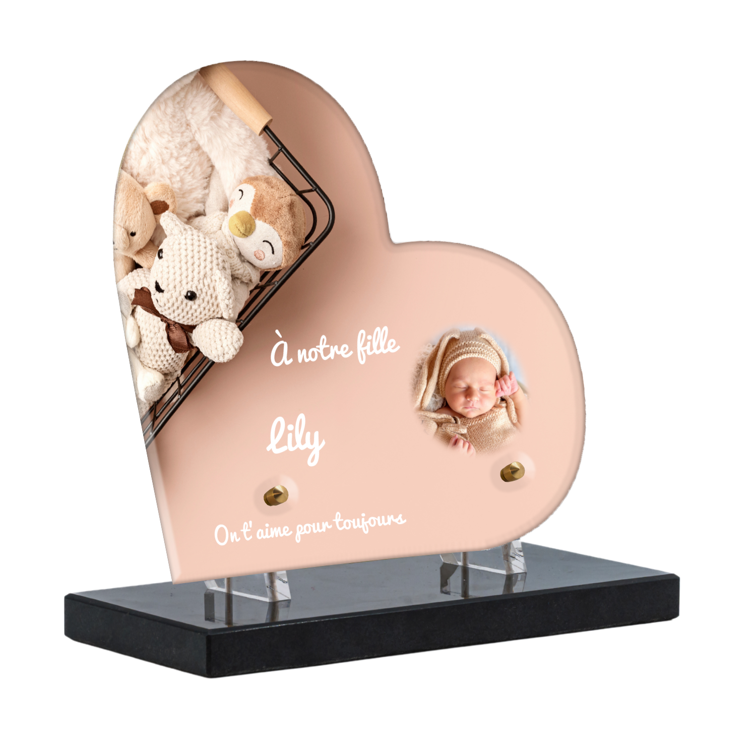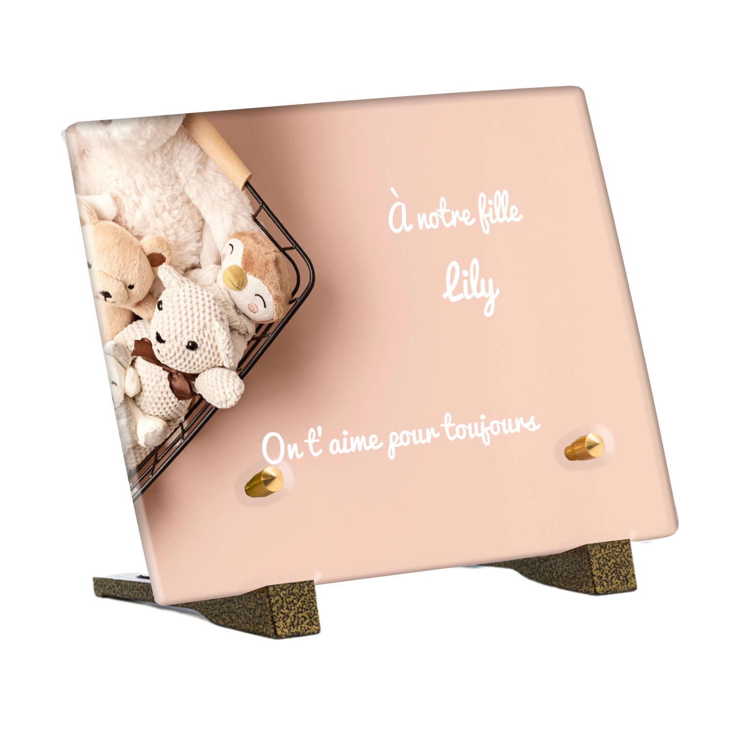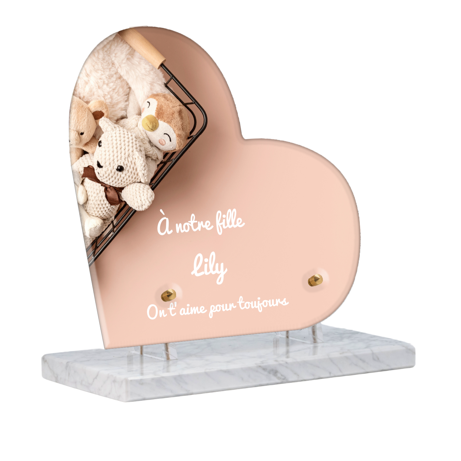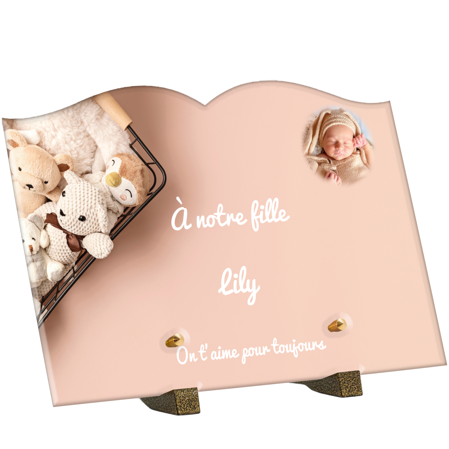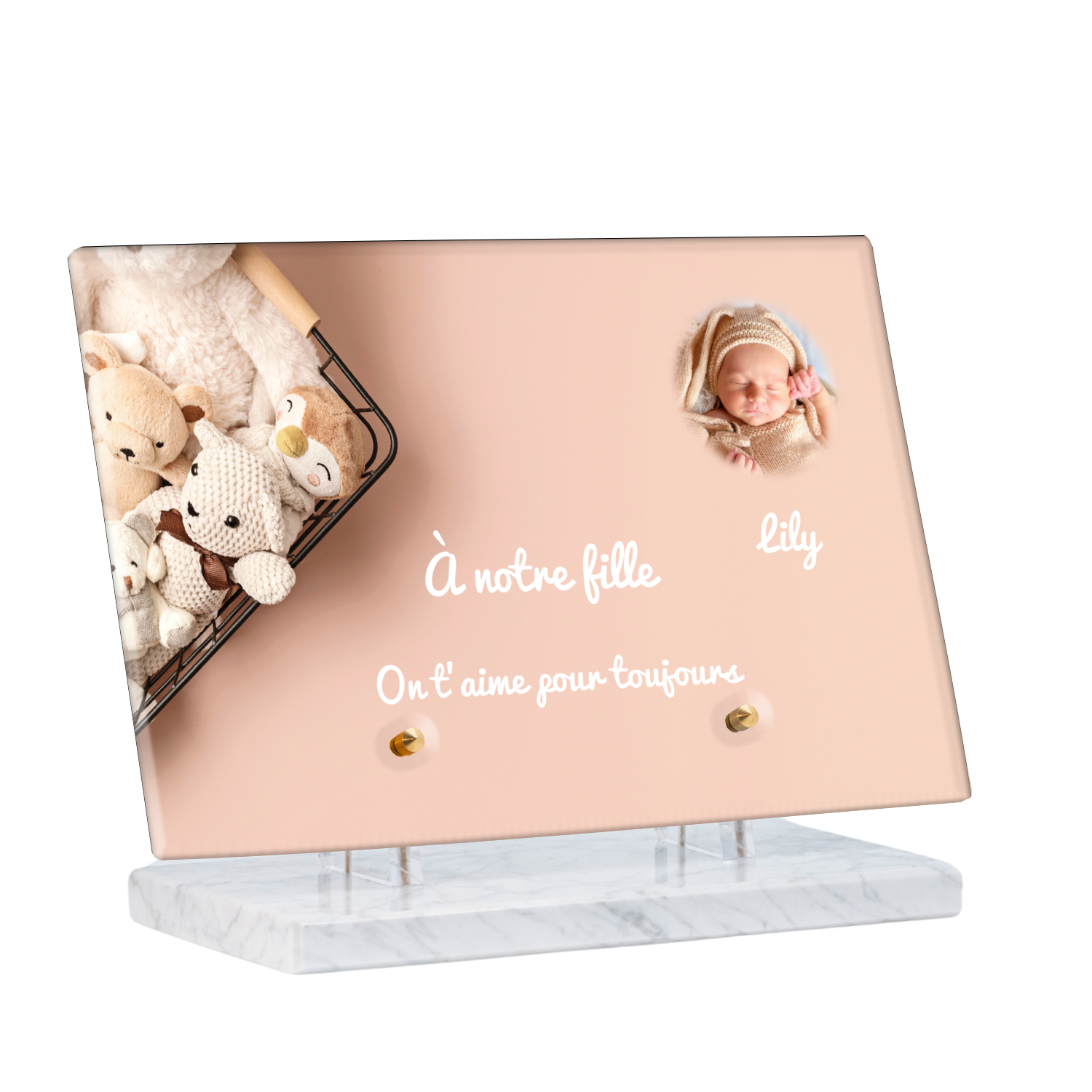 Offrez un hommage tendre et unique avec cette plaque funéraire personnalisée représentant un panier rempli de doudous. Conçue en plexiglas, cette plaque mortuaire moderne allie délicatesse et élégance pour célébrer la mémoire d’un être cher avec douceur et respect. Son design soigné apporte une touche chaleureuse et apaisante au lieu de repos.