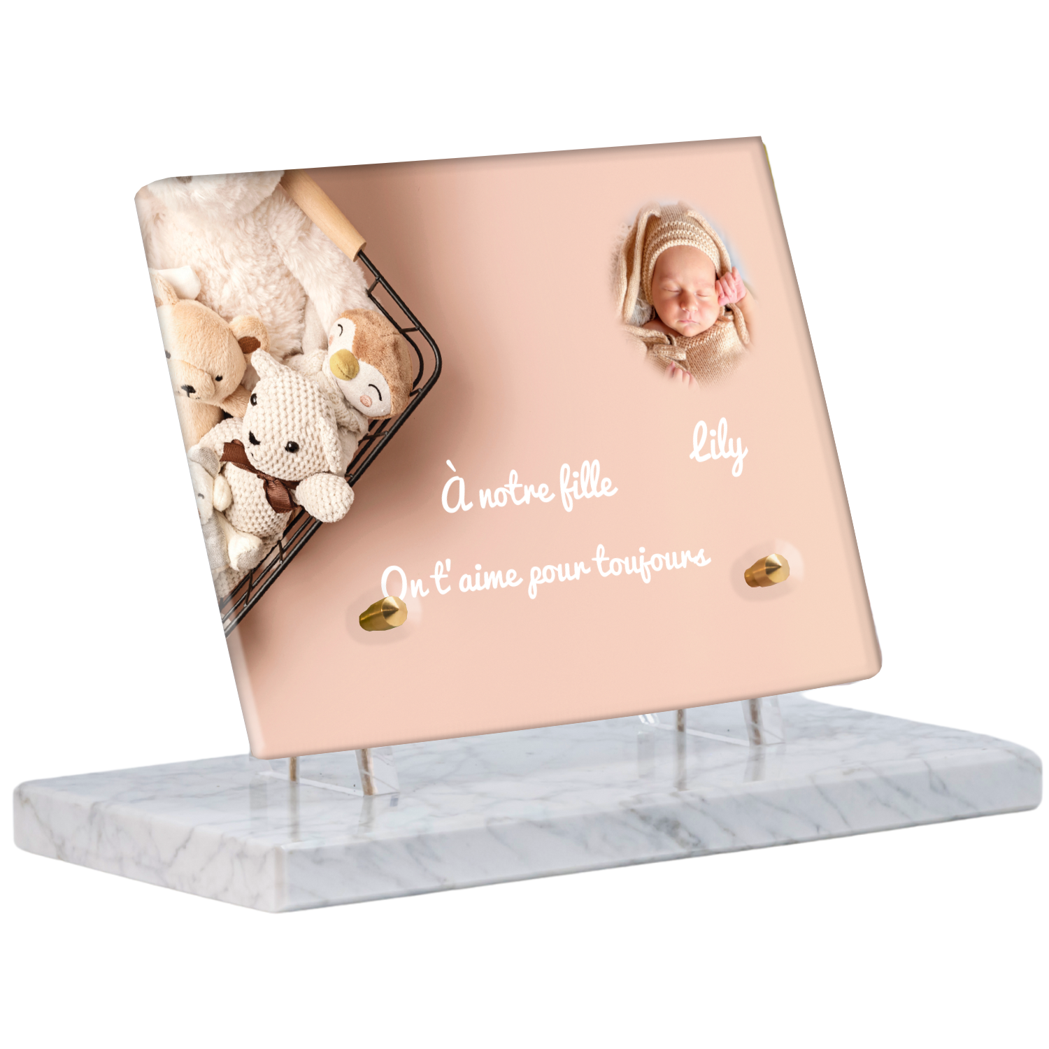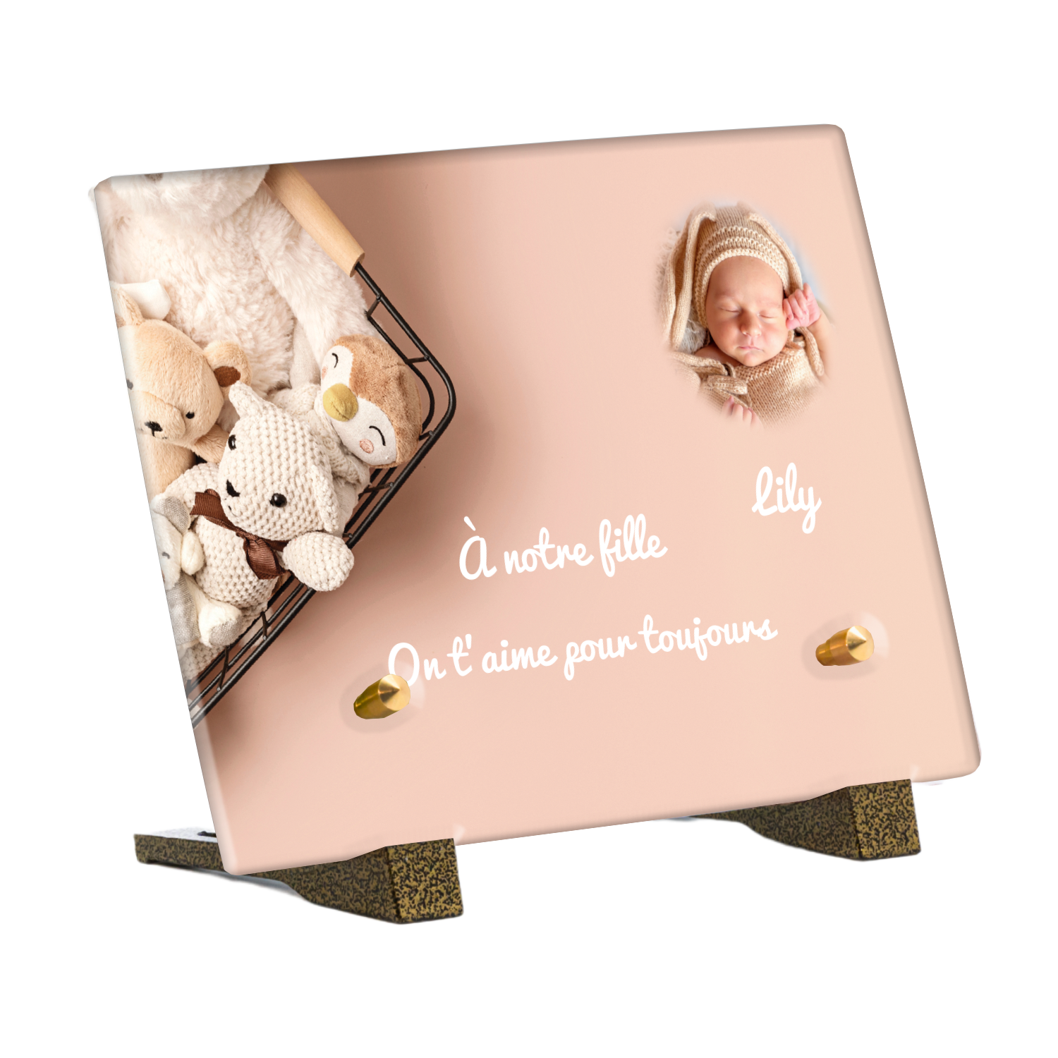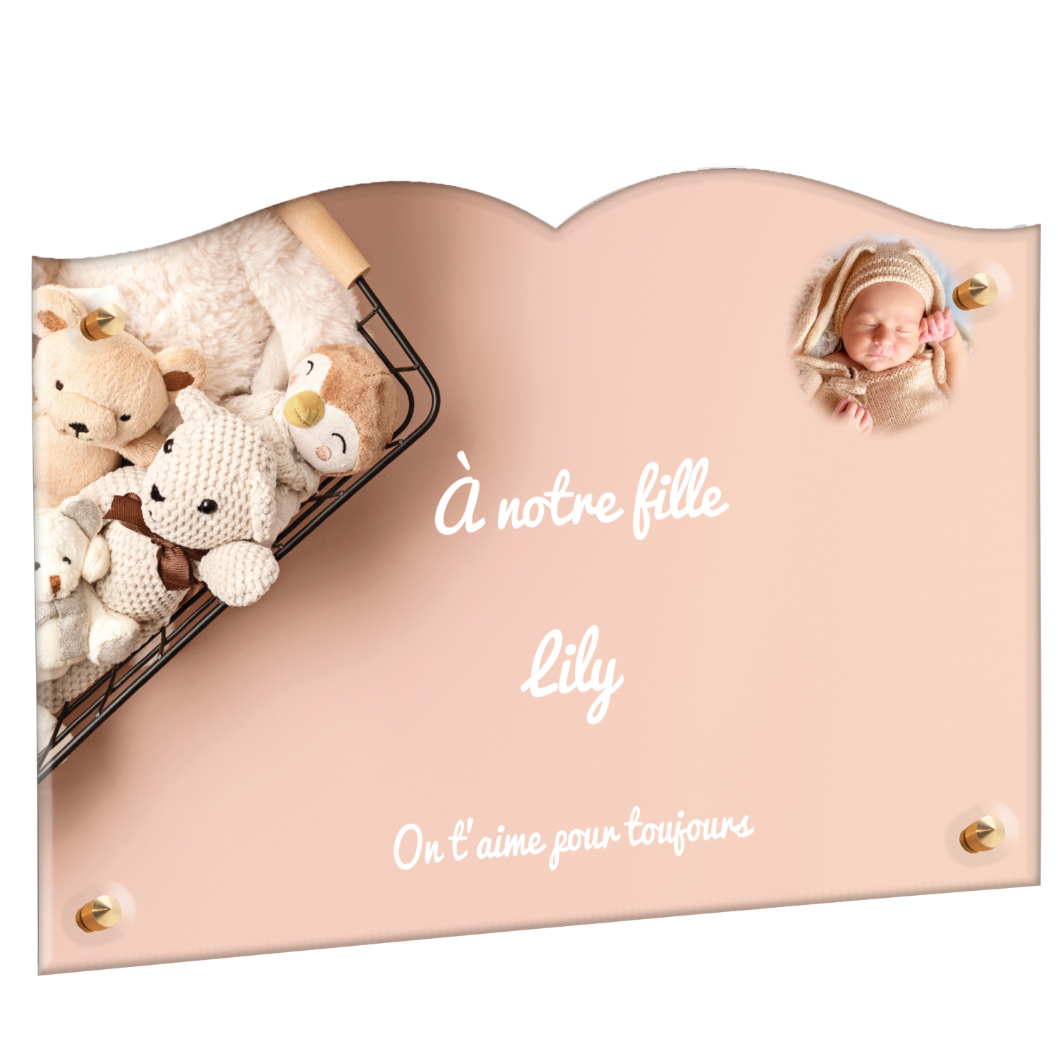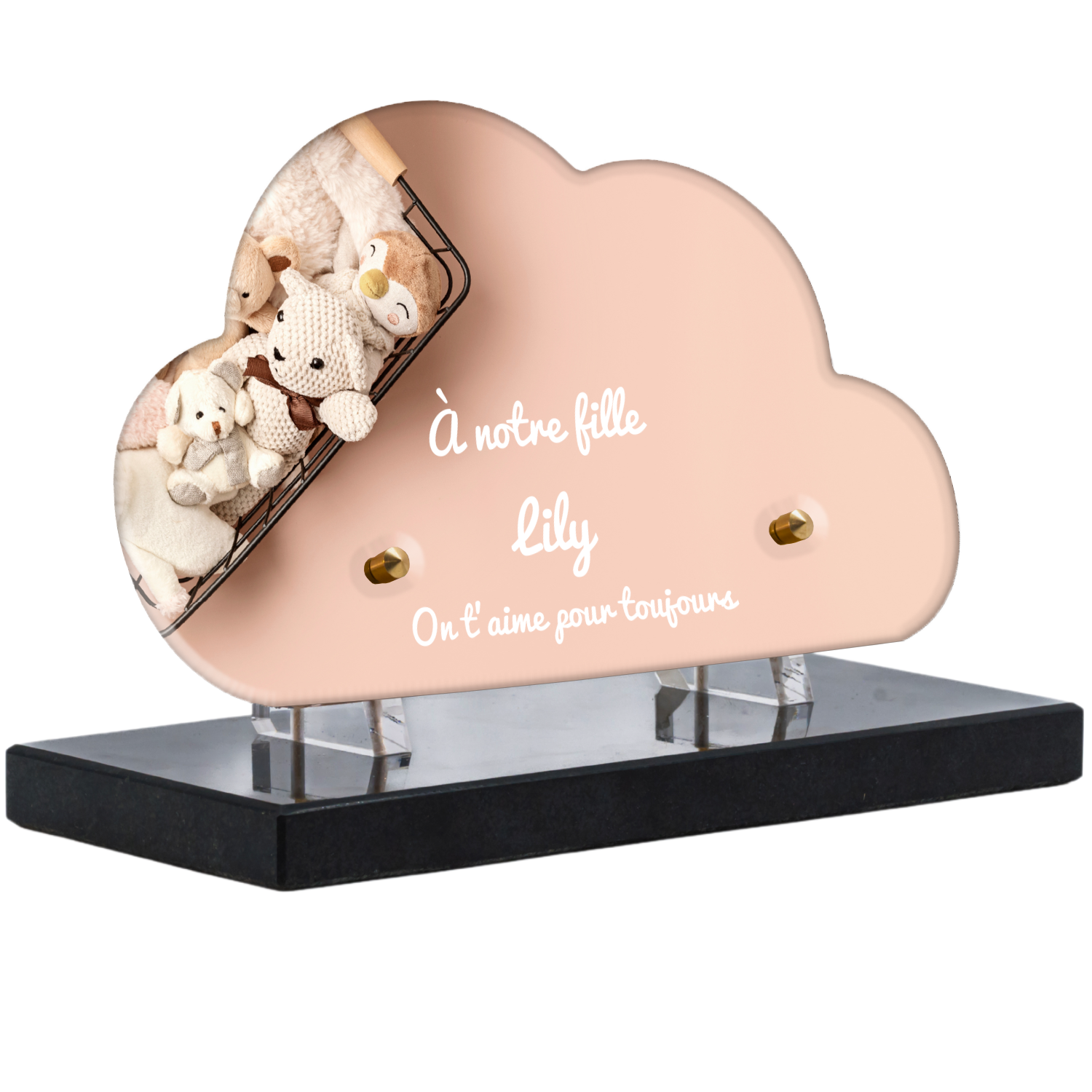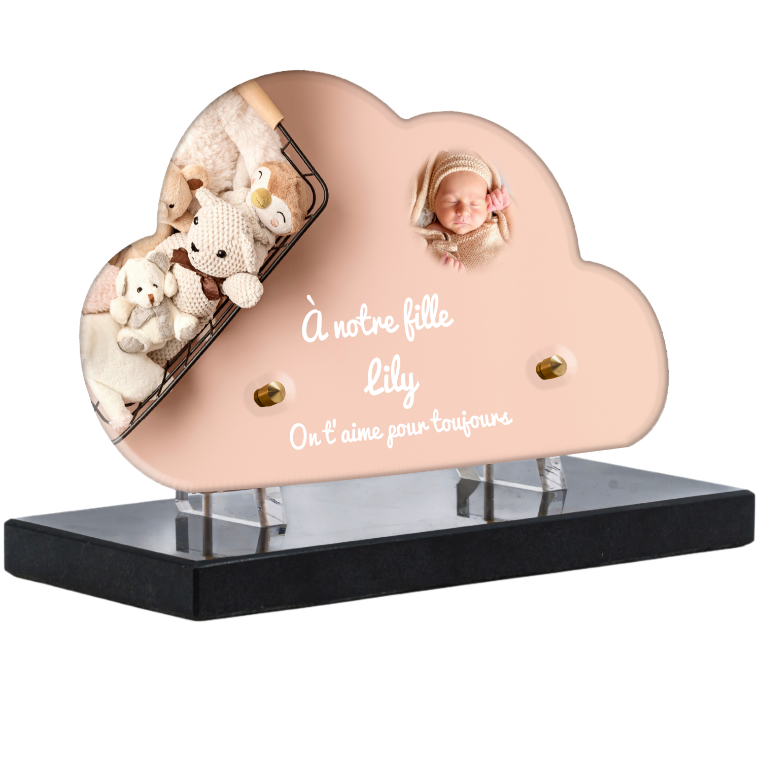 Offrez un hommage tendre et unique avec cette plaque funéraire personnalisée représentant un panier rempli de doudous. Conçue en plexiglas, cette plaque mortuaire moderne allie délicatesse et élégance pour célébrer la mémoire d’un être cher avec douceur et respect. Son design soigné apporte une touche chaleureuse et apaisante au lieu de repos.