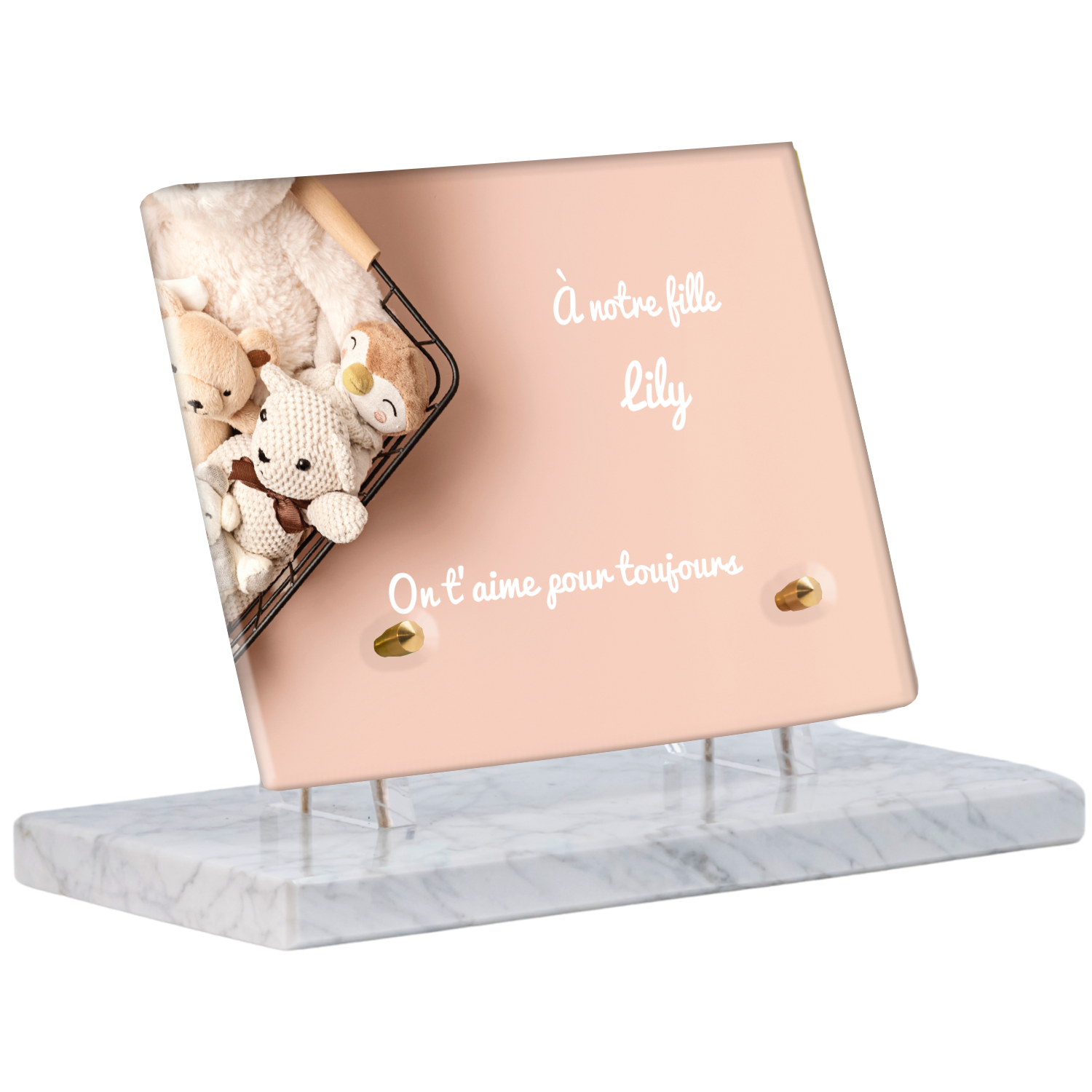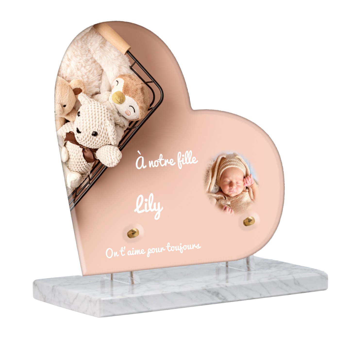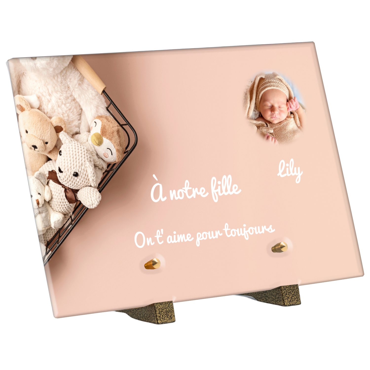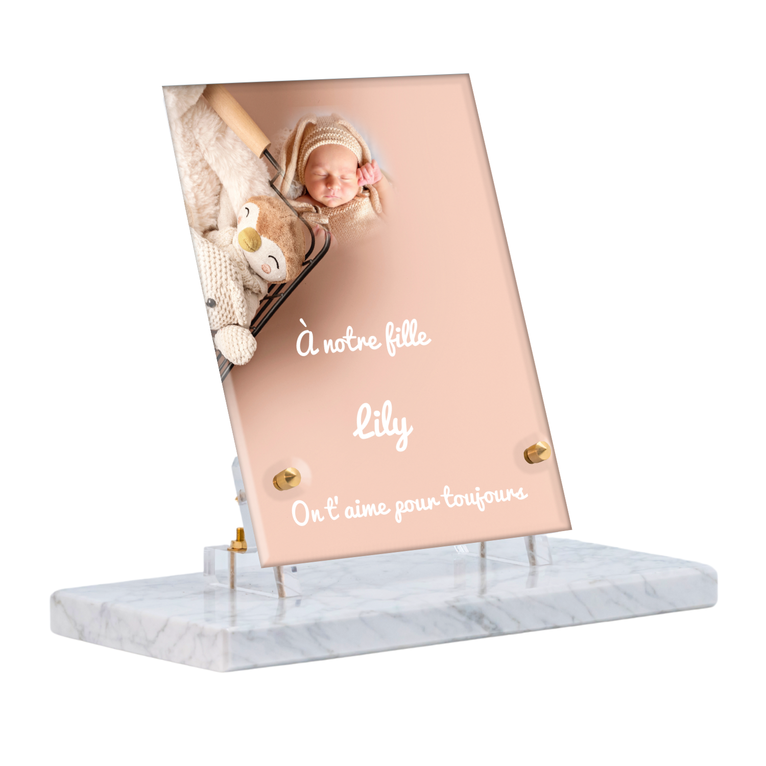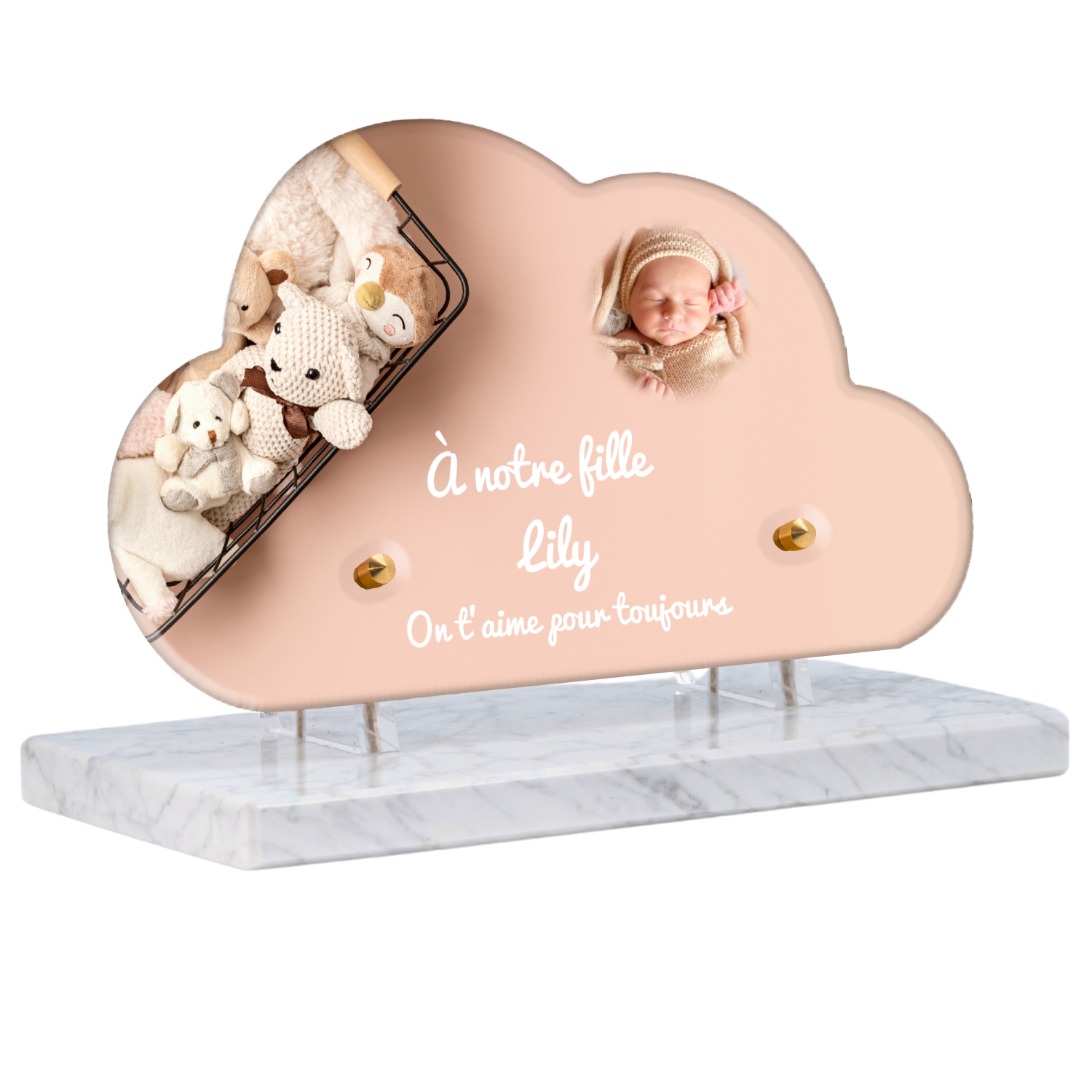 Offrez un hommage tendre et unique avec cette plaque funéraire personnalisée représentant un panier rempli de doudous. Conçue en plexiglas, cette plaque mortuaire moderne allie délicatesse et élégance pour célébrer la mémoire d’un être cher avec douceur et respect. Son design soigné apporte une touche chaleureuse et apaisante au lieu de repos.