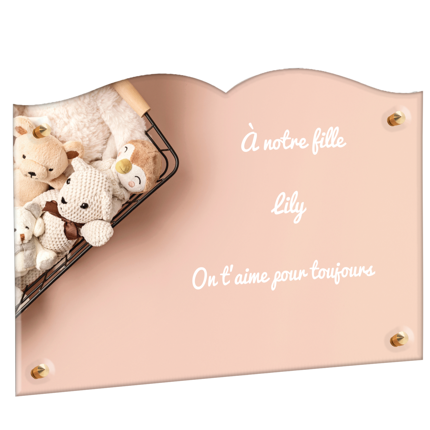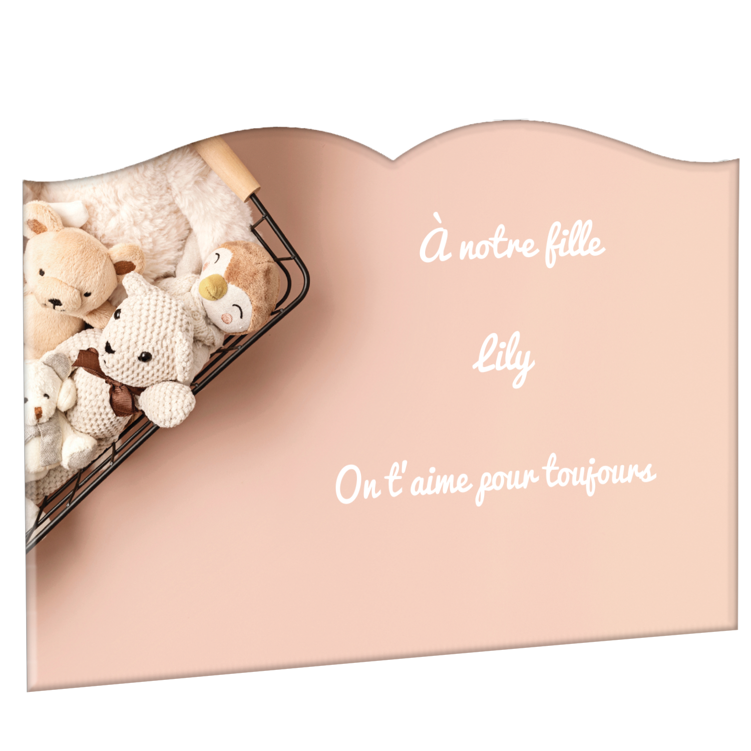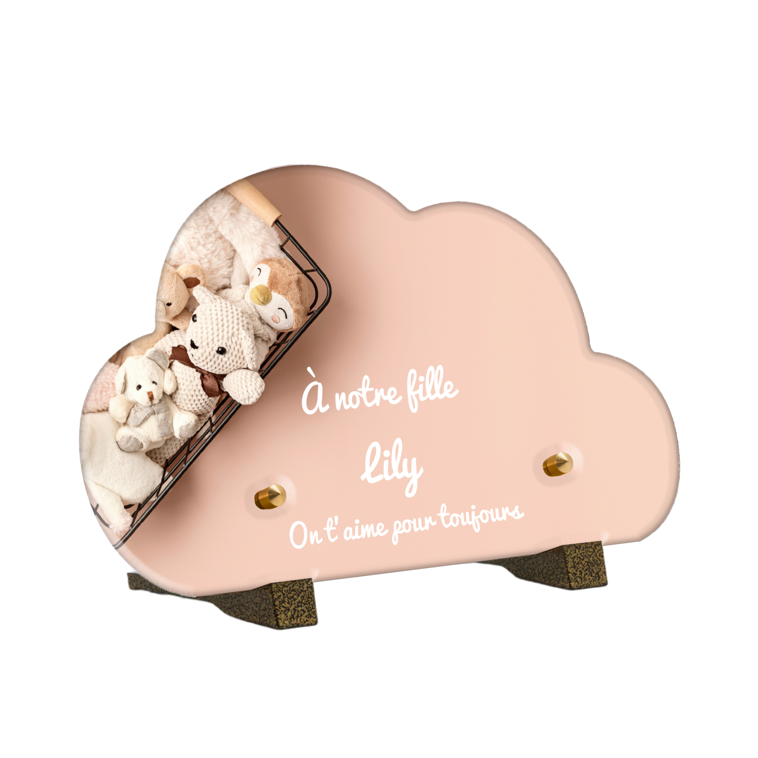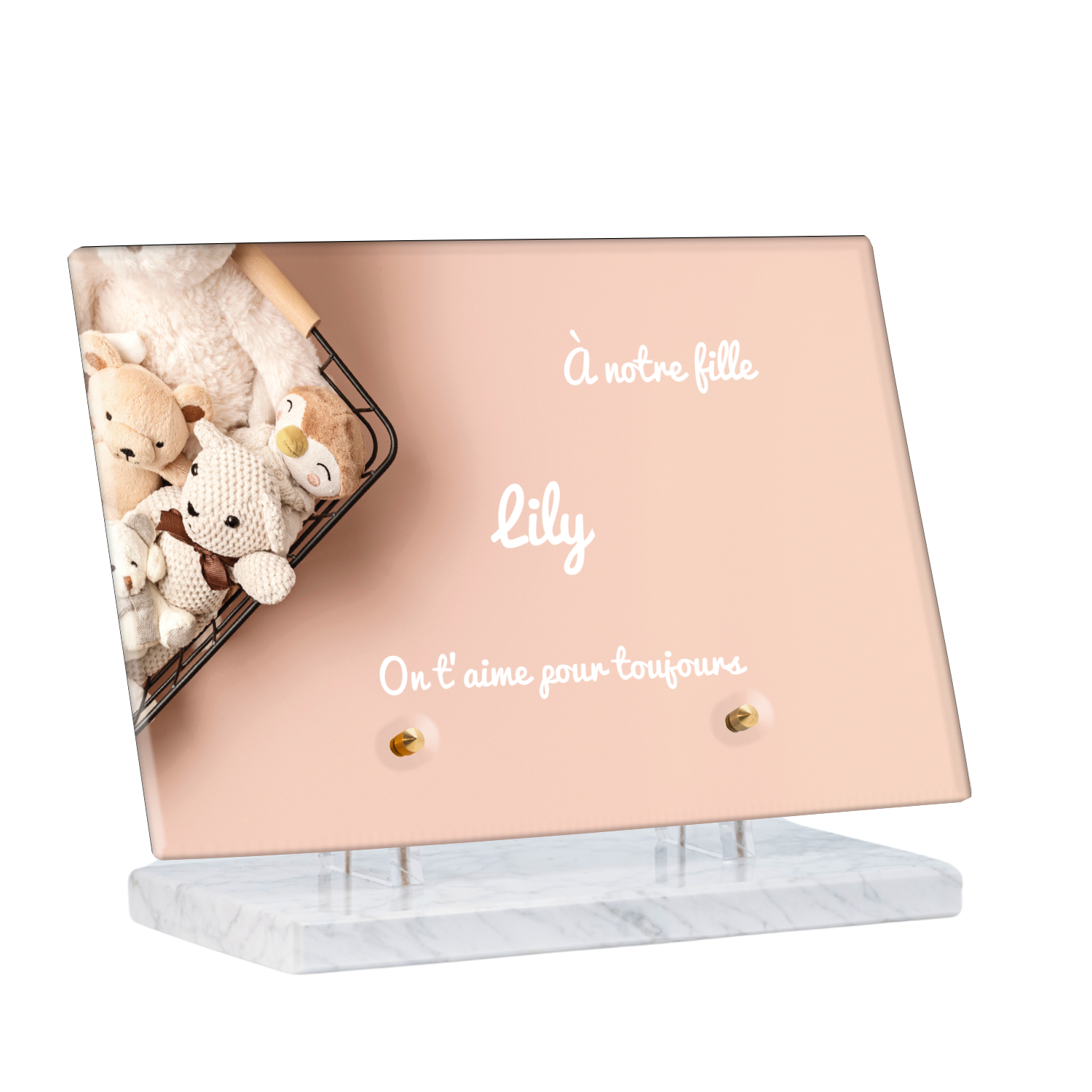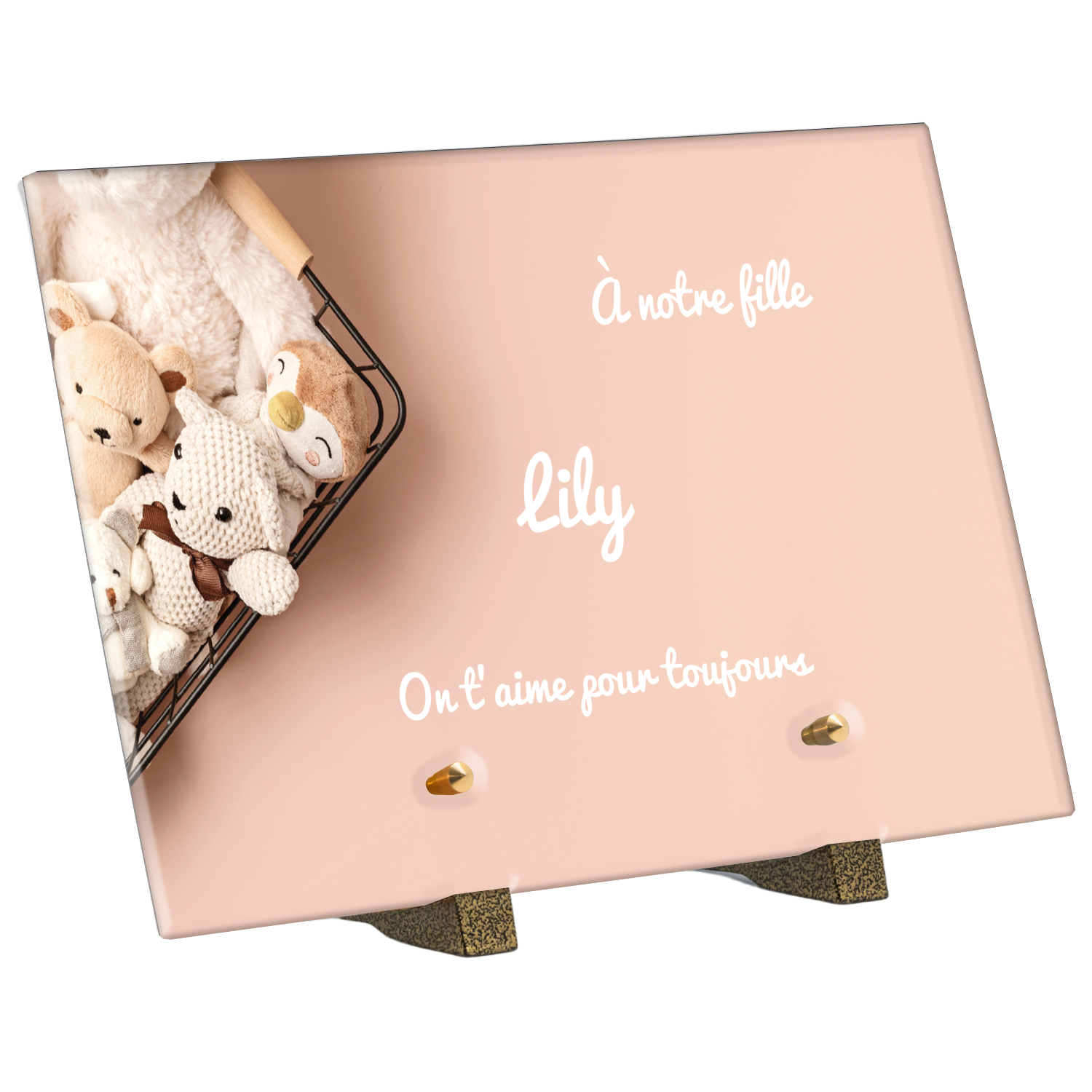 Offrez un hommage tendre et unique avec cette plaque funéraire personnalisée représentant un panier rempli de doudous. Conçue en plexiglas, cette plaque mortuaire moderne allie délicatesse et élégance pour célébrer la mémoire d’un être cher avec douceur et respect. Son design soigné apporte une touche chaleureuse et apaisante au lieu de repos.