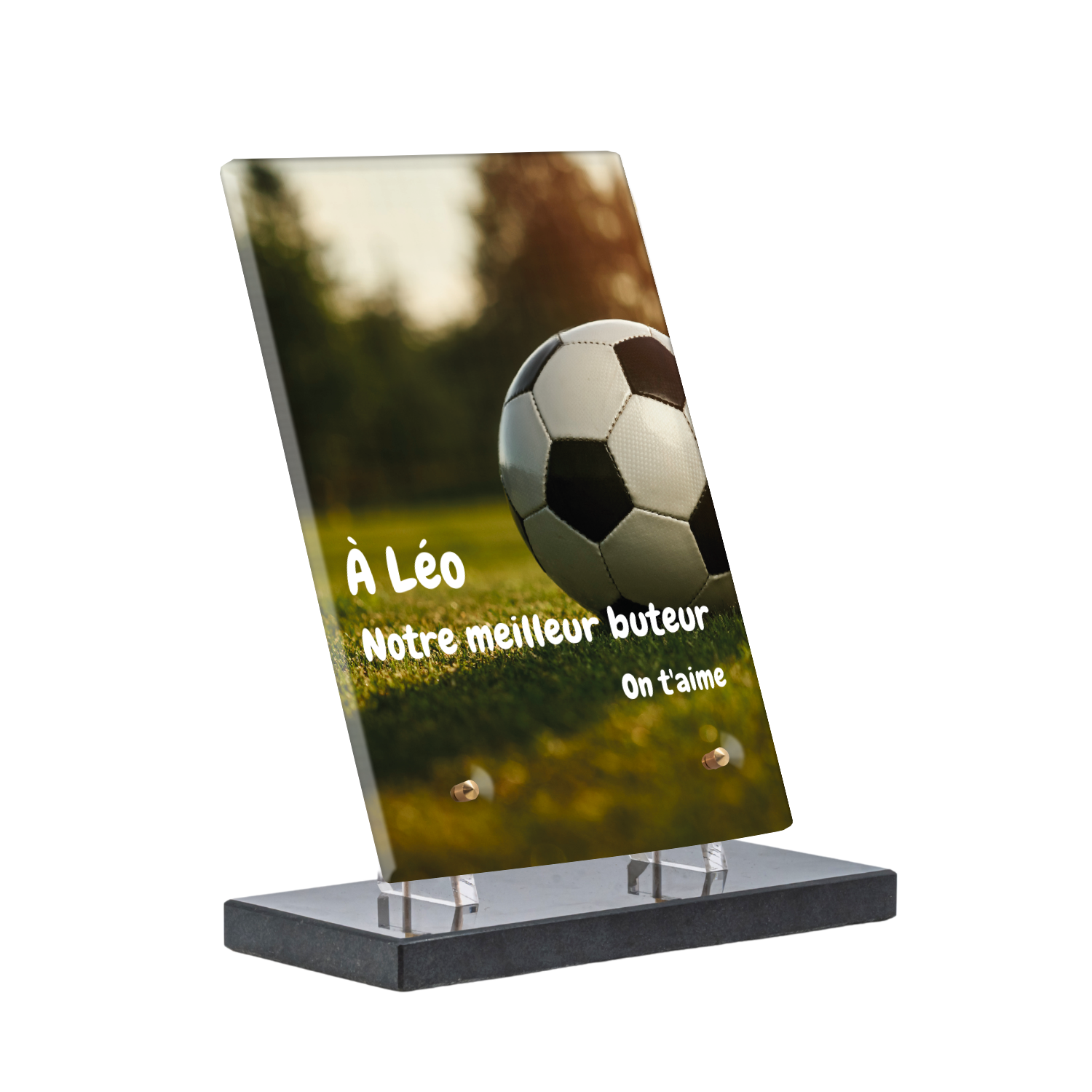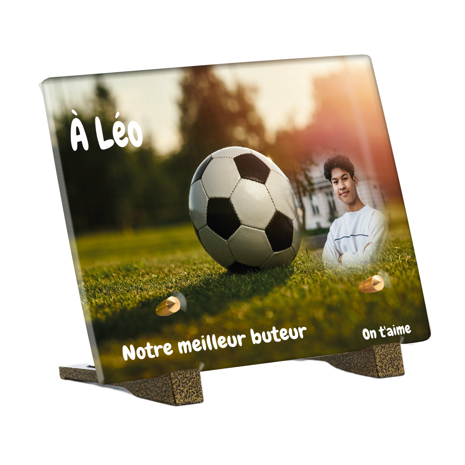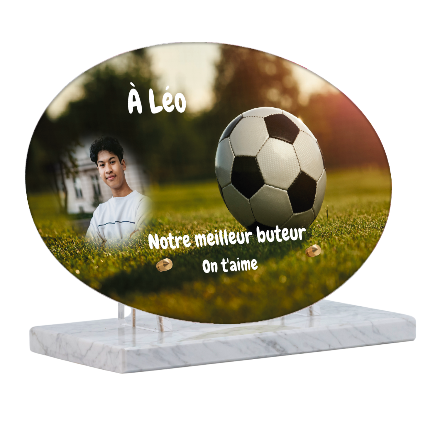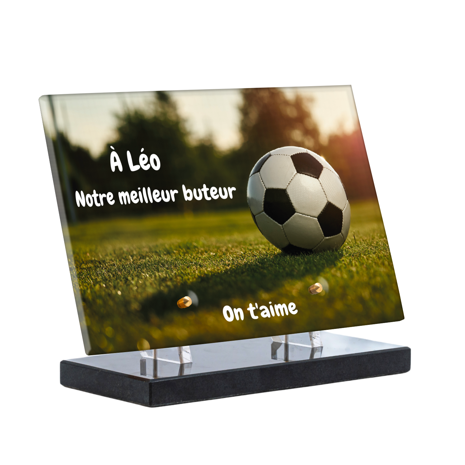 Offrez un hommage unique avec cette plaque funéraire personnalisée représentant un ballon de foot sur un terrain, idéale pour célébrer la passion du défunt. Cette plaque mortuaire allie design moderne et élégance, réalisée en plexiglas de haute qualité pour une finition soignée et résistante aux intempéries. Chaque plaque funéraire moderne est conçue sur mesure, vous permettant d’ajouter un texte personnalisé pour un souvenir véritablement unique. Sa durabilité approuvée garantit une longue conservation, assurant que la mémoire de votre proche reste intacte au fil du temps.