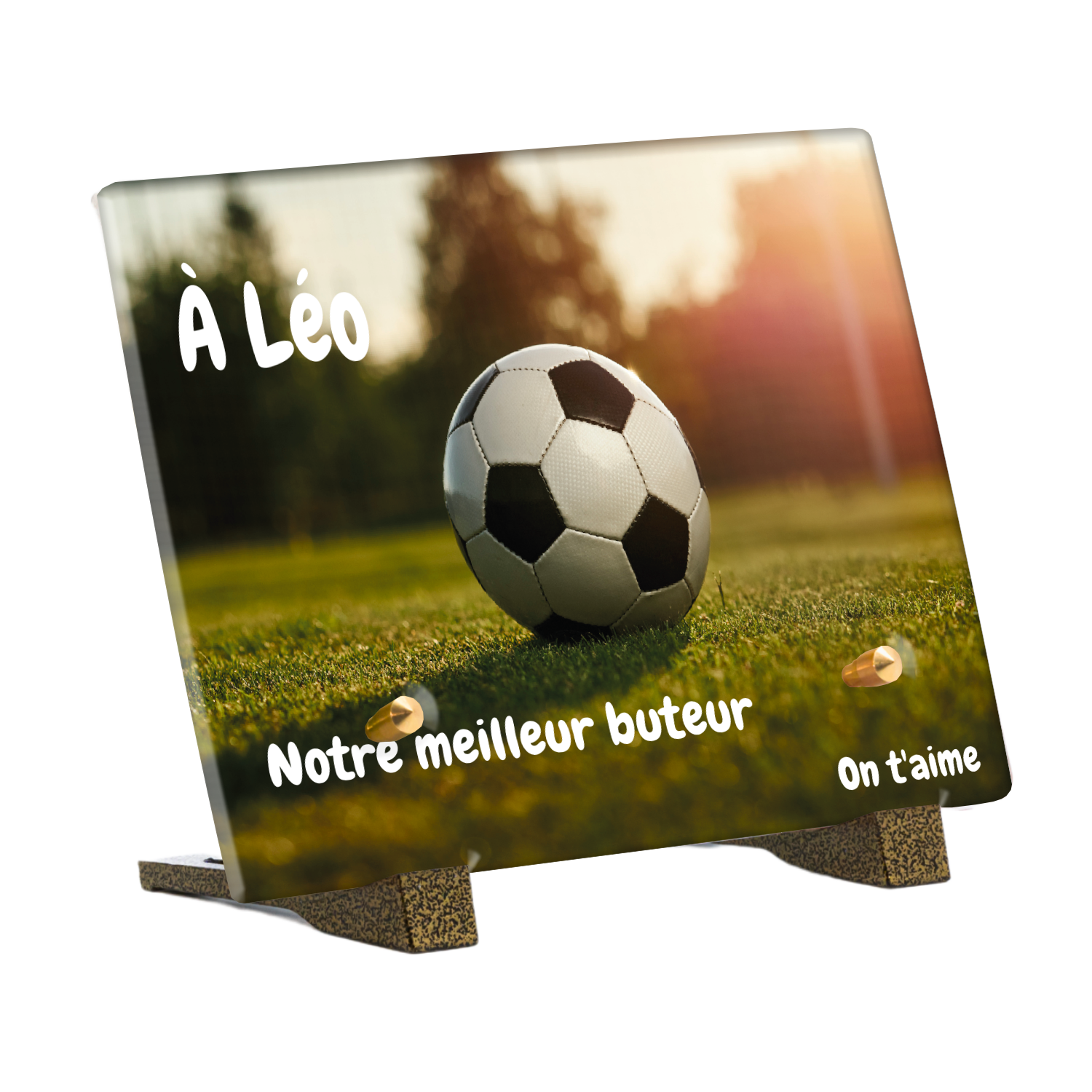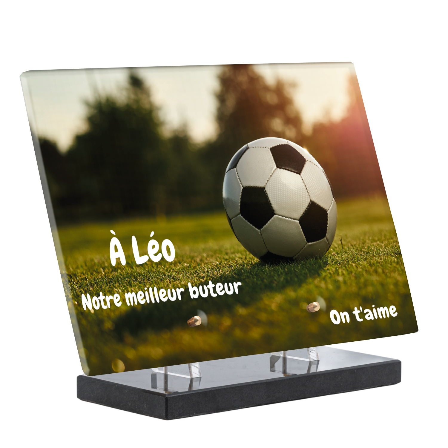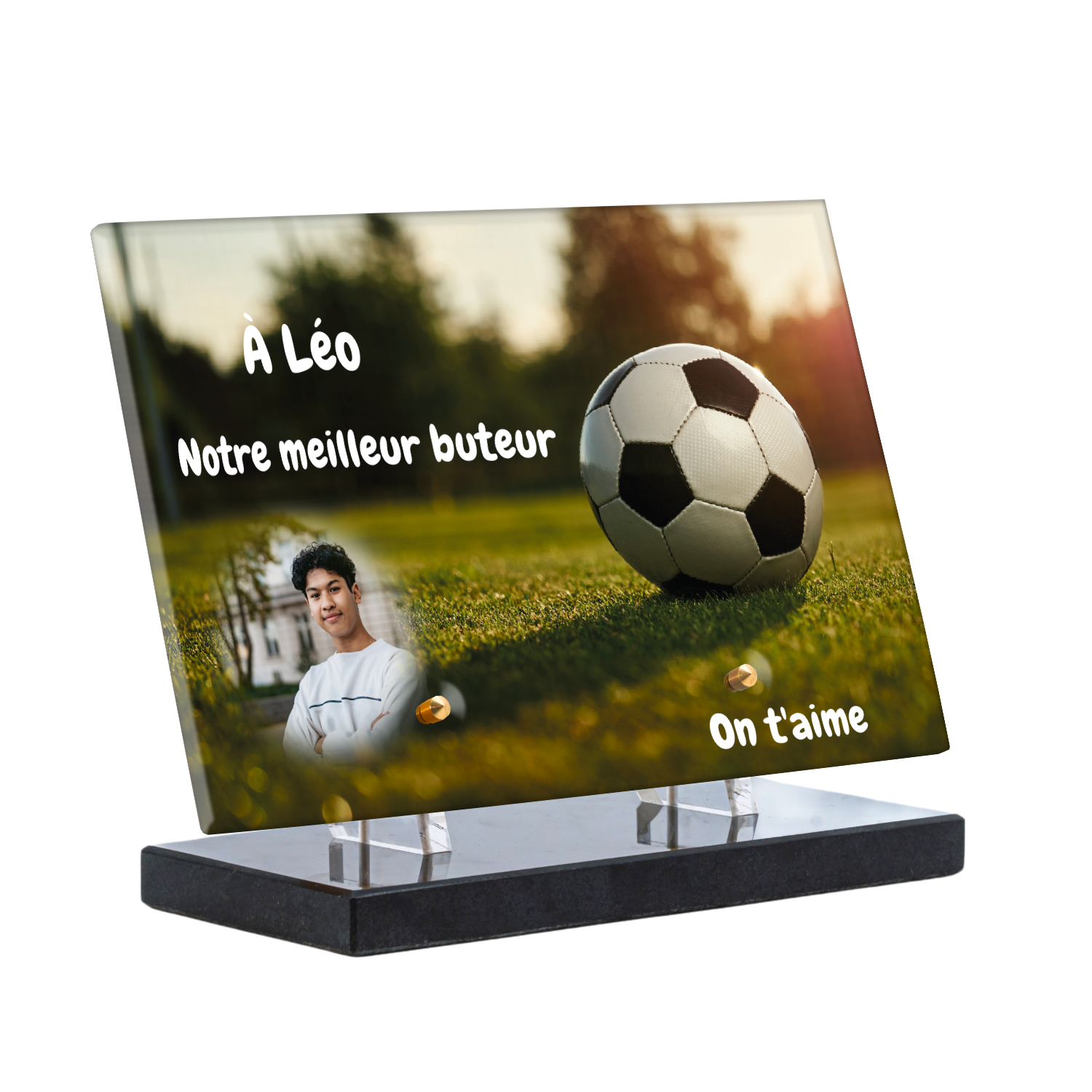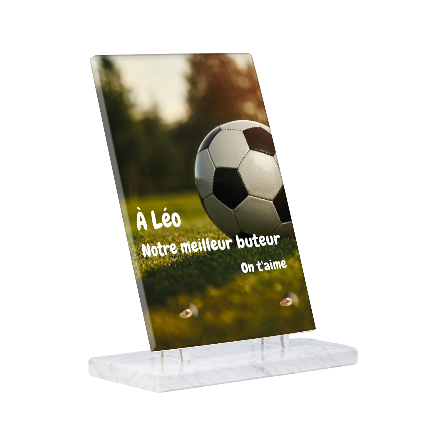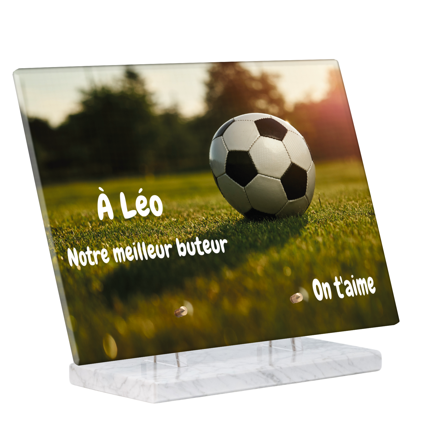Offrez un hommage unique avec cette plaque funéraire personnalisée représentant un ballon de foot sur un terrain, idéale pour célébrer la passion du défunt. Cette plaque mortuaire allie design moderne et élégance, réalisée en plexiglas de haute qualité pour une finition soignée et résistante aux intempéries. Chaque plaque funéraire moderne est conçue sur mesure, vous permettant d’ajouter un texte personnalisé pour un souvenir véritablement unique. Sa durabilité approuvée garantit une longue conservation, assurant que la mémoire de votre proche reste intacte au fil du temps.