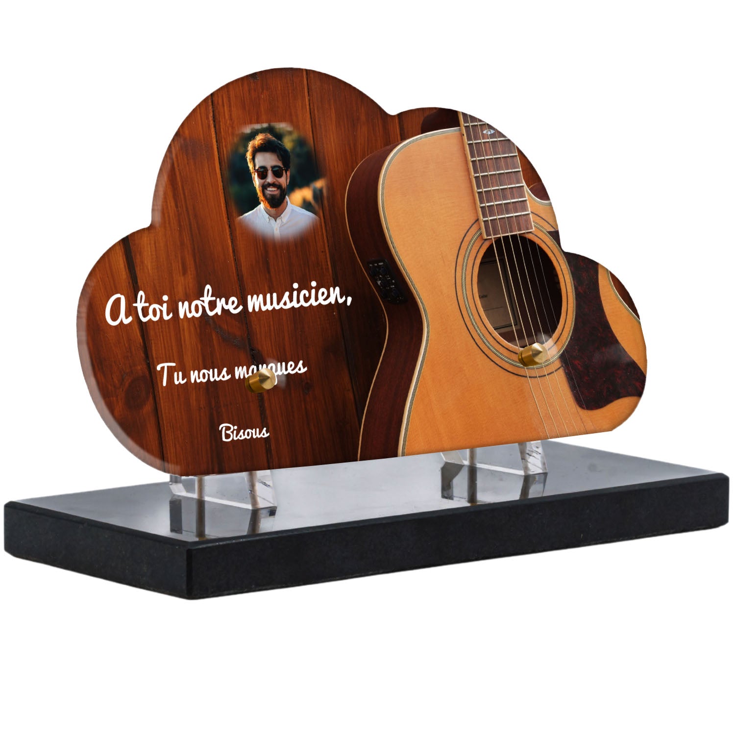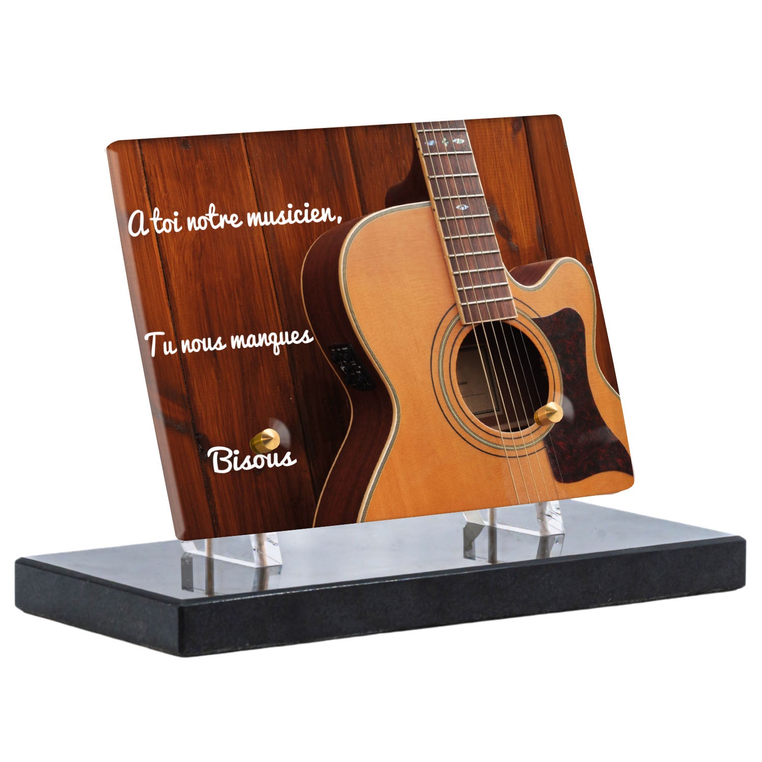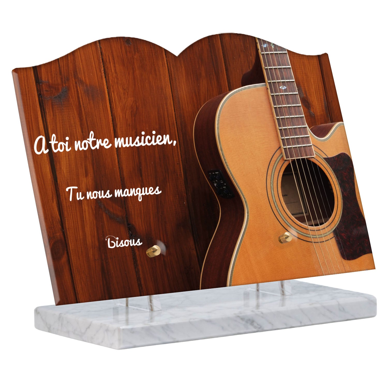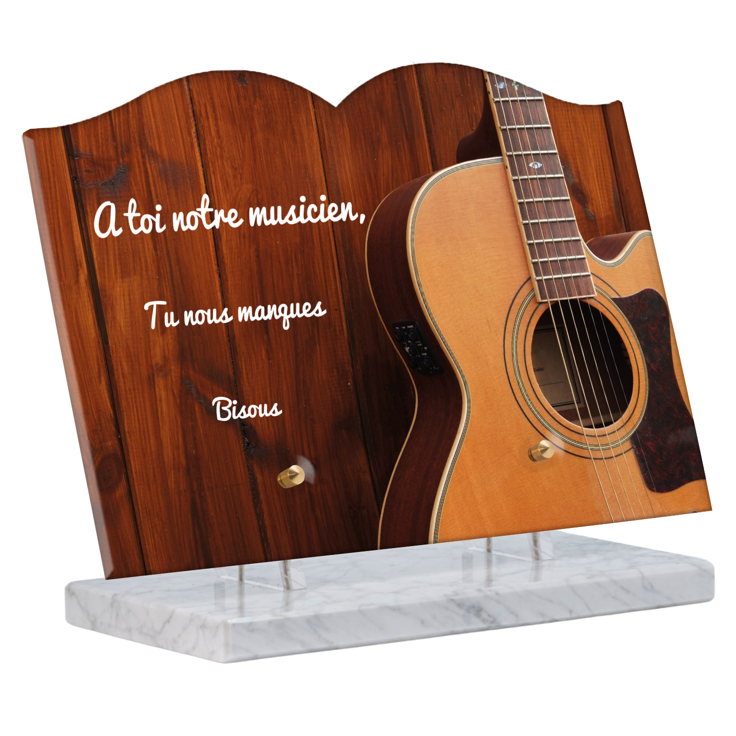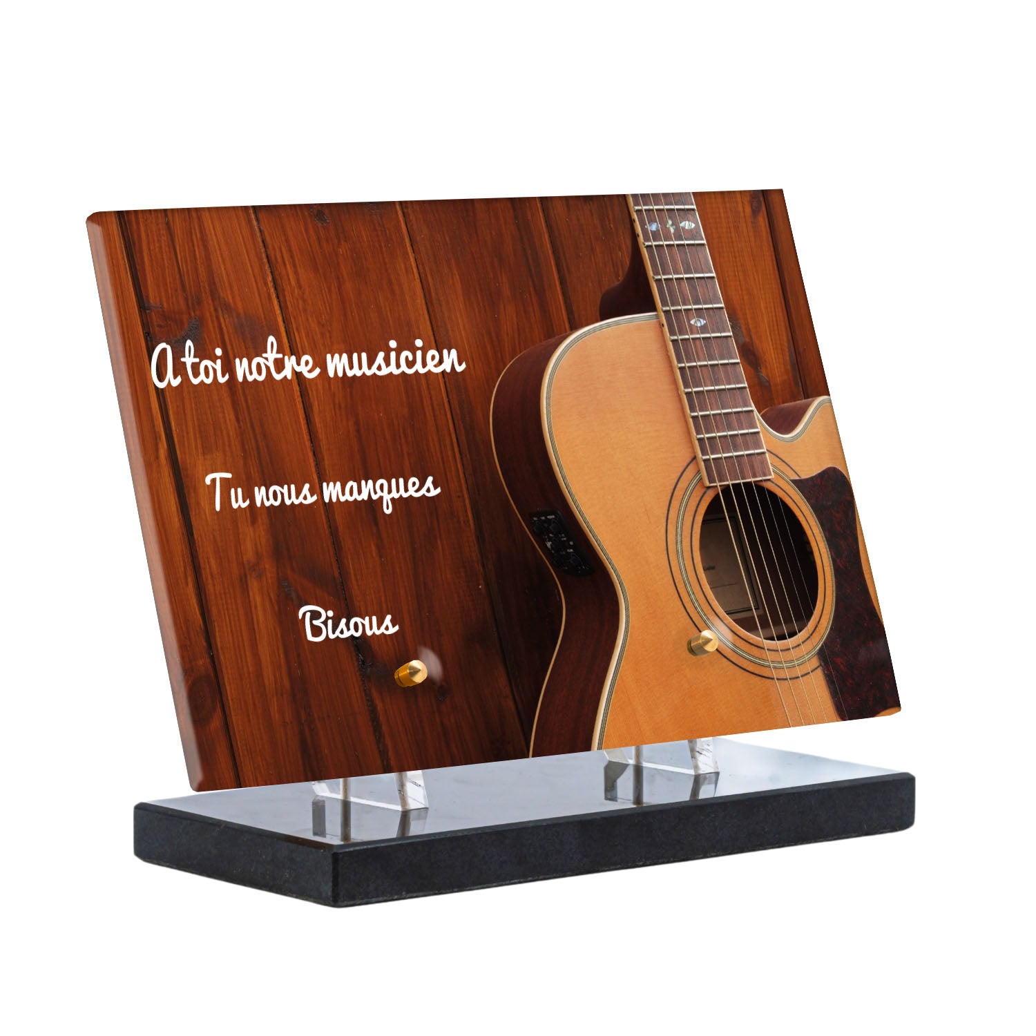 Cette plaque funéraire personnalisée représente une guitare acoustique délicatement posée sur un fond en bois, alliant authenticité et modernité. Conçue en plexiglas, elle offre une plaque mortuaire élégante et résistante, idéale pour rendre hommage avec sobriété et style. Sa finition soignée met en valeur chaque détail, faisant de cette plaque funéraire moderne un choix durable et esthétique. Personnalisable sur mesure, cette plaque funéraire plexiglas vous permet d’ajouter un texte unique et des motifs adaptés à votre souvenir. Sa durabilité approuvée garantit une excellente résistance aux intempéries, assurant que cet hommage reste intact au fil du temps. Offrez un souvenir personnalisé et pérenne grâce à cette plaque funéraire personnalisée.