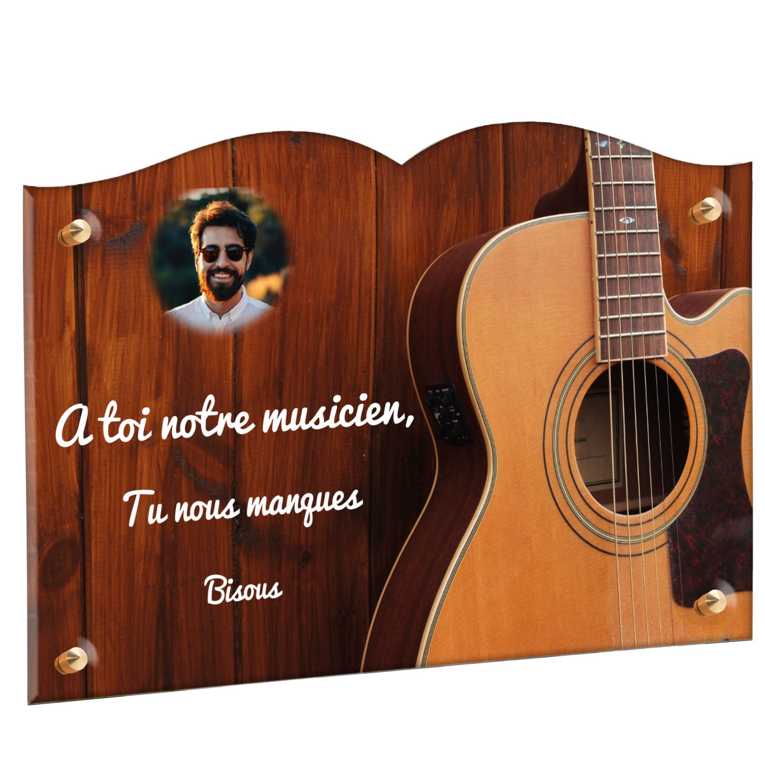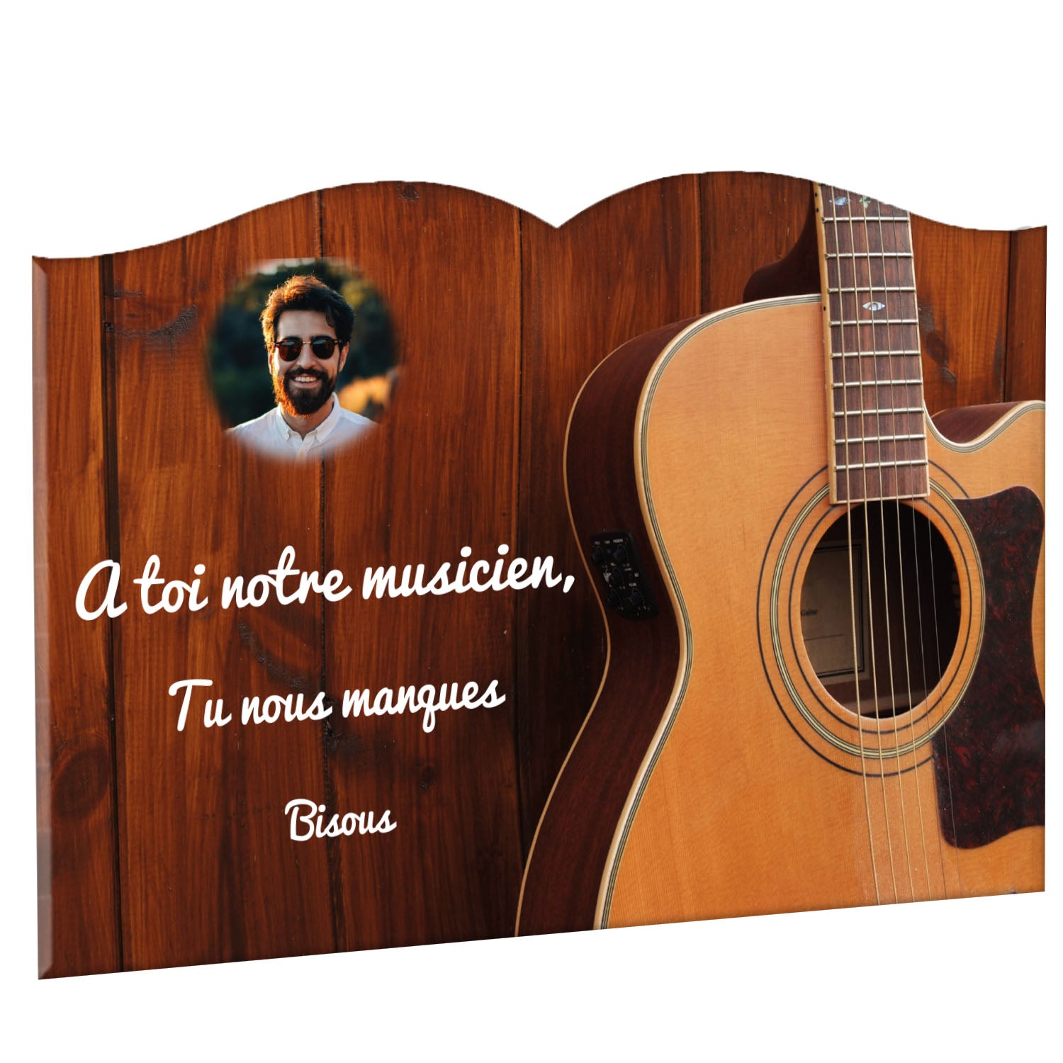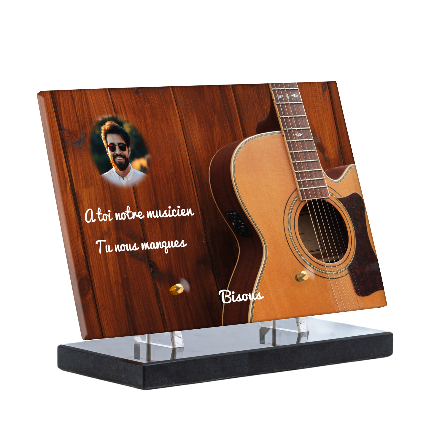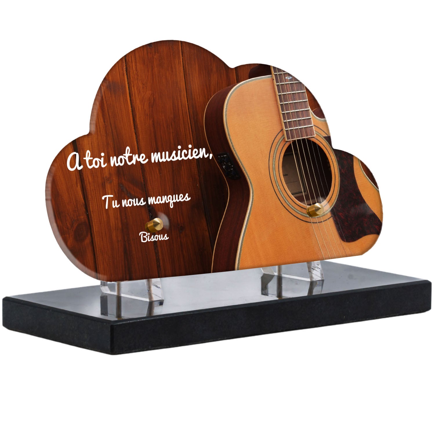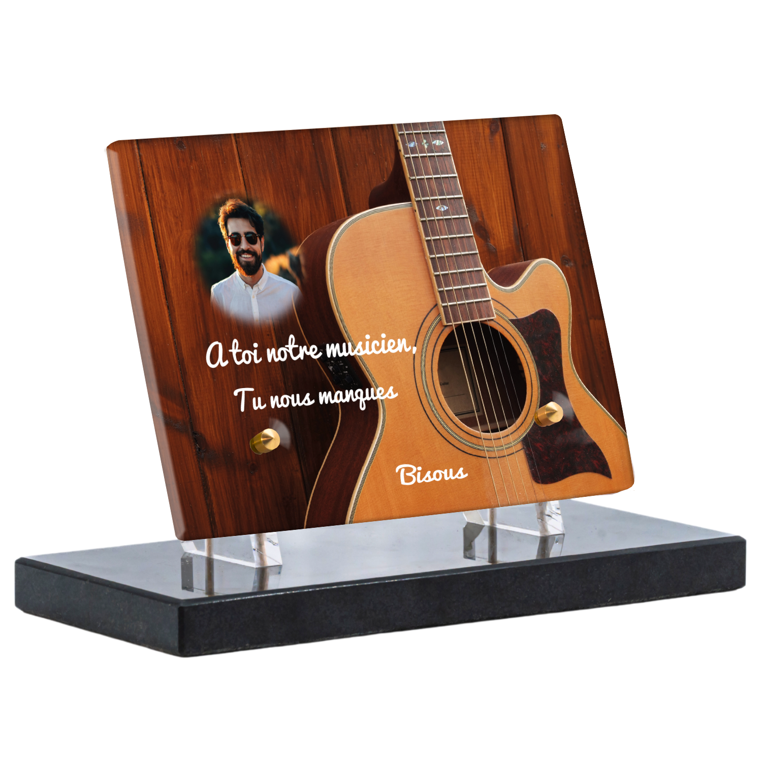 Cette plaque funéraire personnalisée représente une guitare acoustique délicatement posée sur un fond en bois, alliant authenticité et modernité. Conçue en plexiglas, elle offre une plaque mortuaire élégante et résistante, idéale pour rendre hommage avec sobriété et style. Sa finition soignée met en valeur chaque détail, faisant de cette plaque funéraire moderne un choix durable et esthétique. Personnalisable sur mesure, cette plaque funéraire plexiglas vous permet d’ajouter un texte unique et des motifs adaptés à votre souvenir. Sa durabilité approuvée garantit une excellente résistance aux intempéries, assurant que cet hommage reste intact au fil du temps. Offrez un souvenir personnalisé et pérenne grâce à cette plaque funéraire personnalisée.