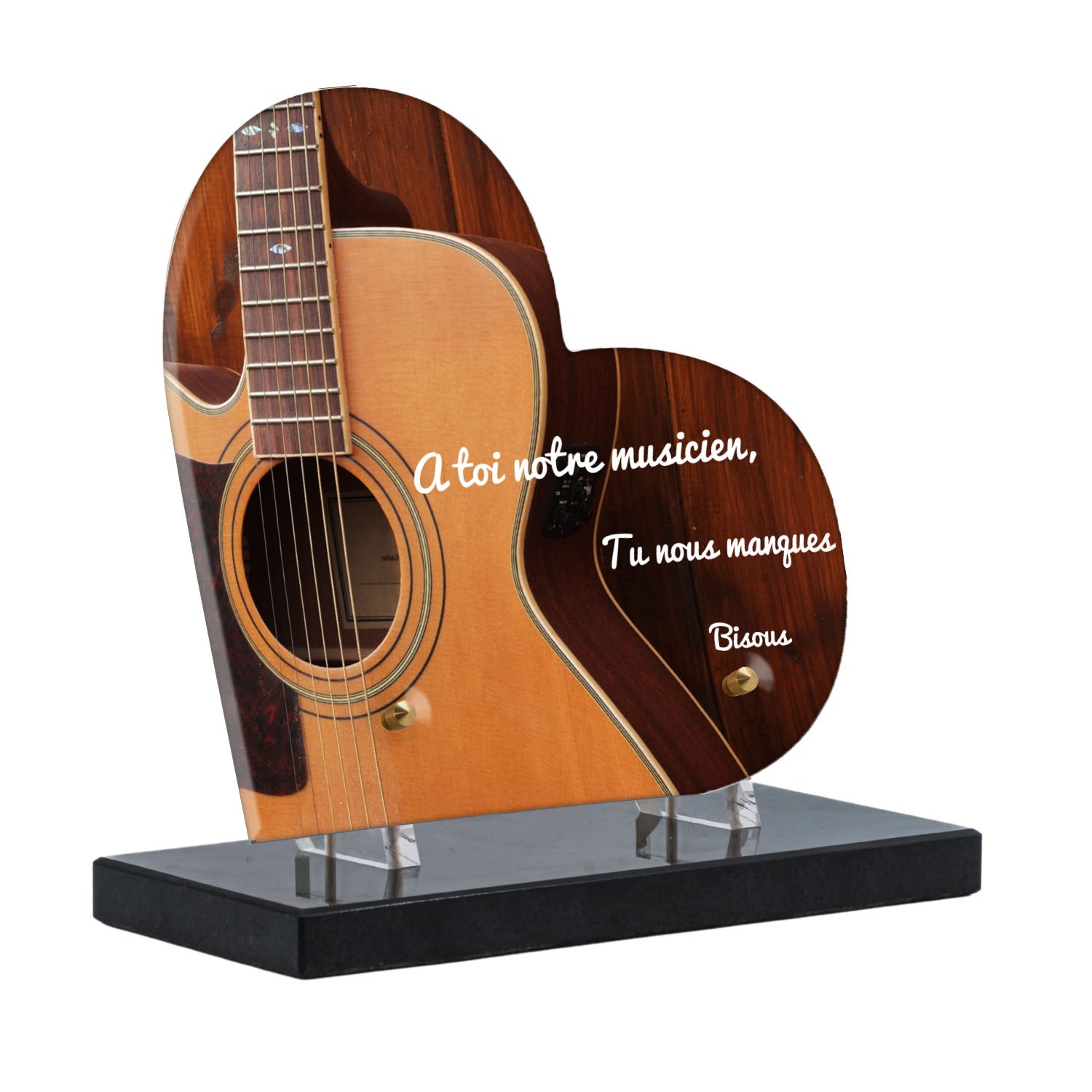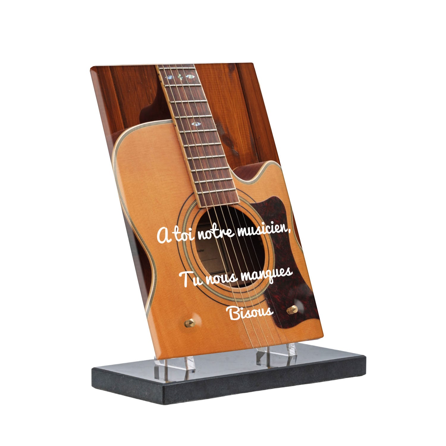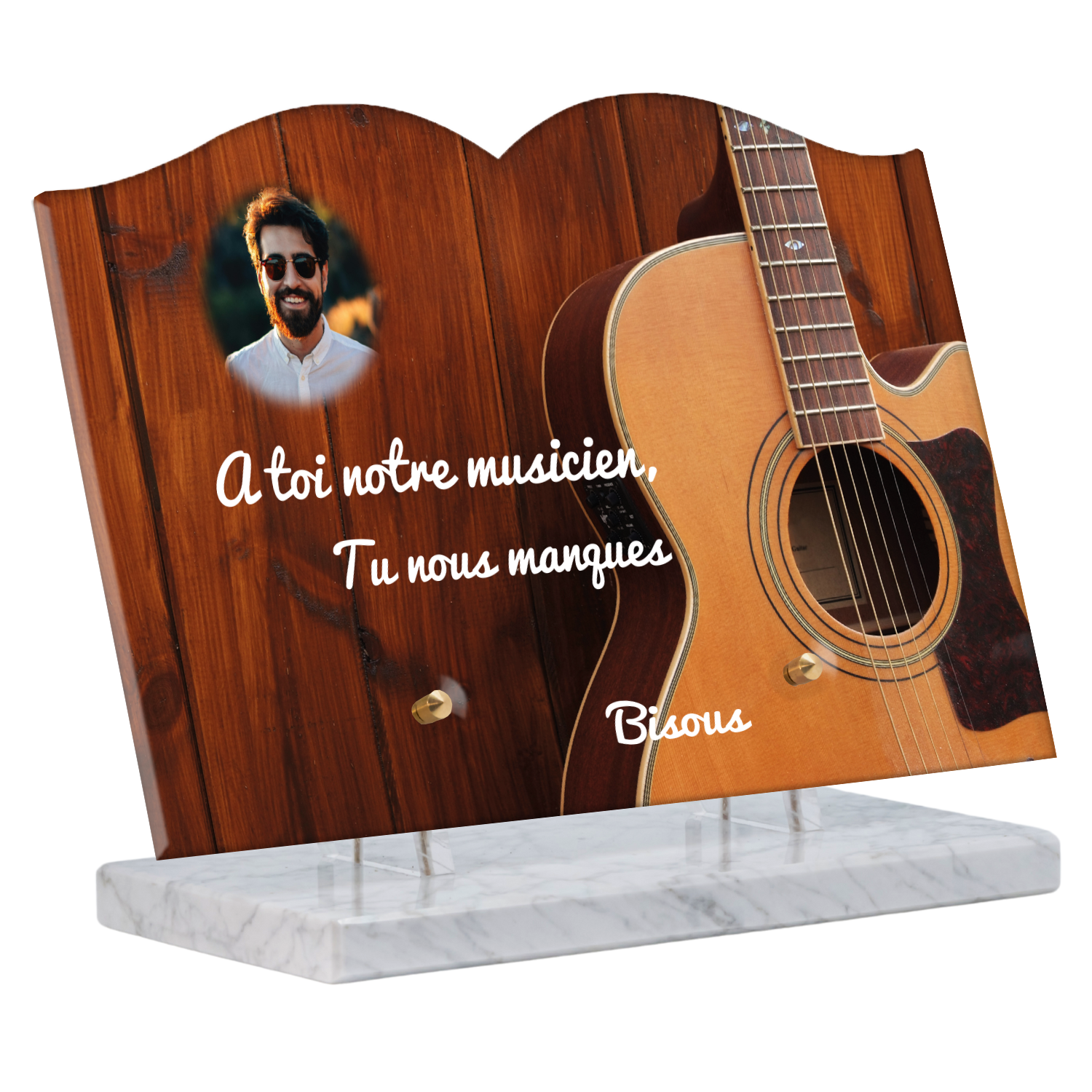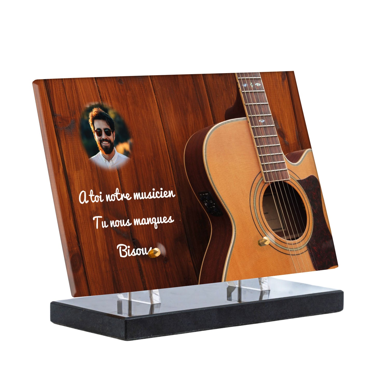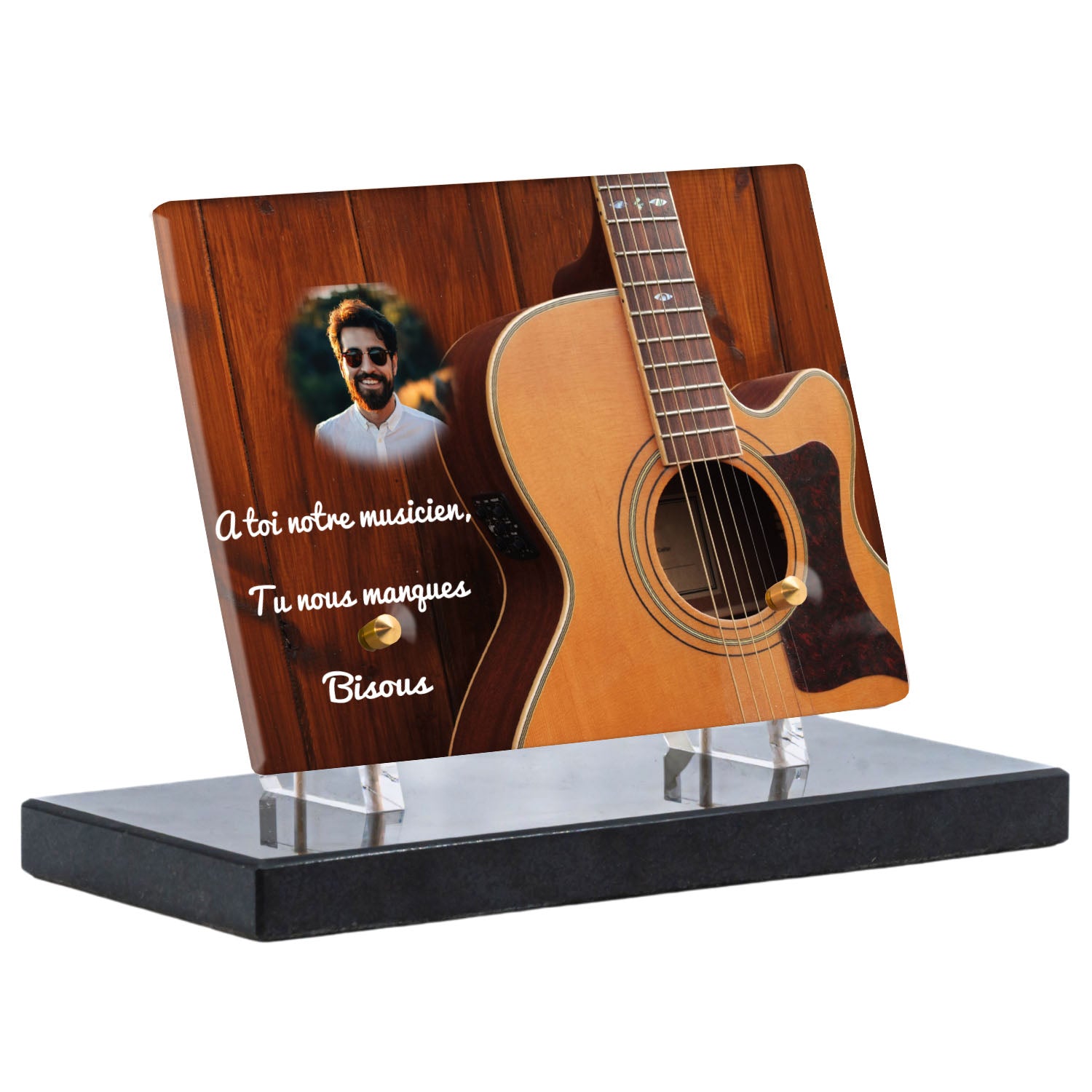 Cette plaque funéraire personnalisée représente une guitare acoustique délicatement posée sur un fond en bois, alliant authenticité et modernité. Conçue en plexiglas, elle offre une plaque mortuaire élégante et résistante, idéale pour rendre hommage avec sobriété et style. Sa finition soignée met en valeur chaque détail, faisant de cette plaque funéraire moderne un choix durable et esthétique. Personnalisable sur mesure, cette plaque funéraire plexiglas vous permet d’ajouter un texte unique et des motifs adaptés à votre souvenir. Sa durabilité approuvée garantit une excellente résistance aux intempéries, assurant que cet hommage reste intact au fil du temps. Offrez un souvenir personnalisé et pérenne grâce à cette plaque funéraire personnalisée.