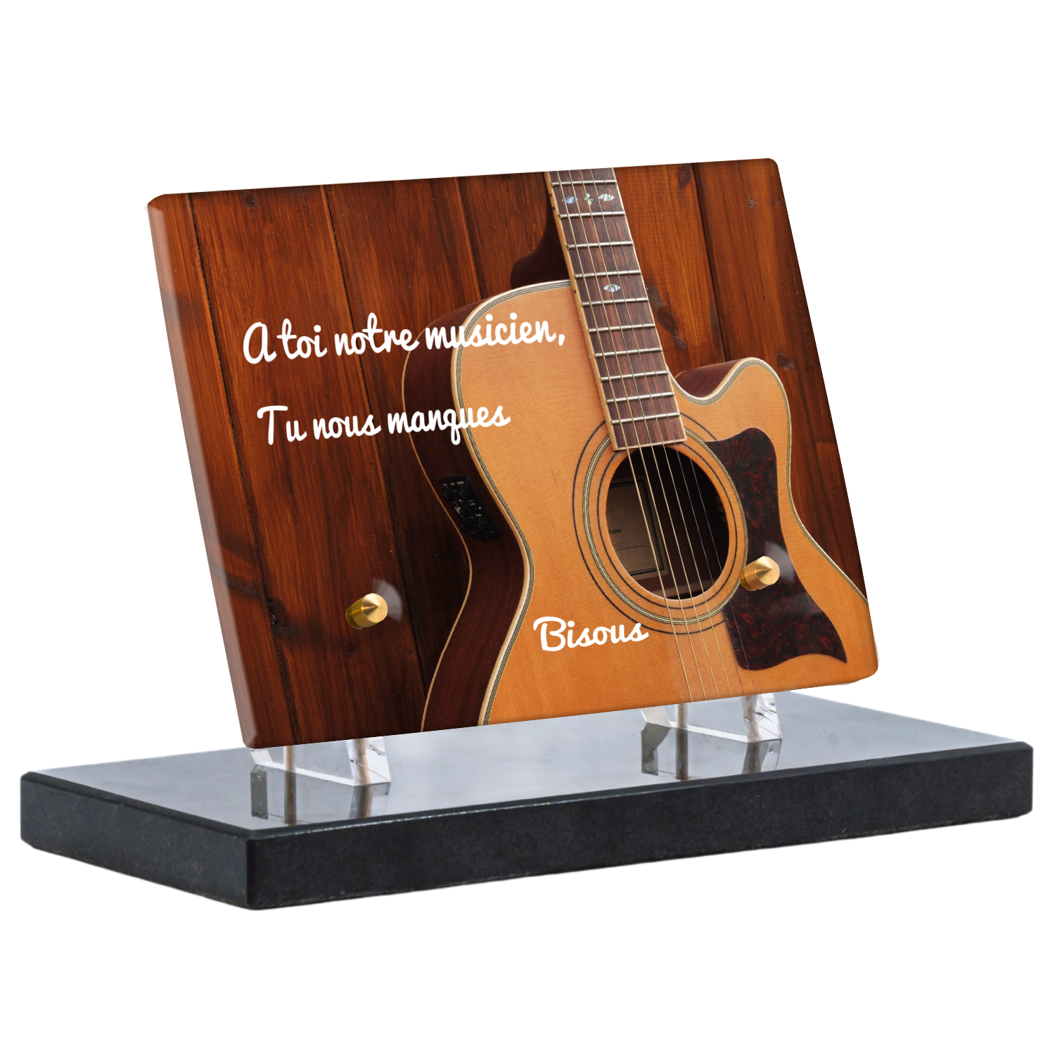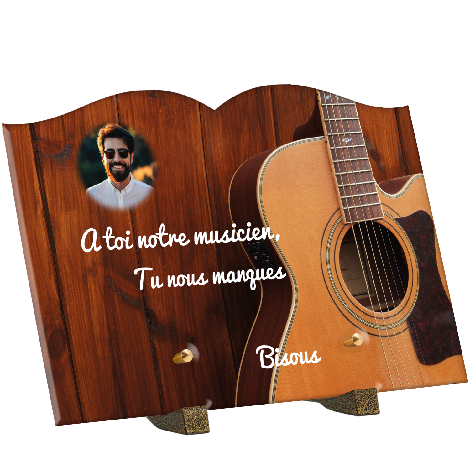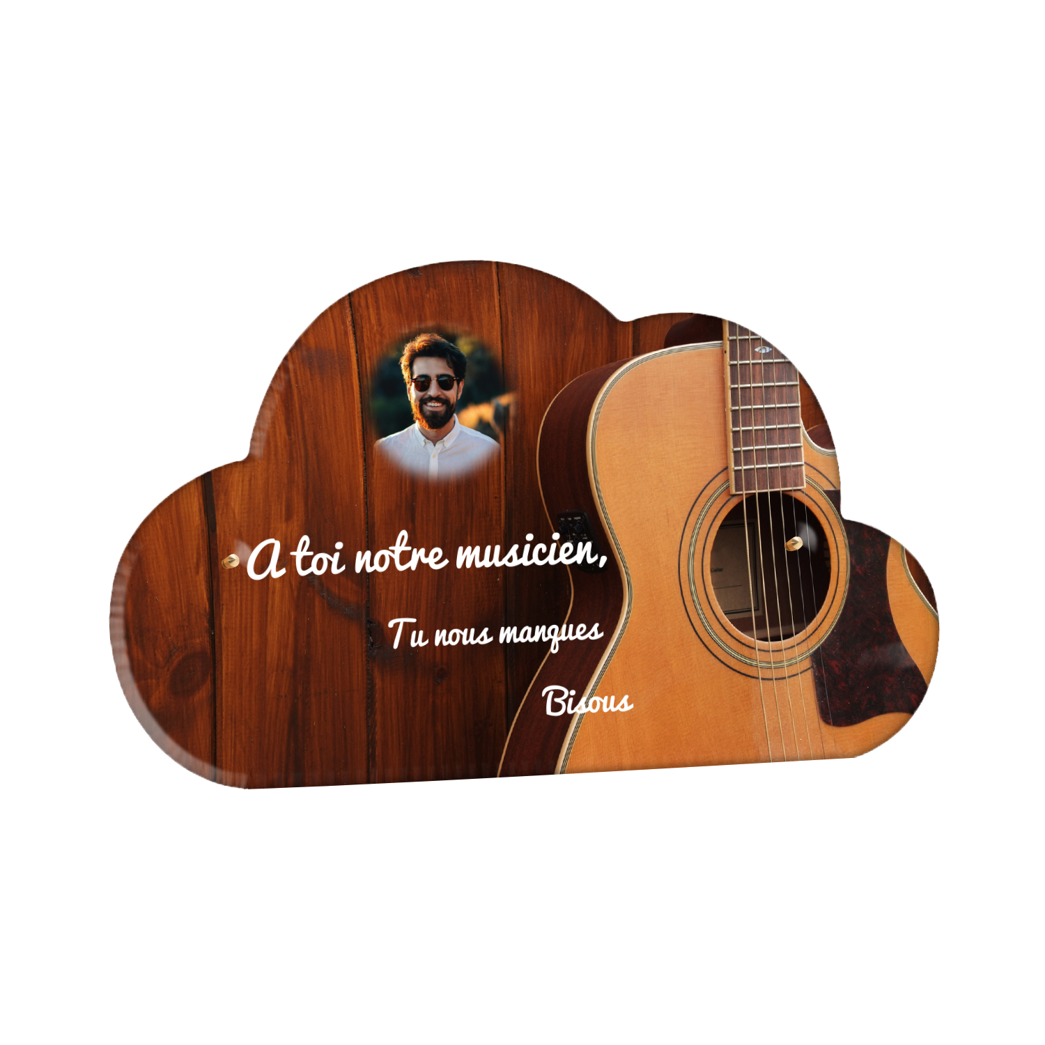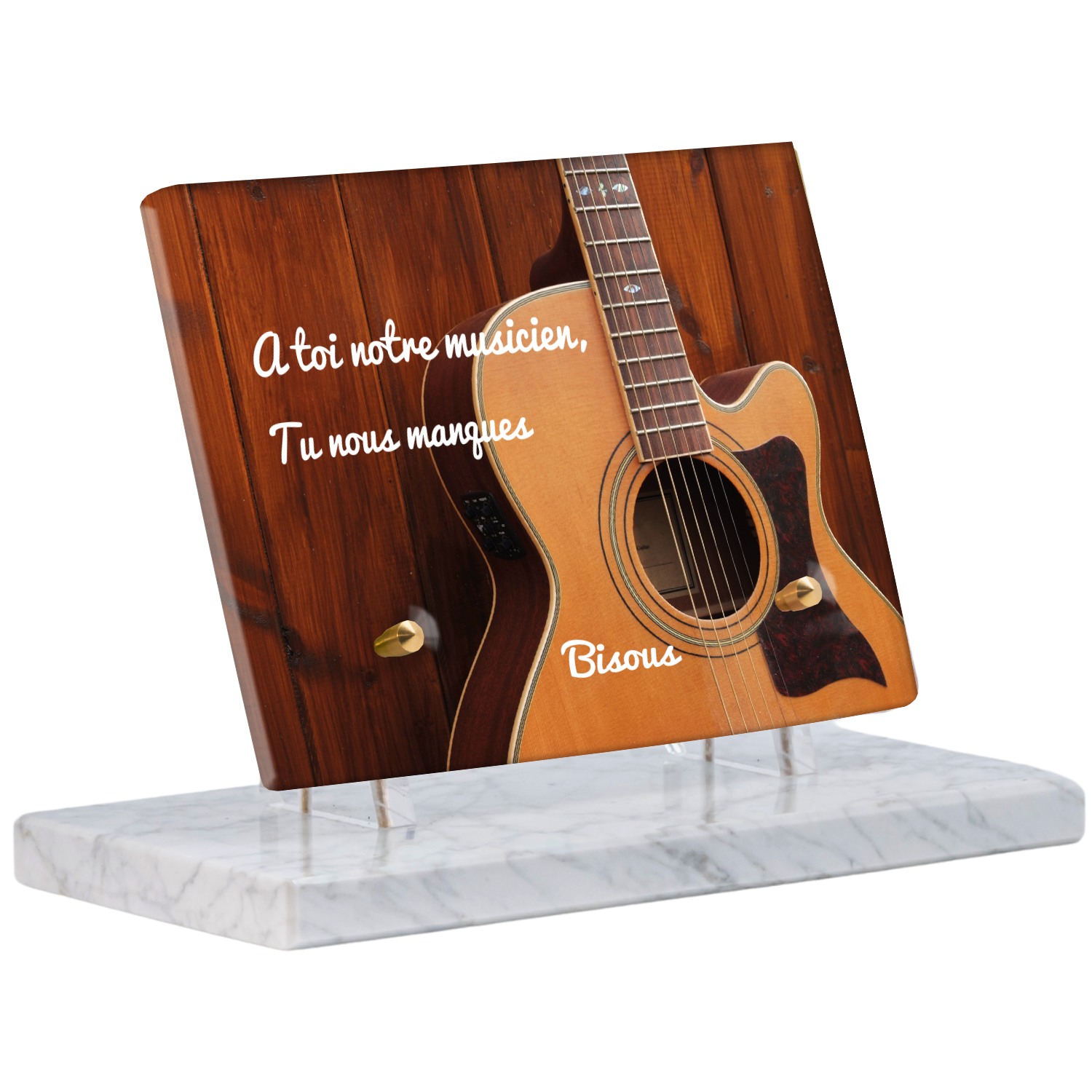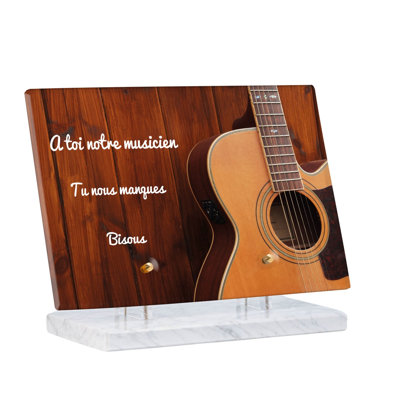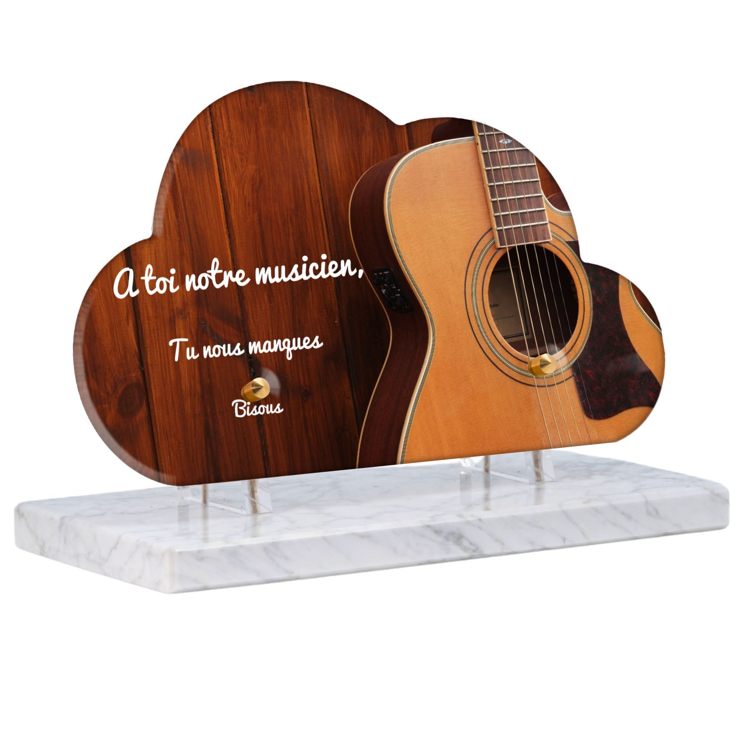 Cette plaque funéraire personnalisée représente une guitare acoustique délicatement posée sur un fond en bois, alliant authenticité et modernité. Conçue en plexiglas, elle offre une plaque mortuaire élégante et résistante, idéale pour rendre hommage avec sobriété et style. Sa finition soignée met en valeur chaque détail, faisant de cette plaque funéraire moderne un choix durable et esthétique. Personnalisable sur mesure, cette plaque funéraire plexiglas vous permet d’ajouter un texte unique et des motifs adaptés à votre souvenir. Sa durabilité approuvée garantit une excellente résistance aux intempéries, assurant que cet hommage reste intact au fil du temps. Offrez un souvenir personnalisé et pérenne grâce à cette plaque funéraire personnalisée.