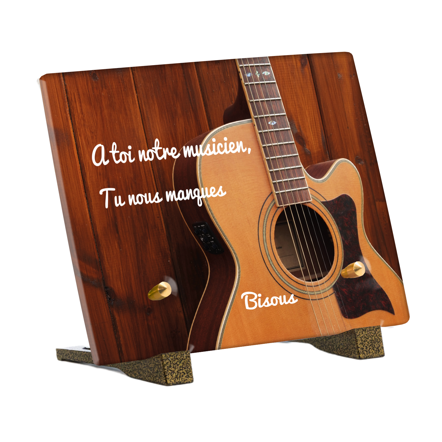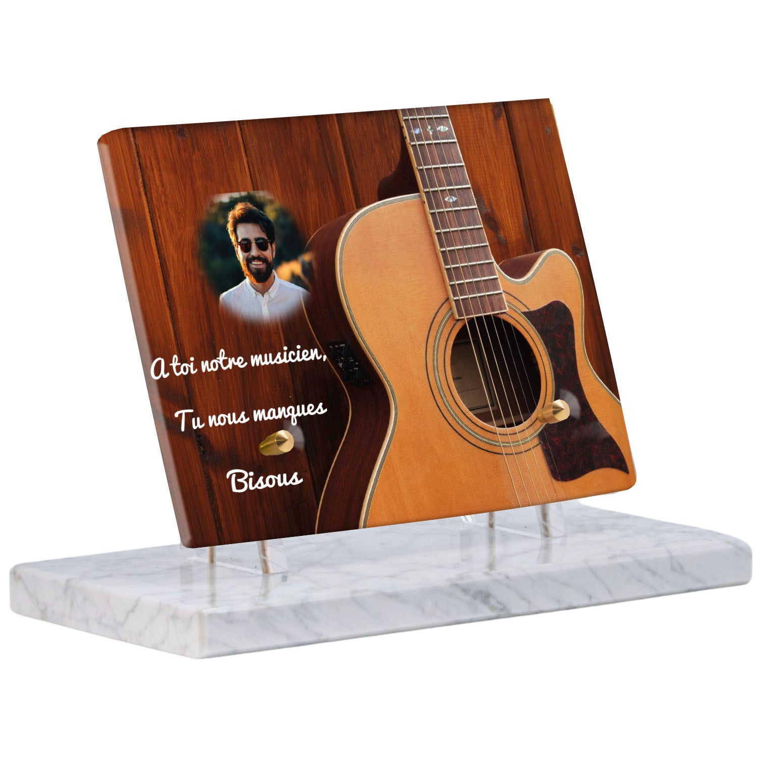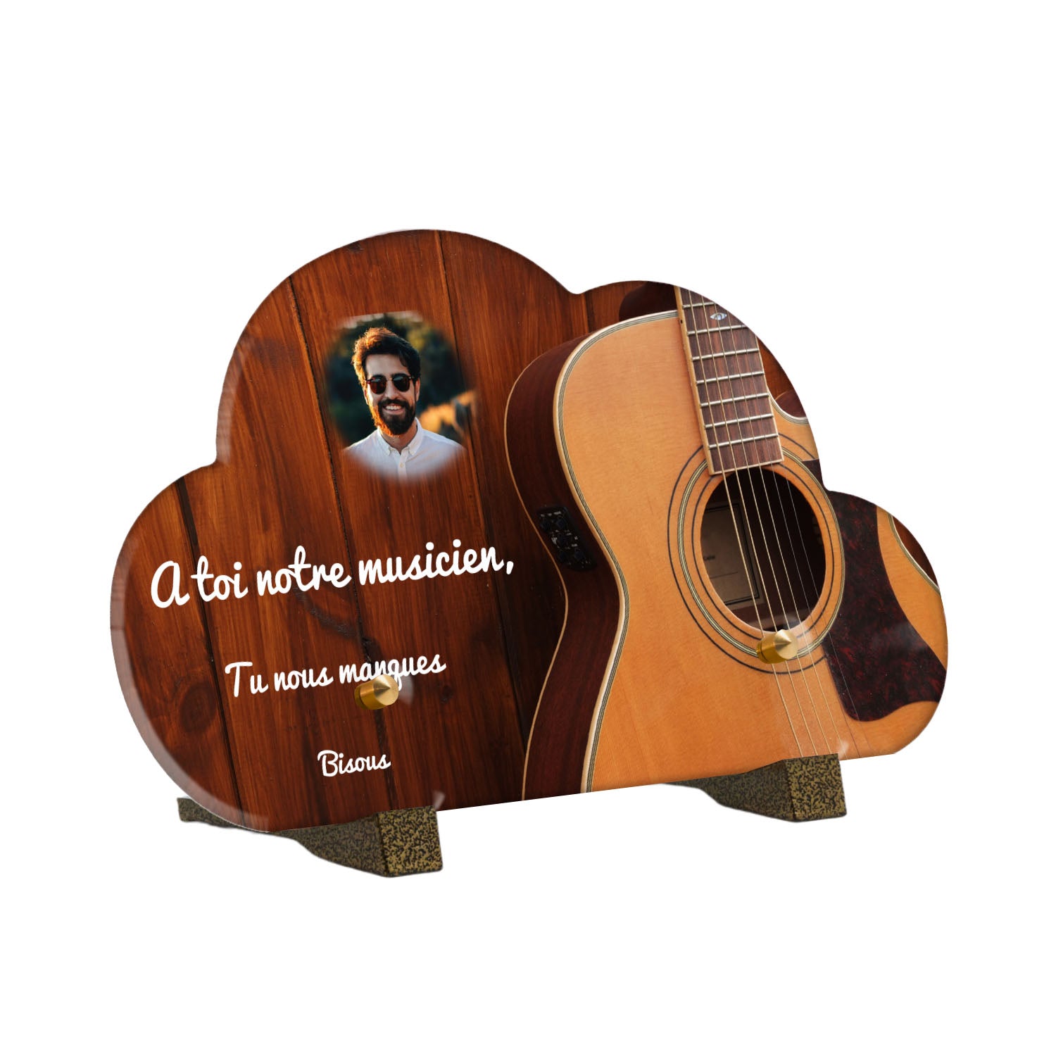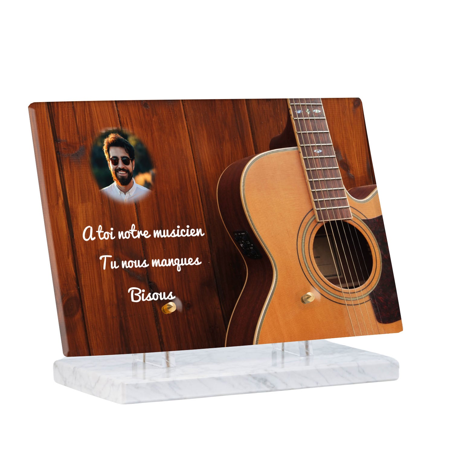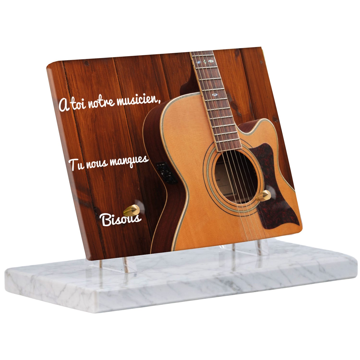 Cette plaque funéraire personnalisée représente une guitare acoustique délicatement posée sur un fond en bois, alliant authenticité et modernité. Conçue en plexiglas, elle offre une plaque mortuaire élégante et résistante, idéale pour rendre hommage avec sobriété et style. Sa finition soignée met en valeur chaque détail, faisant de cette plaque funéraire moderne un choix durable et esthétique. Personnalisable sur mesure, cette plaque funéraire plexiglas vous permet d’ajouter un texte unique et des motifs adaptés à votre souvenir. Sa durabilité approuvée garantit une excellente résistance aux intempéries, assurant que cet hommage reste intact au fil du temps. Offrez un souvenir personnalisé et pérenne grâce à cette plaque funéraire personnalisée.
