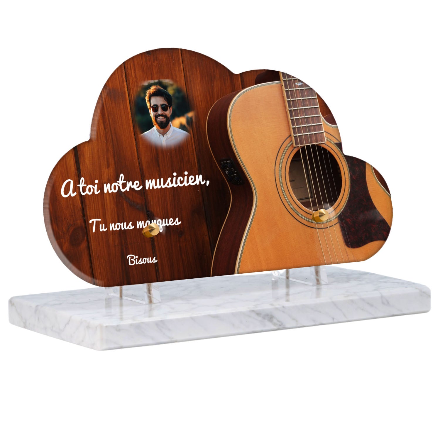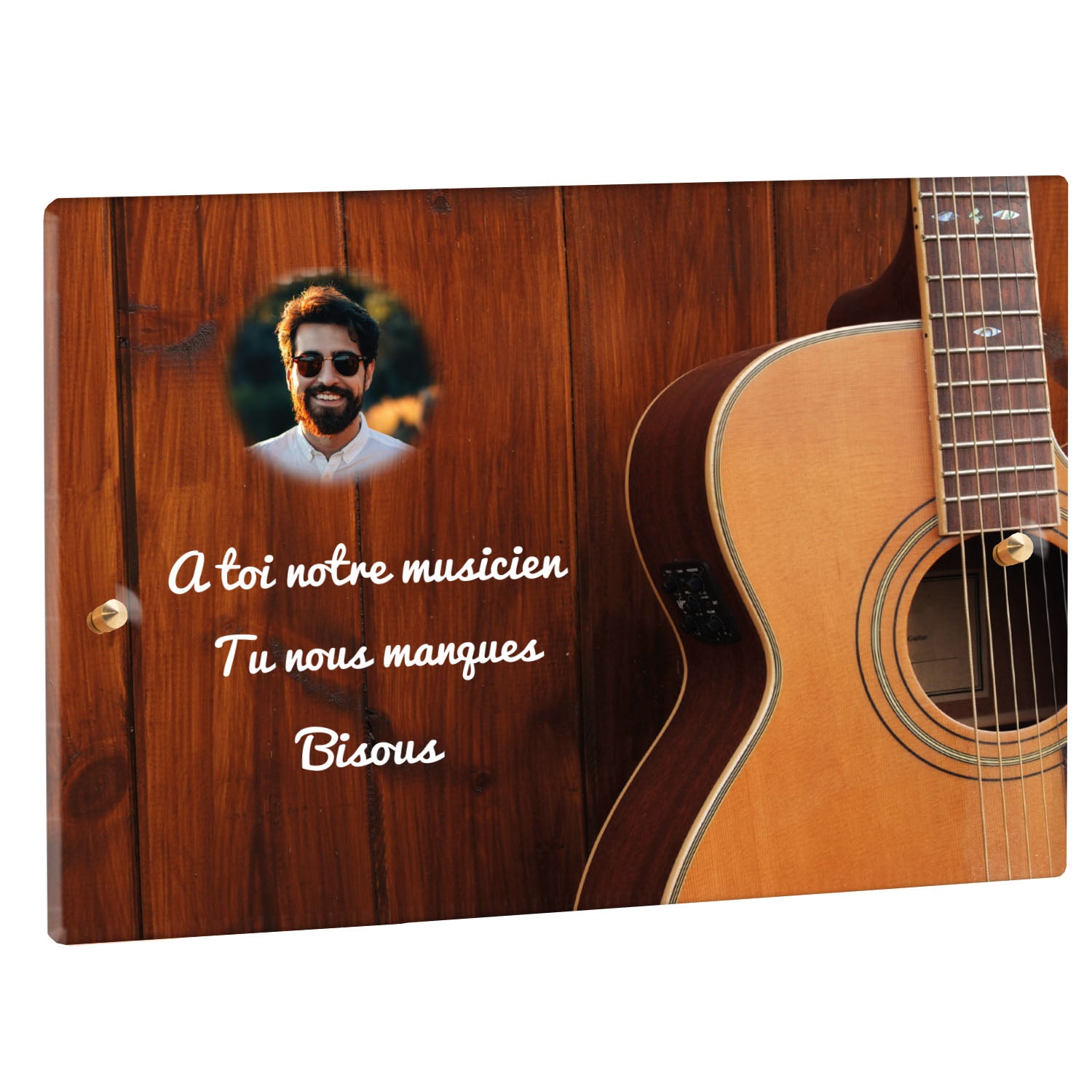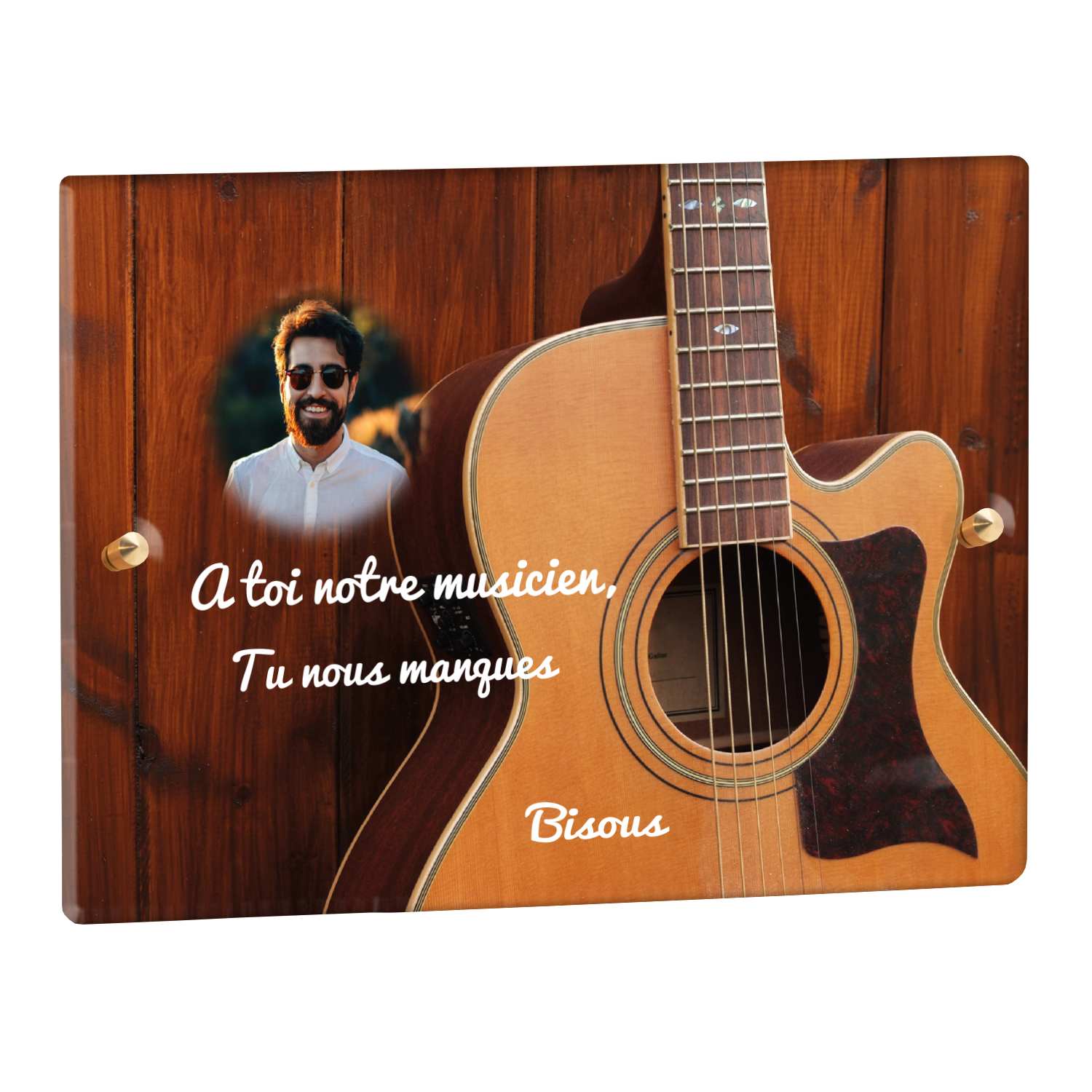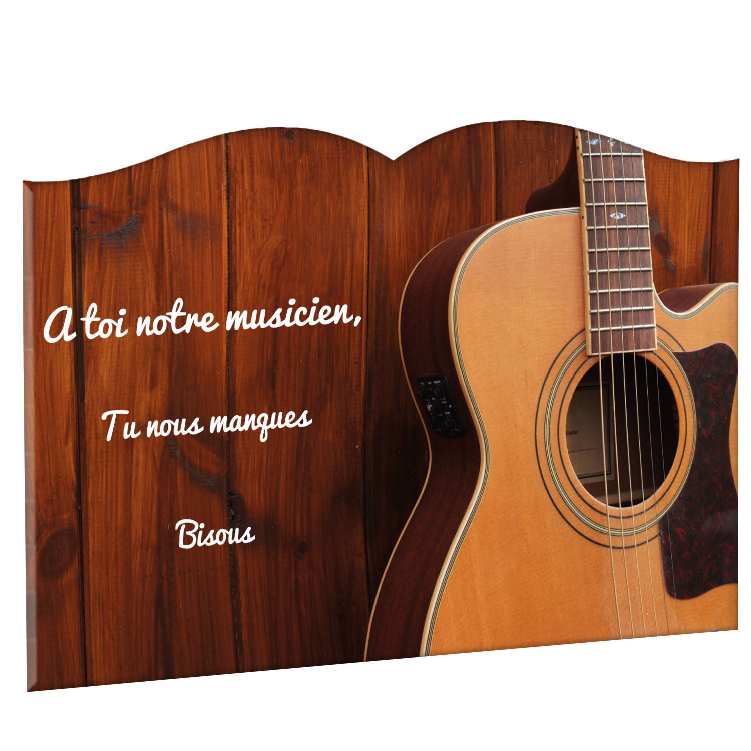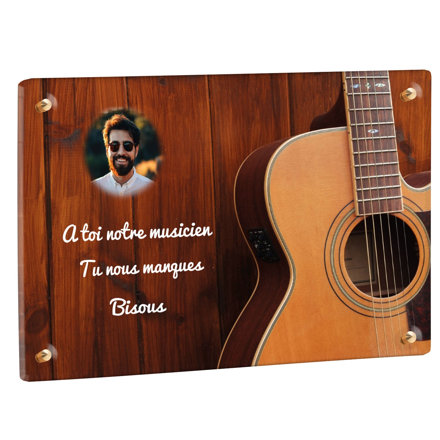 Cette plaque funéraire personnalisée représente une guitare acoustique délicatement posée sur un fond en bois, alliant authenticité et modernité. Conçue en plexiglas, elle offre une plaque mortuaire élégante et résistante, idéale pour rendre hommage avec sobriété et style. Sa finition soignée met en valeur chaque détail, faisant de cette plaque funéraire moderne un choix durable et esthétique. Personnalisable sur mesure, cette plaque funéraire plexiglas vous permet d’ajouter un texte unique et des motifs adaptés à votre souvenir. Sa durabilité approuvée garantit une excellente résistance aux intempéries, assurant que cet hommage reste intact au fil du temps. Offrez un souvenir personnalisé et pérenne grâce à cette plaque funéraire personnalisée.