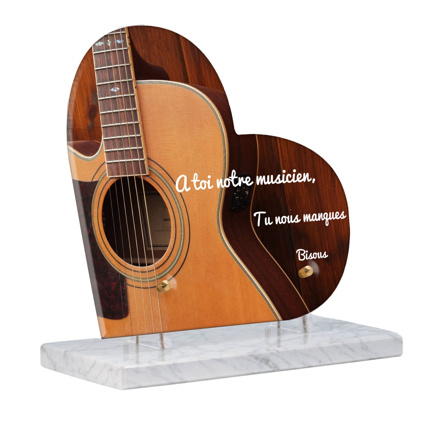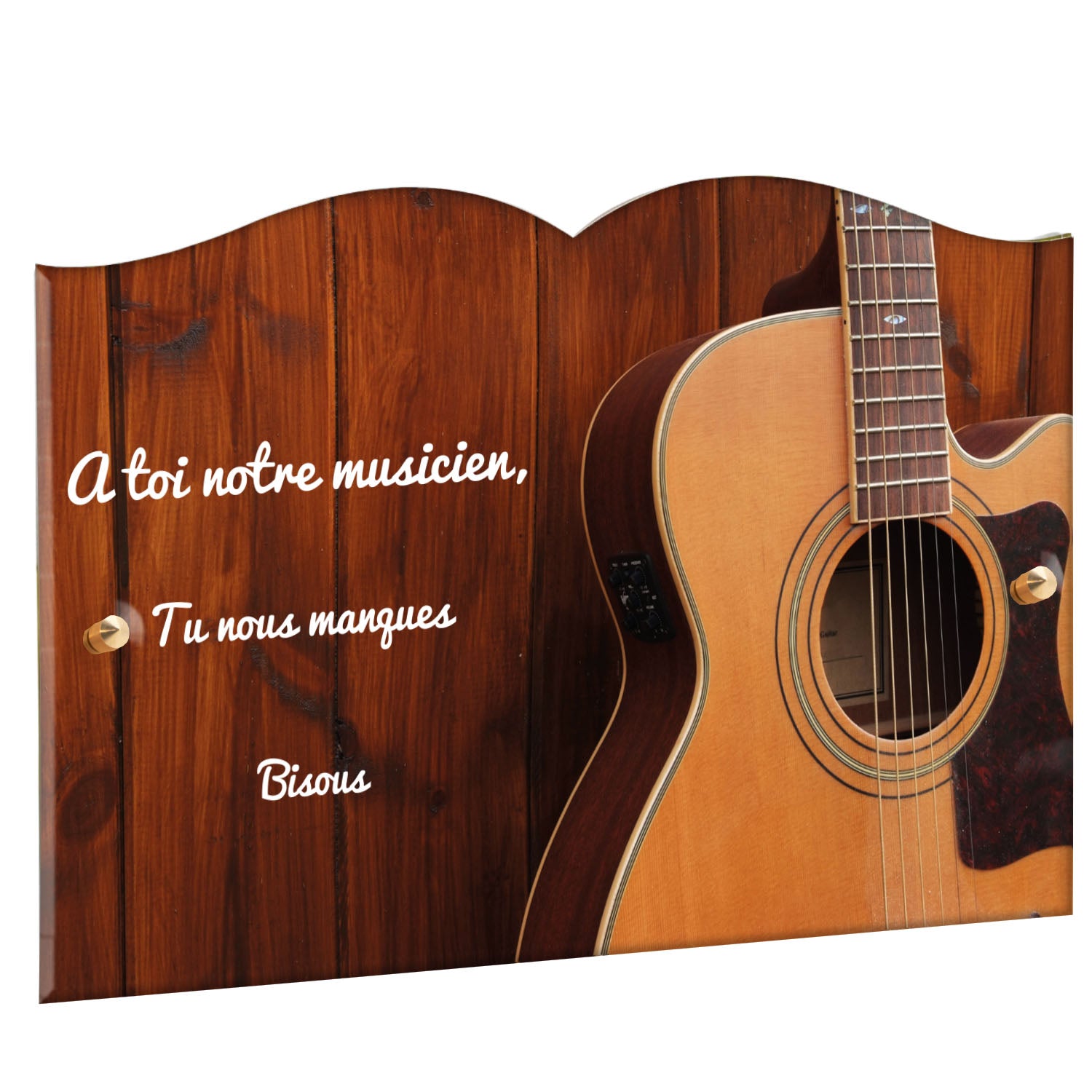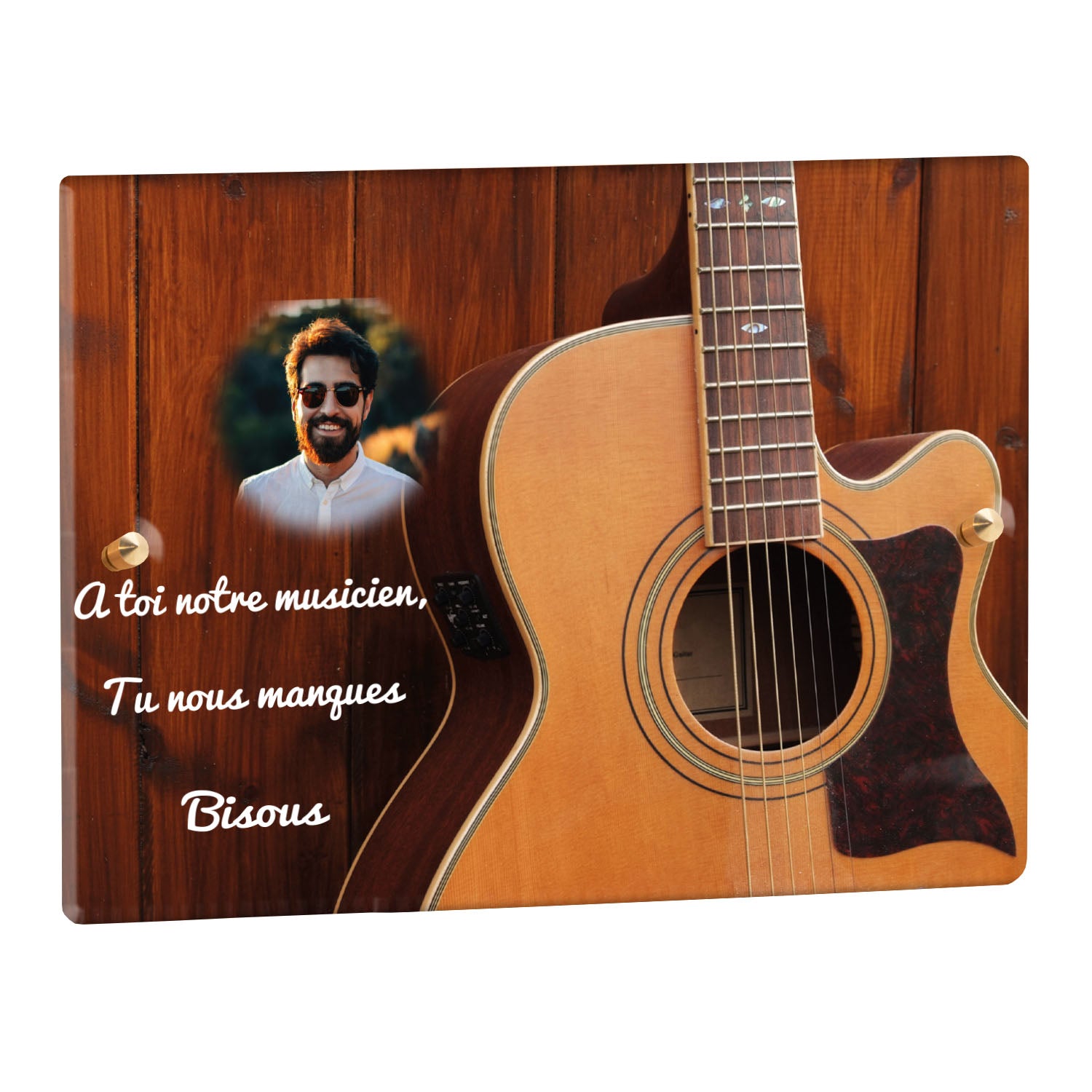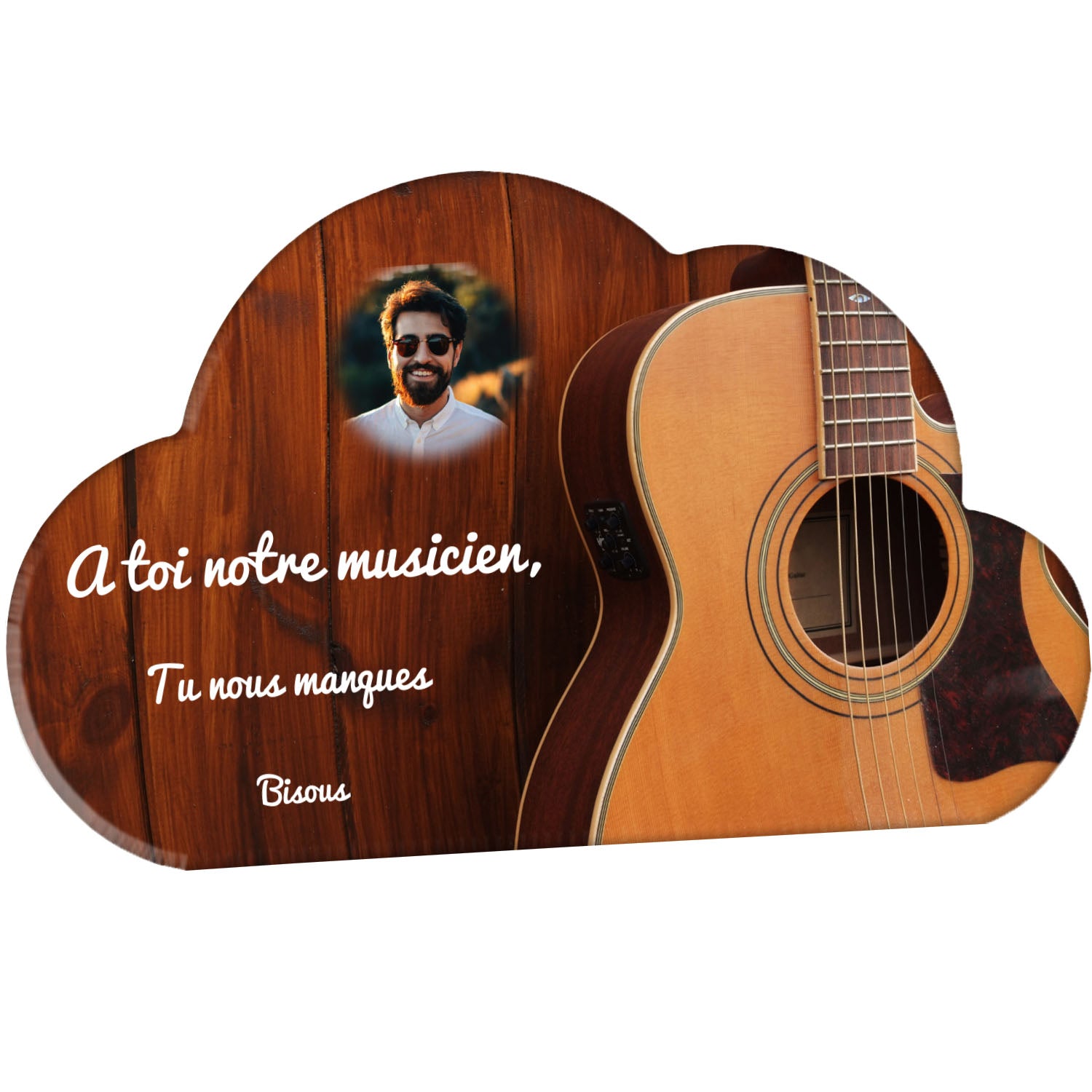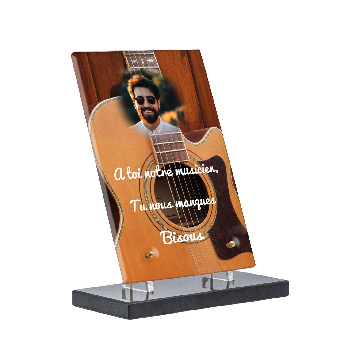 Cette plaque funéraire personnalisée représente une guitare acoustique délicatement posée sur un fond en bois, alliant authenticité et modernité. Conçue en plexiglas, elle offre une plaque mortuaire élégante et résistante, idéale pour rendre hommage avec sobriété et style. Sa finition soignée met en valeur chaque détail, faisant de cette plaque funéraire moderne un choix durable et esthétique. Personnalisable sur mesure, cette plaque funéraire plexiglas vous permet d’ajouter un texte unique et des motifs adaptés à votre souvenir. Sa durabilité approuvée garantit une excellente résistance aux intempéries, assurant que cet hommage reste intact au fil du temps. Offrez un souvenir personnalisé et pérenne grâce à cette plaque funéraire personnalisée.