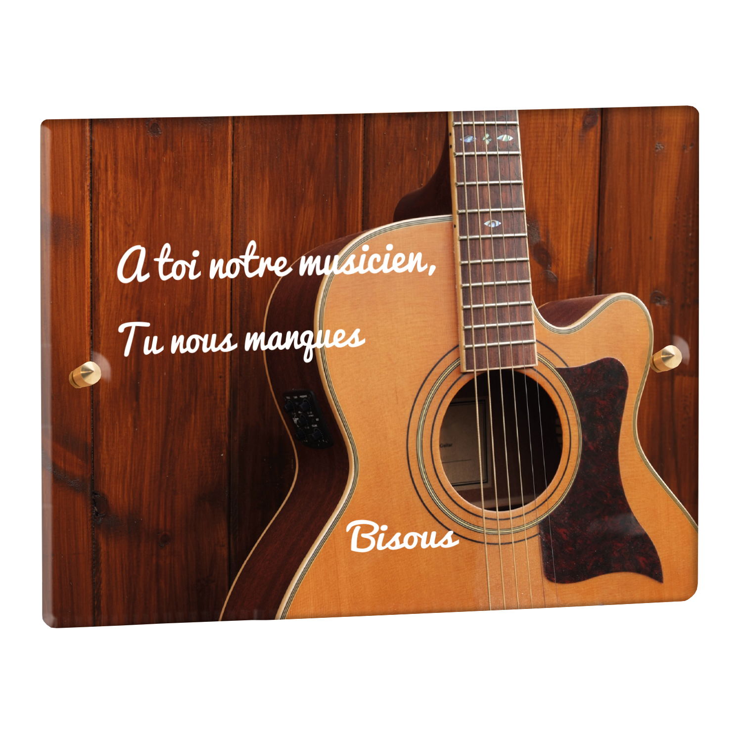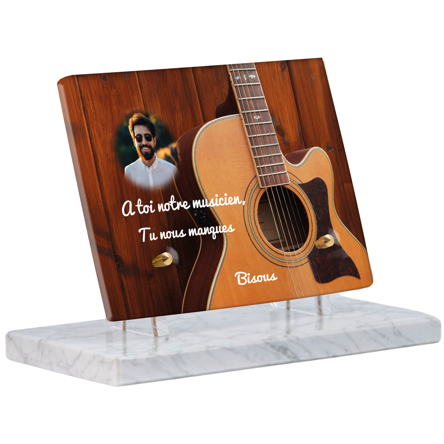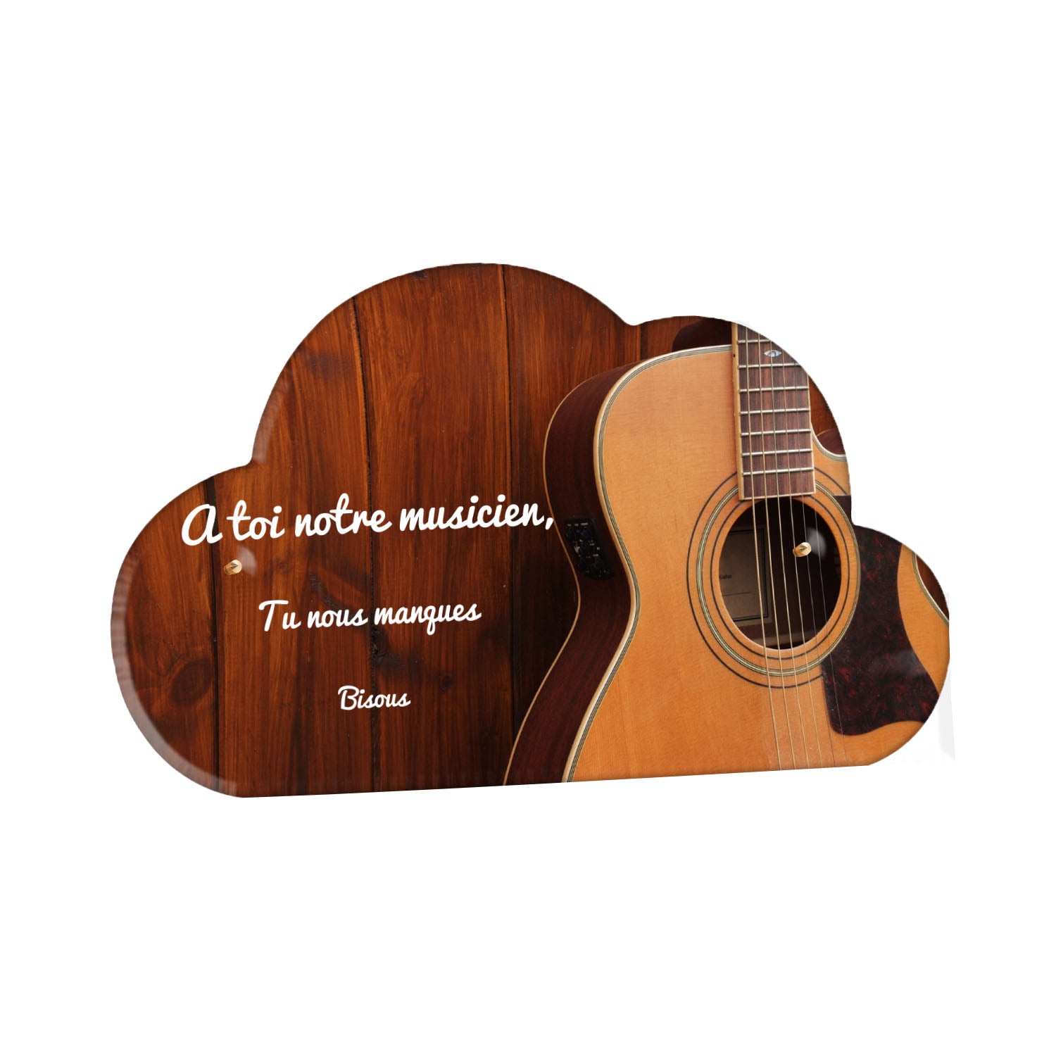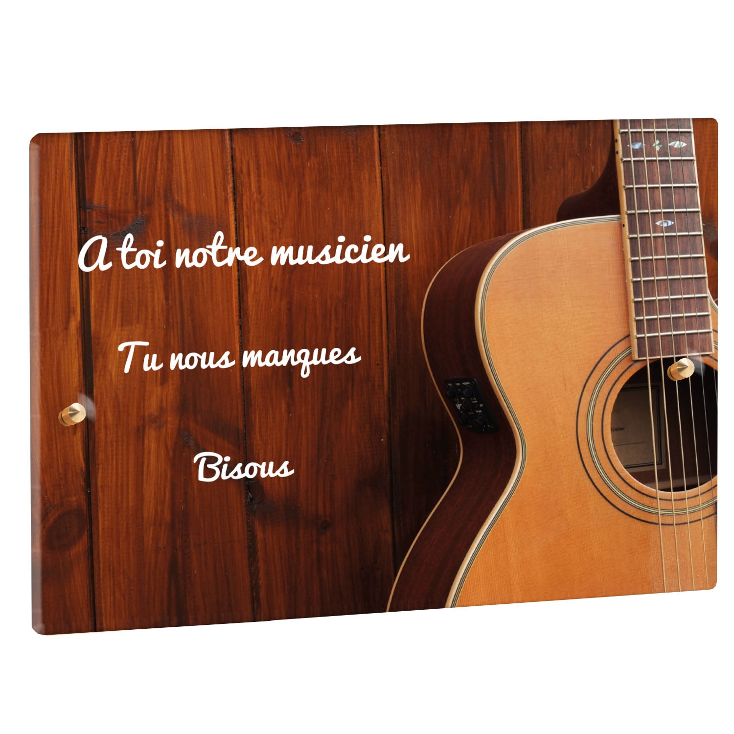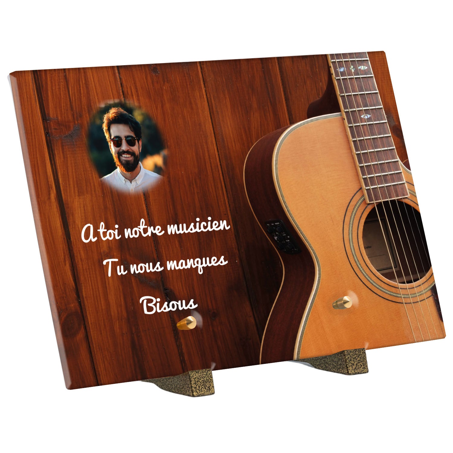 Cette plaque funéraire personnalisée représente une guitare acoustique délicatement posée sur un fond en bois, alliant authenticité et modernité. Conçue en plexiglas, elle offre une plaque mortuaire élégante et résistante, idéale pour rendre hommage avec sobriété et style. Sa finition soignée met en valeur chaque détail, faisant de cette plaque funéraire moderne un choix durable et esthétique. Personnalisable sur mesure, cette plaque funéraire plexiglas vous permet d’ajouter un texte unique et des motifs adaptés à votre souvenir. Sa durabilité approuvée garantit une excellente résistance aux intempéries, assurant que cet hommage reste intact au fil du temps. Offrez un souvenir personnalisé et pérenne grâce à cette plaque funéraire personnalisée.