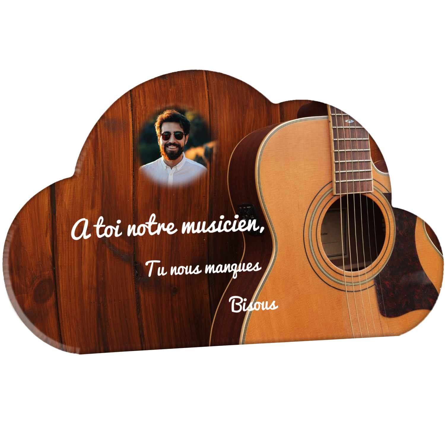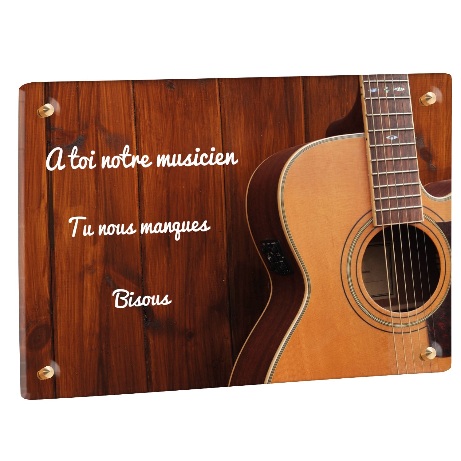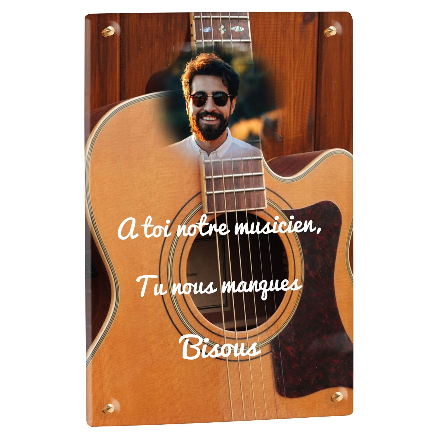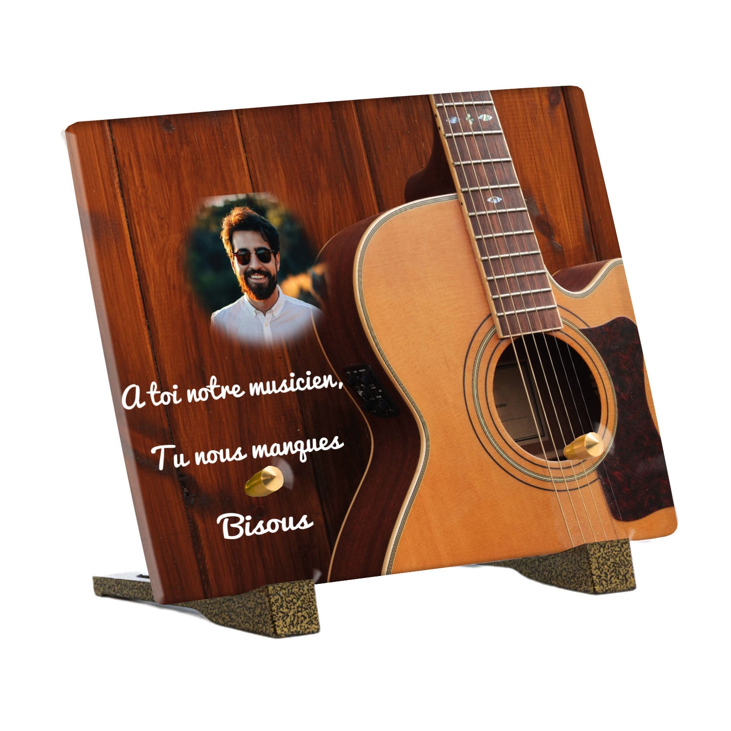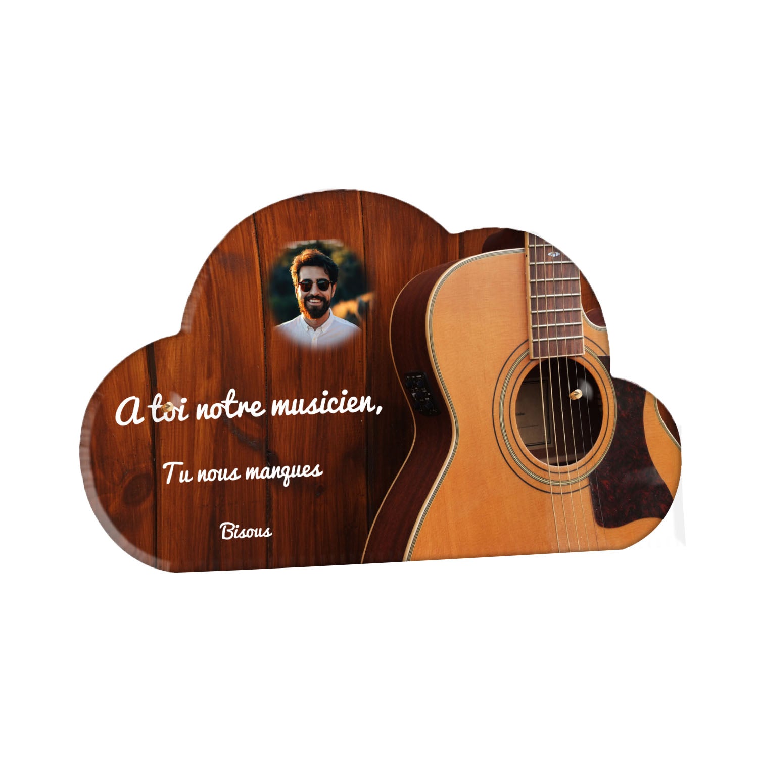 Cette plaque funéraire personnalisée représente une guitare acoustique délicatement posée sur un fond en bois, alliant authenticité et modernité. Conçue en plexiglas, elle offre une plaque mortuaire élégante et résistante, idéale pour rendre hommage avec sobriété et style. Sa finition soignée met en valeur chaque détail, faisant de cette plaque funéraire moderne un choix durable et esthétique. Personnalisable sur mesure, cette plaque funéraire plexiglas vous permet d’ajouter un texte unique et des motifs adaptés à votre souvenir. Sa durabilité approuvée garantit une excellente résistance aux intempéries, assurant que cet hommage reste intact au fil du temps. Offrez un souvenir personnalisé et pérenne grâce à cette plaque funéraire personnalisée.