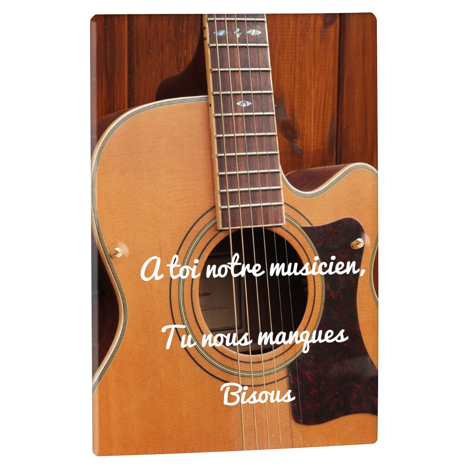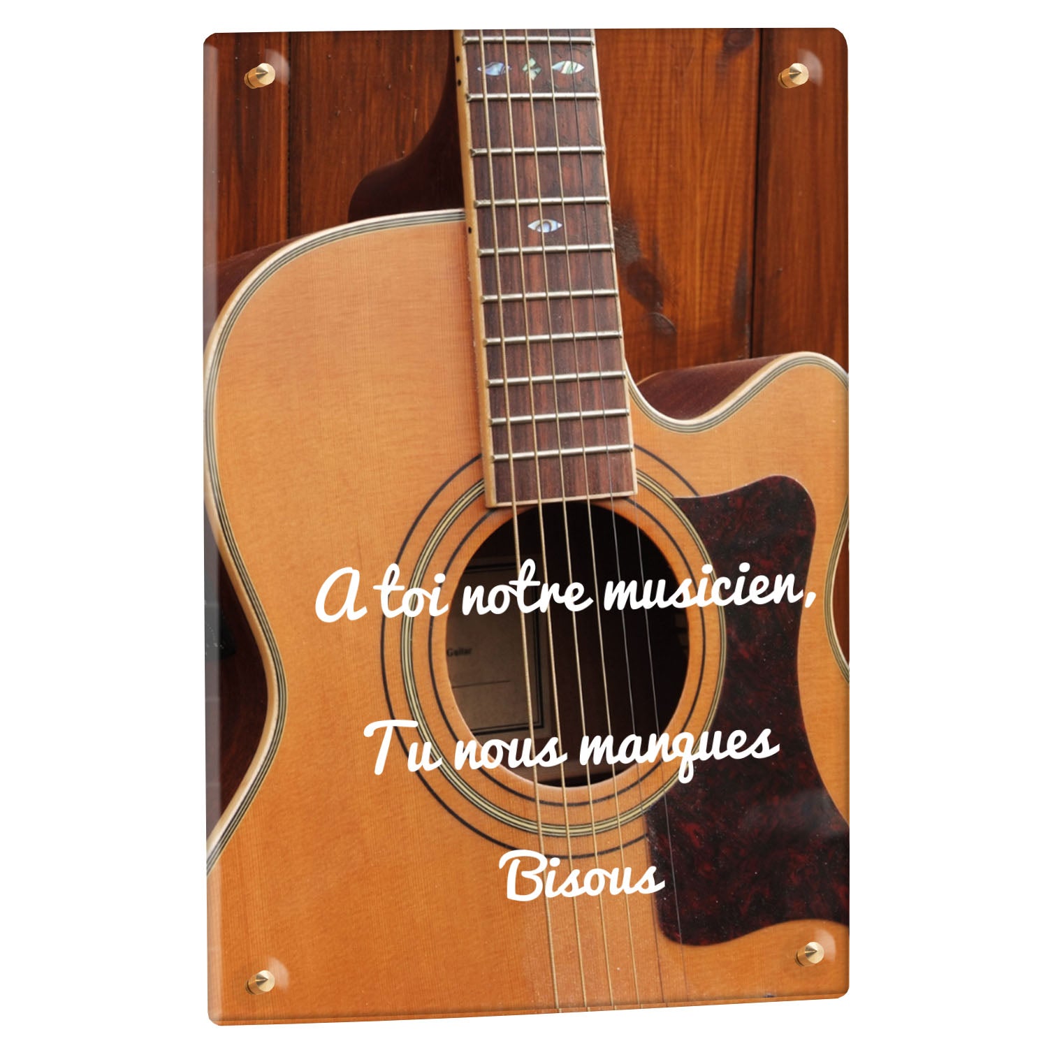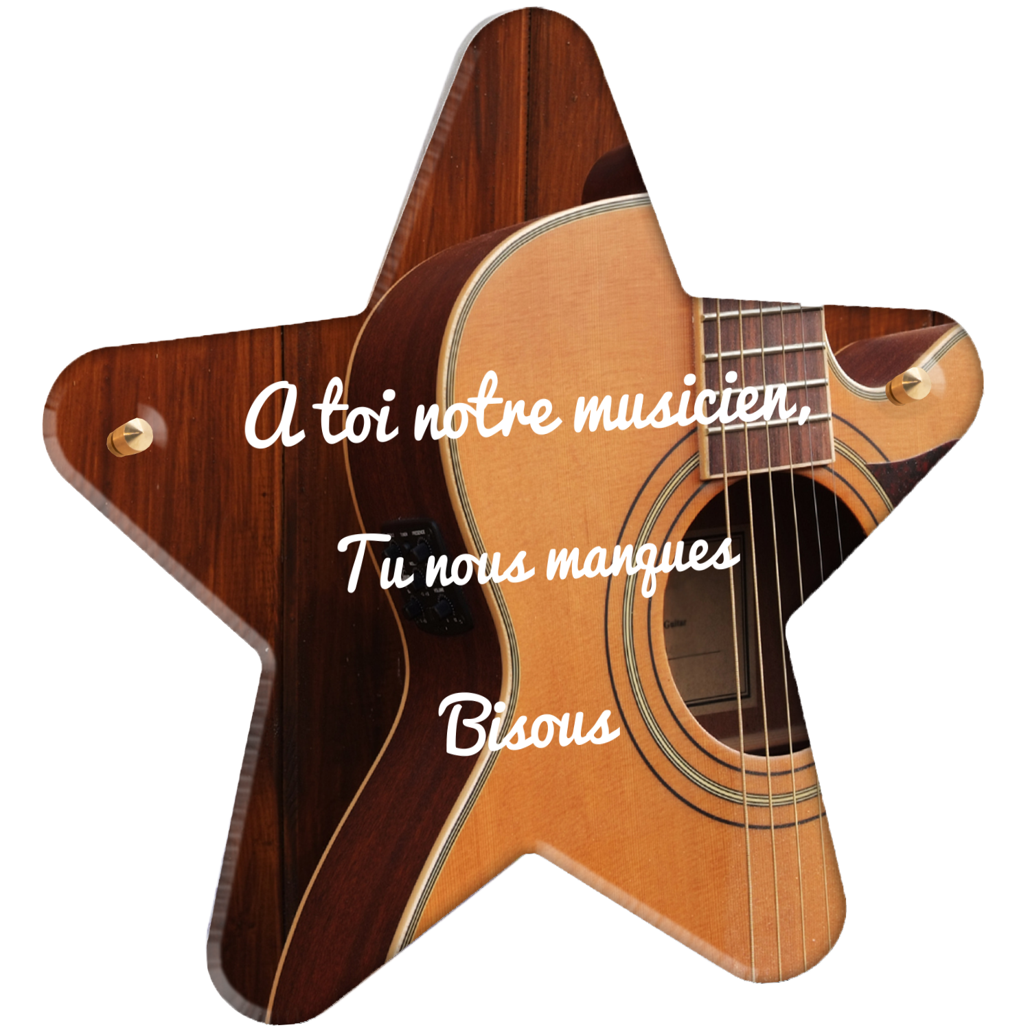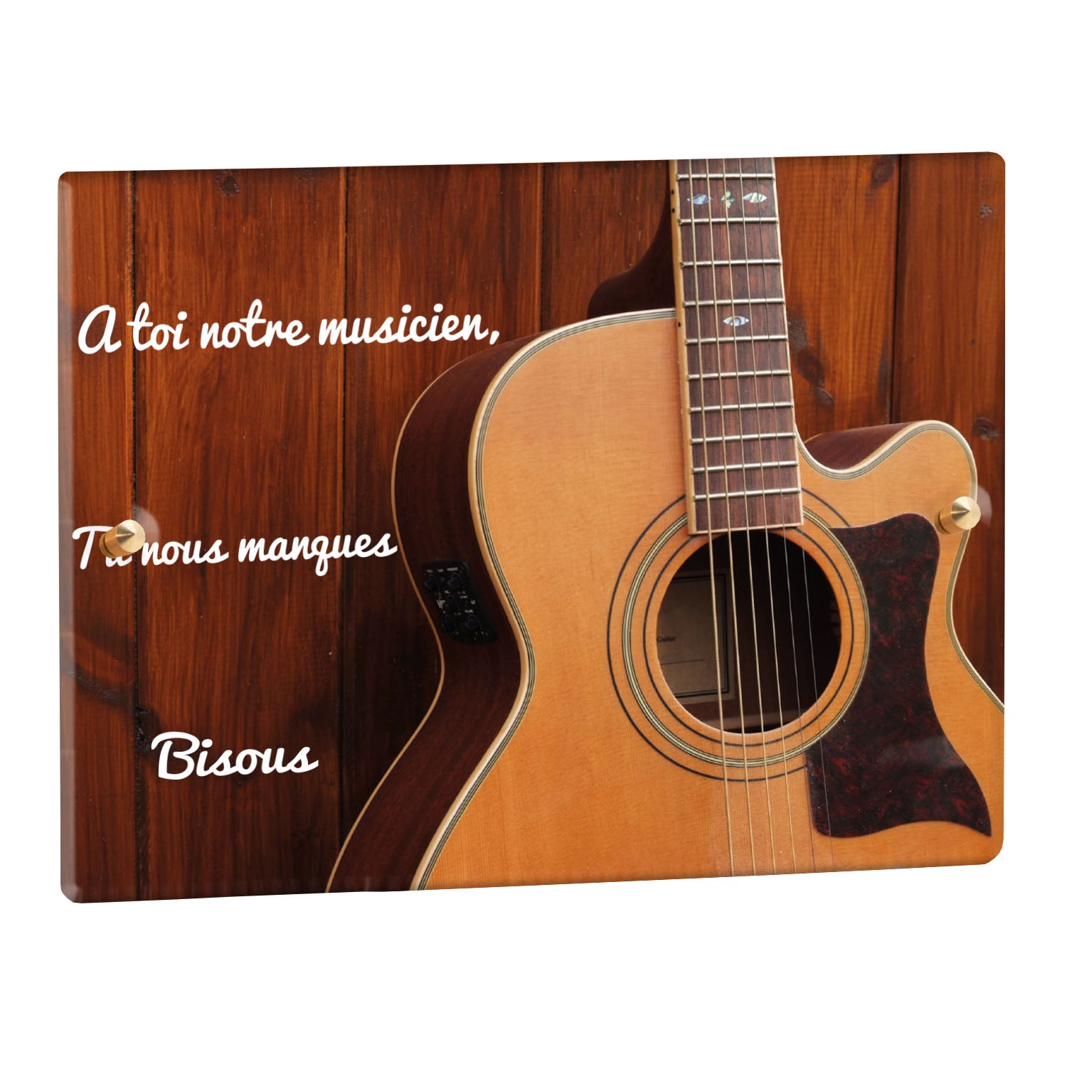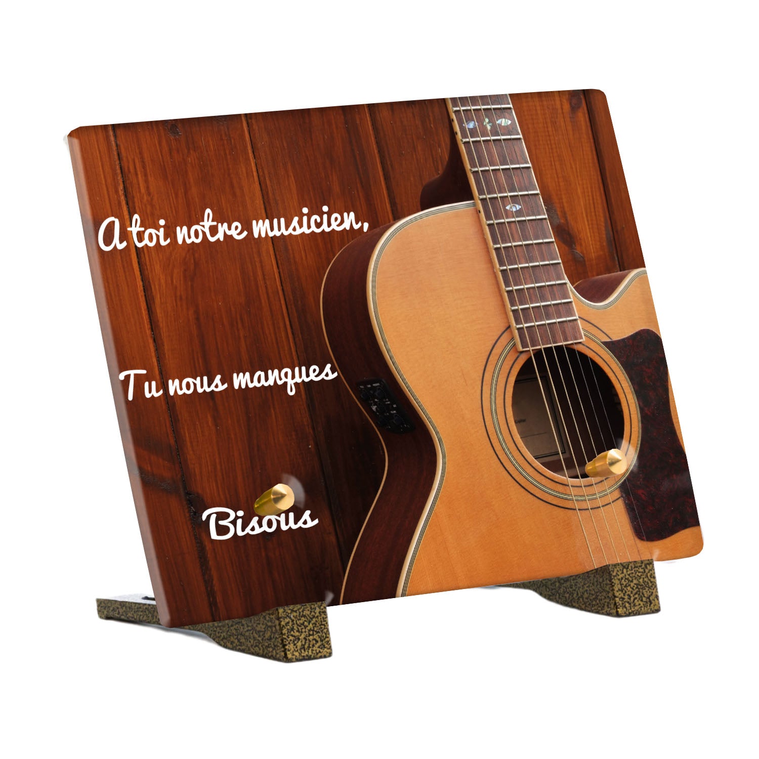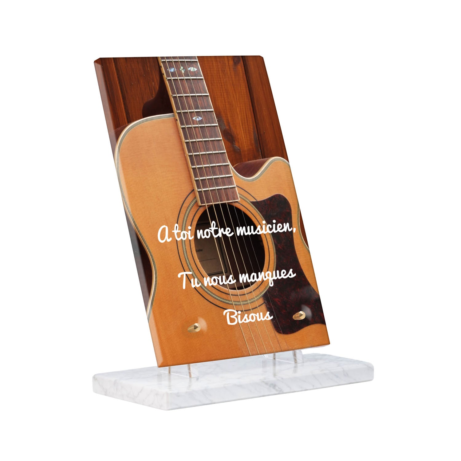 Cette plaque funéraire personnalisée représente une guitare acoustique délicatement posée sur un fond en bois, alliant authenticité et modernité. Conçue en plexiglas, elle offre une plaque mortuaire élégante et résistante, idéale pour rendre hommage avec sobriété et style. Sa finition soignée met en valeur chaque détail, faisant de cette plaque funéraire moderne un choix durable et esthétique. Personnalisable sur mesure, cette plaque funéraire plexiglas vous permet d’ajouter un texte unique et des motifs adaptés à votre souvenir. Sa durabilité approuvée garantit une excellente résistance aux intempéries, assurant que cet hommage reste intact au fil du temps. Offrez un souvenir personnalisé et pérenne grâce à cette plaque funéraire personnalisée.