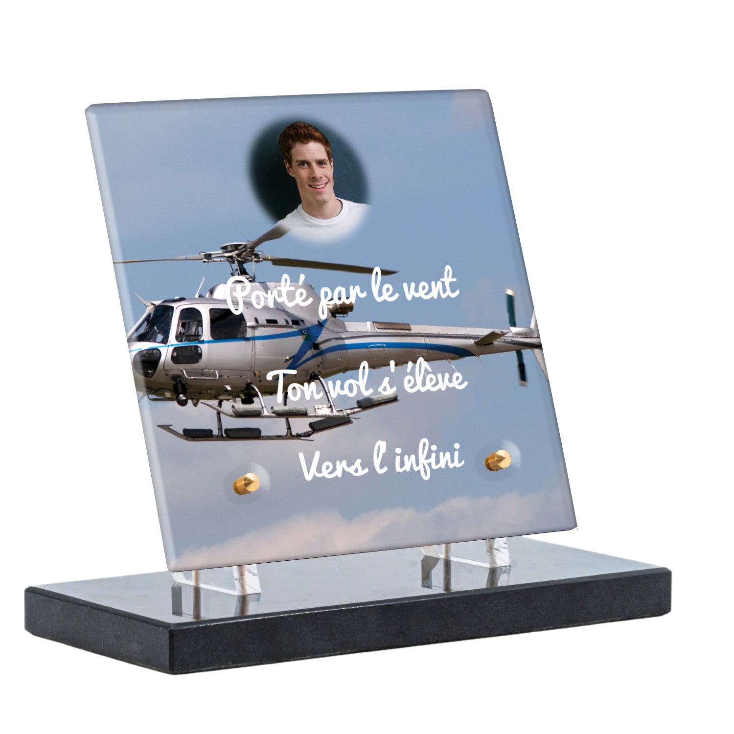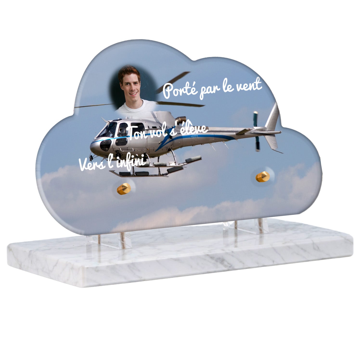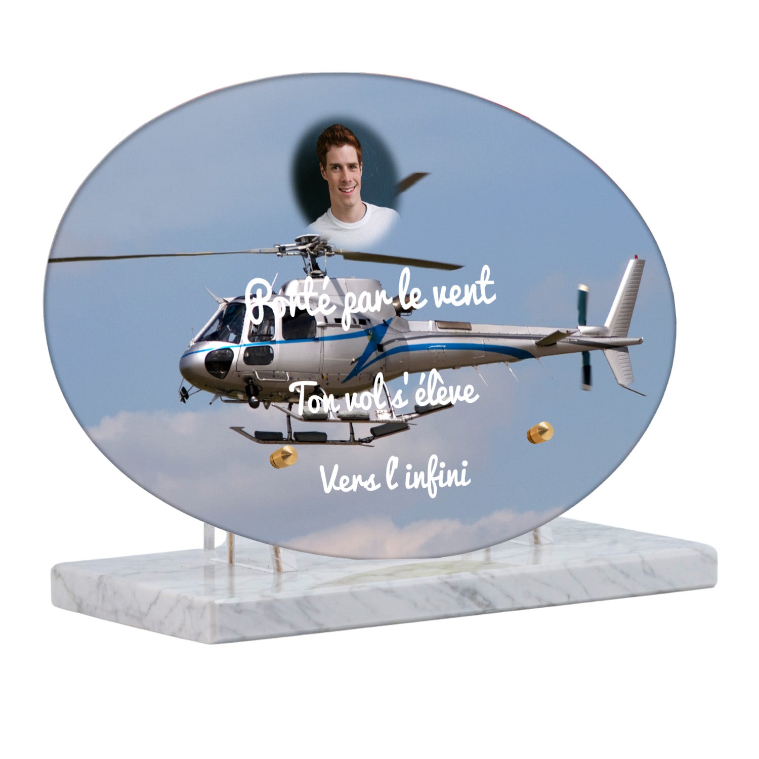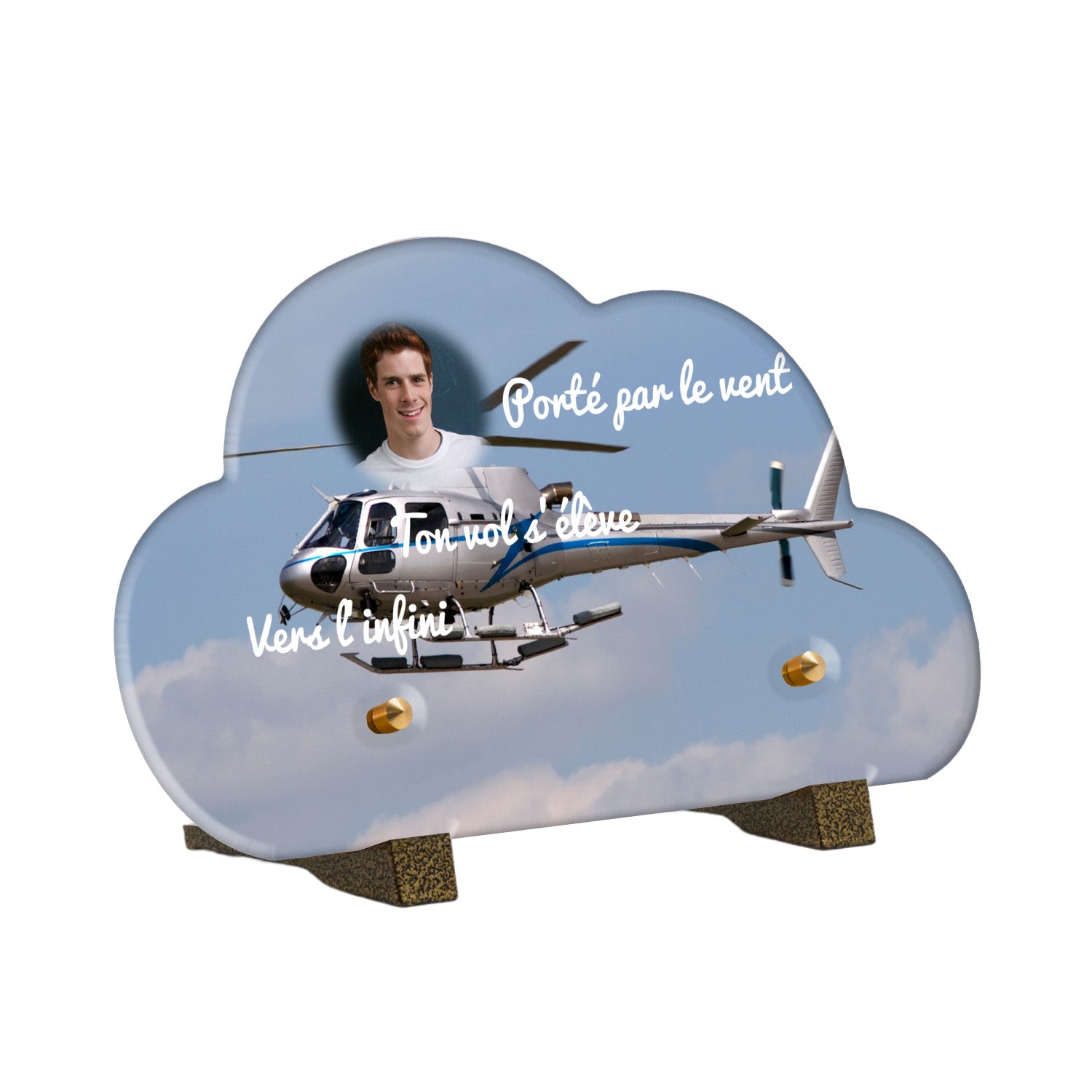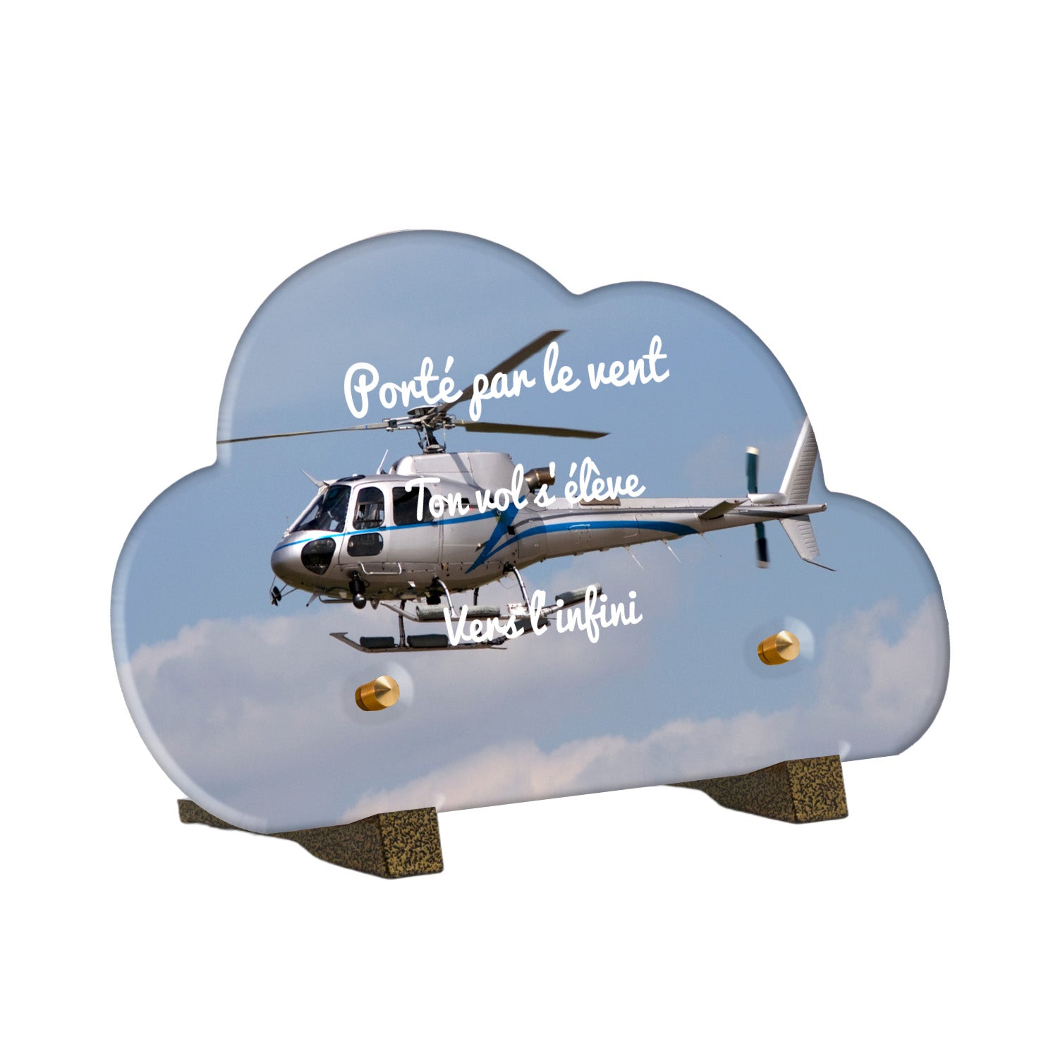 Cette plaque funéraire personnalisée représente un hélicoptère en vol, symbole de liberté et d’aventure, pour rendre un hommage unique et chargé de sens. Fabriquée en plexiglas, cette plaque mortuaire allie modernité et élégance, parfaite pour une plaque funéraire moderne qui valorise la mémoire de manière originale et durable.