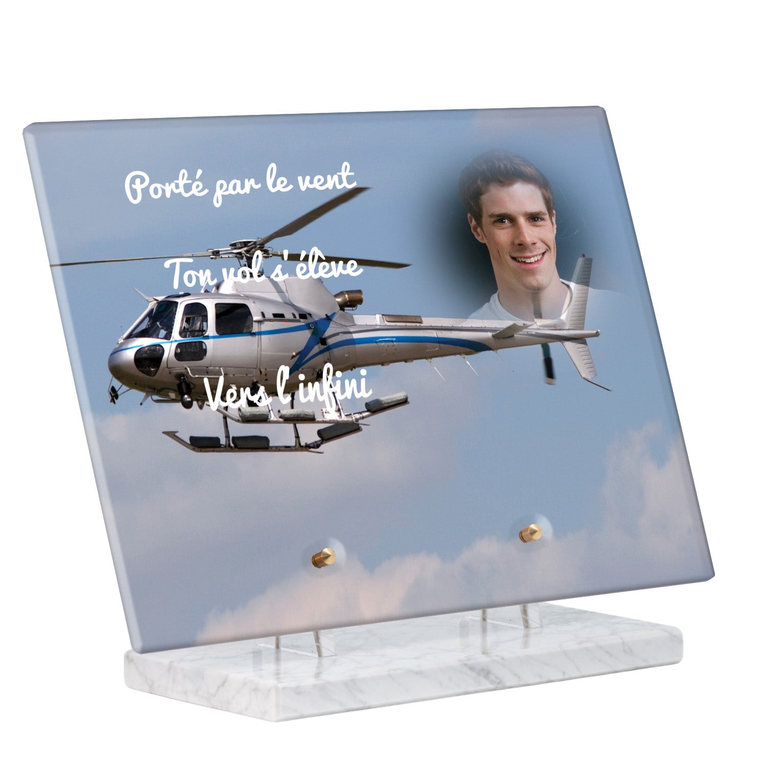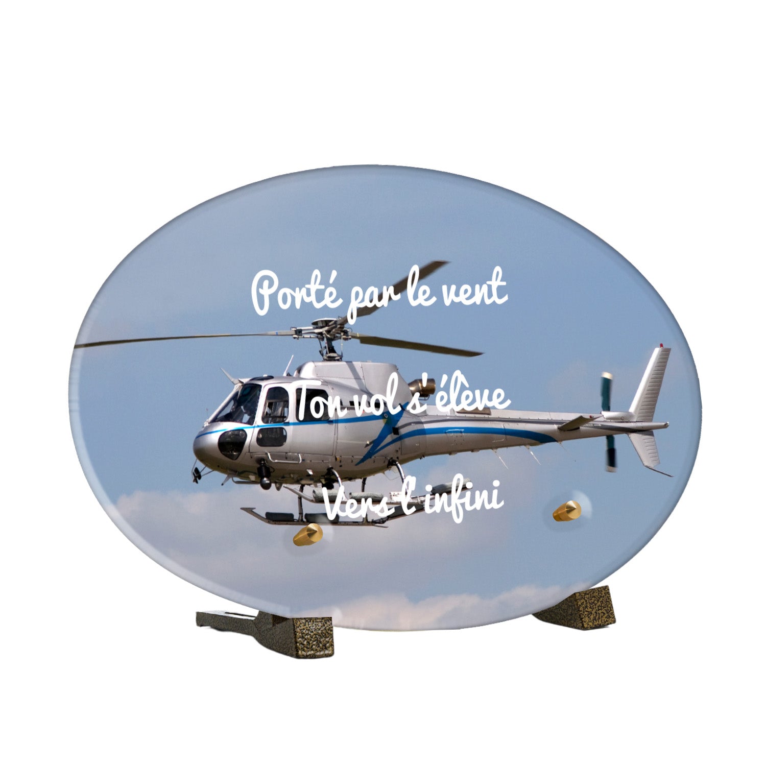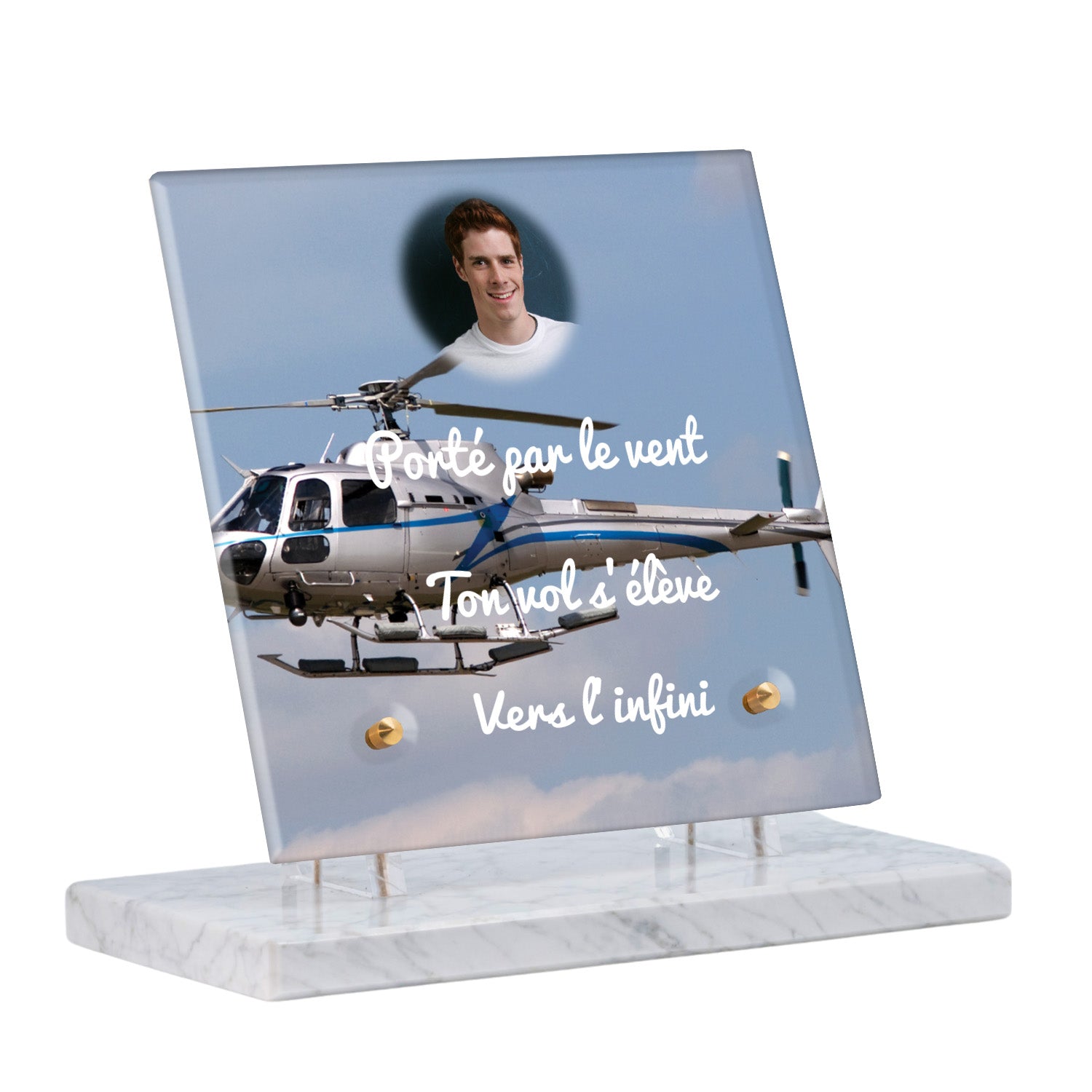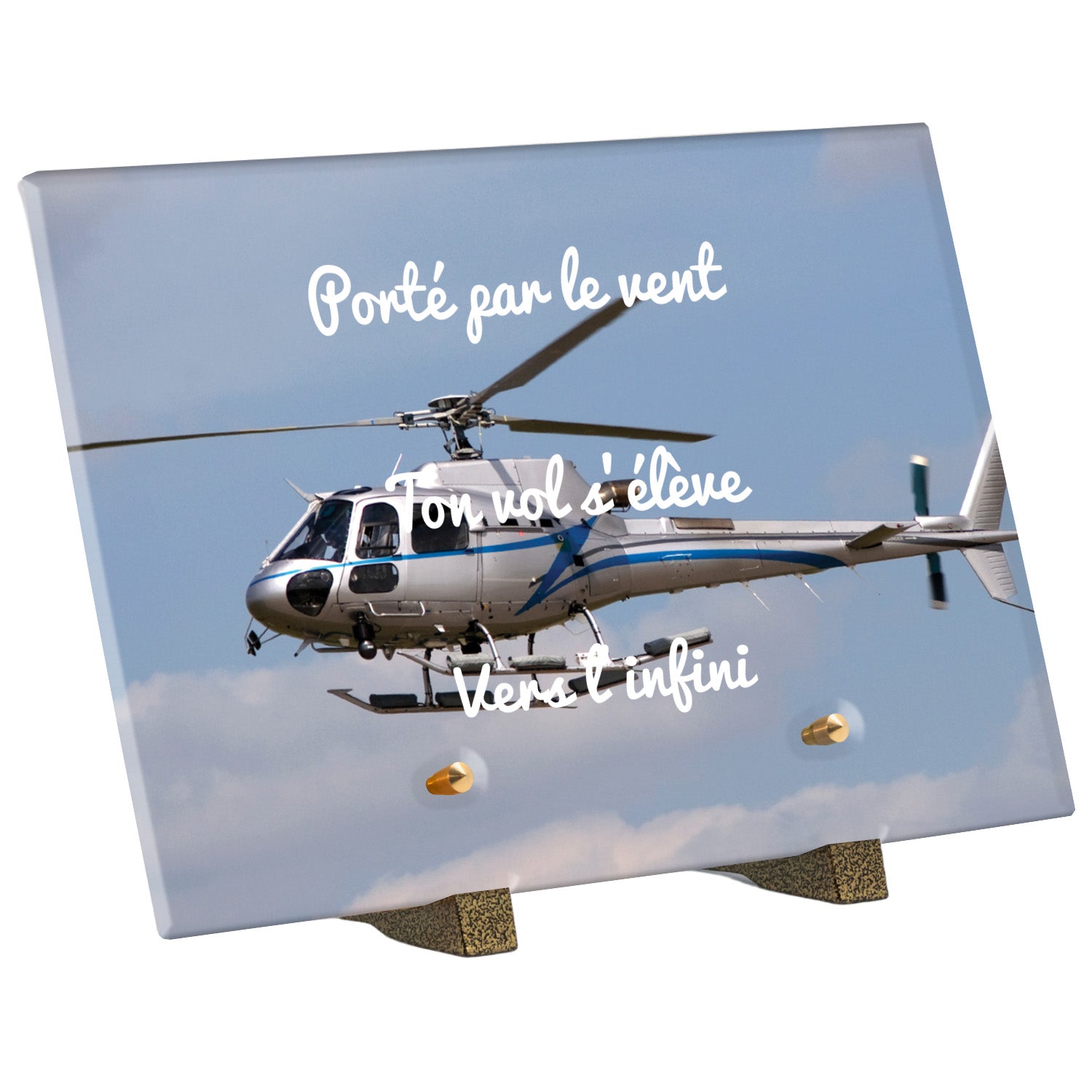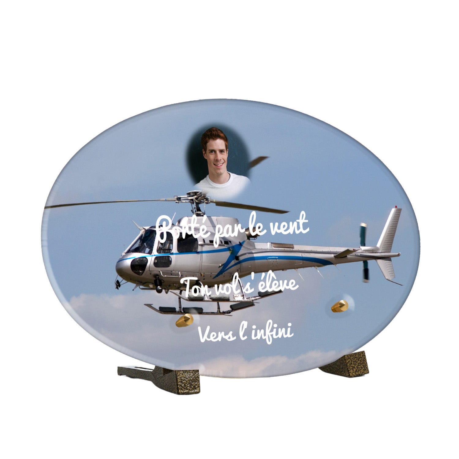 Cette plaque funéraire personnalisée représente un hélicoptère en vol, symbole de liberté et d’aventure, pour rendre un hommage unique et chargé de sens. Fabriquée en plexiglas, cette plaque mortuaire allie modernité et élégance, parfaite pour une plaque funéraire moderne qui valorise la mémoire de manière originale et durable.