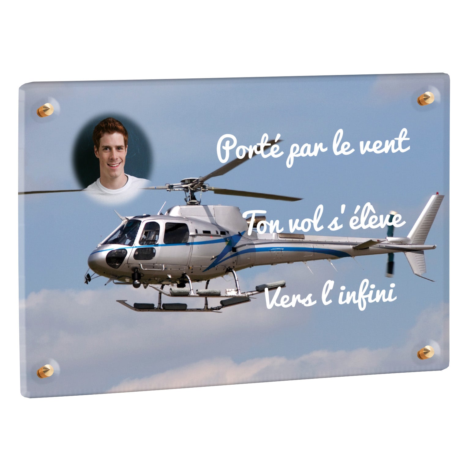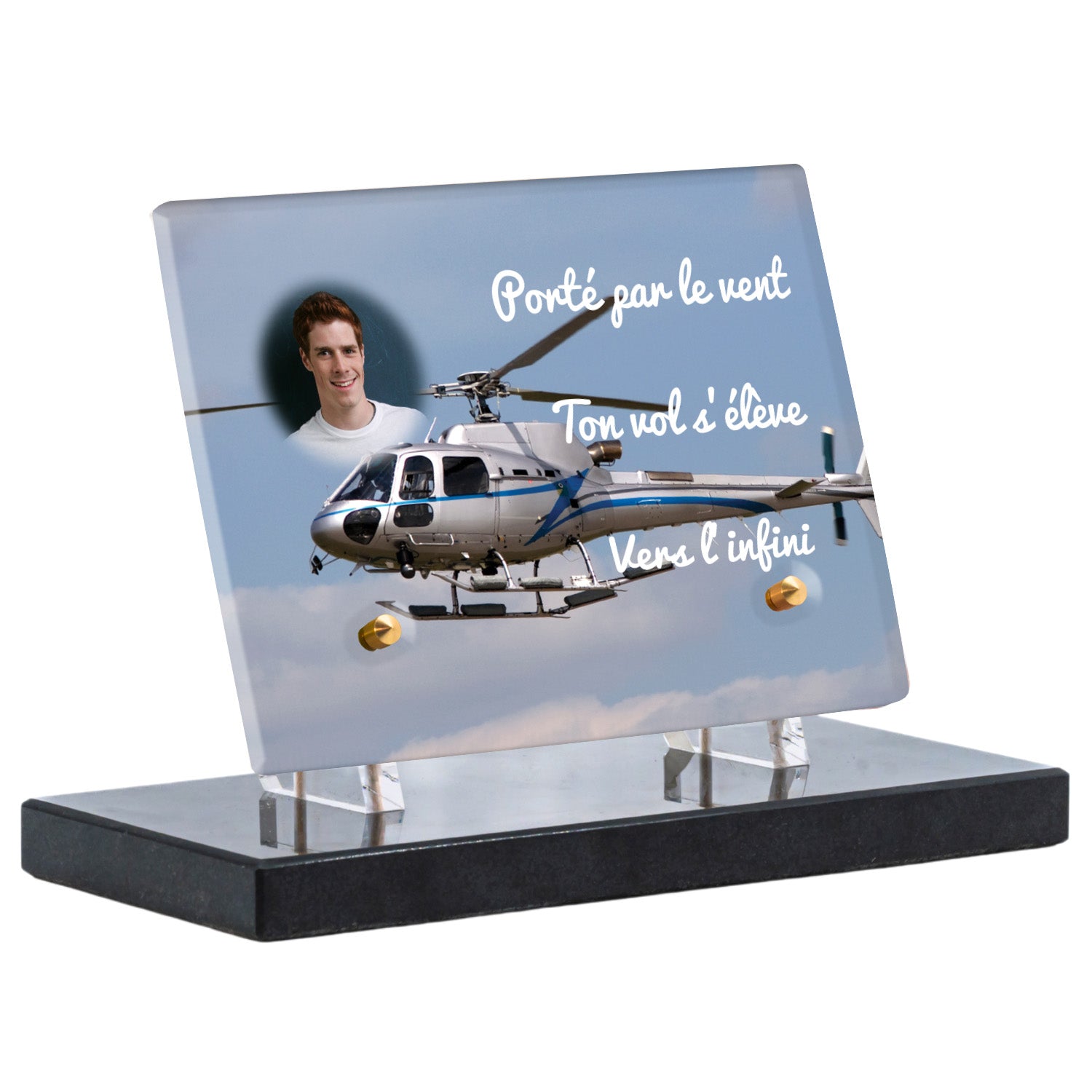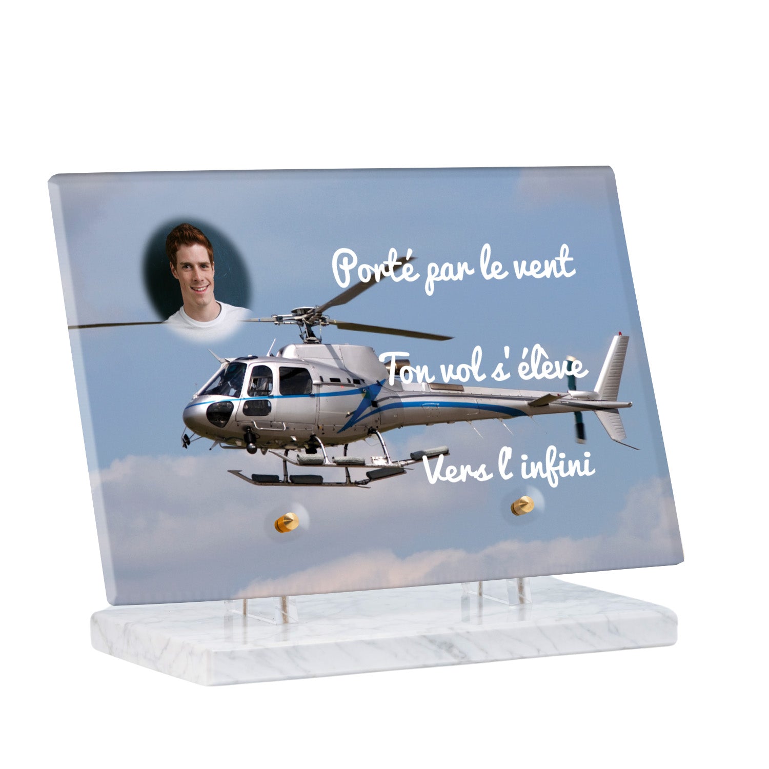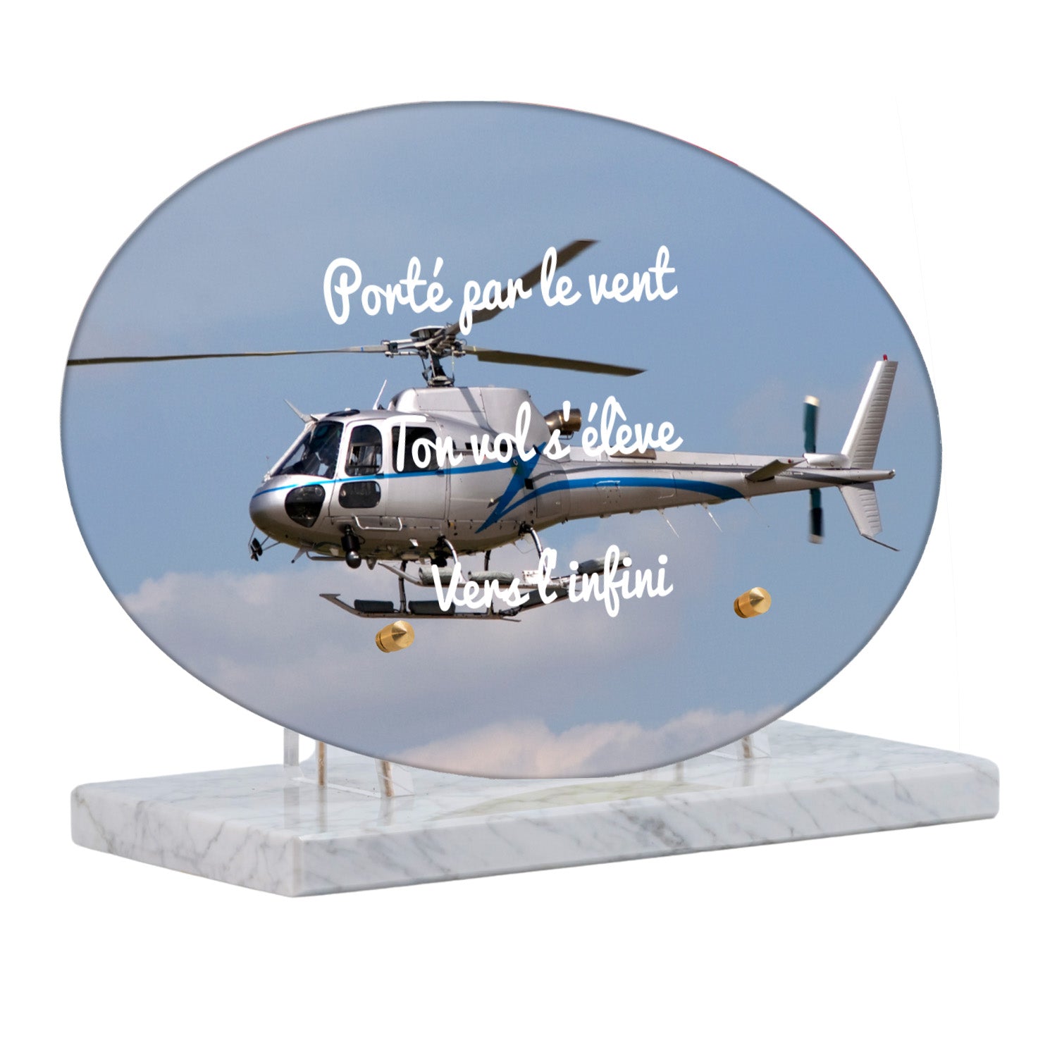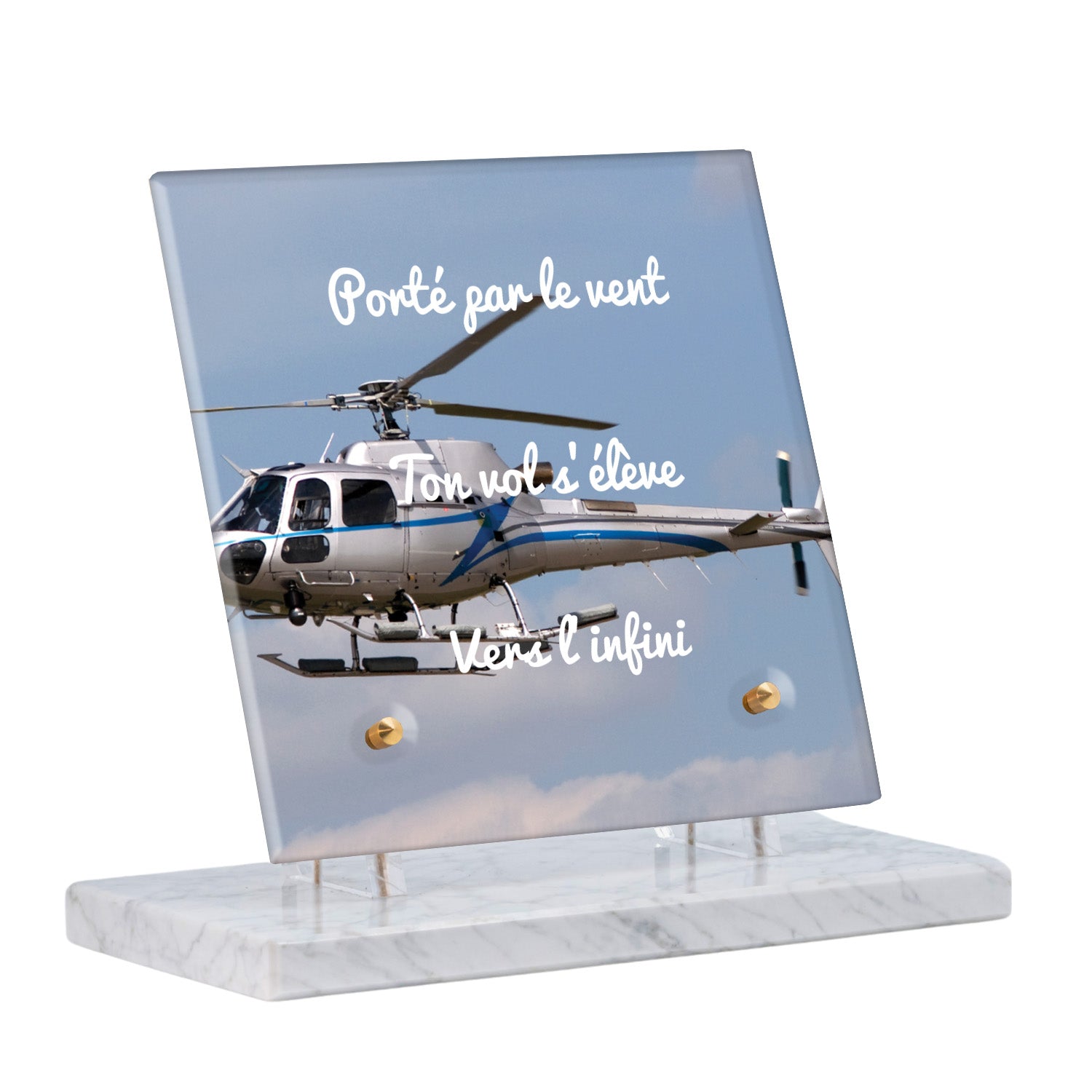 Cette plaque funéraire personnalisée représente un hélicoptère en vol, symbole de liberté et d’aventure, pour rendre un hommage unique et chargé de sens. Fabriquée en plexiglas, cette plaque mortuaire allie modernité et élégance, parfaite pour une plaque funéraire moderne qui valorise la mémoire de manière originale et durable.